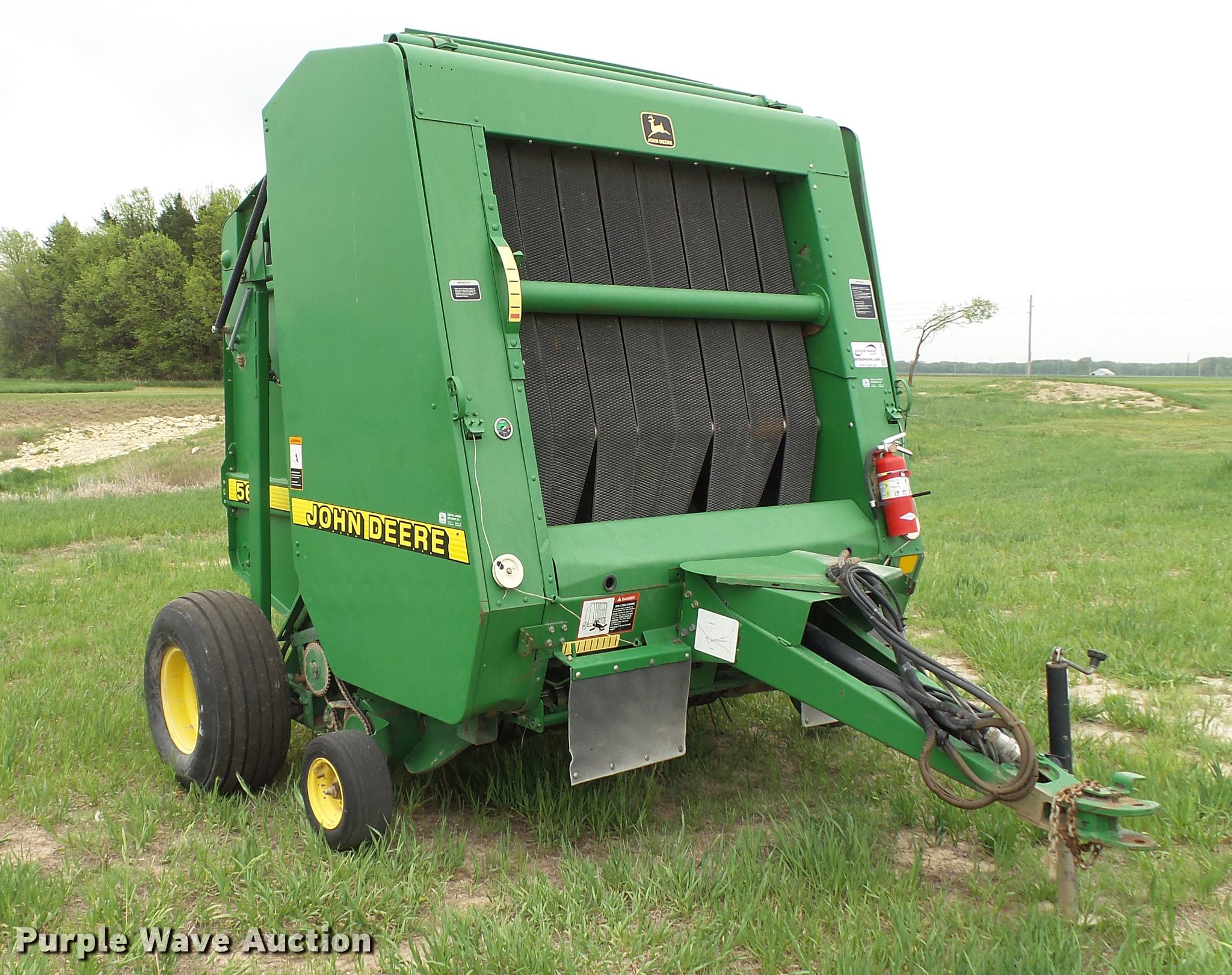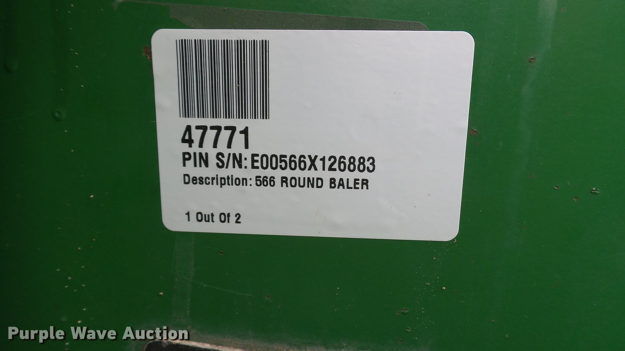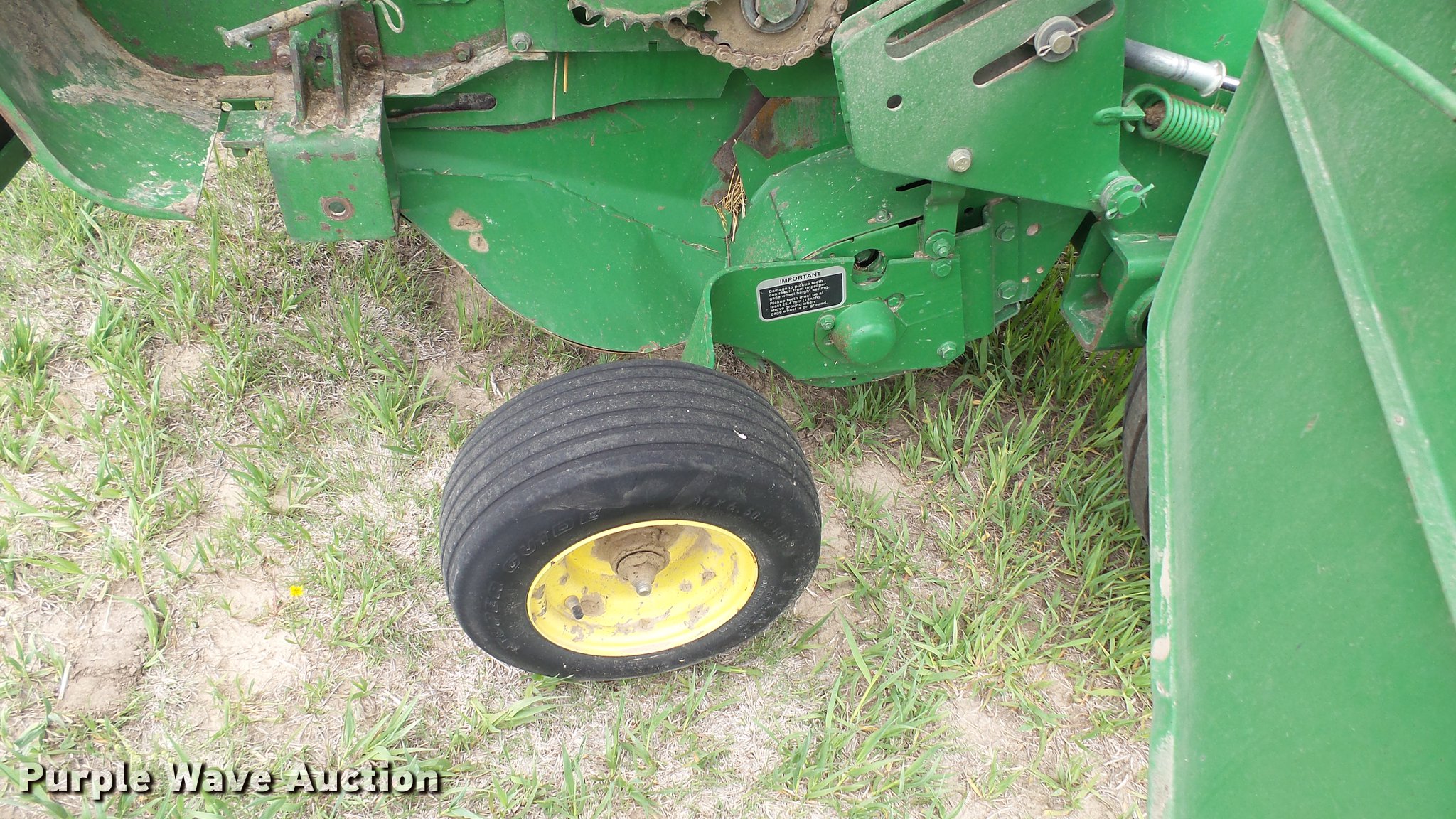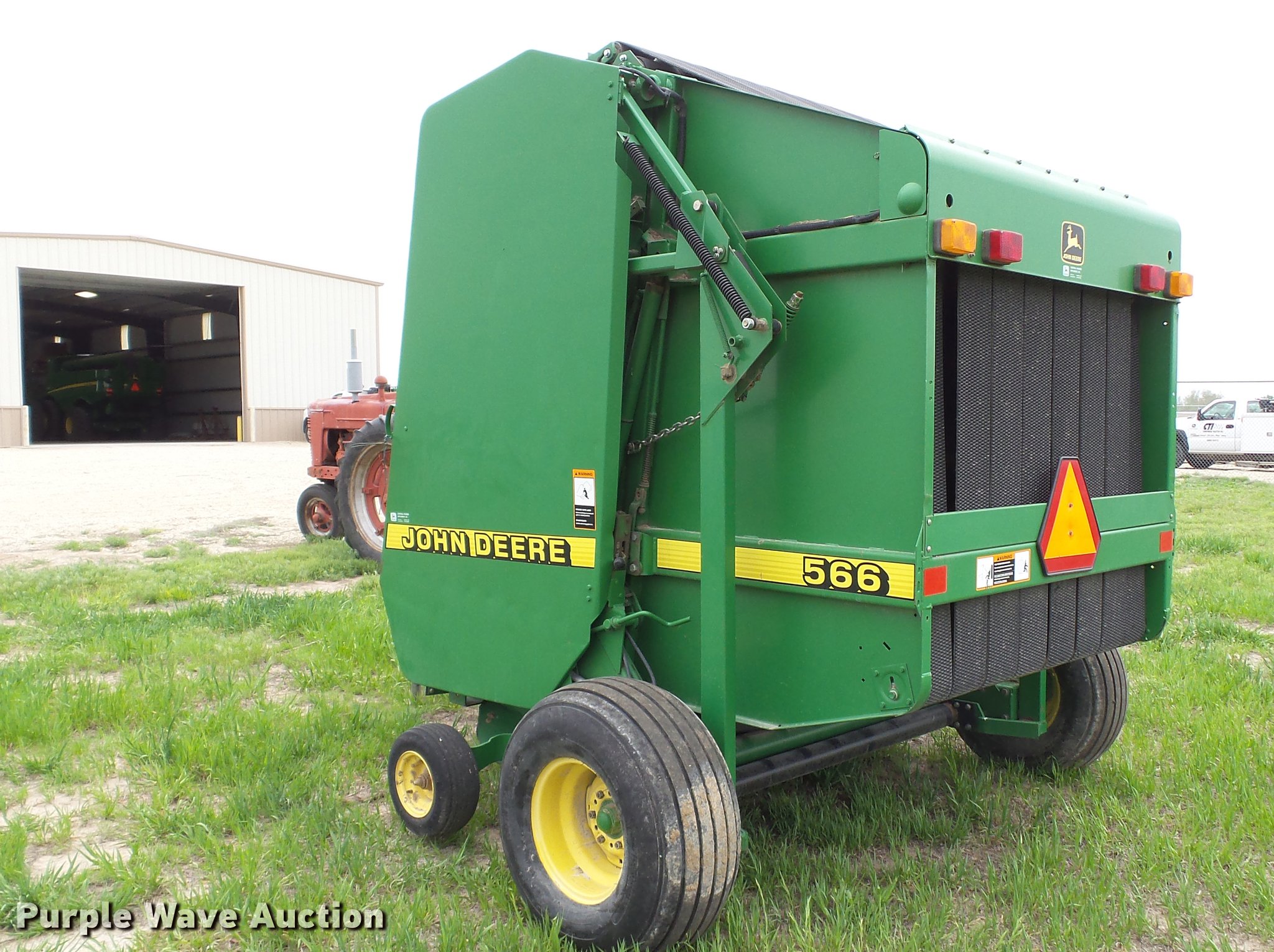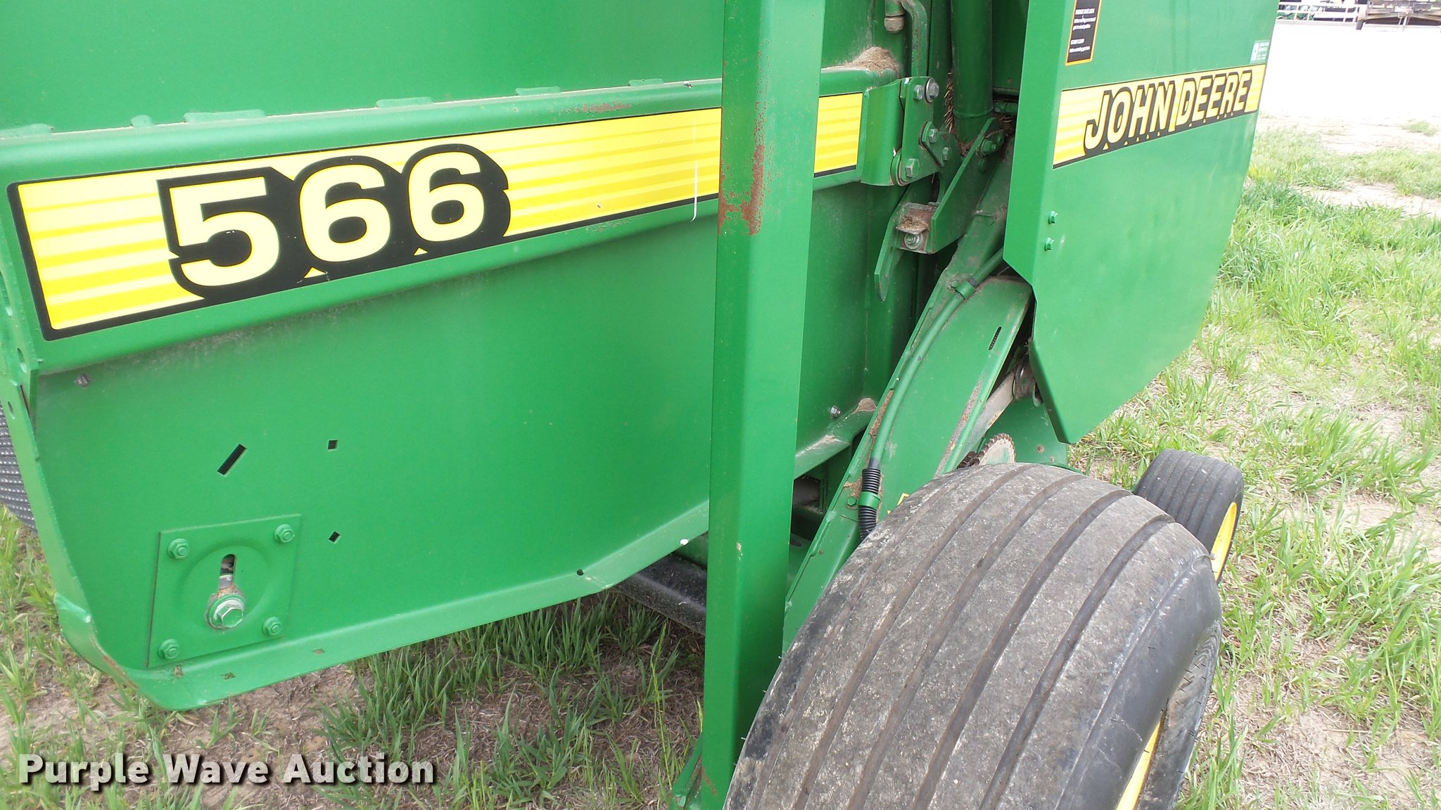Purple Wave is selling a used Round Baler in Kansas. This item is a 1998 John Deere 566 round baler with the following: 15,000 bale count, 5' x 6' bale capacity, 60"W pickup, Hydraulic pickup lift, 16x6.50-8 gauge wheels, Twine tie, Bale kicker, Transport lights, Large 1000 PTO, Pin hitch, 31x13.50-15 tires, Left door will not latch, Transport plug broken, Serial E00566X126883, Unit# 47771