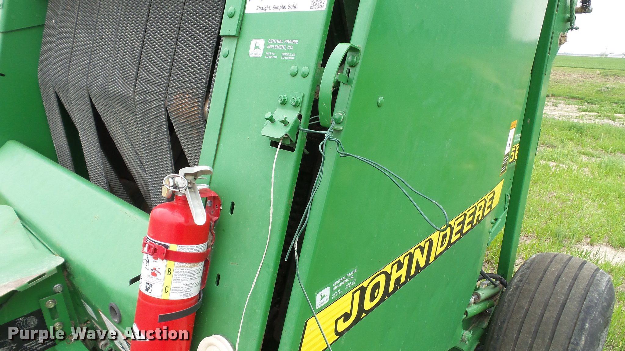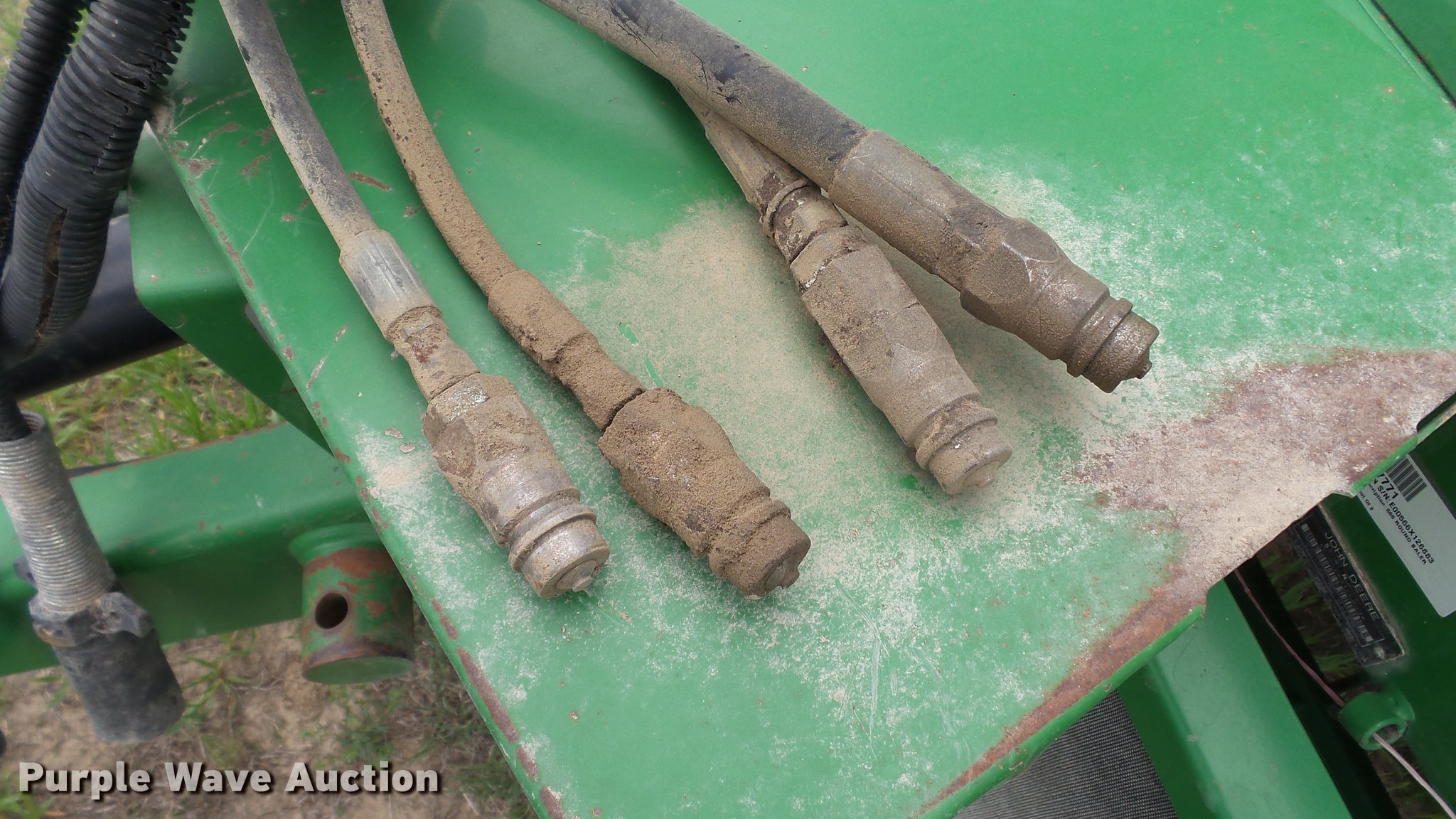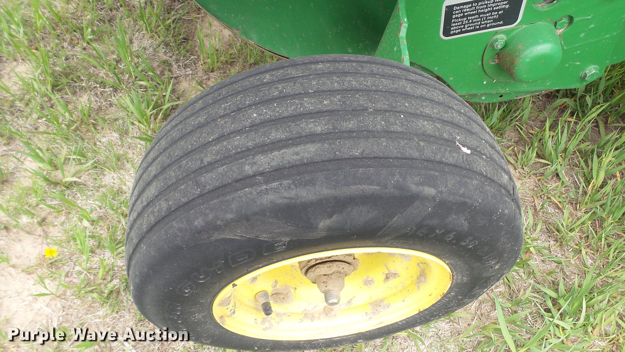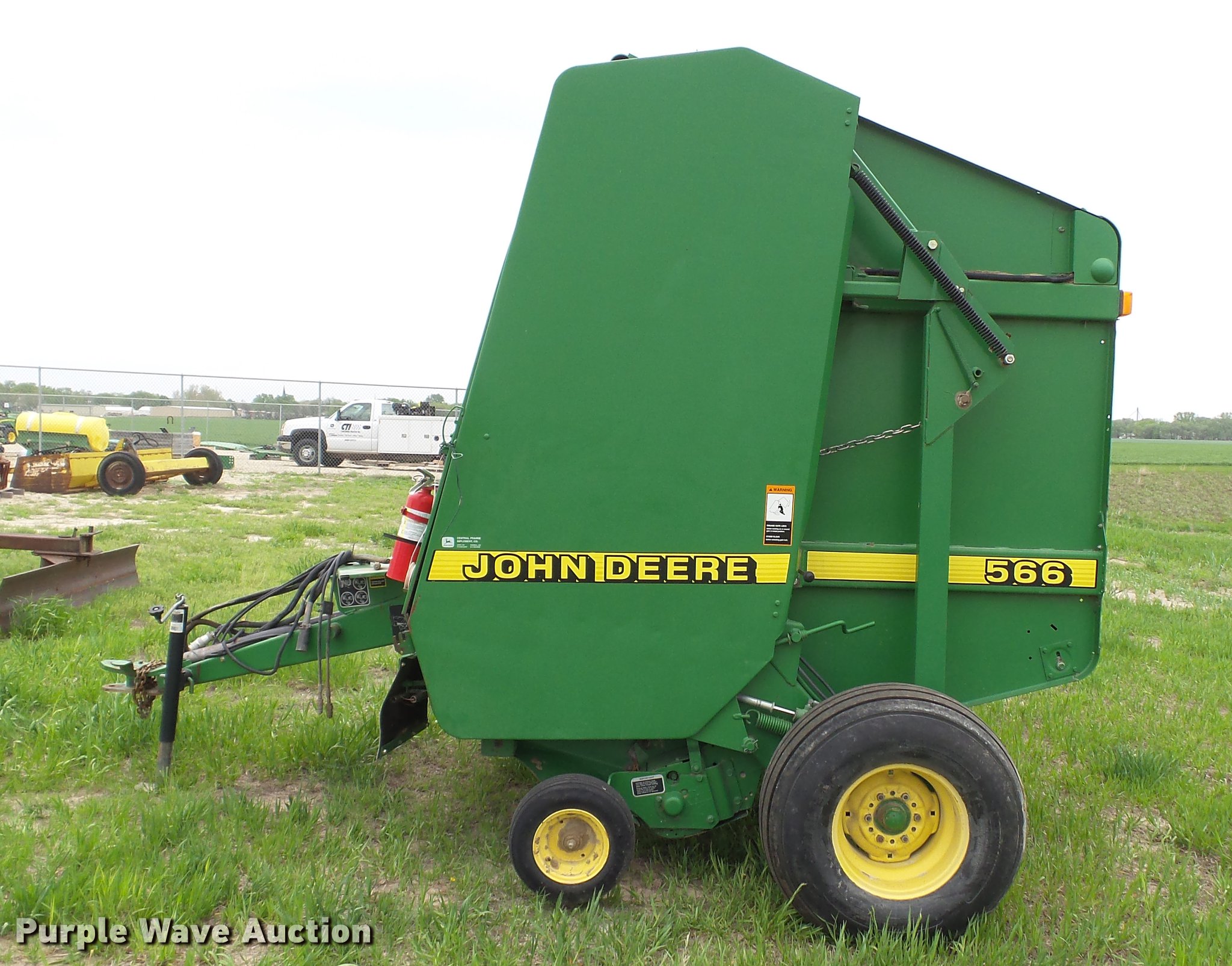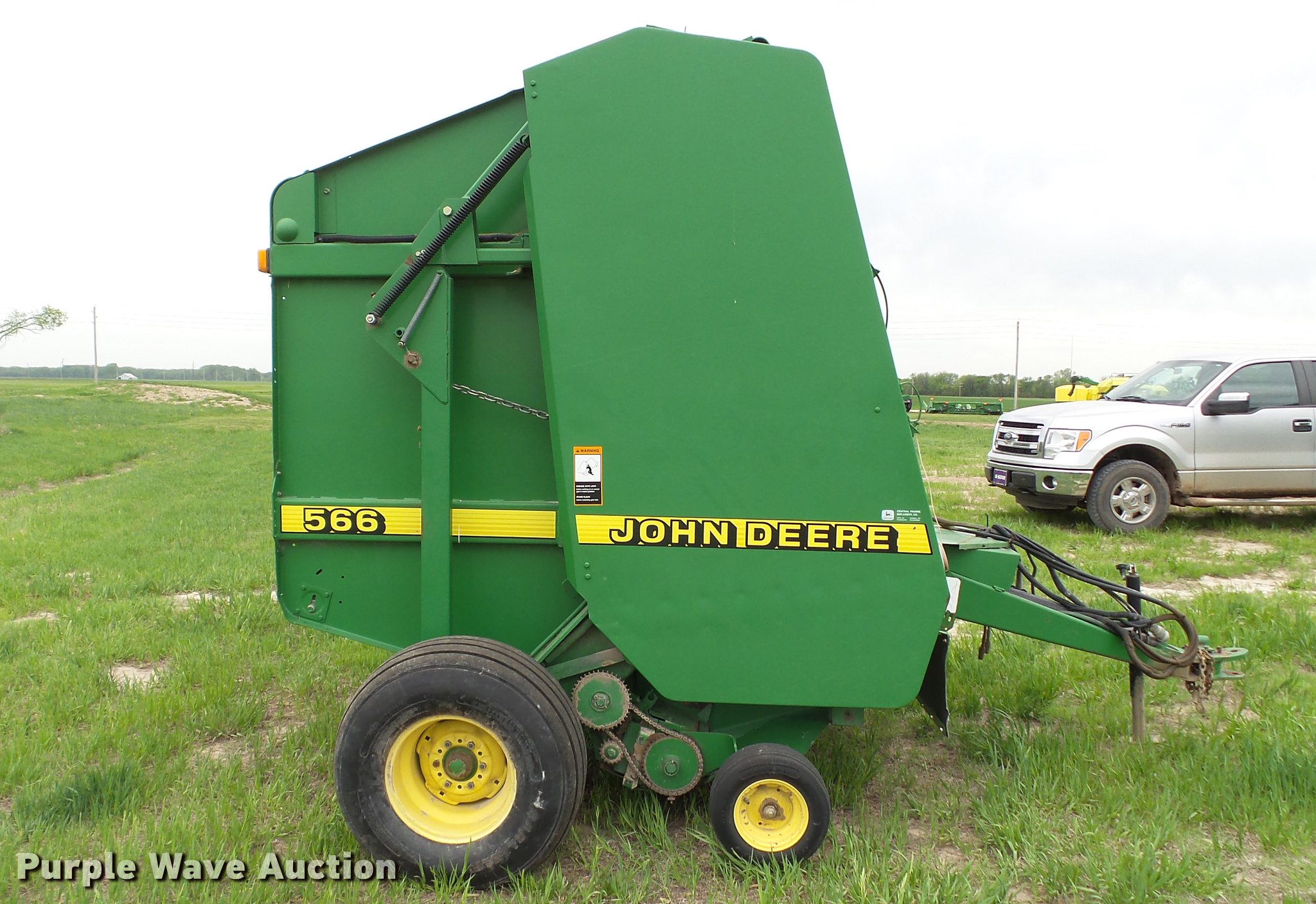 Purple Wave is selling a used Round Baler in Kansas. This item is a 1998 John Deere 566 round baler with the following: 15,000 bale count, 5' x 6' bale capacity, 60"W pickup, Hydraulic pickup lift, 16x6.50-8 gauge wheels, Twine tie, Bale kicker, Transport lights, Large 1000 PTO, Pin hitch, 31x13.50-15 tires, Left door will not latch, Transport plug broken, Serial E00566X126883, Unit# 47771