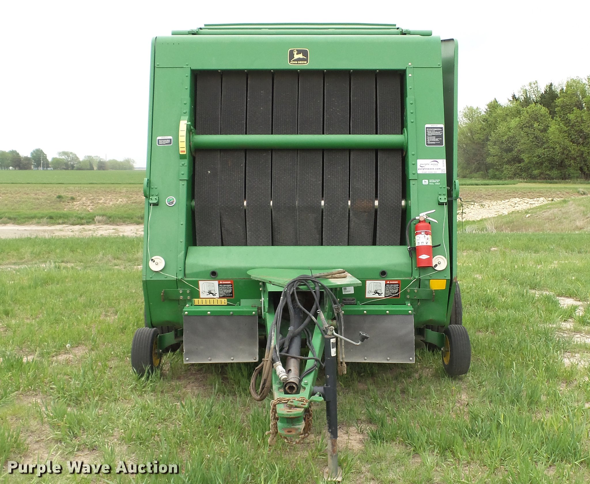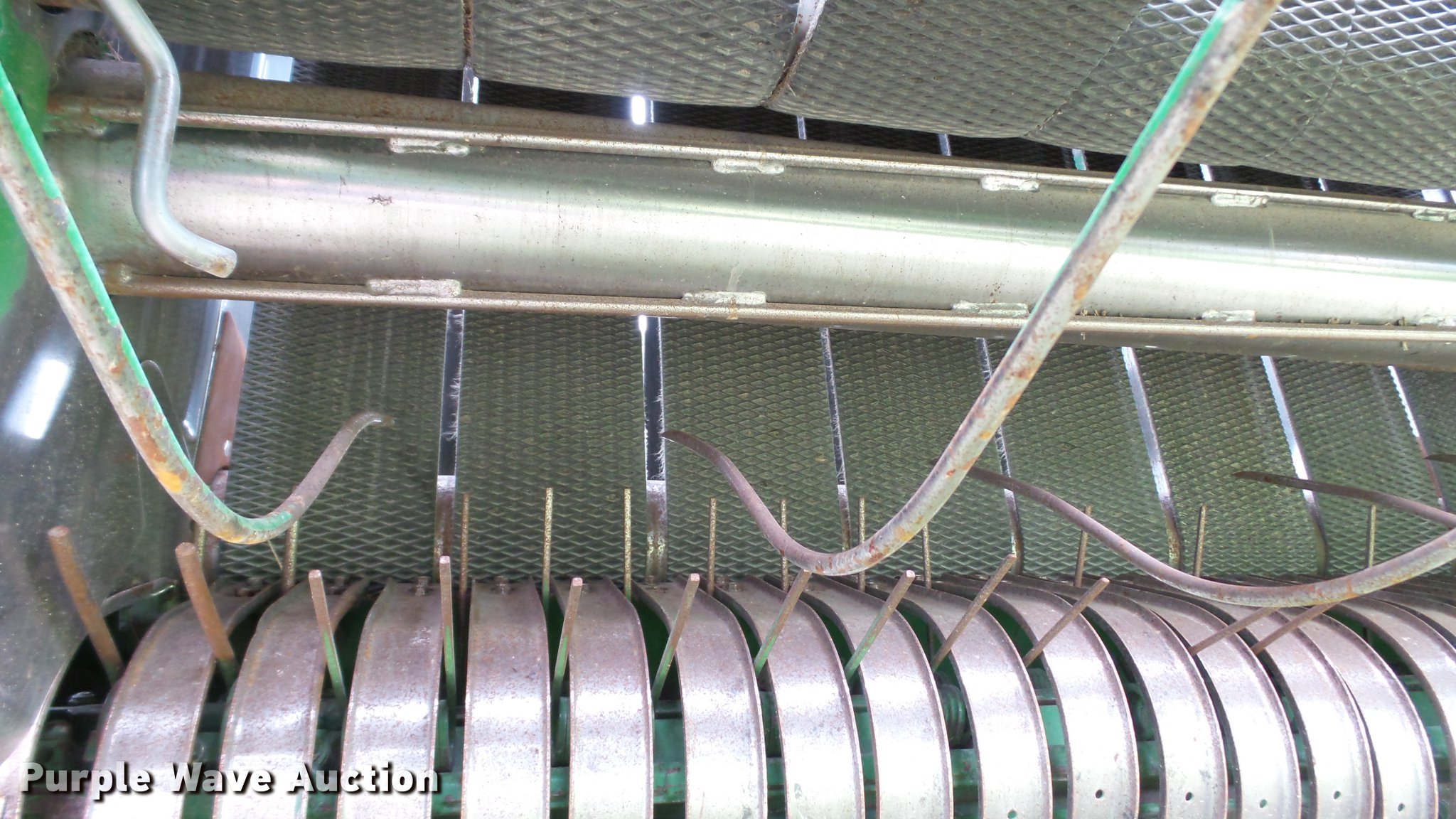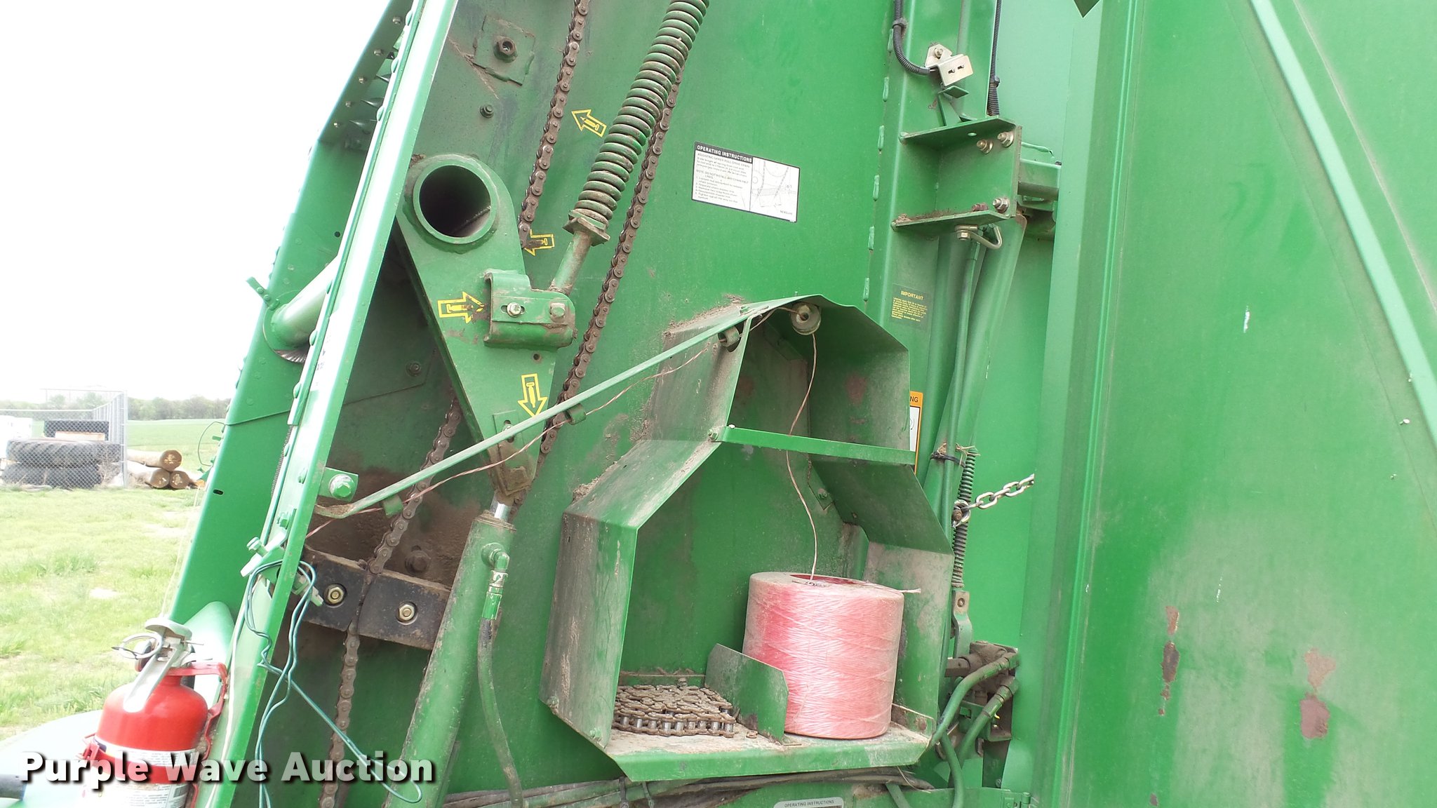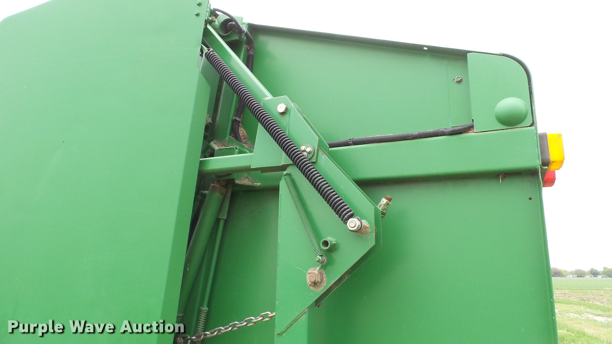 Purple Wave is selling a used Round Baler in Kansas. This item is a 1998 John Deere 566 round baler with the following: 15,000 bale count, 5' x 6' bale capacity, 60"W pickup, Hydraulic pickup lift, 16x6.50-8 gauge wheels, Twine tie, Bale kicker, Transport lights, Large 1000 PTO, Pin hitch, 31x13.50-15 tires, Left door will not latch, Transport plug broken, Serial E00566X126883, Unit# 47771