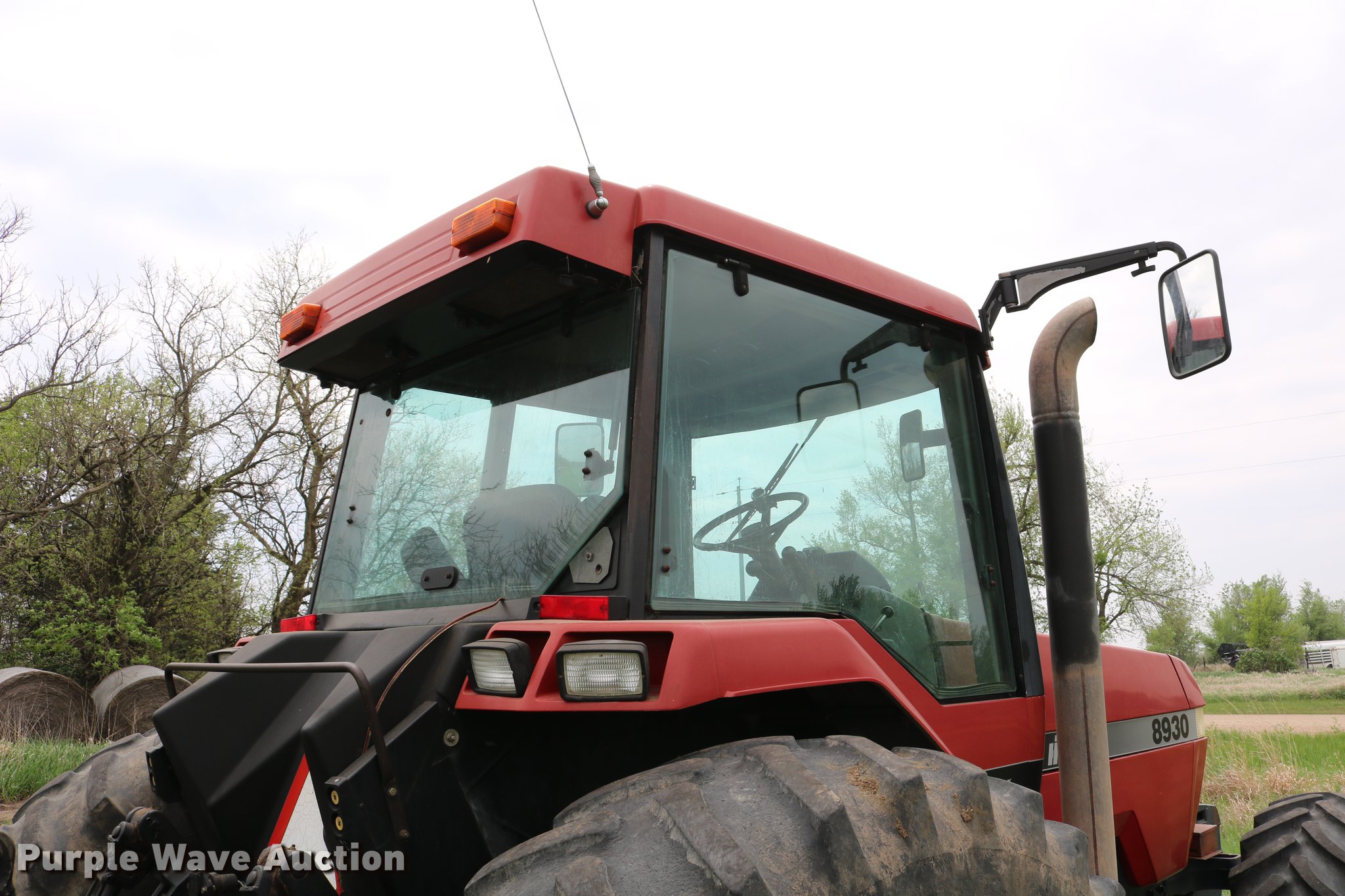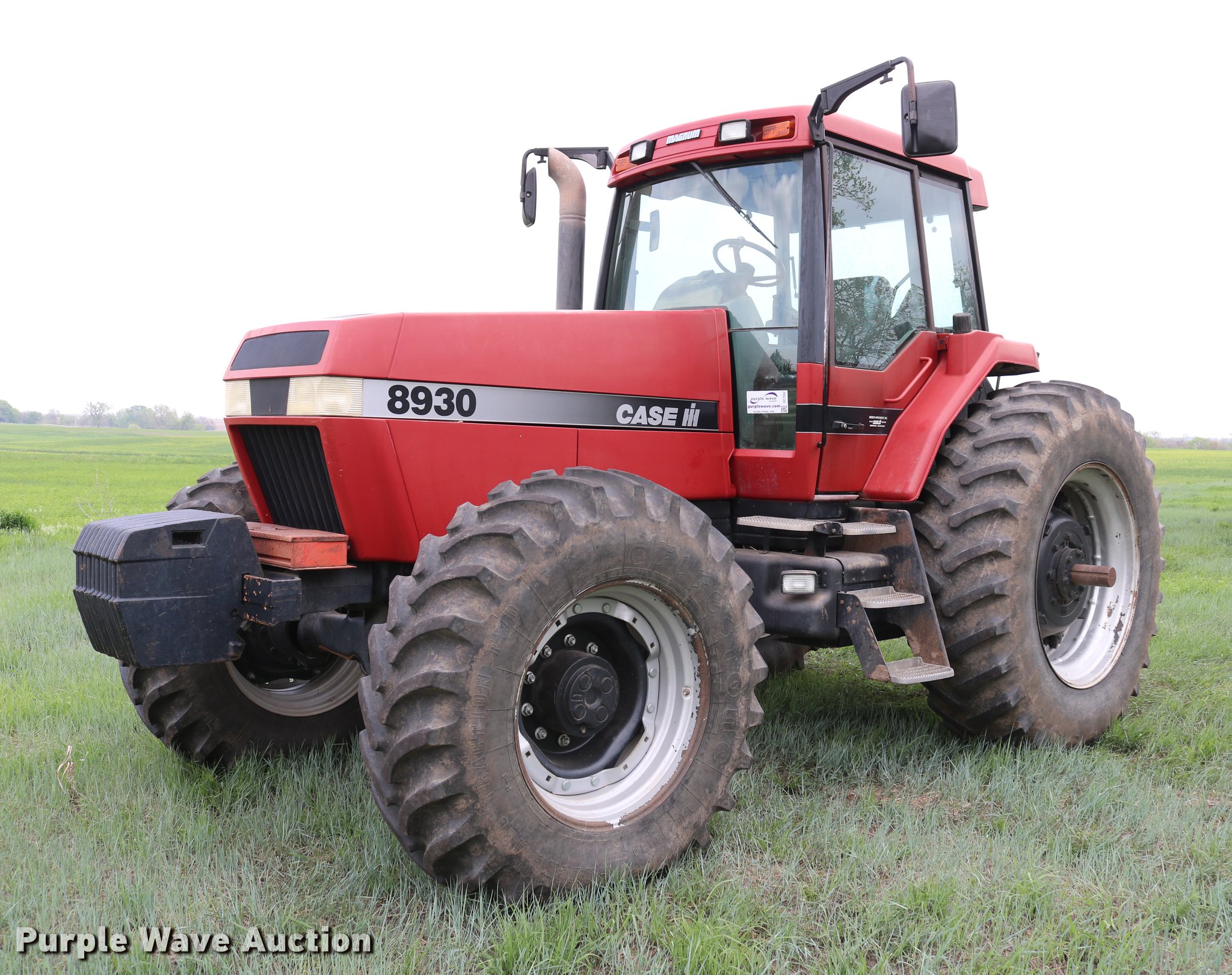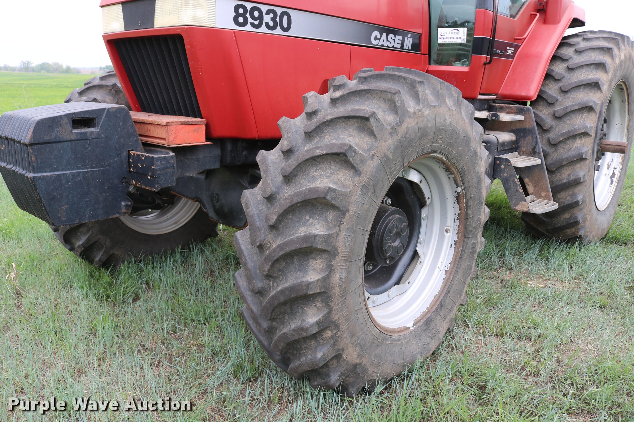 Purple Wave is selling a used Tractor in Kansas. This item is a 1997 Case IH 8930 MFWD tractor with the following: 2,872 hours on meter, Case IH 8.3L six cylinder turbo diesel engine, Powershift transmission, 18F-4R gears, Differential lock, AC and heat, Tilt steering wheel, AM/FM, Suspension seat, Block heater, Ether start, Three point, Top link, Quick attach, Seven pin outlet, 540/1000 PTO, (4) rear hydraulic remote sets, Power beyond hydraulics, (11) suitcase weights, 118.3" wheelbase, 420/90R30 front tires, 20.8R42 rear tires, Serial JJA0076426