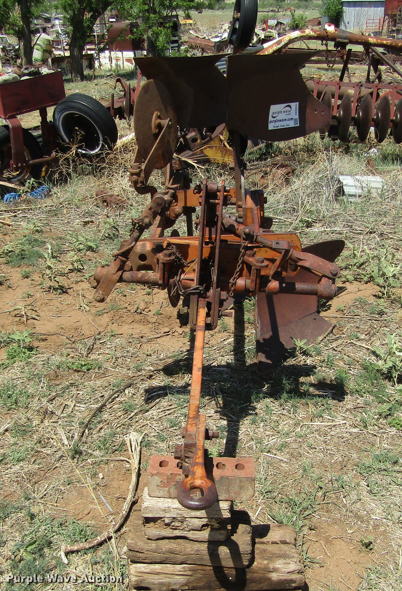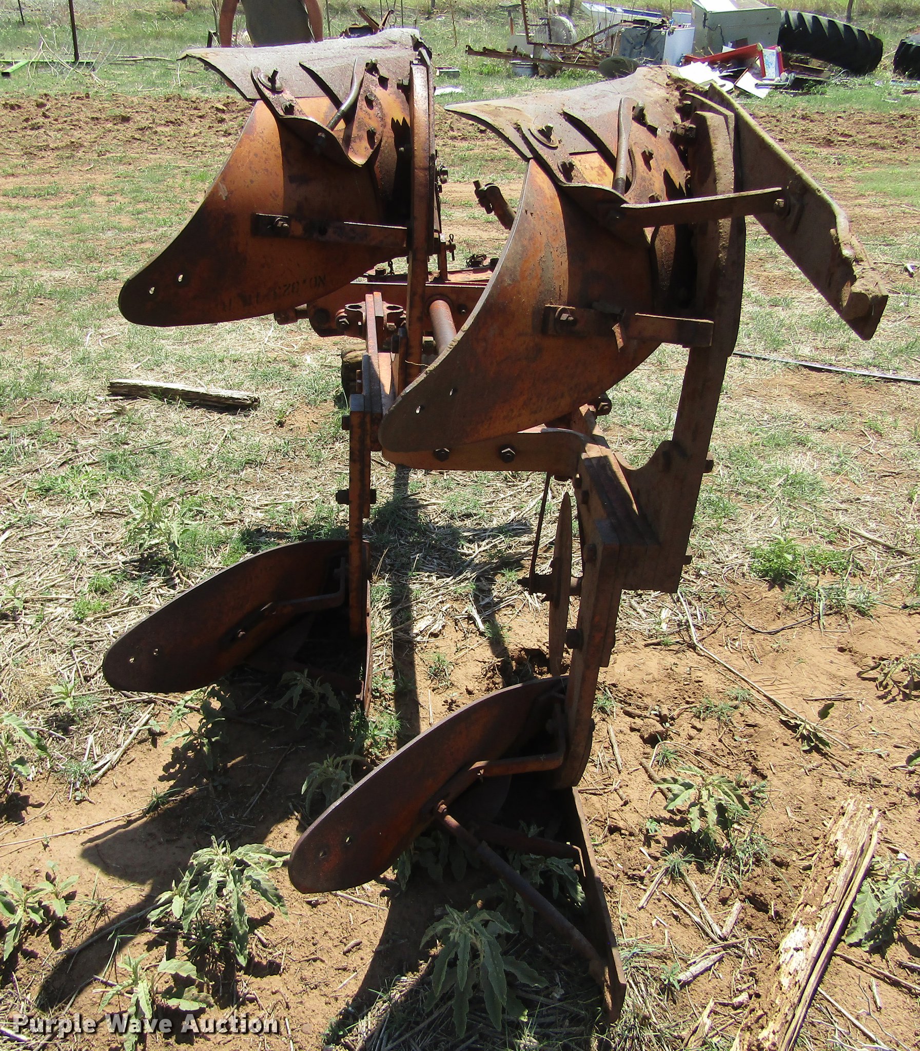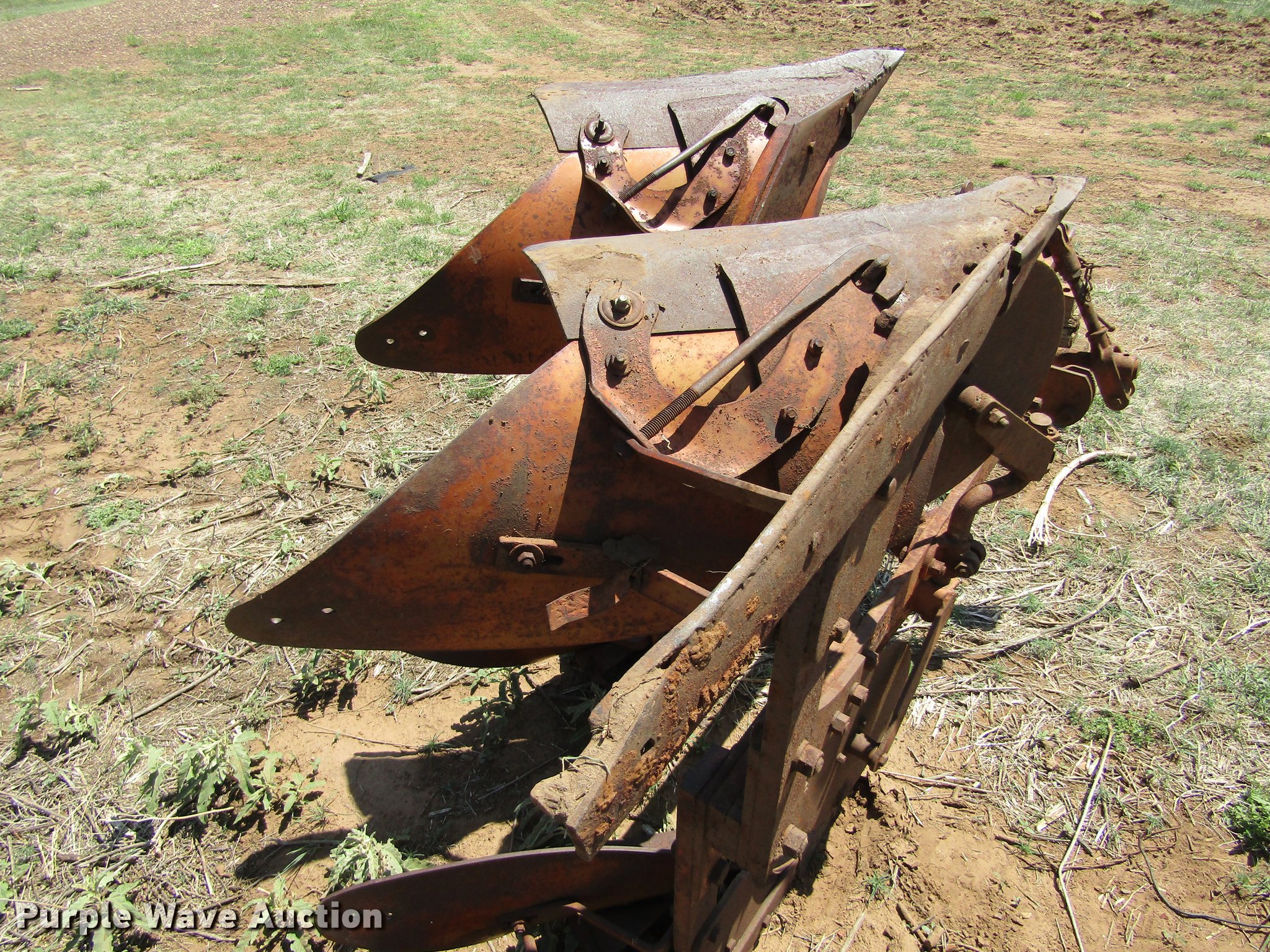 Purple Wave is selling a used Plow in Oklahoma. This item is a Allis Chalmers two bottom plow with the following: 24" shovel, Two point
