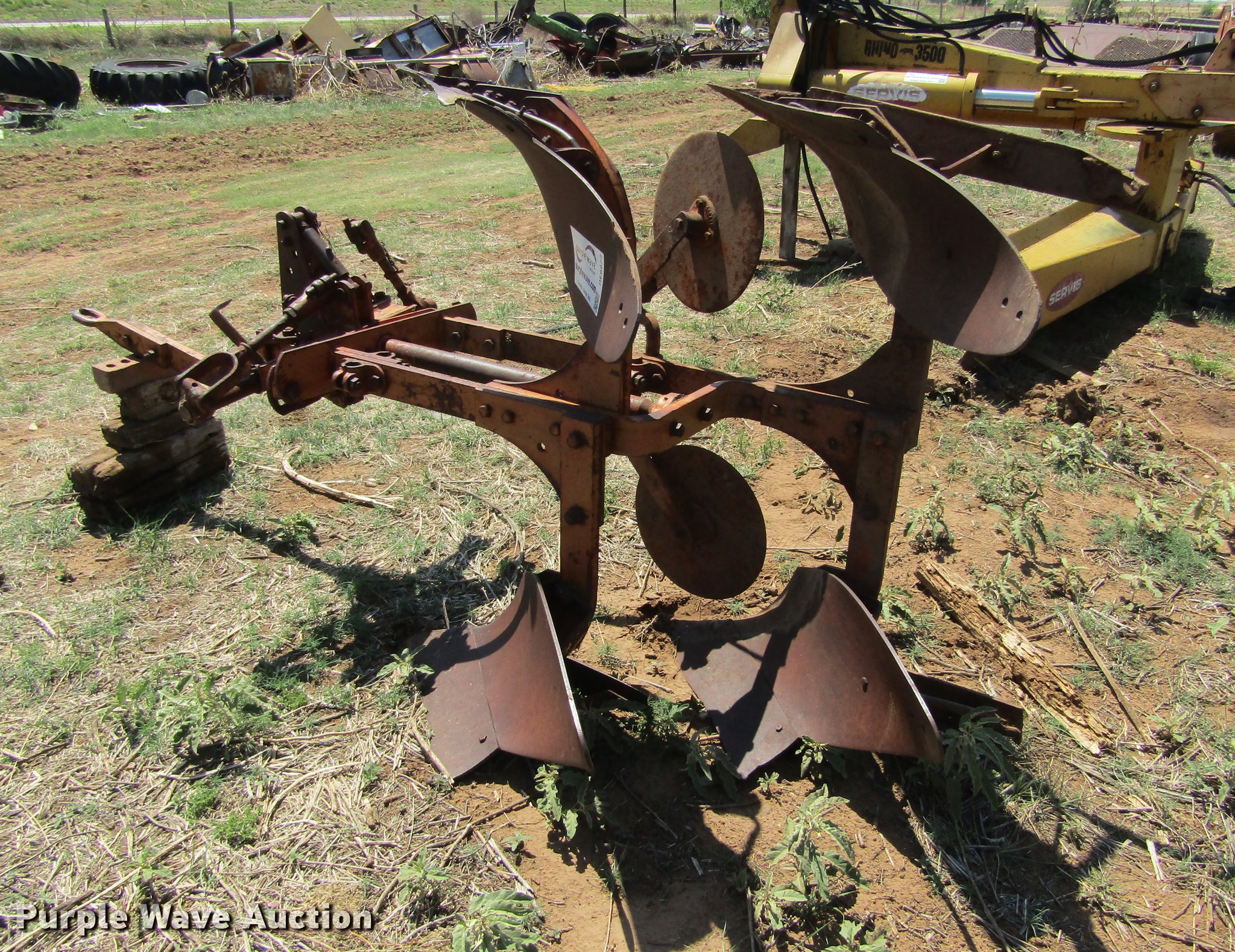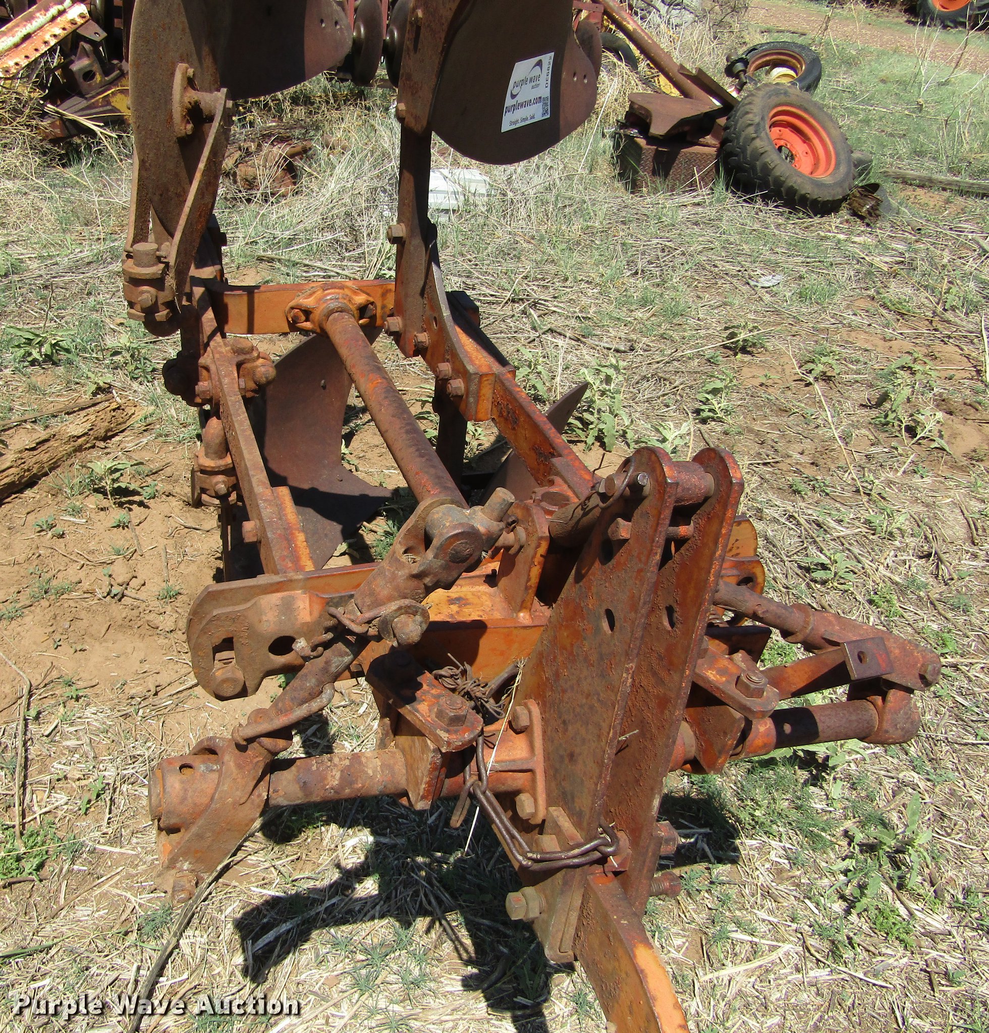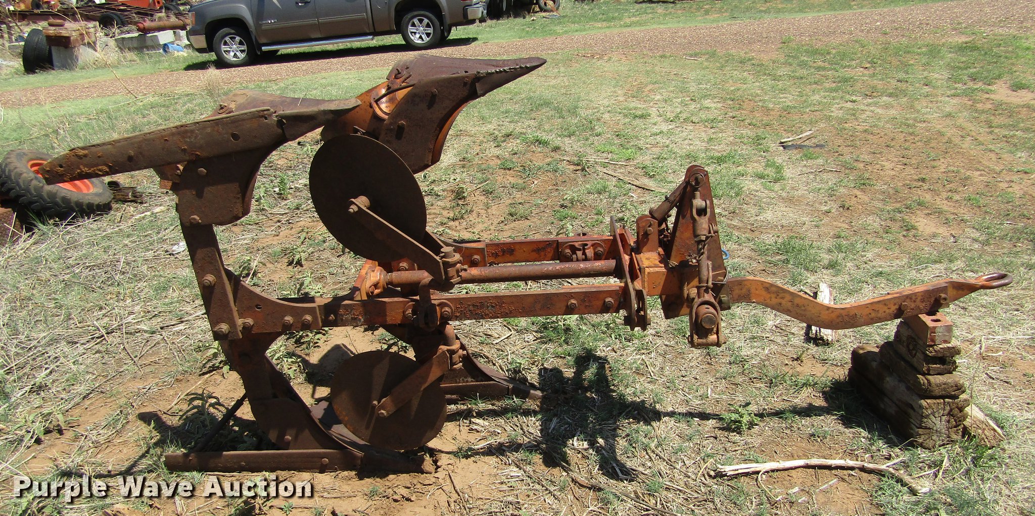 Purple Wave is selling a used Plow in Oklahoma. This item is a Allis Chalmers two bottom plow with the following: 24" shovel, Two point