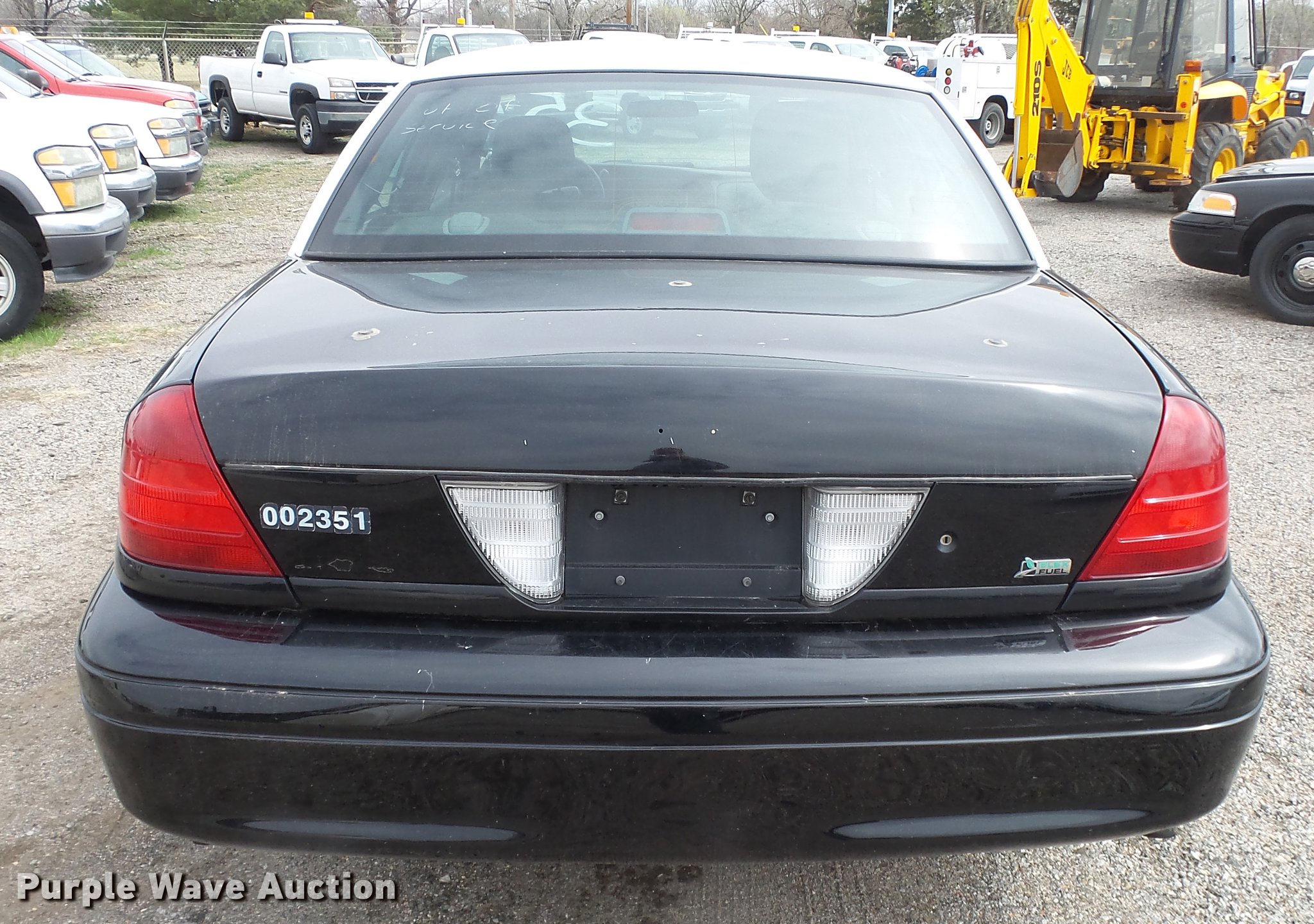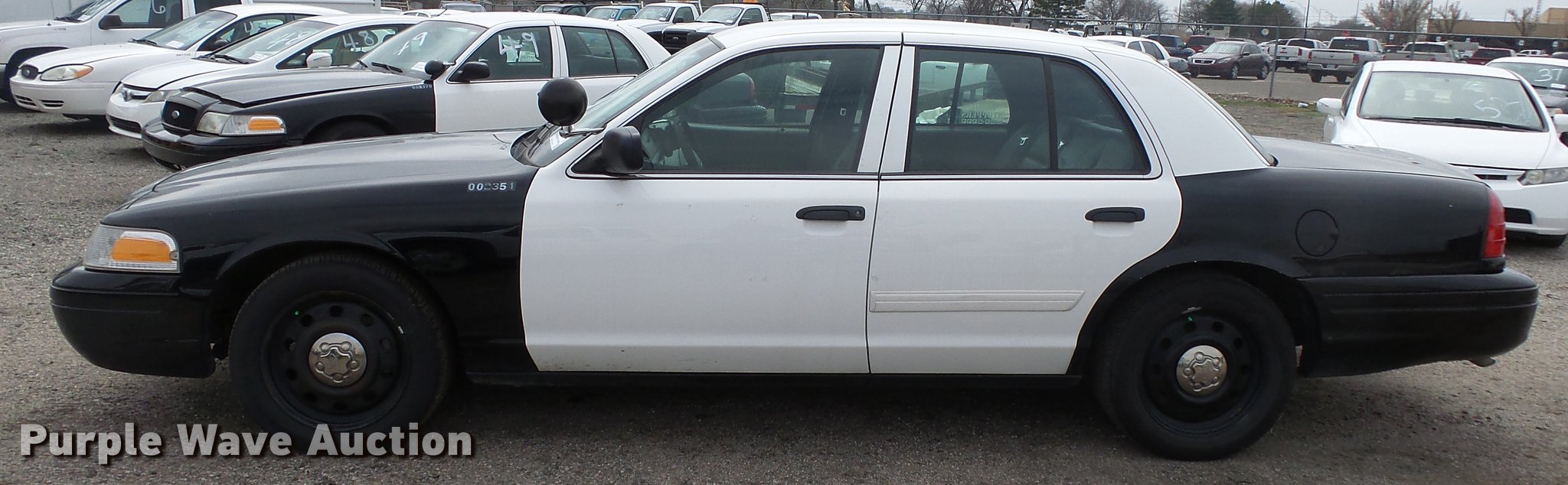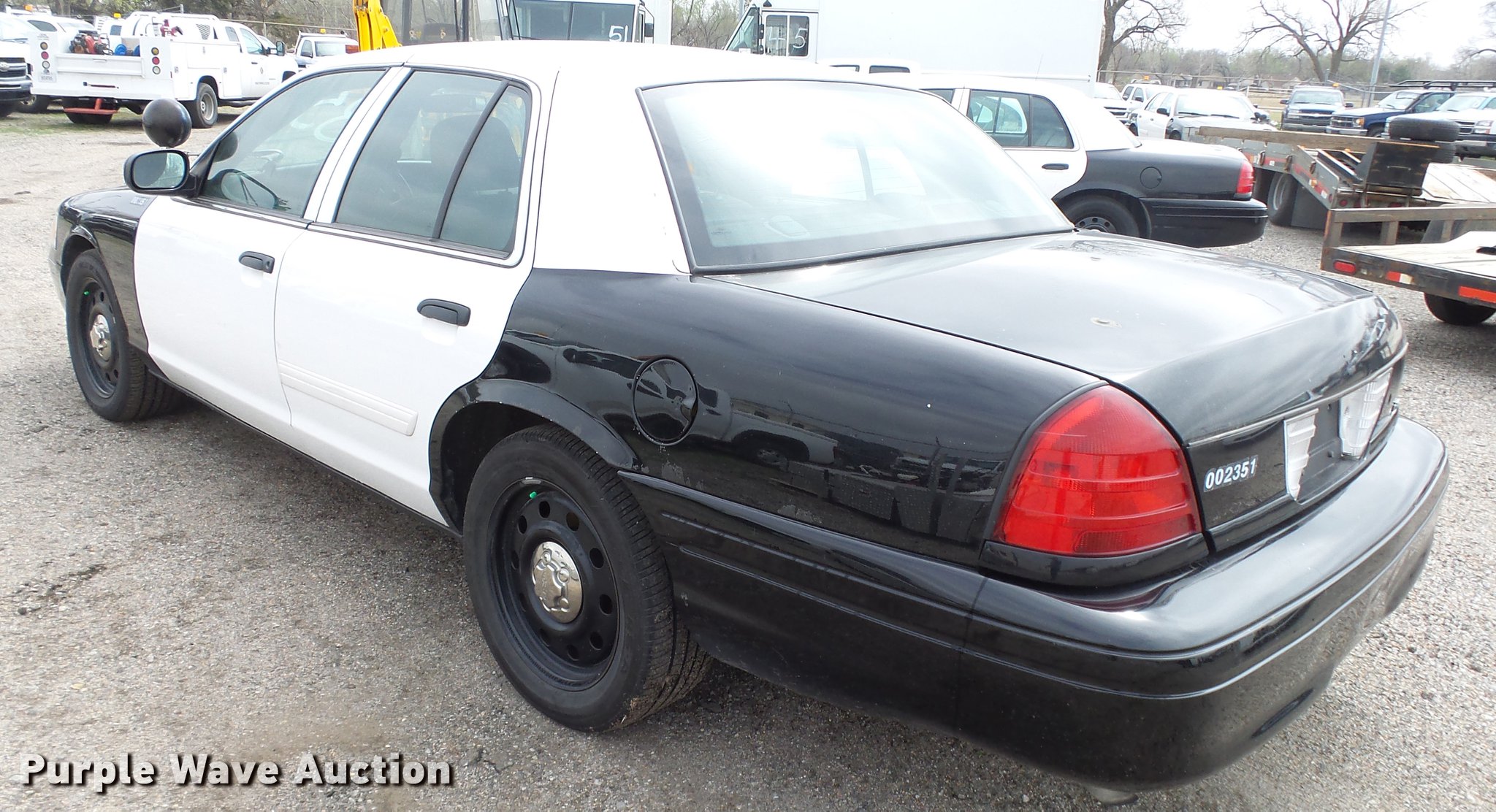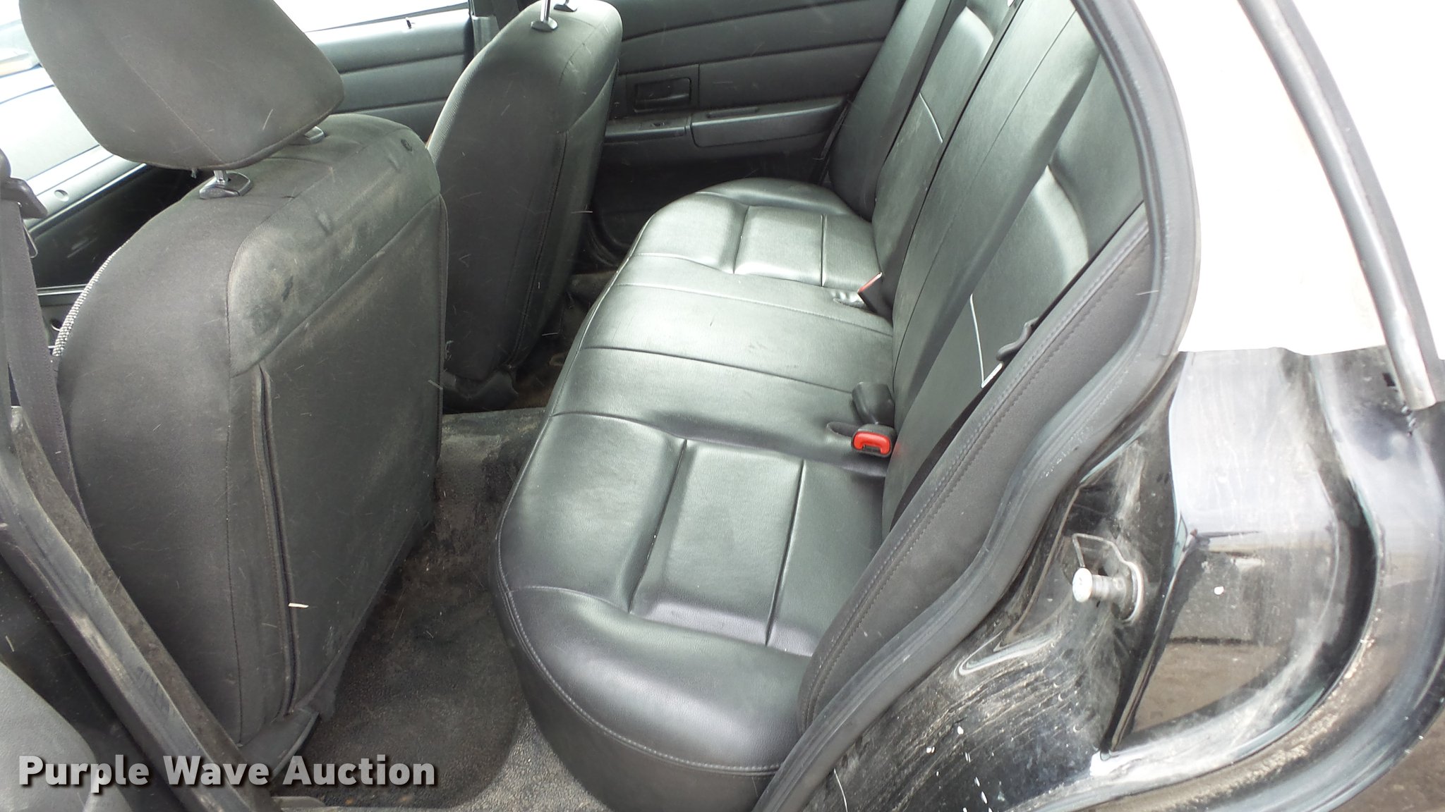 Purple Wave is selling a used Passenger Vehicle in Kansas. This item is a 2011 Ford Crown Victoria Police Interceptor with the following: 125,583 miles on odometer, 4.6L V8 SOHC 16V FFV gas engine, Automatic transmission, AC and heat, Tilt, Cruise, AM/FM, Power windows, locks, and mirrors, Cloth front interior, Vinyl rear interior, Spotlight, P235/55R17 tires, Accessory holes in roof, Unit# 002351