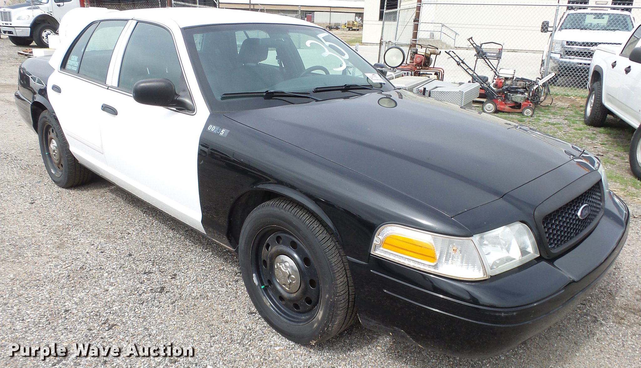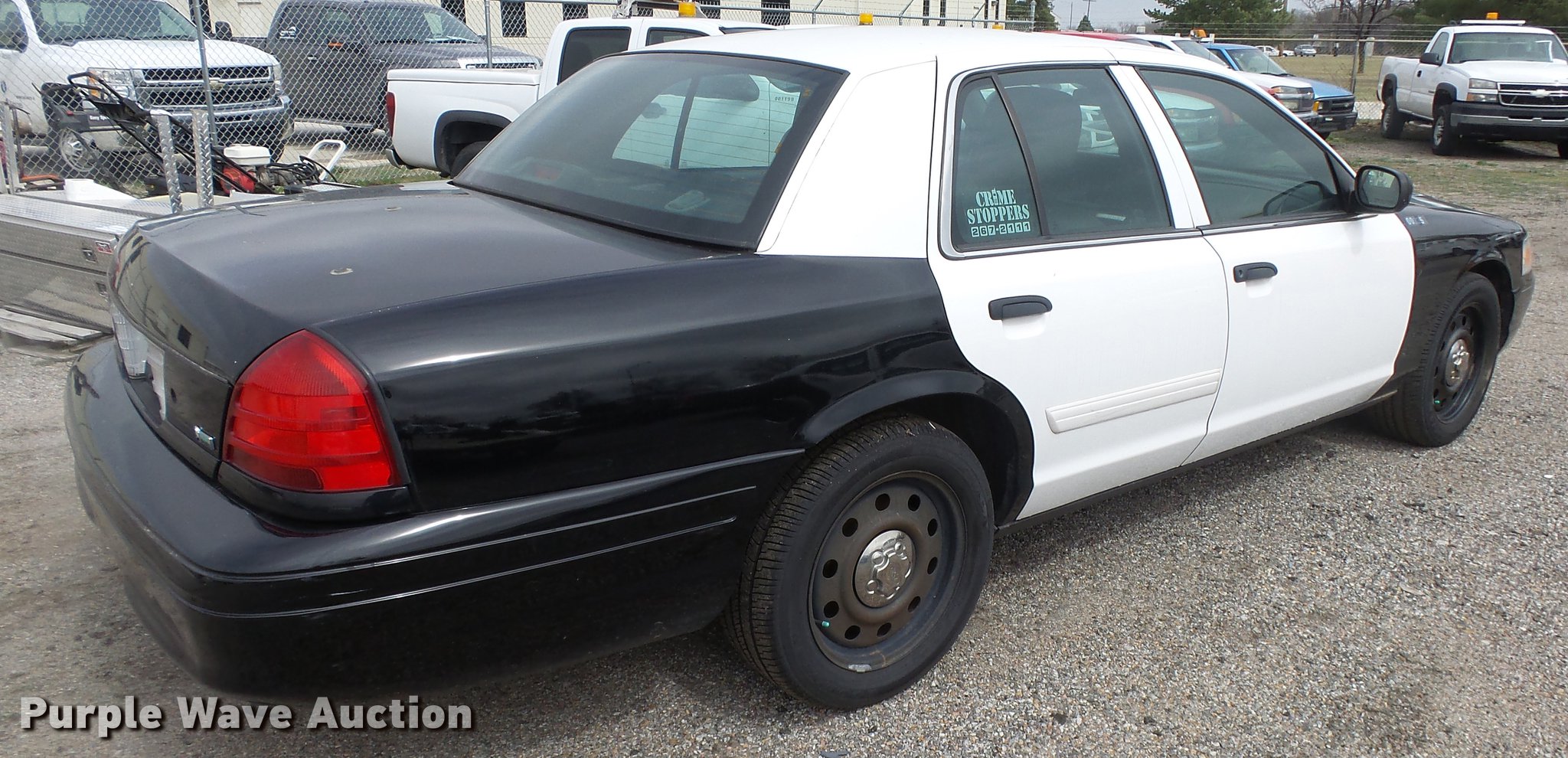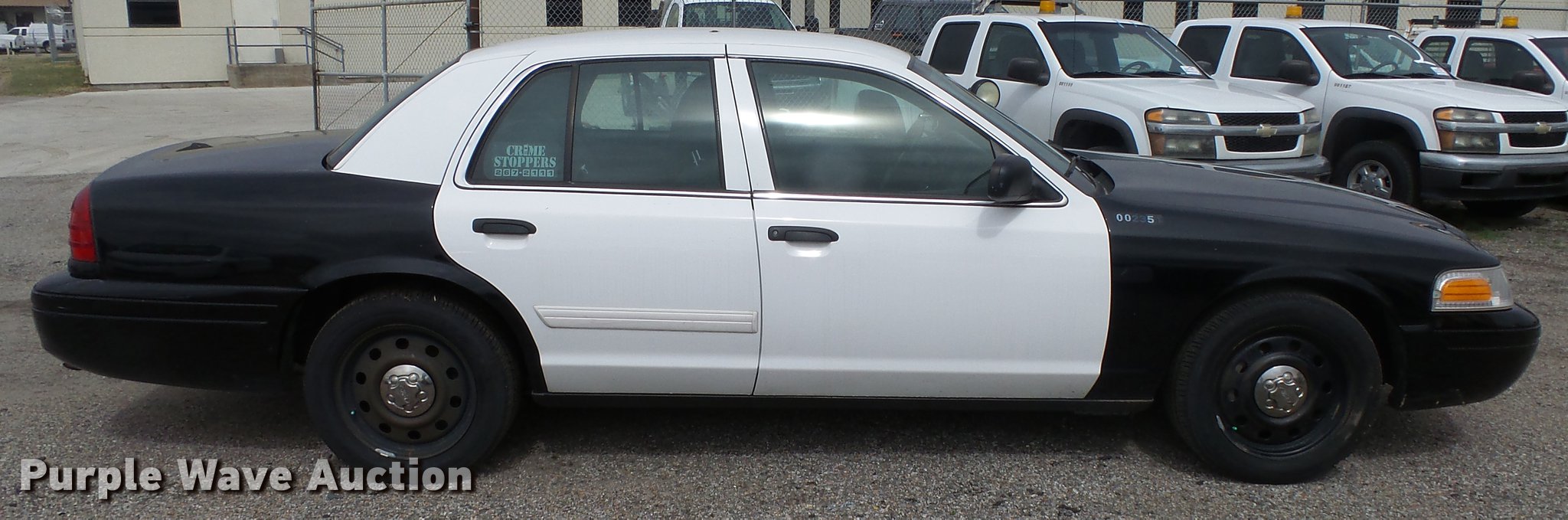 Purple Wave is selling a used Passenger Vehicle in Kansas. This item is a 2011 Ford Crown Victoria Police Interceptor with the following: 125,583 miles on odometer, 4.6L V8 SOHC 16V FFV gas engine, Automatic transmission, AC and heat, Tilt, Cruise, AM/FM, Power windows, locks, and mirrors, Cloth front interior, Vinyl rear interior, Spotlight, P235/55R17 tires, Accessory holes in roof, Unit# 002351