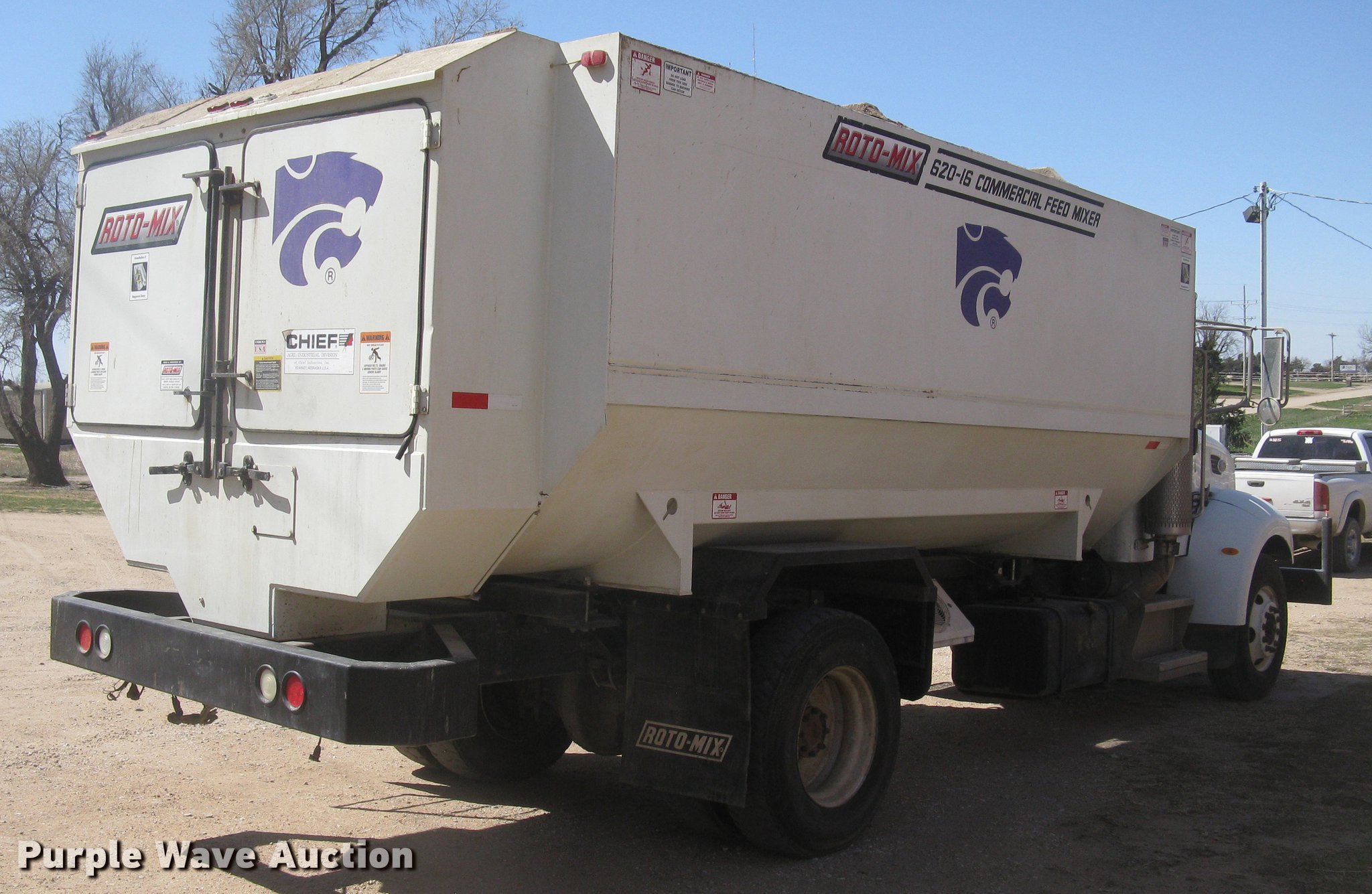 2008 Peterbilt 335 feed mixer truck. 93,751 miles on odometer, 14,073 hours on meter, Paccar PX-8 8.3L L6 turbo diesel engine, Allison 3500RDS-P automatic transmission, Single axle, AC and heat, Tilt, Telescoping steering wheel, Cruise, AM/FM/CD, Power and heated mirrors, Air suspension seat, Red Dot AC unit, Block heater, PTO, Exterior visor, Single exhaust stack, Roto-Mix 620-16 feed mixer 4,038 hours on meter, 16'L feed box, Bunk-side work lights, Garmin GPS head, (4) scale bodies, Bunk finder front bumper with roller, In-cab controls, PTO operated, DigiStar TCX1000 scales In-cab, 48"W side discharge, Hydraulic chute, Hydraulic door, (2) augers, Paddle mixer, Stainless steel liner, Serial 400646262, Single fuel tank, Full fender, Mud flaps, 7:17 gear ratio, Spring suspension, Air brakes, Double frame, 11R22.5 tires, GVWR 33,000 lbs, FAWR 10,000 lbs, RAWR 23,000 lbs, Additional Roto-Mix parts selling as item BF9767. Kansas non-highway title. 2NPLHN7X38M760419. Knight Feedlot. 1768 Ave J. Lyons, KS 67554