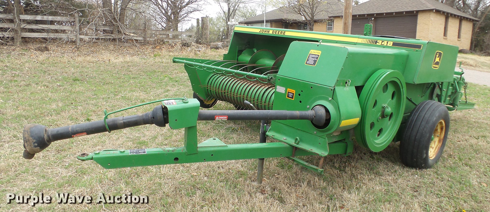 Purple Wave is selling a used Square Baler in Kansas. This item is a 2000 John Deere 348 square baler with the following: 14" x 18" bale capacity, 60" pickup width, Wire tie, 540 PTO, 26x12.00-12 tires, 9.5L-15 tires, Additional parts and accessories, Serial E00348X990677