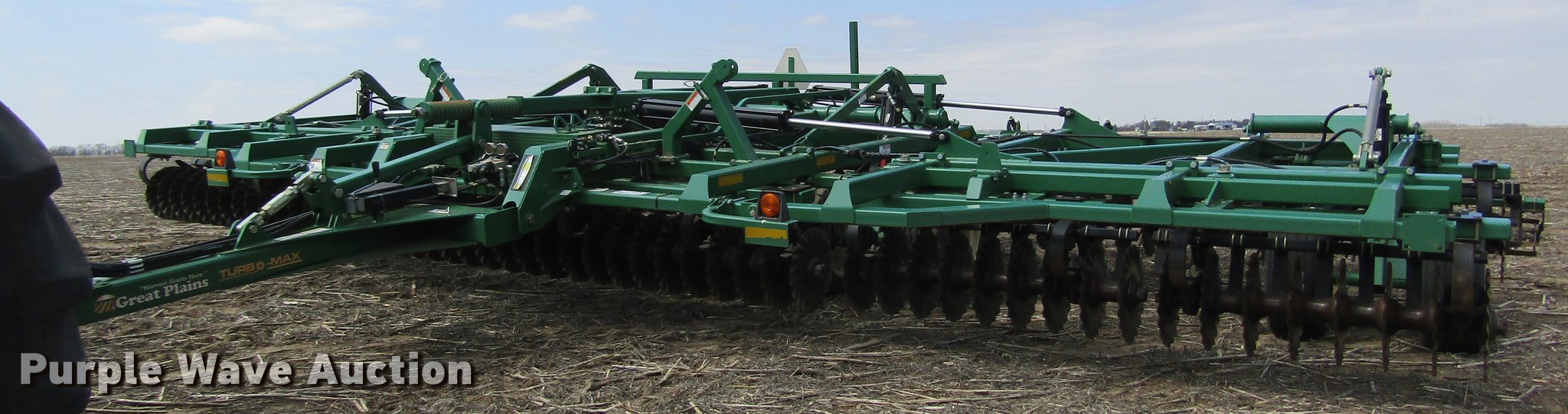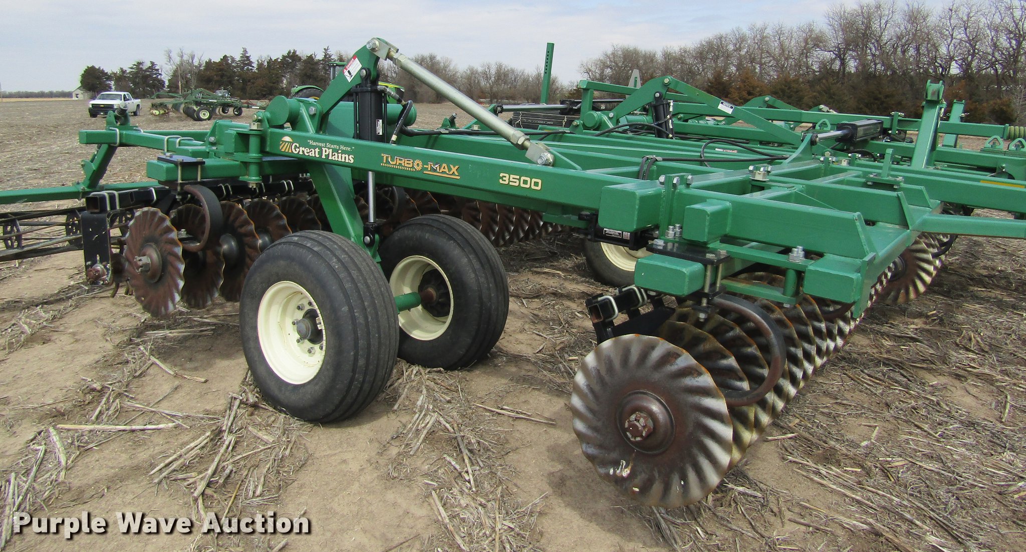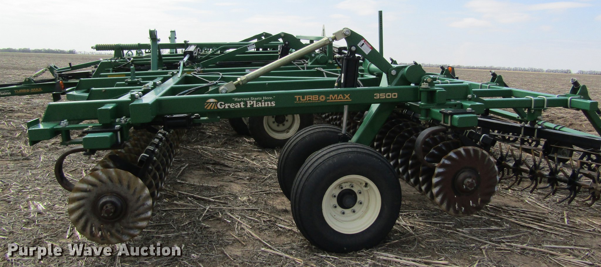 Purple Wave is selling a used Vertical Tillage in Kansas. This item is a 2013 Great Plains Turbo Max 3500TM vertical tillage with the following: 35'W, 19.5" diameter blades, 7 1/4" spacing, Spool cleaners, Reel/rolling basket, Rolling pickers/treader, Manual leveler, Hydraulic lift and fold, Transport lights, Pin/clevis hitch, Walking tandem axle, 440/55R18 transport tires, 12.5L-15 tires, Additional tire, Right wing sensor wire damaged, Serial GP-C2267H