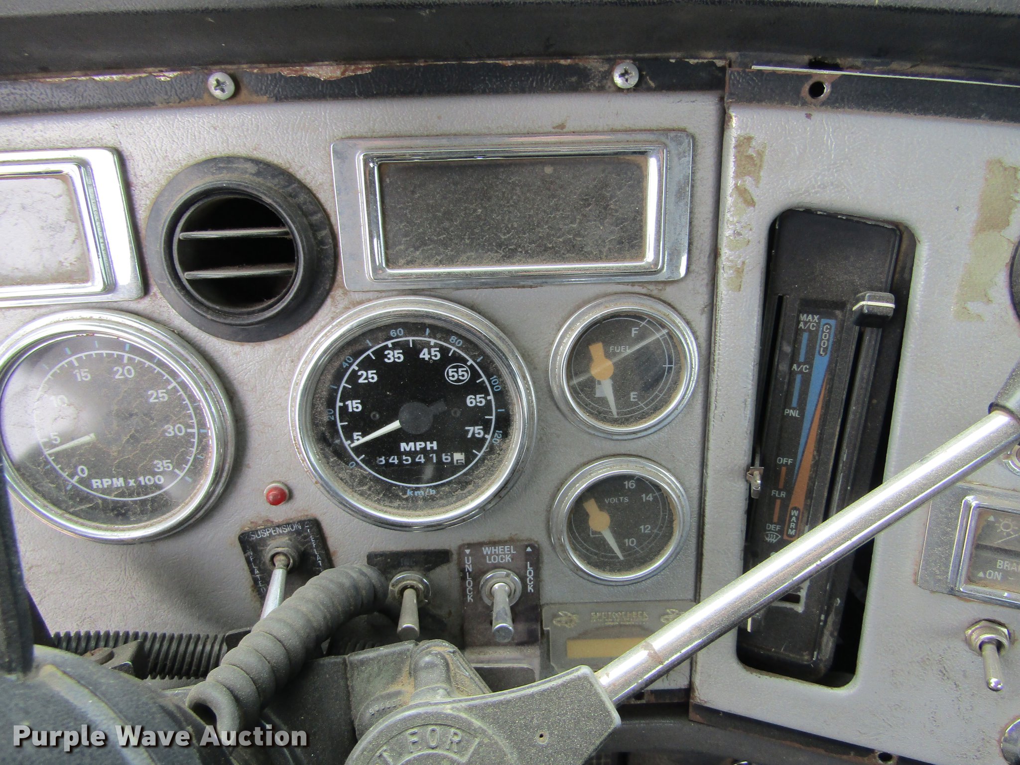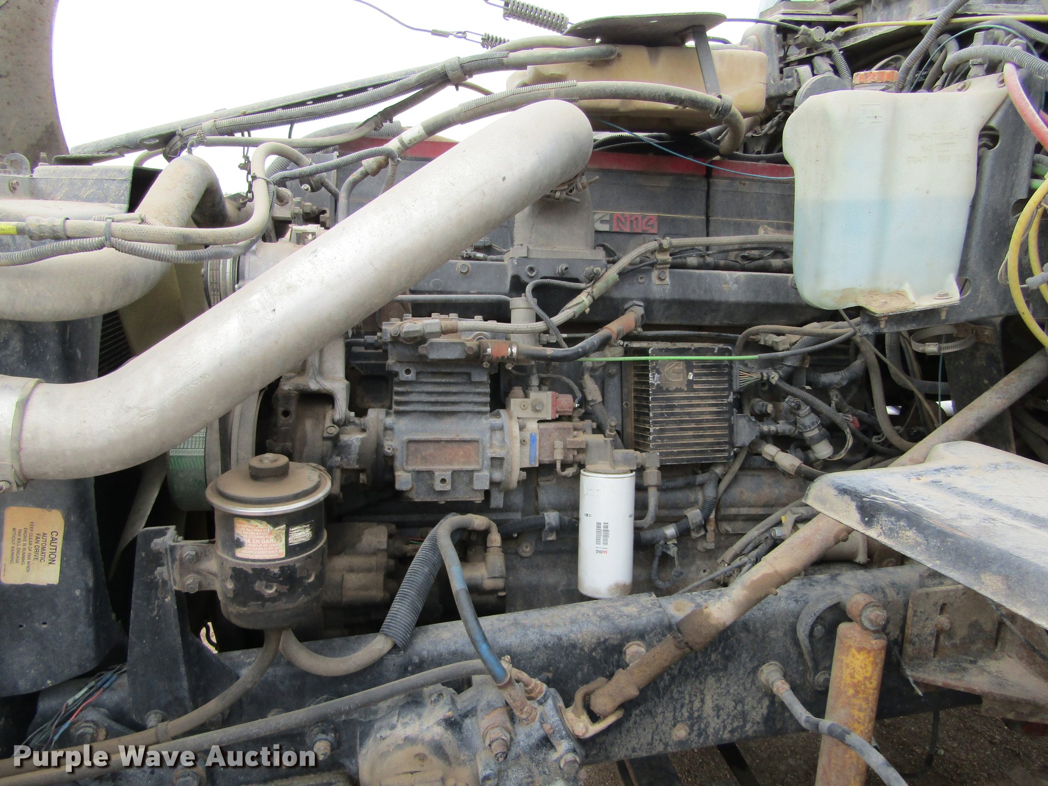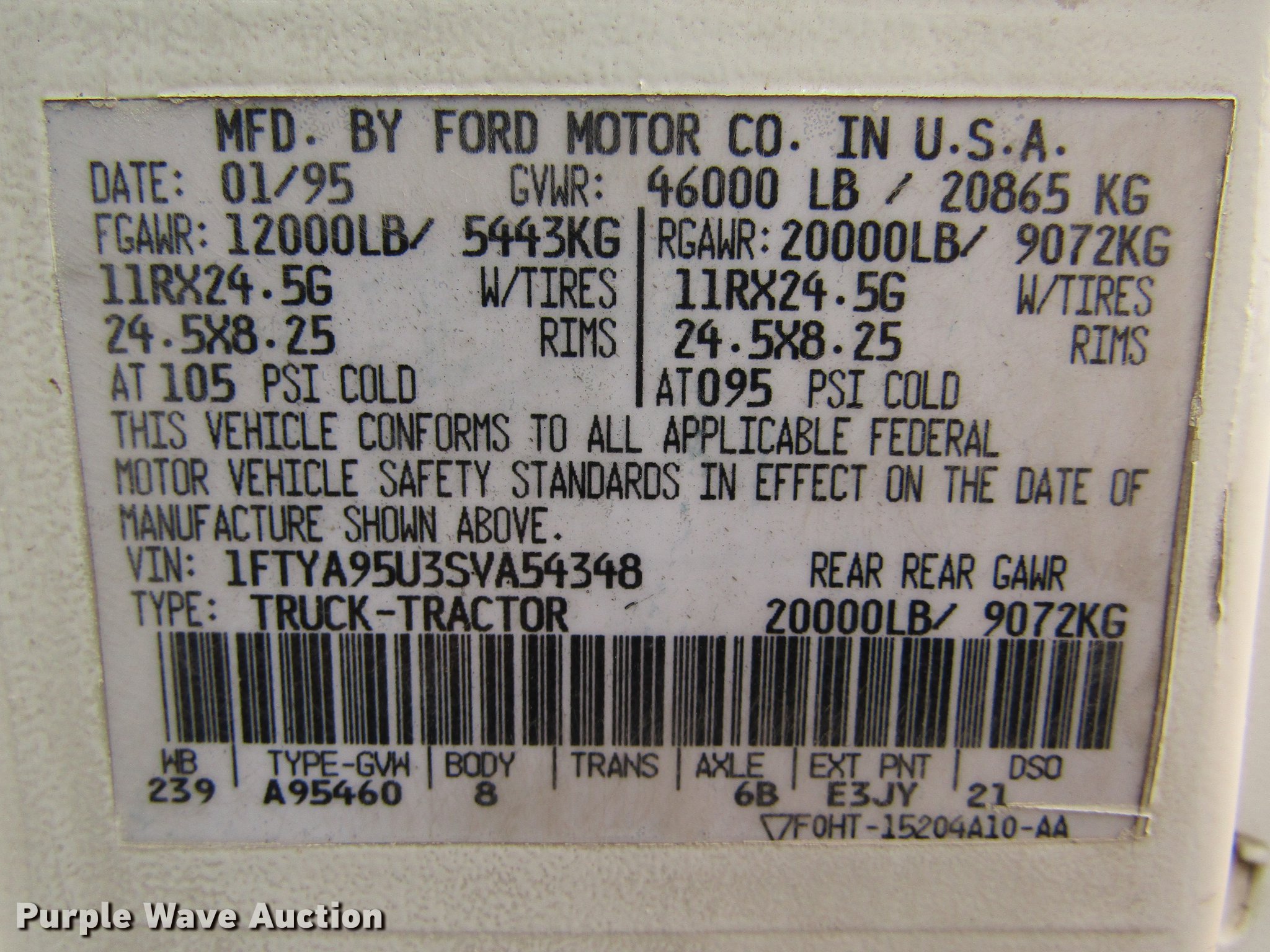 Purple Wave is selling a used Truck Tractor in Kansas. This item is a 1995 Ford LTLA9000 AeroMax 120 semi truck with the following: 845,416 miles on odometer, Cummins N14 14.0L L6 turbo diesel engine, Eaton Fuller Road Ranger nine speed manual transmission, Tandem axle, AC and heat, Cruise, AM/FM, Heated mirrors, Air suspension seat, Exterior visor, PTO, Dual fuel tanks, 239" wheelbase, Air suspension, Air brakes, 11R24.5 tires, GVWR 46,000 lbs, FAWR 12,000 lbs, RAWR 20,000 lbs, ECM needs replaced