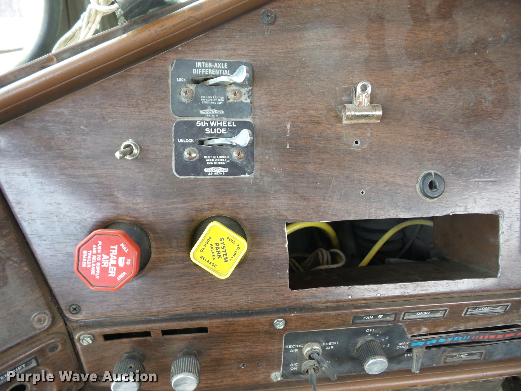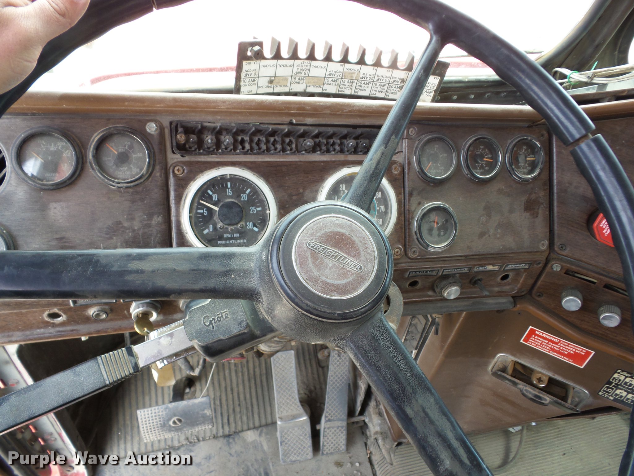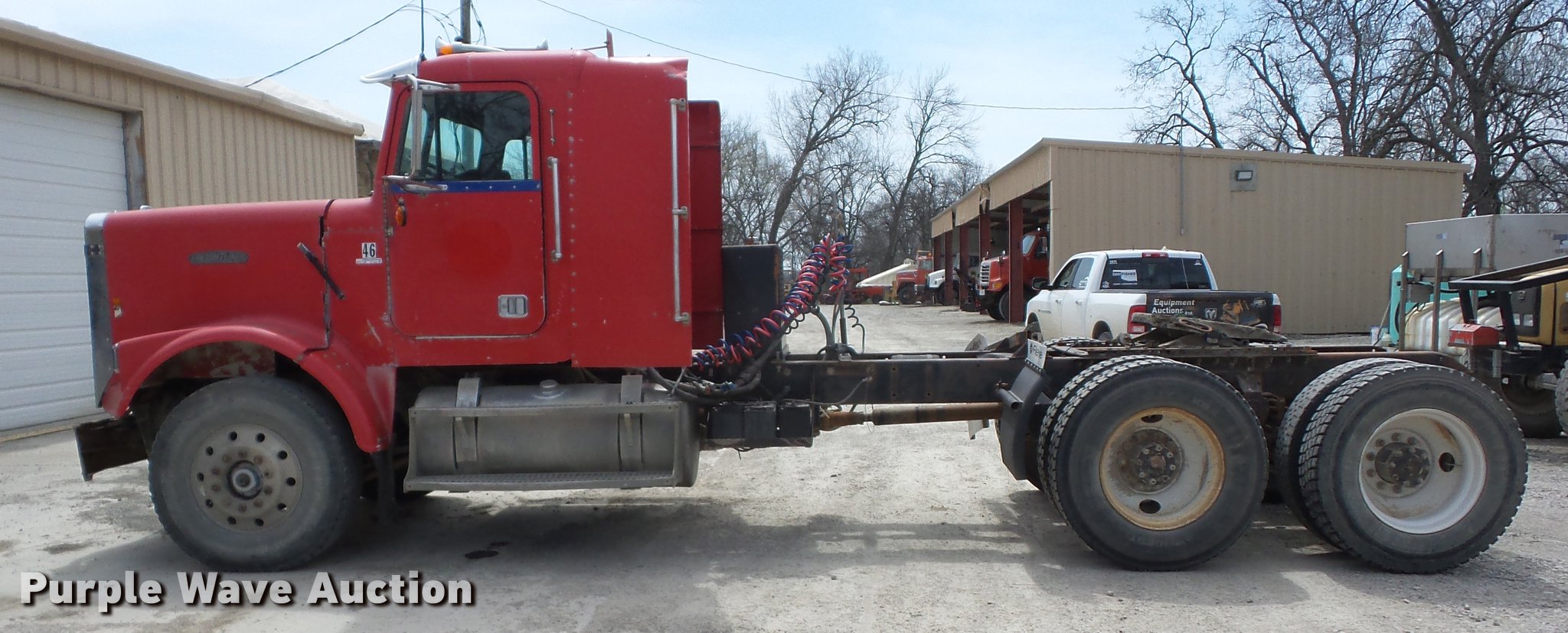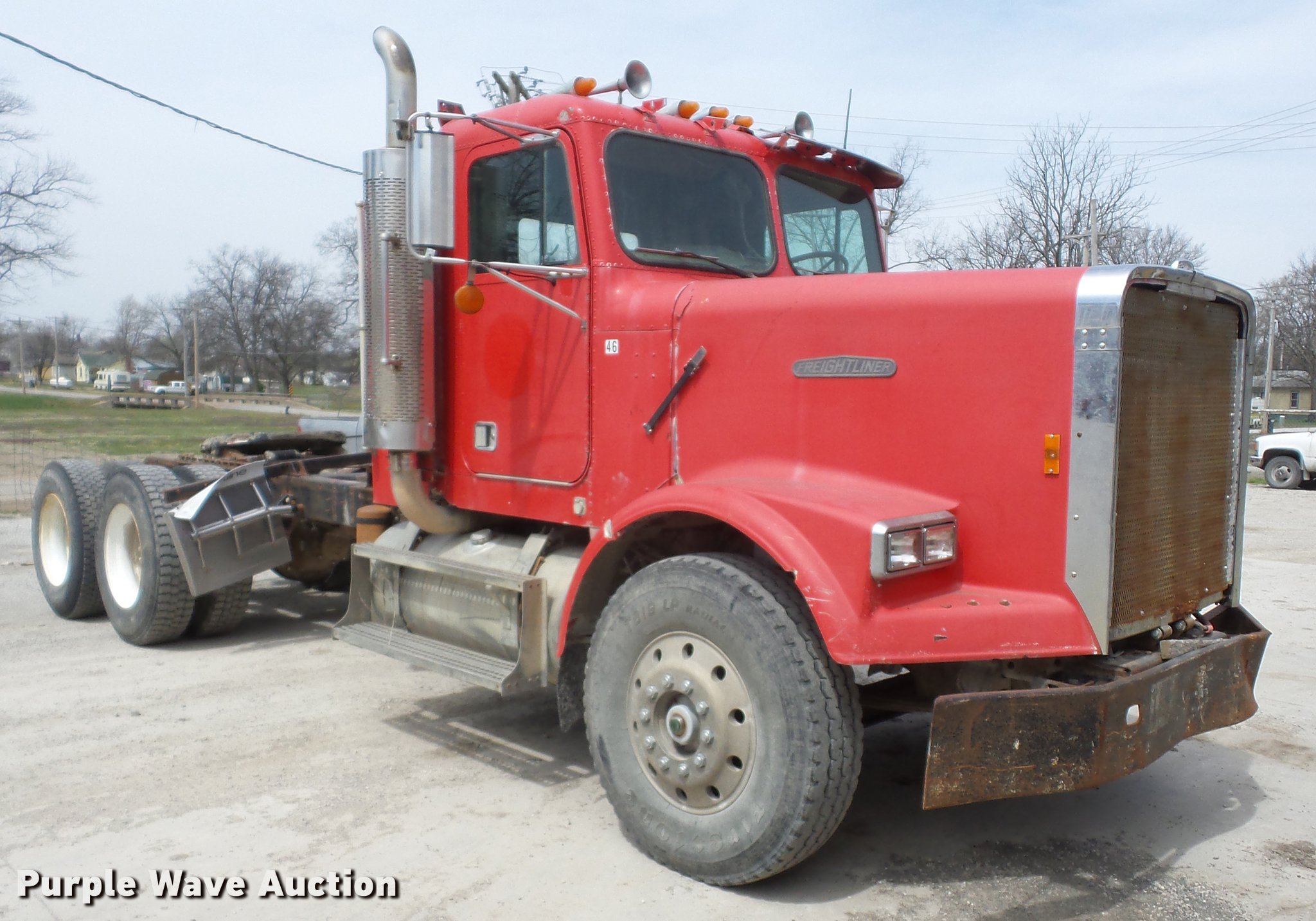 Purple Wave is selling a used Truck Tractor in Kansas. This item is a 1987 Freightliner FLC semi truck with the following: 630,602 miles on odometer, Cummins 14.0L L6 turbo diesel engine, Eaton Fuller Road Ranger nine speed manual transmission, Tandem axle, Inter-axle differential lock, AC and heat, Air suspension seat, PTO, Wet kit, Exterior visor, Single exhaust stack, Air operated sliding fifth wheel plate, Quarter fenders, Spring suspension, Air brakes, 315/80R22.5 front tires, 11R24.5 rear tires, Unit# 46