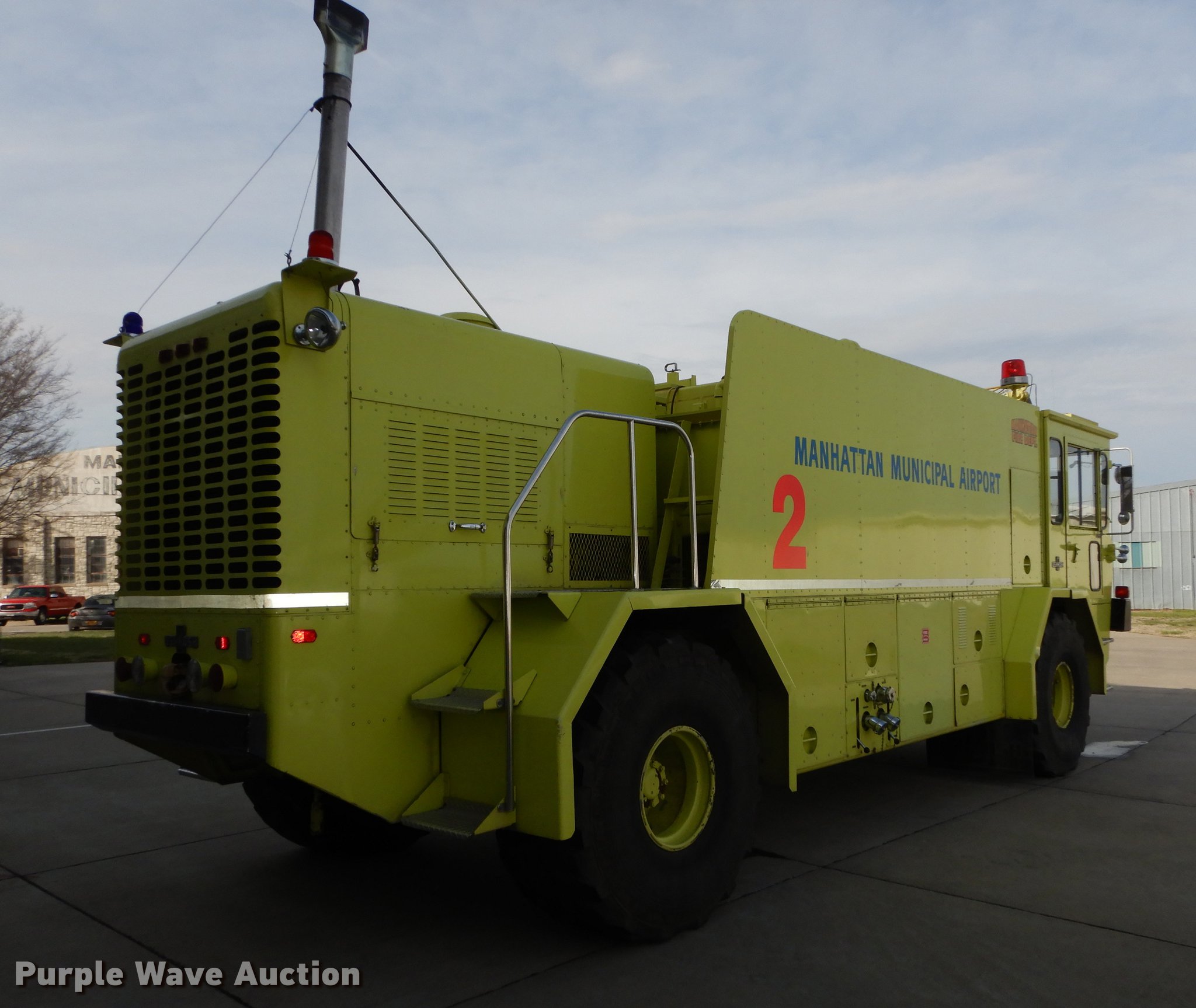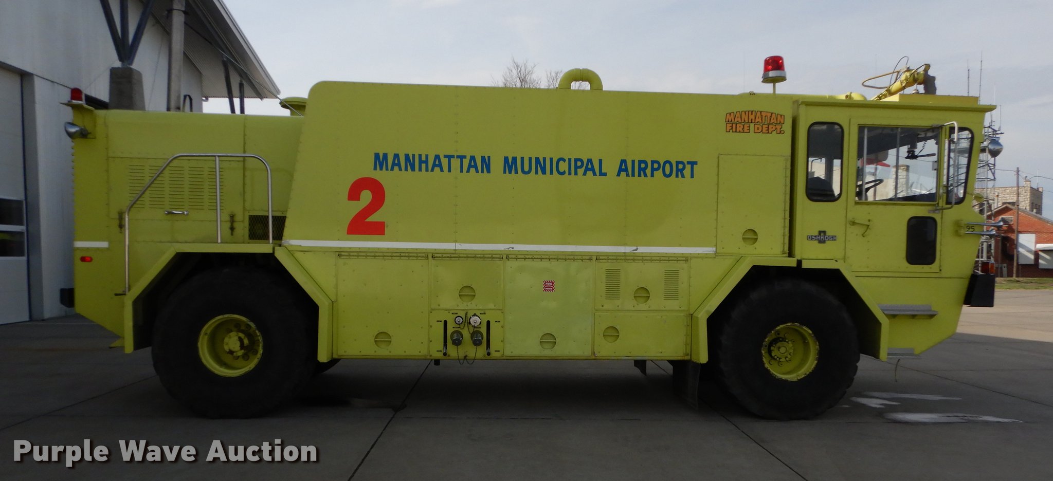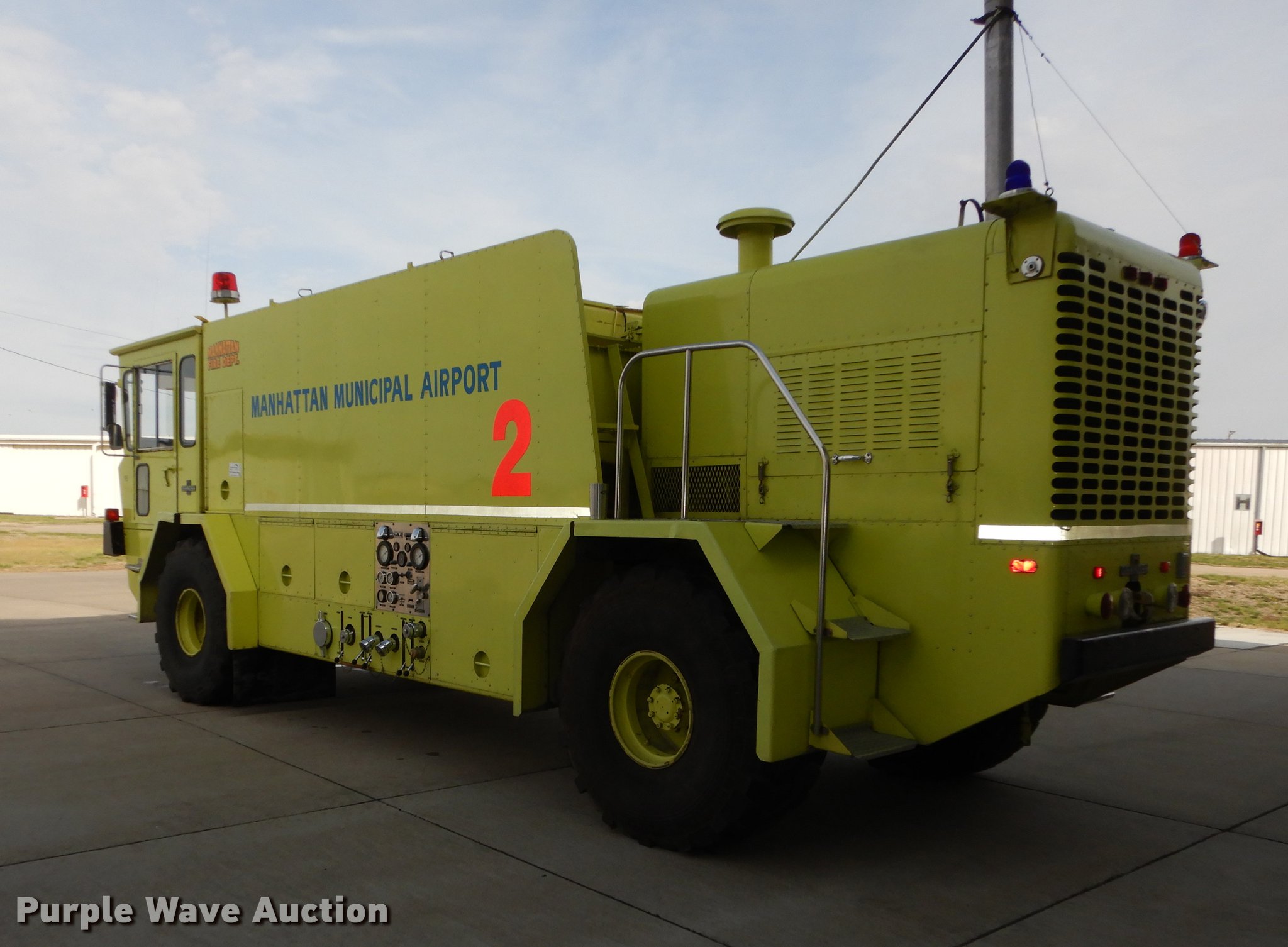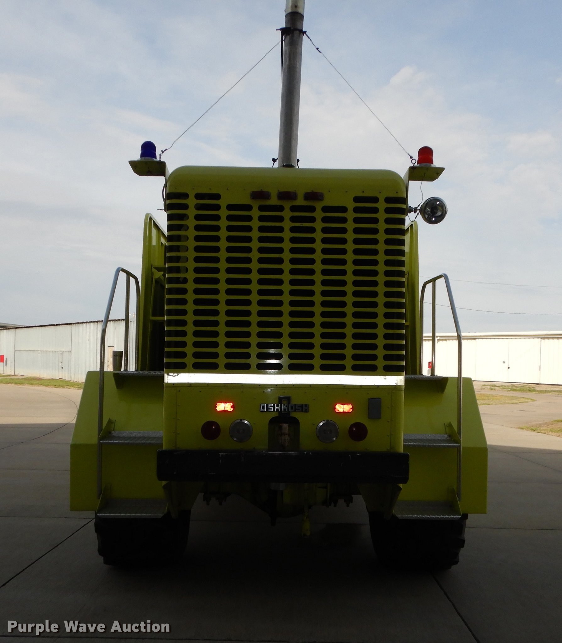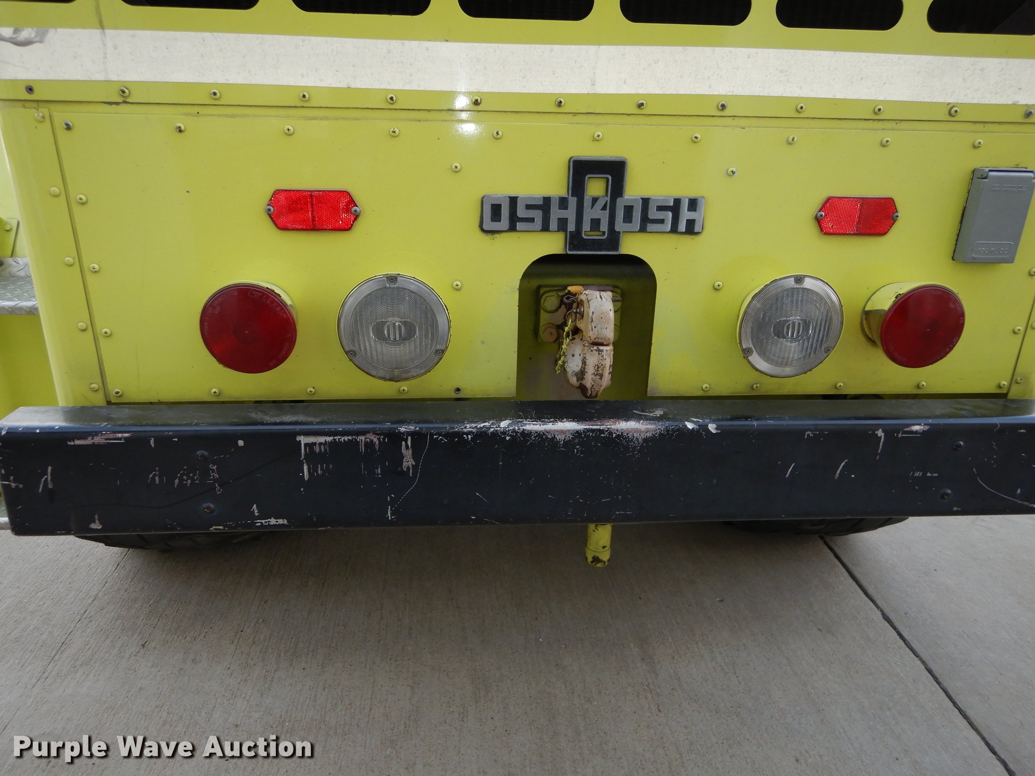 Purple Wave is selling a used Fire Truck or Emergency Vehicle in Kansas. This item is a 1980 Oshkosh ARFF fire truck with the following: 8,093 miles on odometer, 2,772 pump hours on meter, Detroit Diesel turbo diesel engine, Serial 8VF0471Q0, Allison automatic transmission, Single axle, Air horn, Emergency lights and sirens, Signal-Stat VII system, Front mounted pump, Roof turret, 800 high flow gpm, 400 low flow gpm, Bumper turret, 375 gpm low flow, Hydraulic and manual operation, (3) 17 gpm under truck nozzles, 150' hose, 30 gpm, Foam storage tank, 205 gallon capacity, Six percent full, Water storage tank, 1,585 gallon capacity, No dry chemical storage, Pintle hitch, Spring suspension, Air brakes, 194" wheelbase, Michelin 24-20.5 tires, Additional tire and wheel, Leaks, Top extension tube not included, Ladder not included, Decals will be removed or painted over