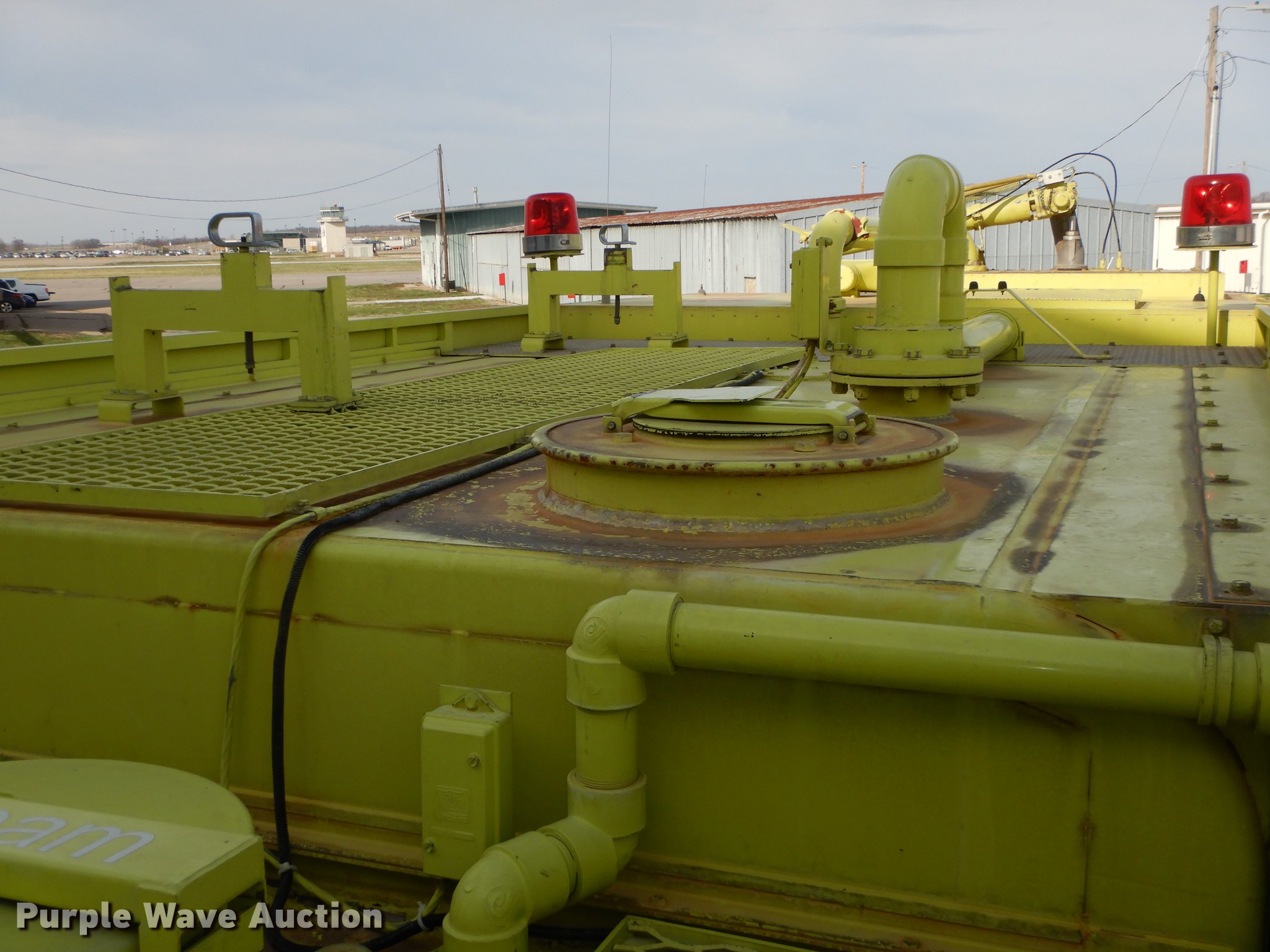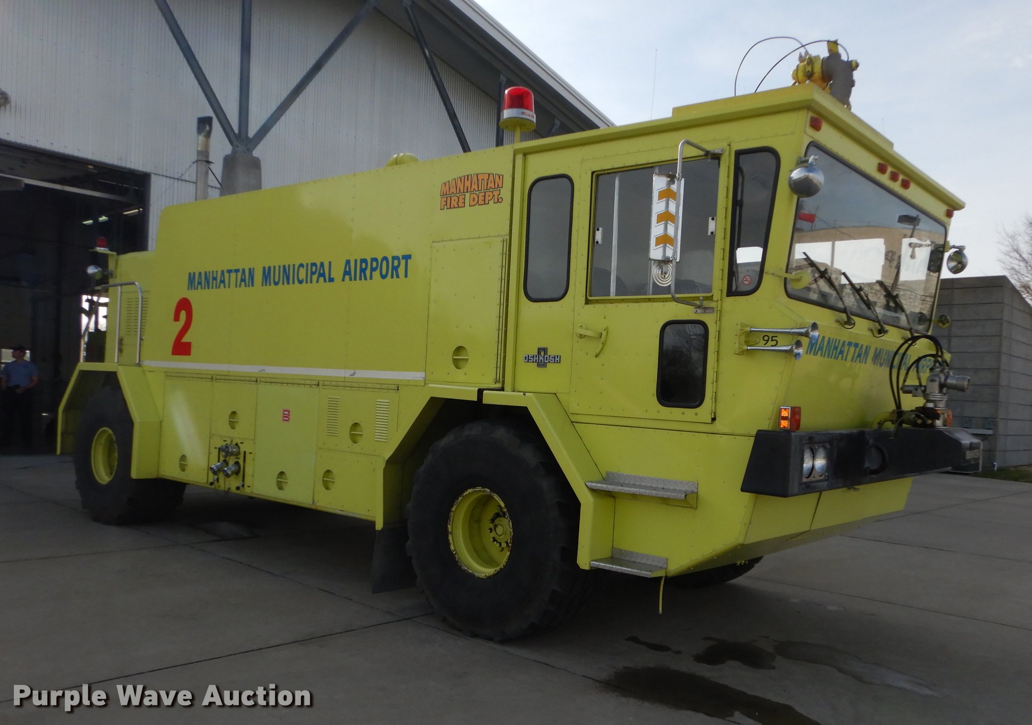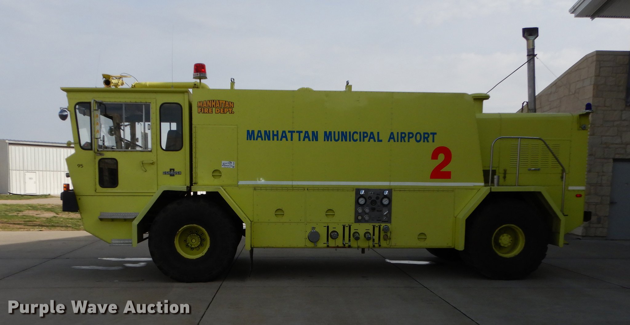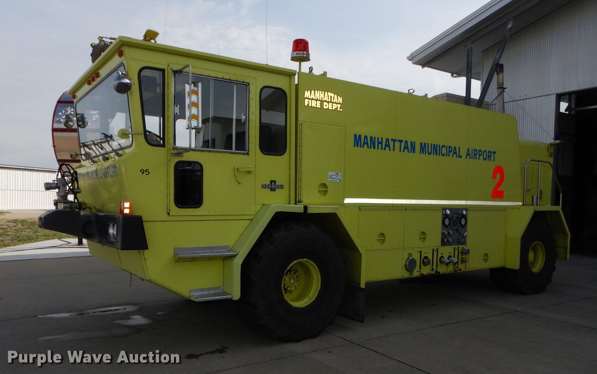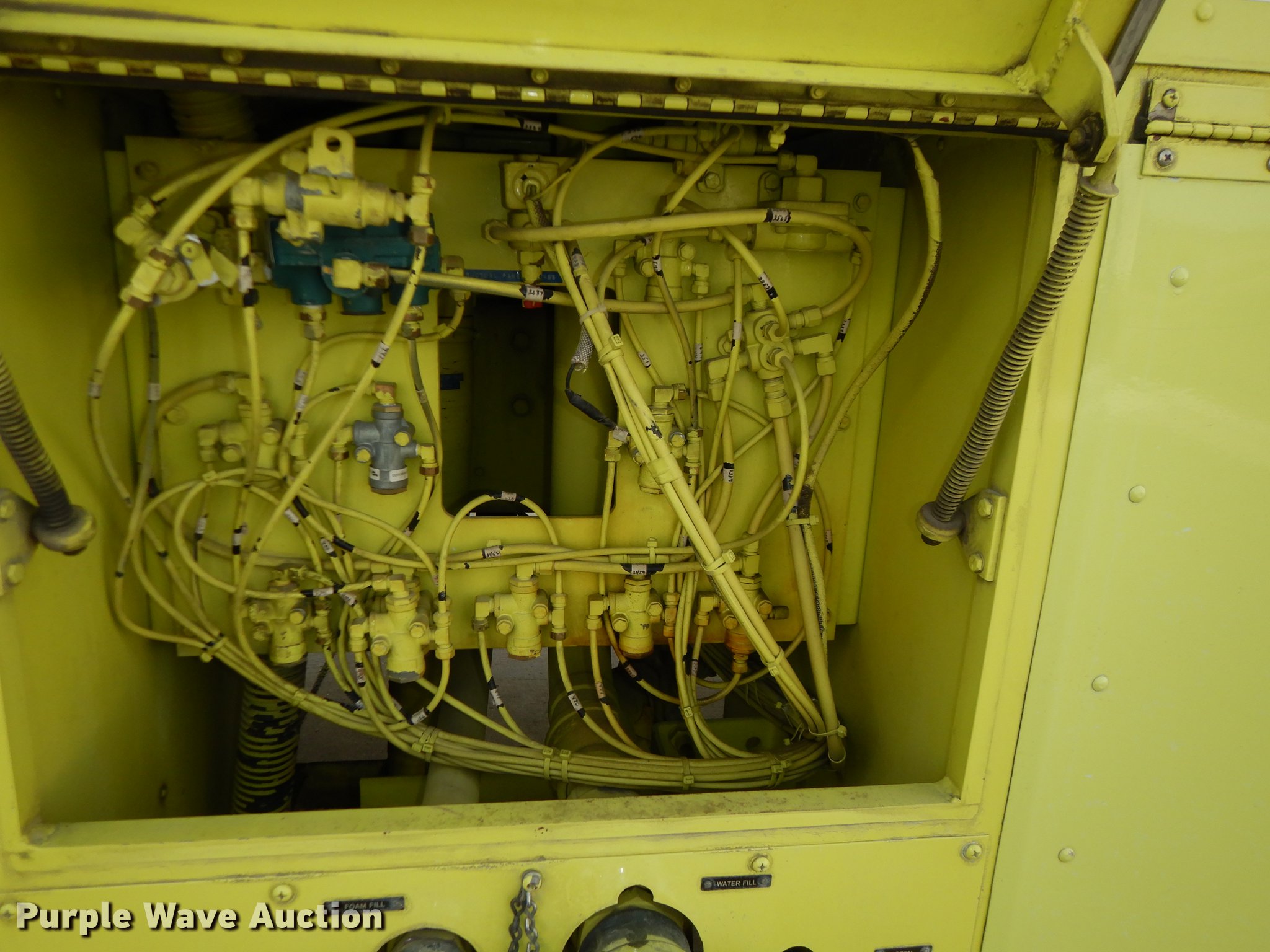Purple Wave is selling a used Fire Truck or Emergency Vehicle in Kansas. This item is a 1980 Oshkosh ARFF fire truck with the following: 8,093 miles on odometer, 2,772 pump hours on meter, Detroit Diesel turbo diesel engine, Serial 8VF0471Q0, Allison automatic transmission, Single axle, Air horn, Emergency lights and sirens, Signal-Stat VII system, Front mounted pump, Roof turret, 800 high flow gpm, 400 low flow gpm, Bumper turret, 375 gpm low flow, Hydraulic and manual operation, (3) 17 gpm under truck nozzles, 150' hose, 30 gpm, Foam storage tank, 205 gallon capacity, Six percent full, Water storage tank, 1,585 gallon capacity, No dry chemical storage, Pintle hitch, Spring suspension, Air brakes, 194" wheelbase, Michelin 24-20.5 tires, Additional tire and wheel, Leaks, Top extension tube not included, Ladder not included, Decals will be removed or painted over