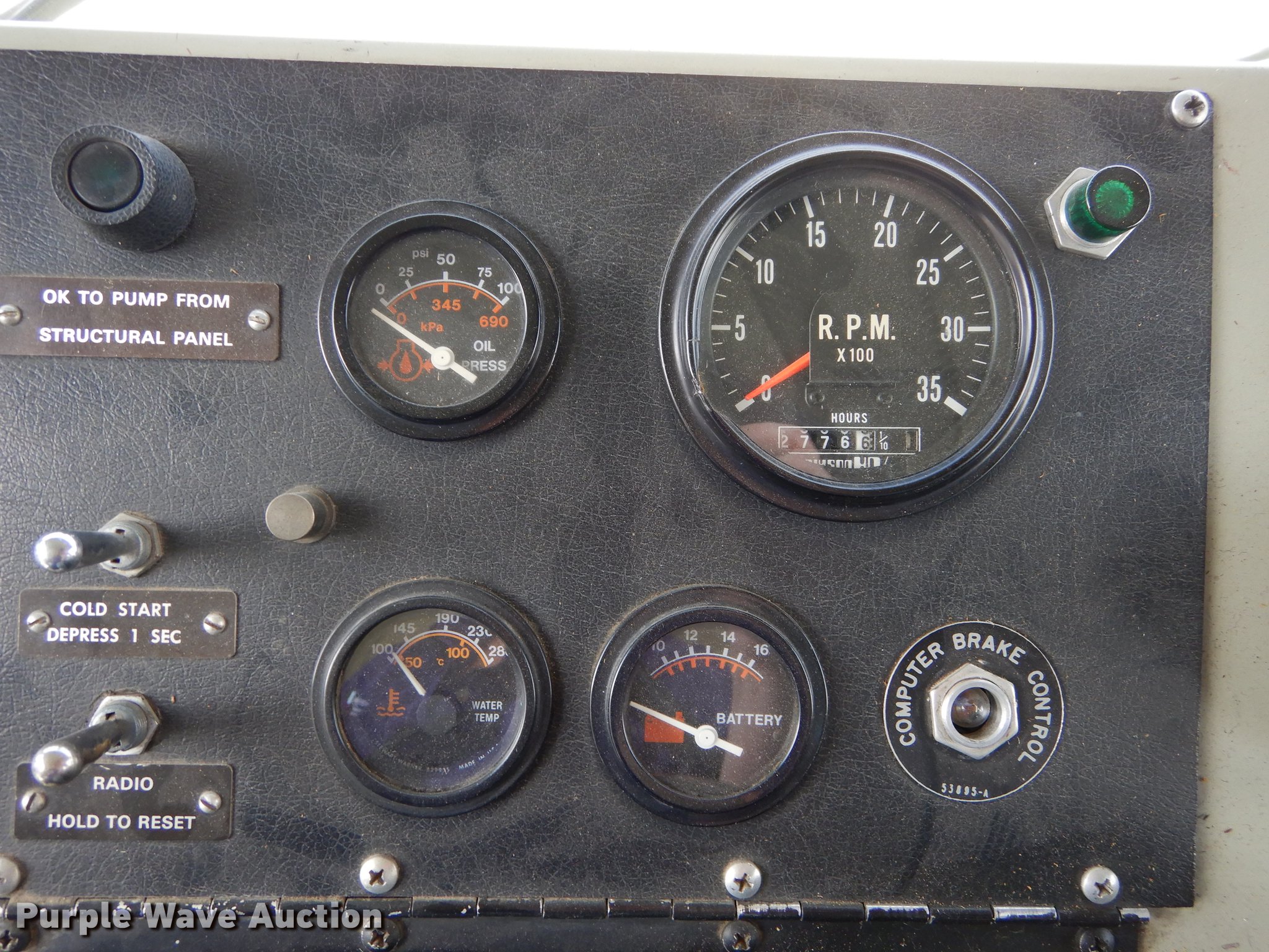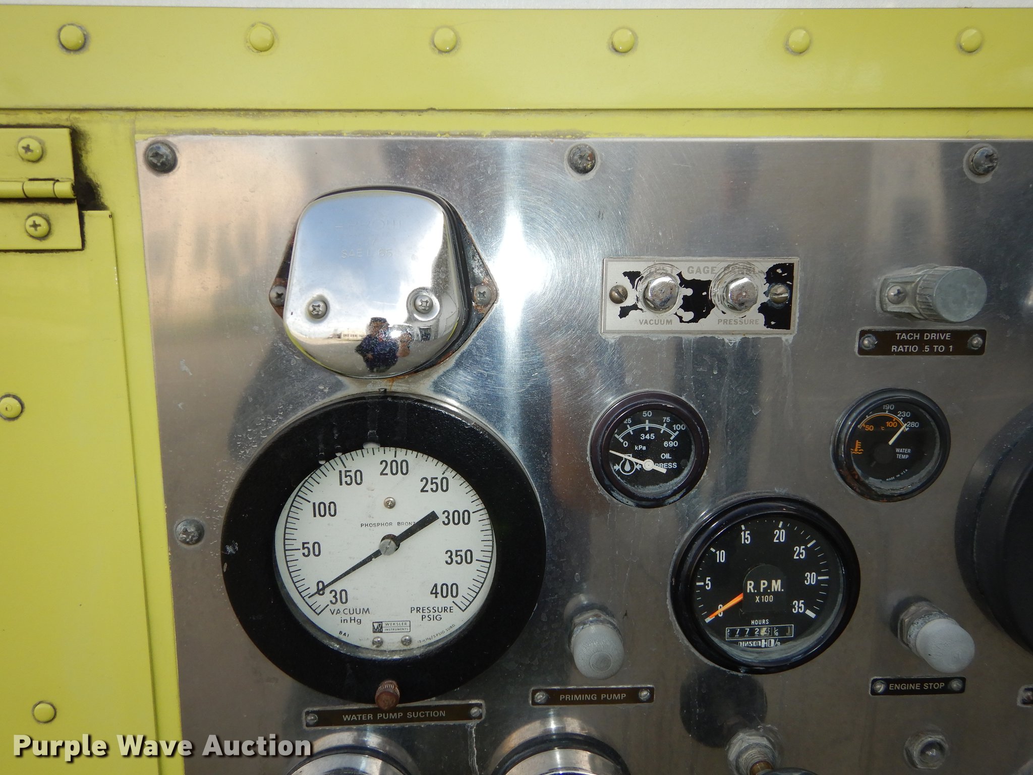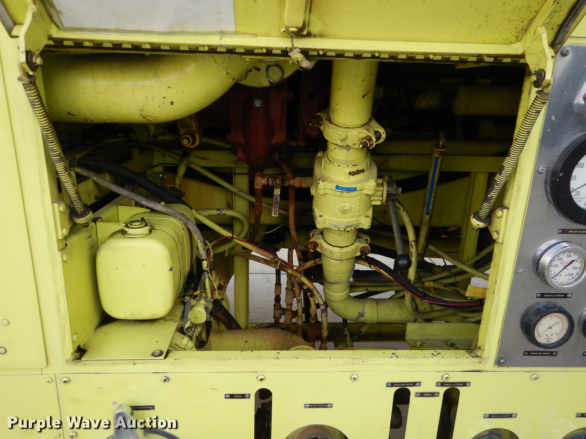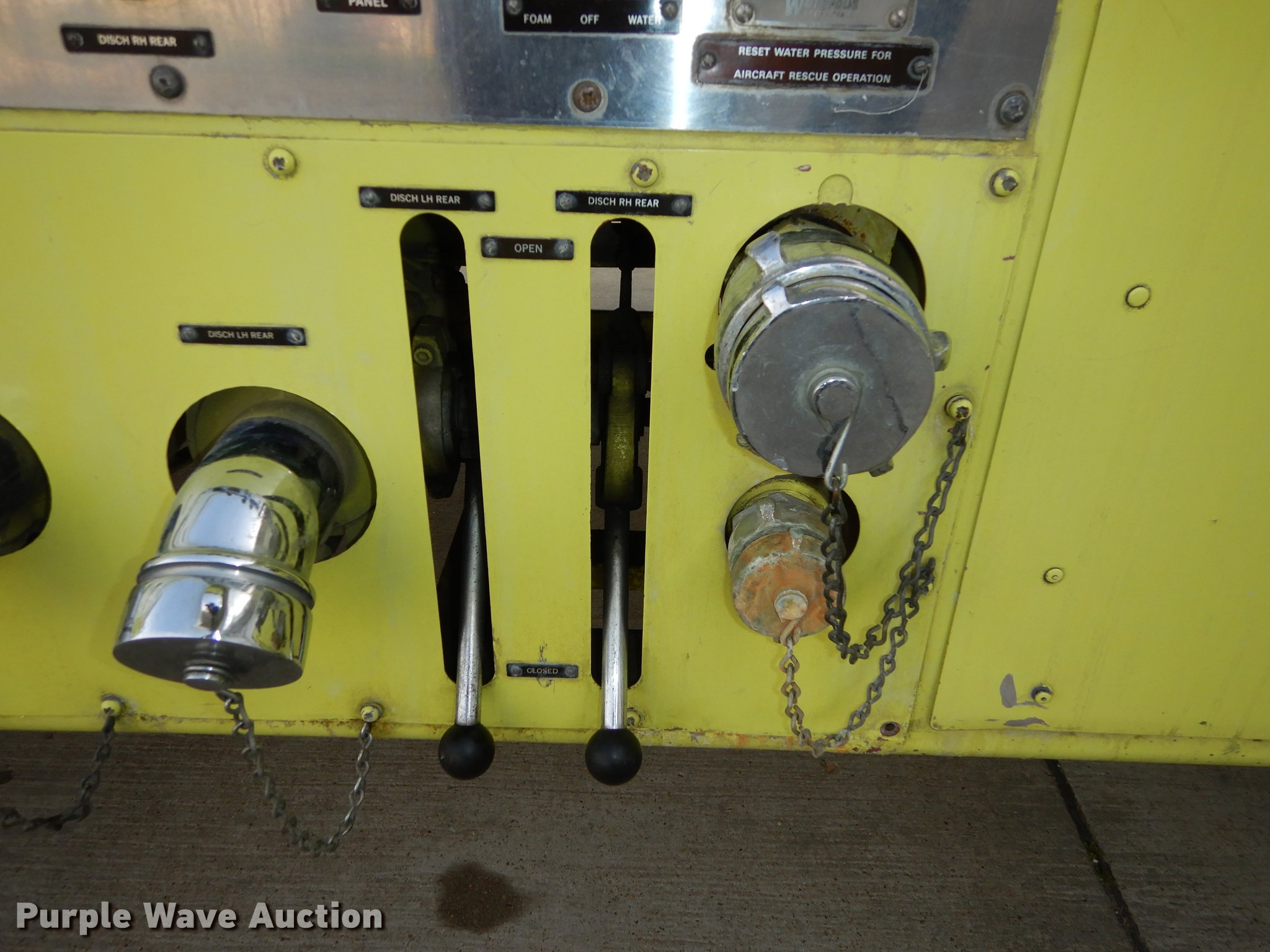 Purple Wave is selling a used Fire Truck or Emergency Vehicle in Kansas. This item is a 1980 Oshkosh ARFF fire truck with the following: 8,093 miles on odometer, 2,772 pump hours on meter, Detroit Diesel turbo diesel engine, Serial 8VF0471Q0, Allison automatic transmission, Single axle, Air horn, Emergency lights and sirens, Signal-Stat VII system, Front mounted pump, Roof turret, 800 high flow gpm, 400 low flow gpm, Bumper turret, 375 gpm low flow, Hydraulic and manual operation, (3) 17 gpm under truck nozzles, 150' hose, 30 gpm, Foam storage tank, 205 gallon capacity, Six percent full, Water storage tank, 1,585 gallon capacity, No dry chemical storage, Pintle hitch, Spring suspension, Air brakes, 194" wheelbase, Michelin 24-20.5 tires, Additional tire and wheel, Leaks, Top extension tube not included, Ladder not included, Decals will be removed or painted over
