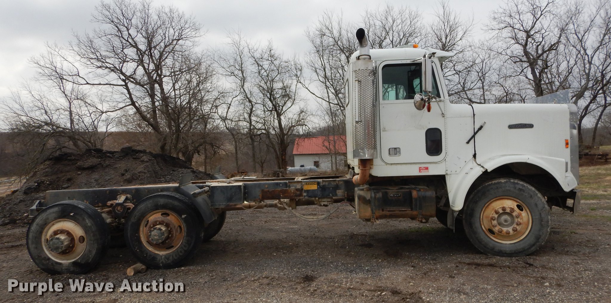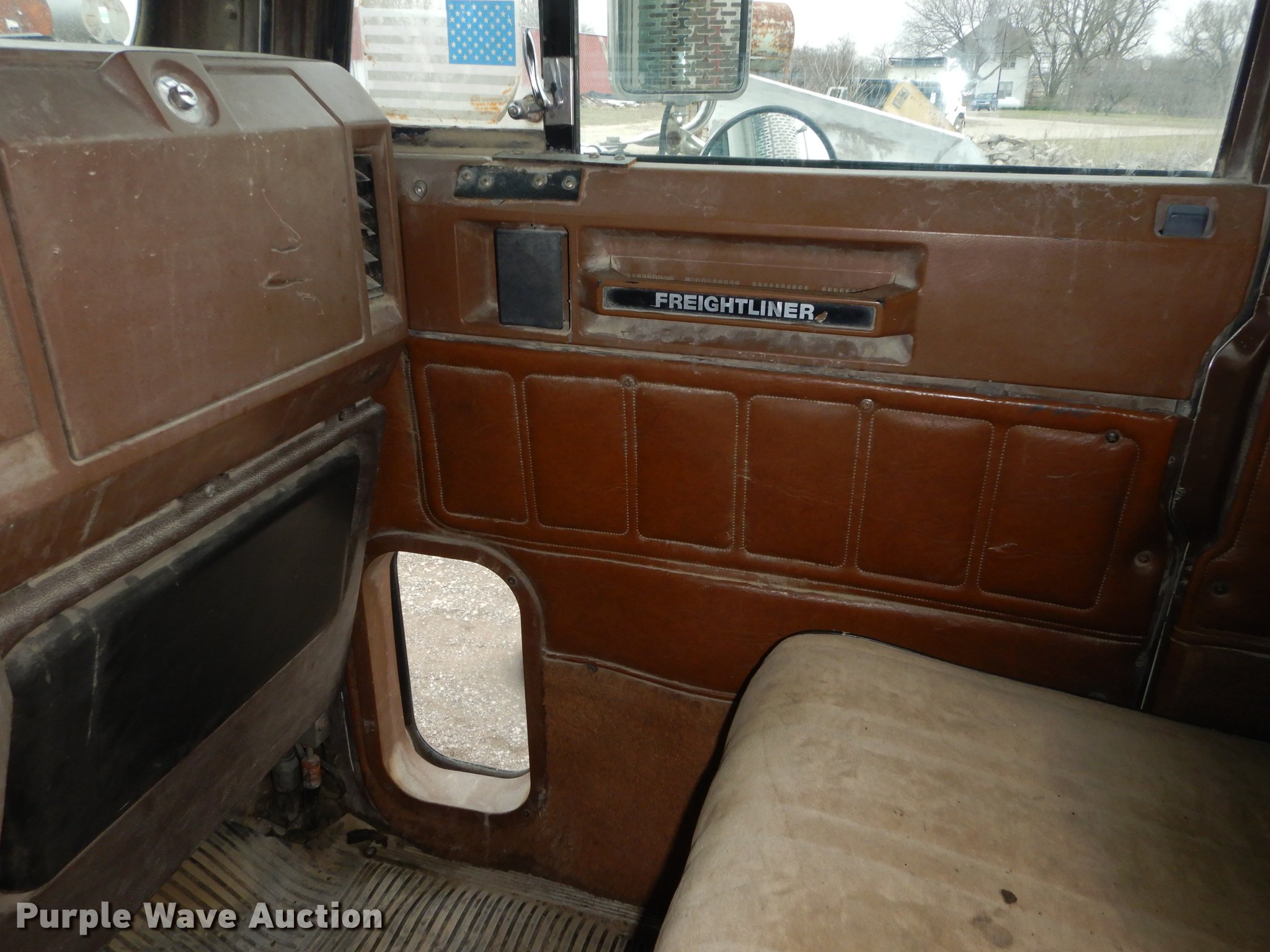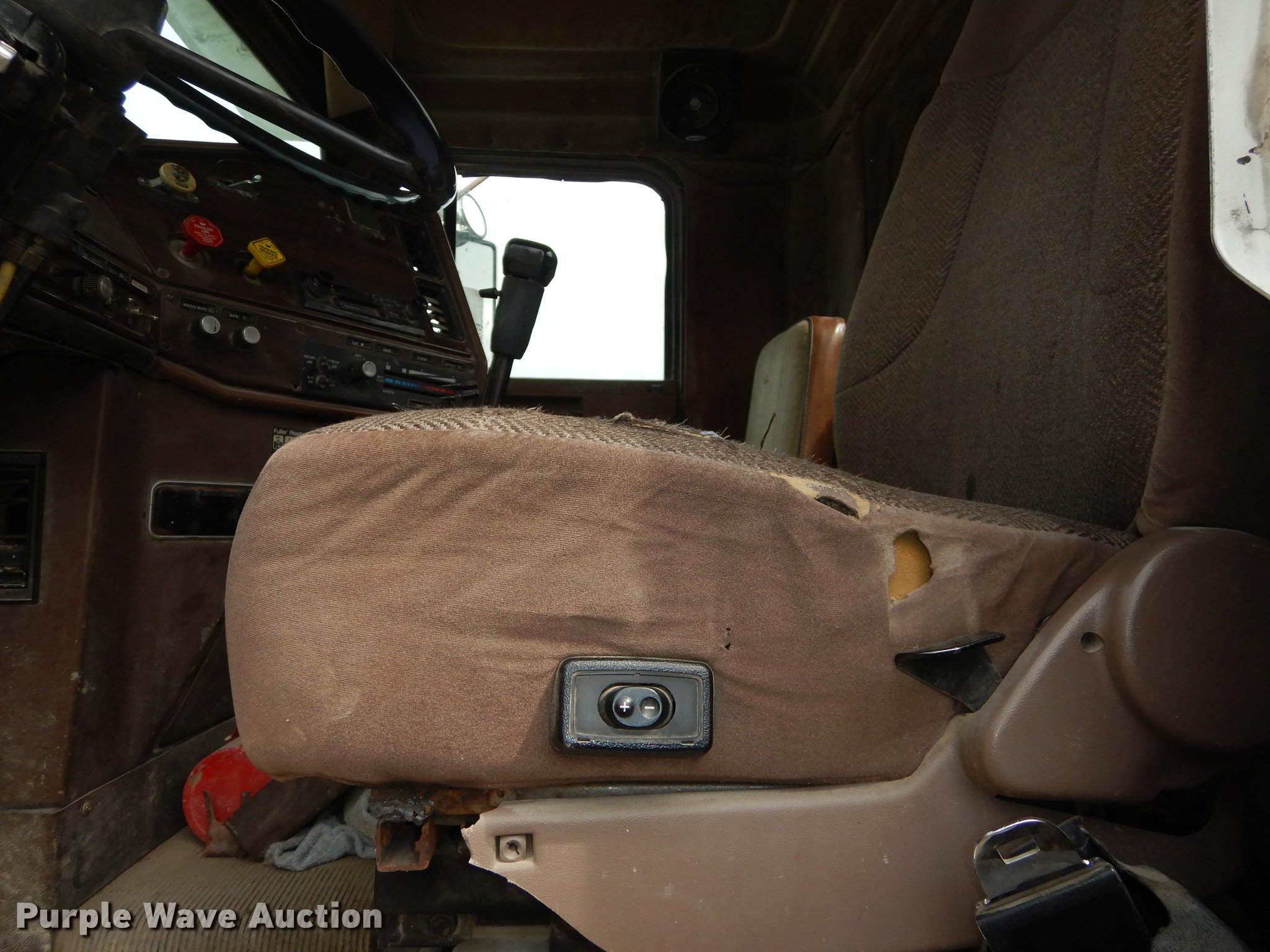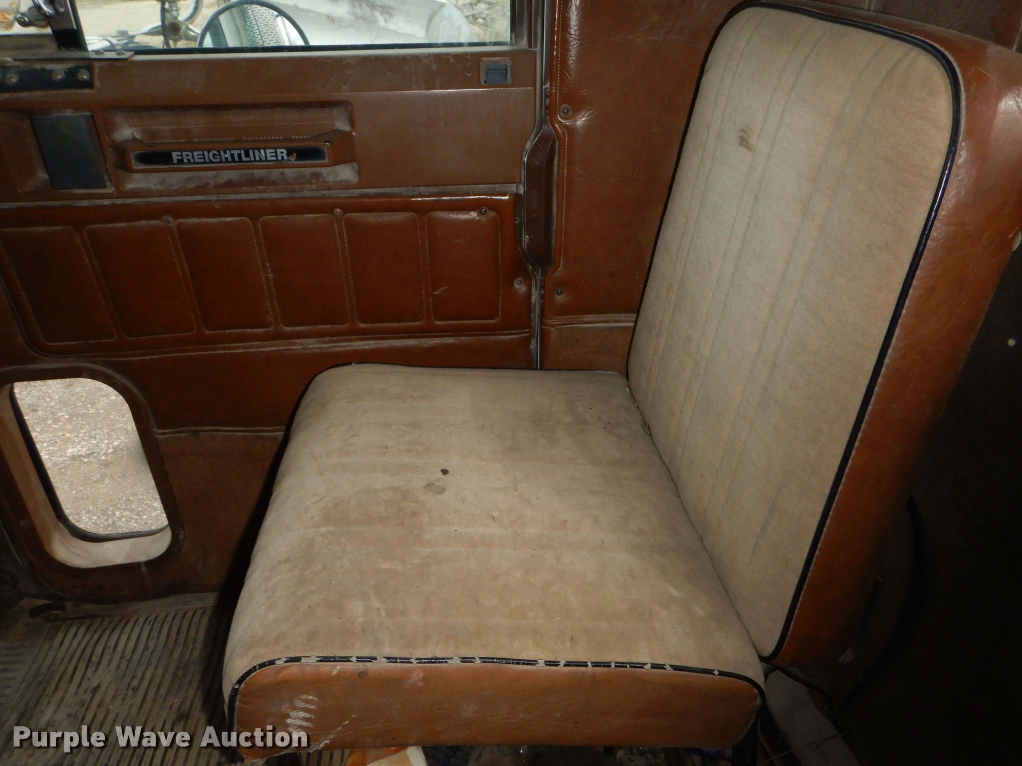 Purple Wave is selling a used Truck Tractor in Kansas. This item is a 1987 Freightliner FLC Classic semi truck with the following: 137,396 miles on odometer, Caterpillar 3406B 14.6L L6 turbo diesel engine, Eaton Fuller Road Ranger nine speed manual transmission, Tandem axle, AC and heat, AM/FM/cassette, Heated mirrors, Air suspension seat, Exterior visor, Single rear exhaust stack, Dual fuel tanks, Pintle hitch, Spring suspension, Air brakes, 210" wheelbase, Double Coin 11R22.5 front tires, Roadmaster 11R22.5 rear tires, GVWR 45,700 lbs, FAWR 11,200 lbs, RAWR 34,500 lbs, Non-operational AC, Outer tires have been removed, Radiator damaged, No taillights, Broken frame, Wrecked unit