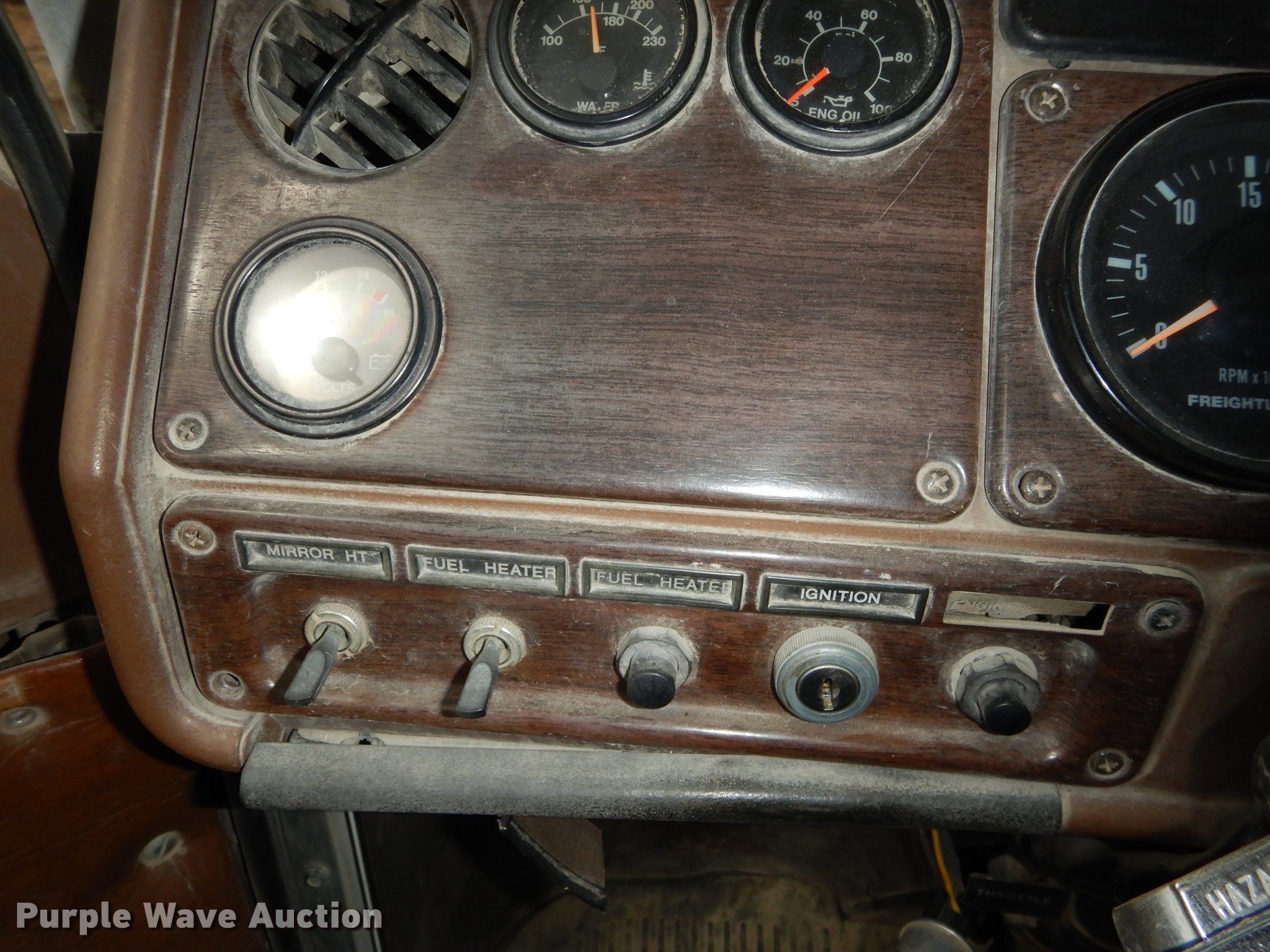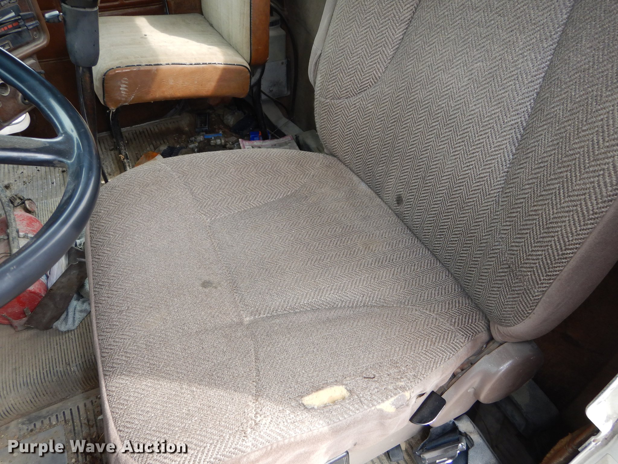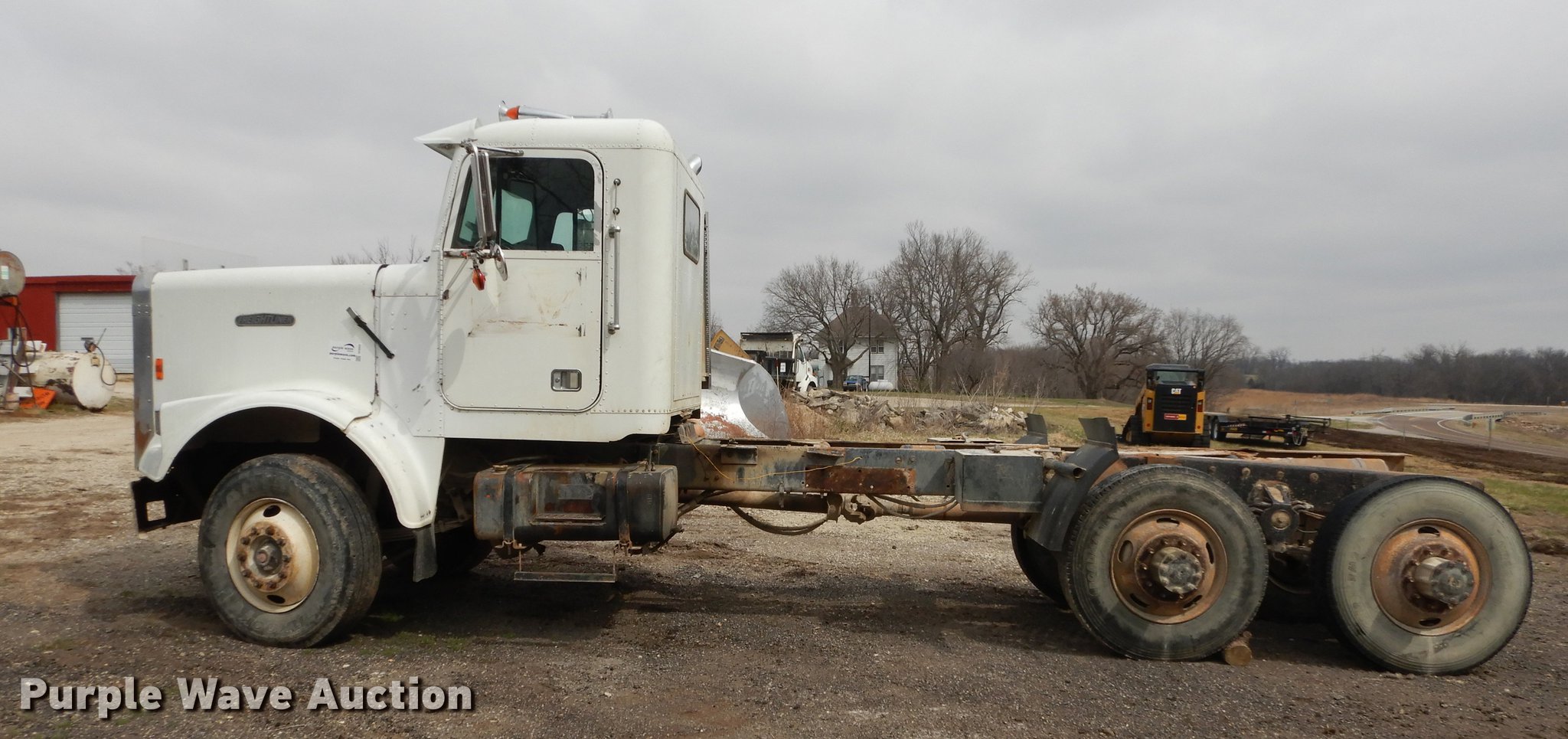 Purple Wave is selling a used Truck Tractor in Kansas. This item is a 1987 Freightliner FLC Classic semi truck with the following: 137,396 miles on odometer, Caterpillar 3406B 14.6L L6 turbo diesel engine, Eaton Fuller Road Ranger nine speed manual transmission, Tandem axle, AC and heat, AM/FM/cassette, Heated mirrors, Air suspension seat, Exterior visor, Single rear exhaust stack, Dual fuel tanks, Pintle hitch, Spring suspension, Air brakes, 210" wheelbase, Double Coin 11R22.5 front tires, Roadmaster 11R22.5 rear tires, GVWR 45,700 lbs, FAWR 11,200 lbs, RAWR 34,500 lbs, Non-operational AC, Outer tires have been removed, Radiator damaged, No taillights, Broken frame, Wrecked unit