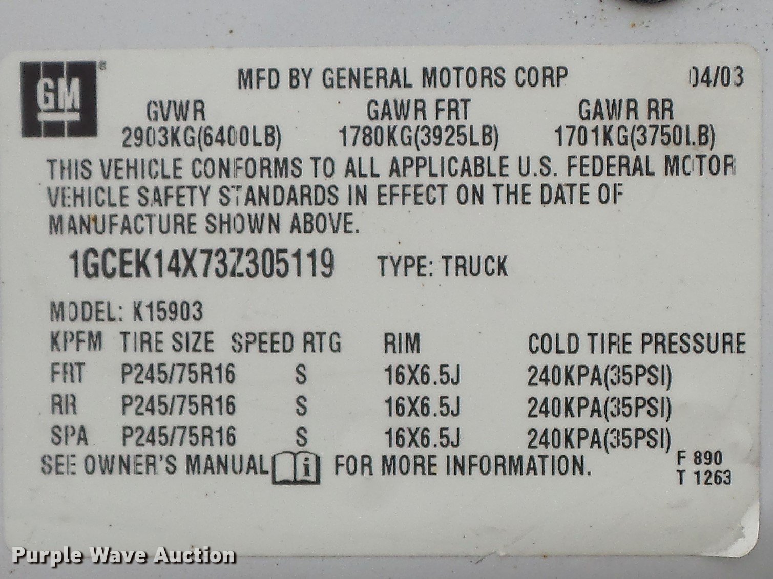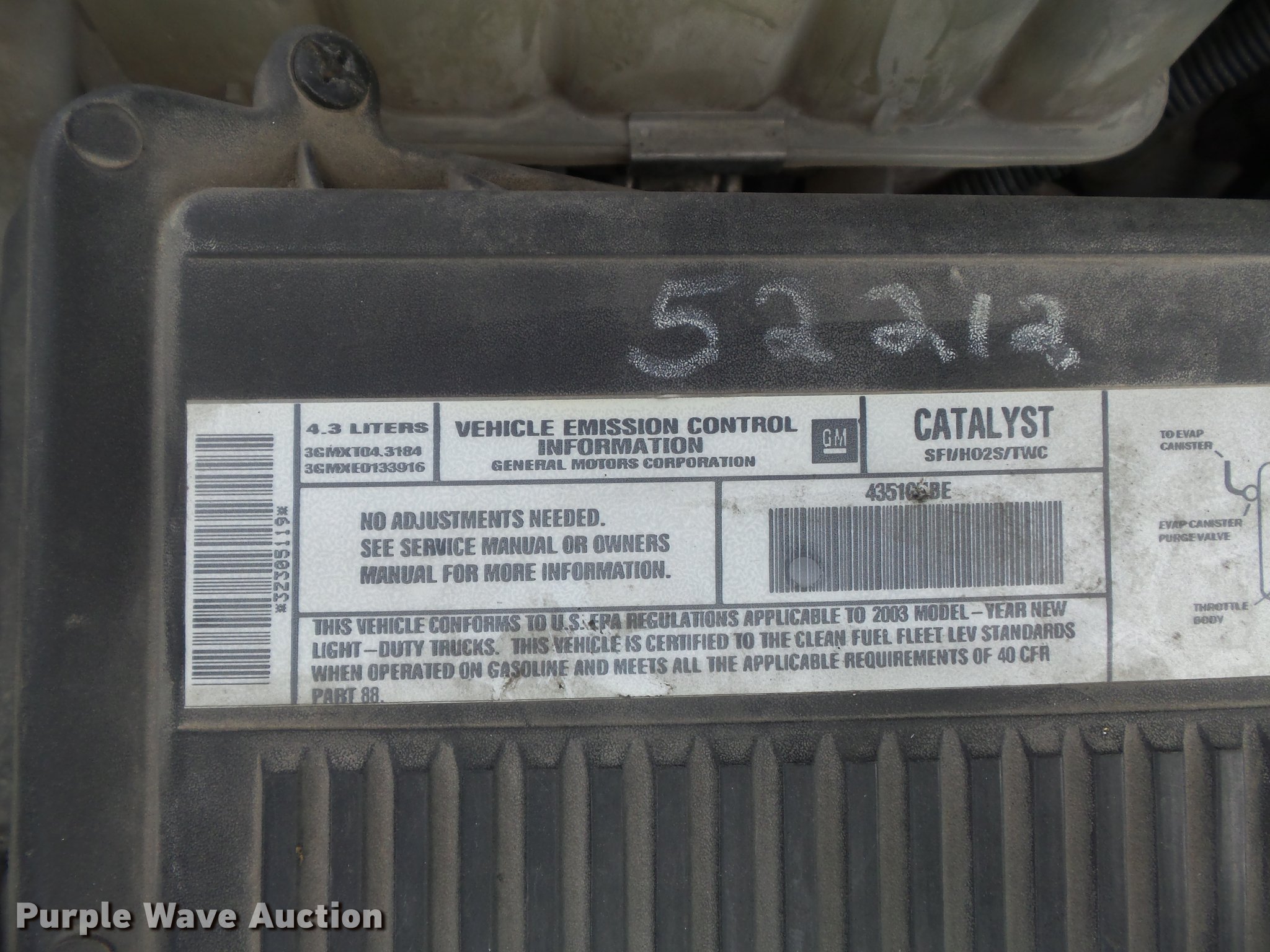 Purple Wave is selling a used 1/2 Ton Pickup or Van in Missouri. This item is a 2003 Chevrolet Silverado 1500 pickup truck with the following: 145,882 miles on odometer, 4.3L V6 OHV 12V gas engine, Automatic transmission, Four wheel drive, AC and heat, Tilt, AM/FM, Cloth interior, Front tow hooks, Long bed, Toolbox, LT245/75R16 tires, Check engine light on