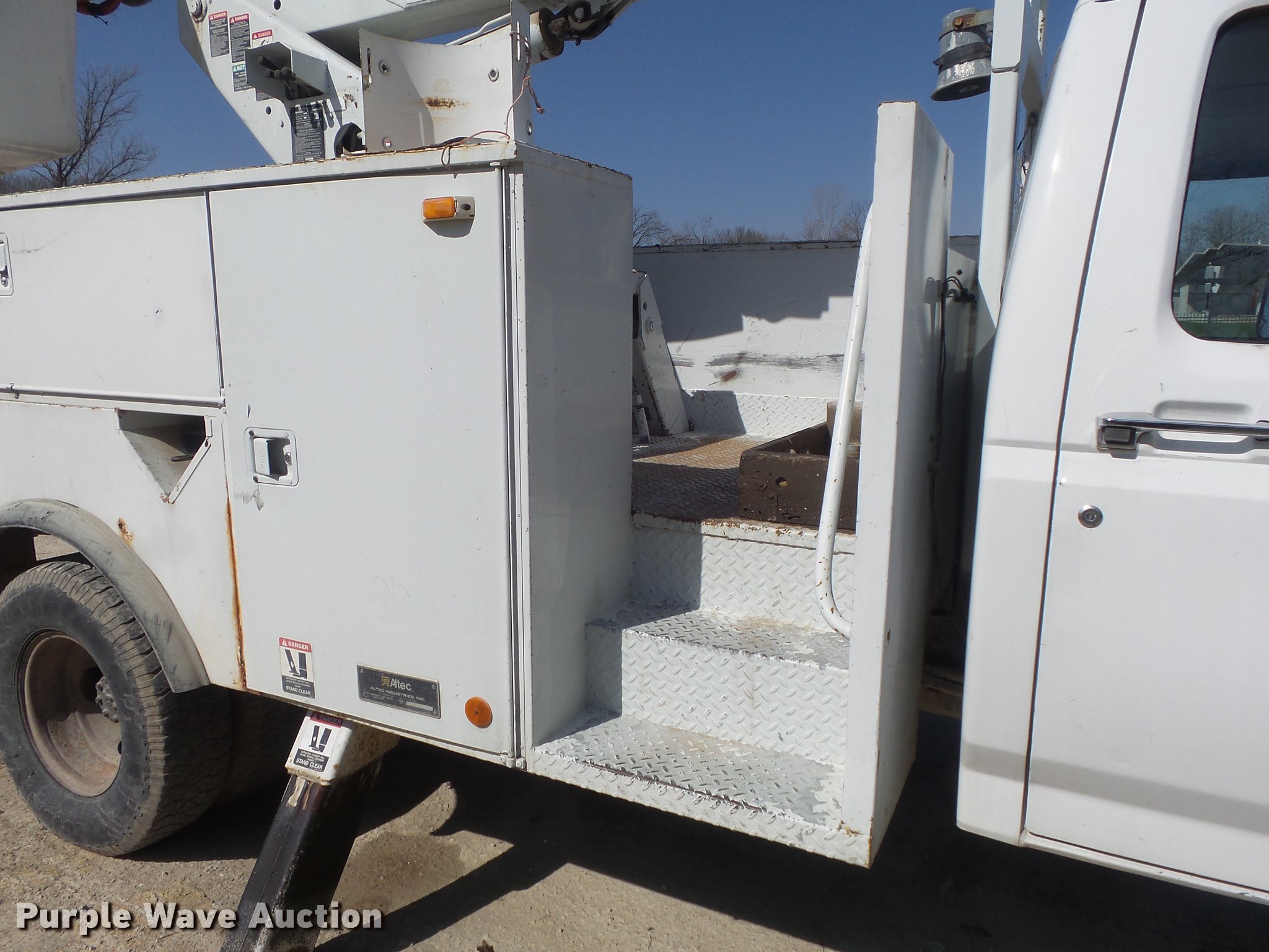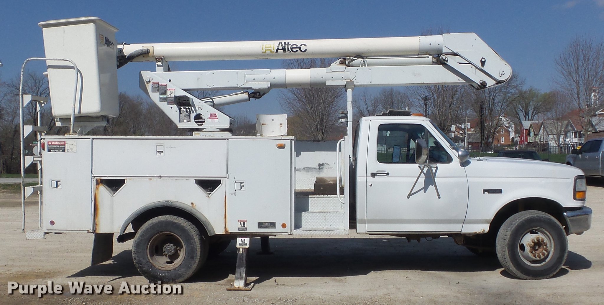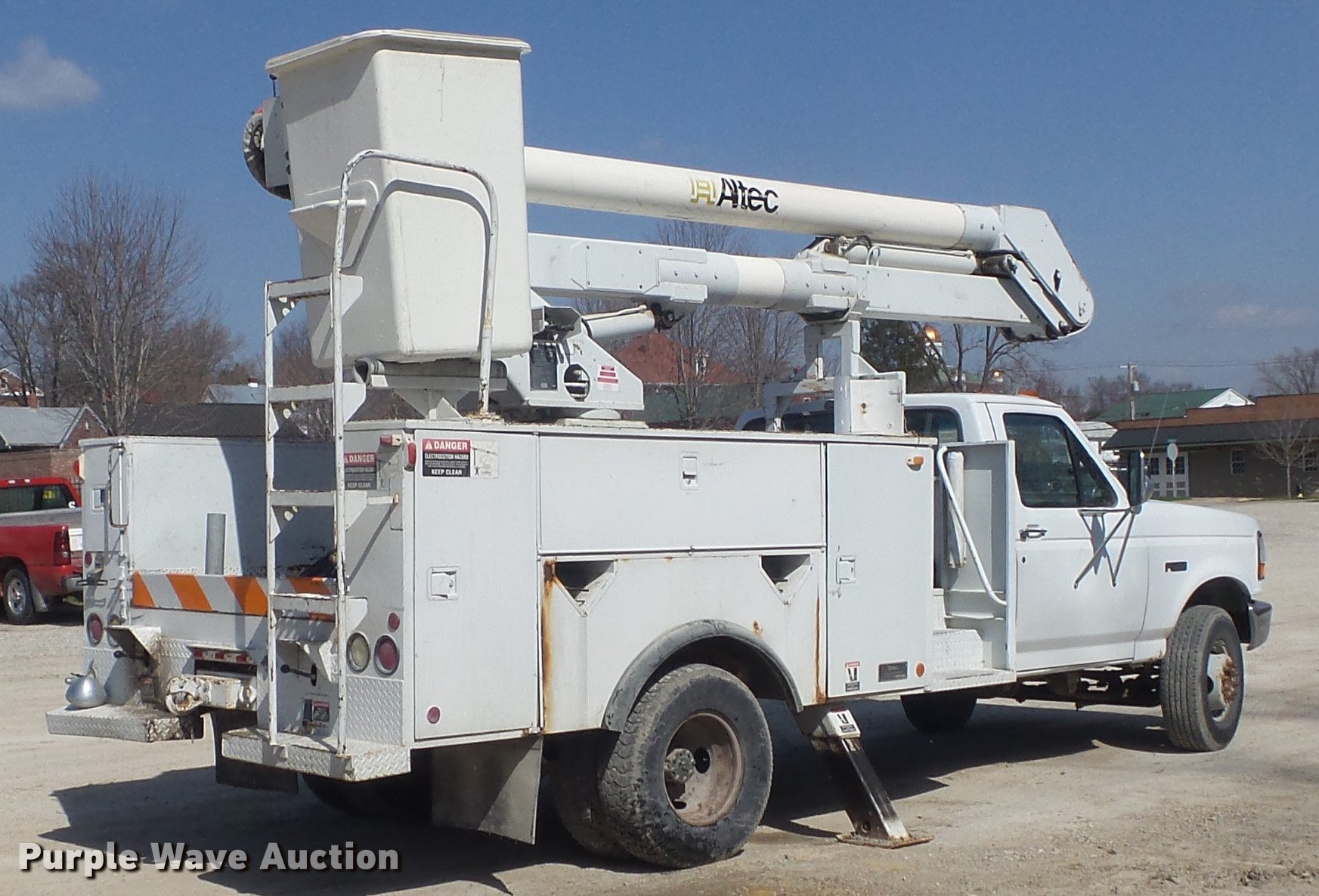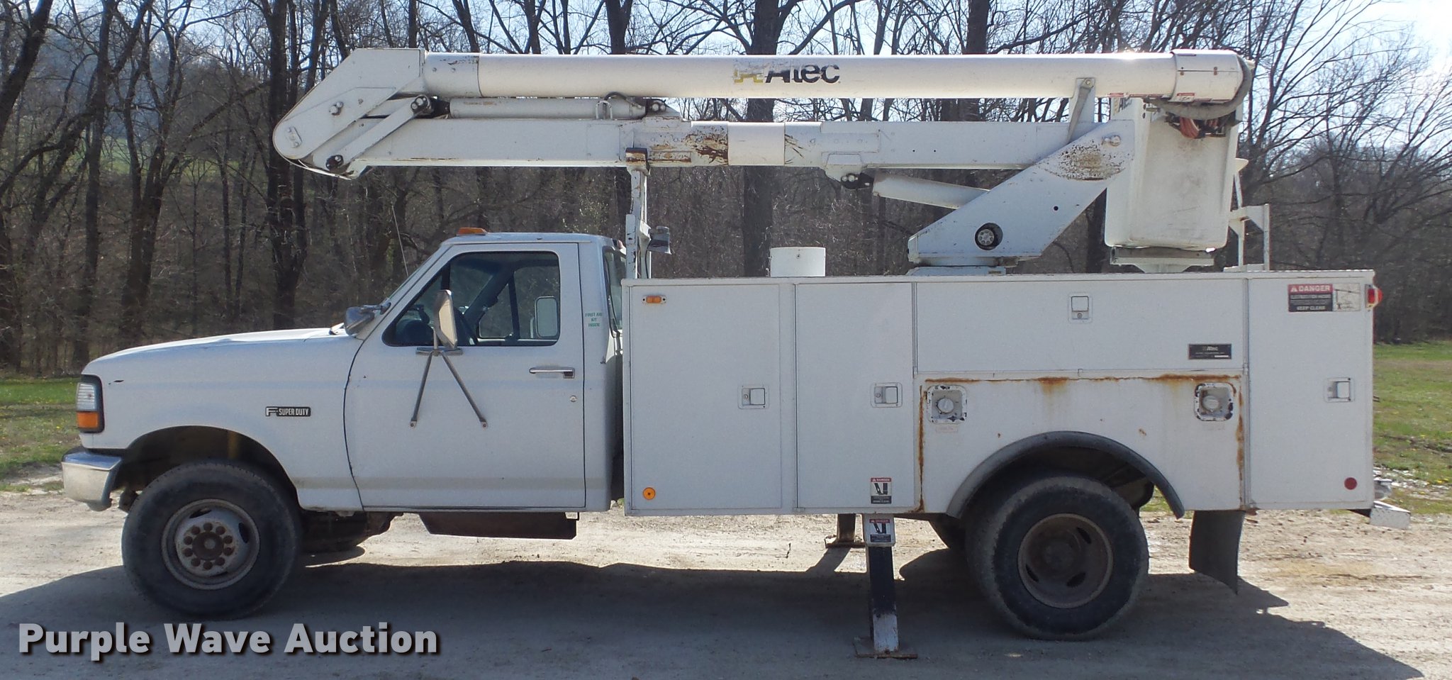 Purple Wave is selling a used Bucket Truck in Missouri. This item is a 1994 Ford F450 Super Duty XL bucket truck with the following: 44,358 miles on odometer, 2,966 hours on meter, 7.3L V8 diesel engine, Automatic transmission, Single axle, AC and heat, AM/FM, Backup alarm, Block heater, Front and rear strobe warning lights, Front tow hooks, PTO, Altec service bed, 12'L, Shelving, Compartment lights, Work lights, 1994 Altec A0300 boom, 300 lbs max lift capacity, Man basket, 36' max lift height, Ground and platform boom controls, Boom rotation, Articulating insulated boom, (2) outriggers, Serial 0294-P1214, Dual fuel tanks, Pintle hitch, Trailer wiring, Spring suspension, Hydraulic brakes, 161" wheelbase, LT235/85R16 tires, GVWR 15,000 lbs