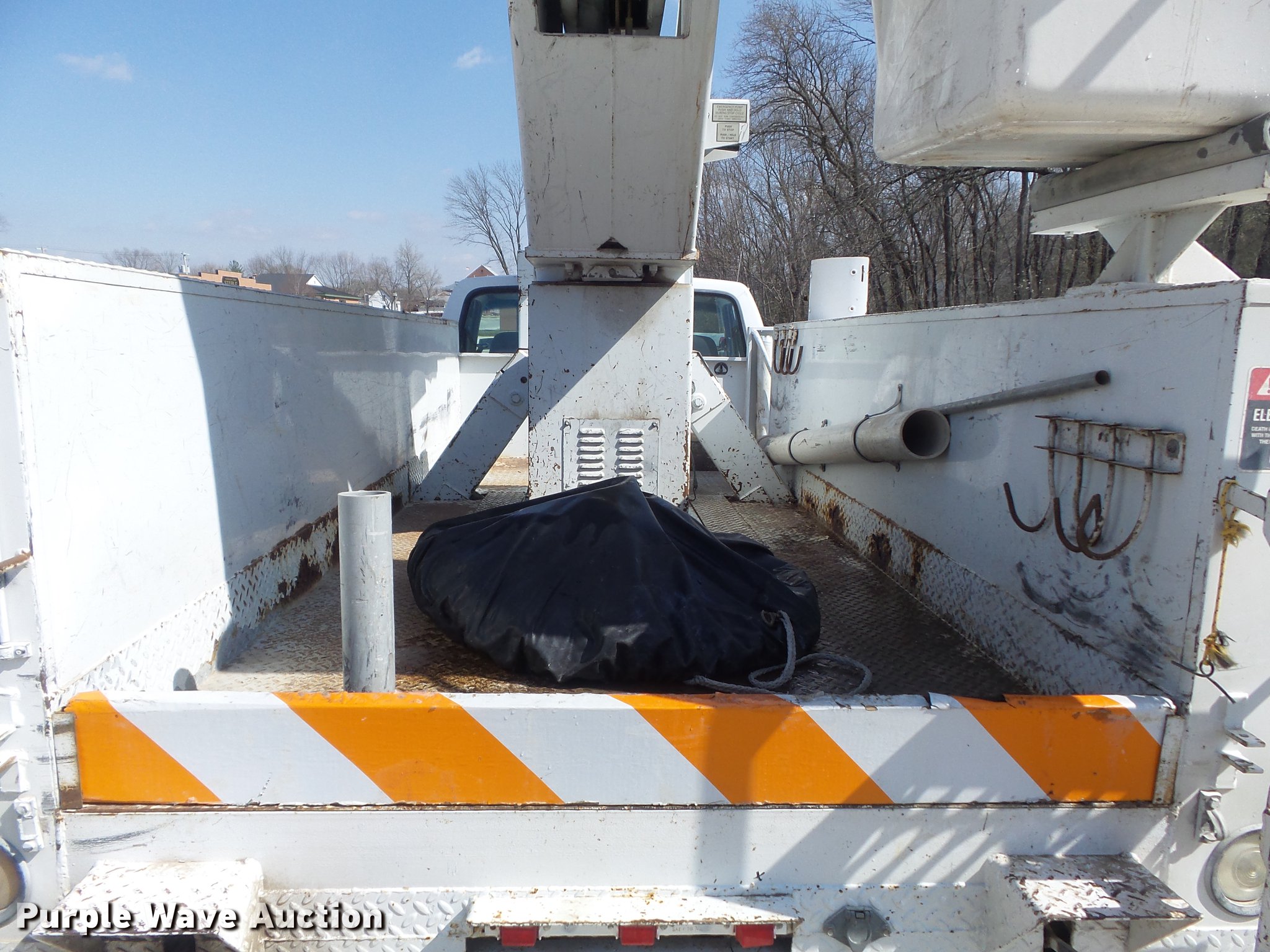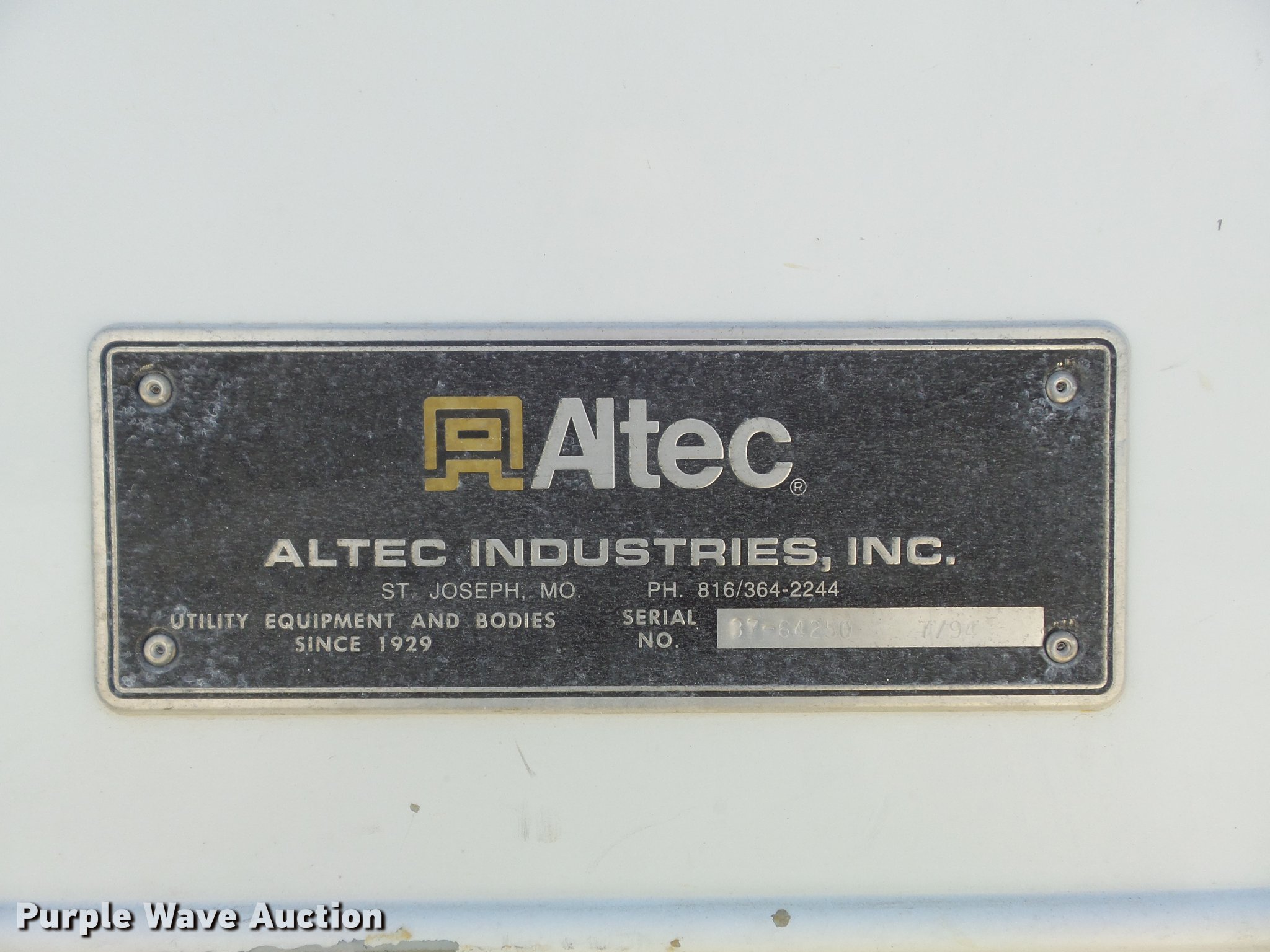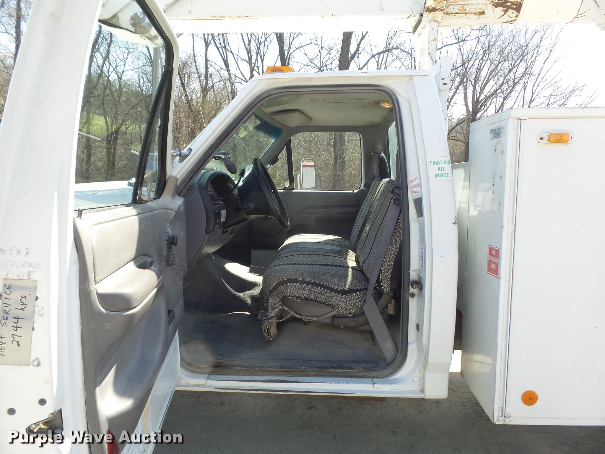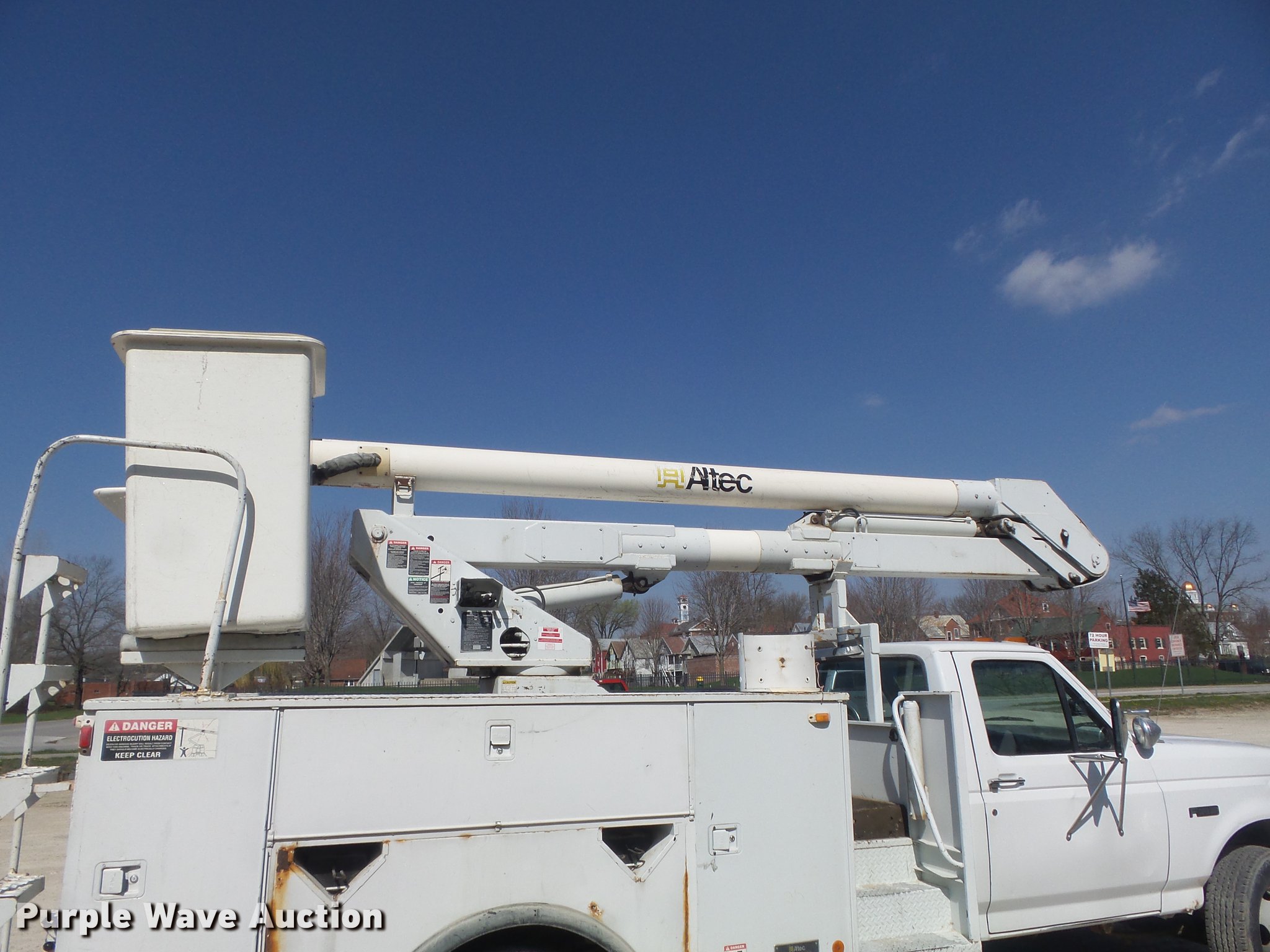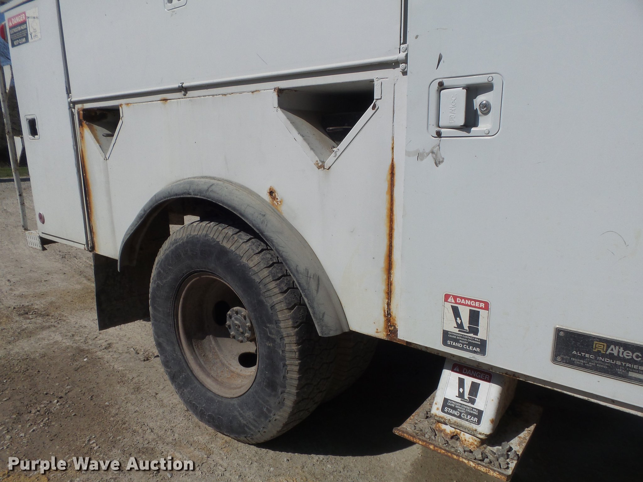 Purple Wave is selling a used Bucket Truck in Missouri. This item is a 1994 Ford F450 Super Duty XL bucket truck with the following: 44,358 miles on odometer, 2,966 hours on meter, 7.3L V8 diesel engine, Automatic transmission, Single axle, AC and heat, AM/FM, Backup alarm, Block heater, Front and rear strobe warning lights, Front tow hooks, PTO, Altec service bed, 12'L, Shelving, Compartment lights, Work lights, 1994 Altec A0300 boom, 300 lbs max lift capacity, Man basket, 36' max lift height, Ground and platform boom controls, Boom rotation, Articulating insulated boom, (2) outriggers, Serial 0294-P1214, Dual fuel tanks, Pintle hitch, Trailer wiring, Spring suspension, Hydraulic brakes, 161" wheelbase, LT235/85R16 tires, GVWR 15,000 lbs