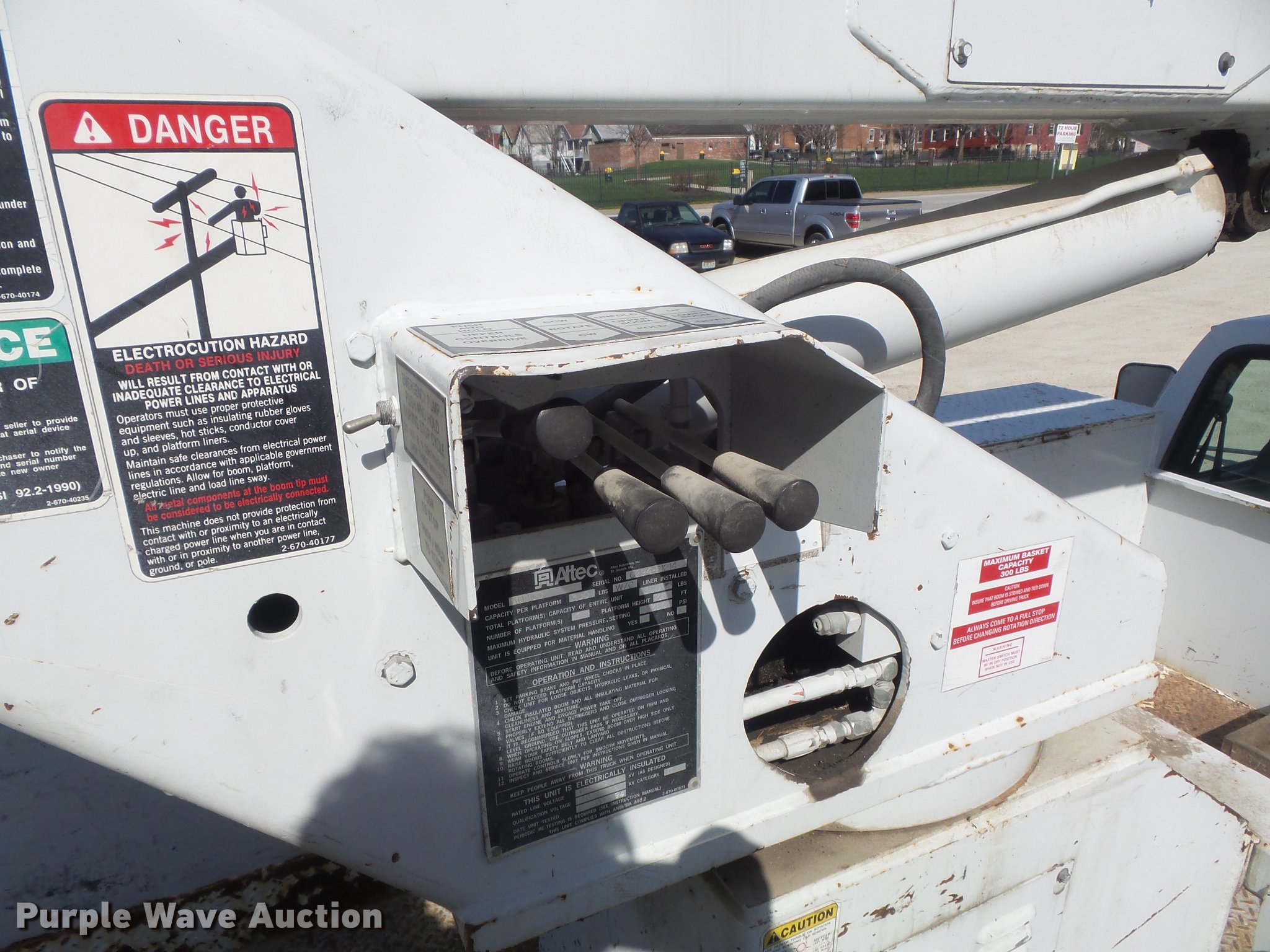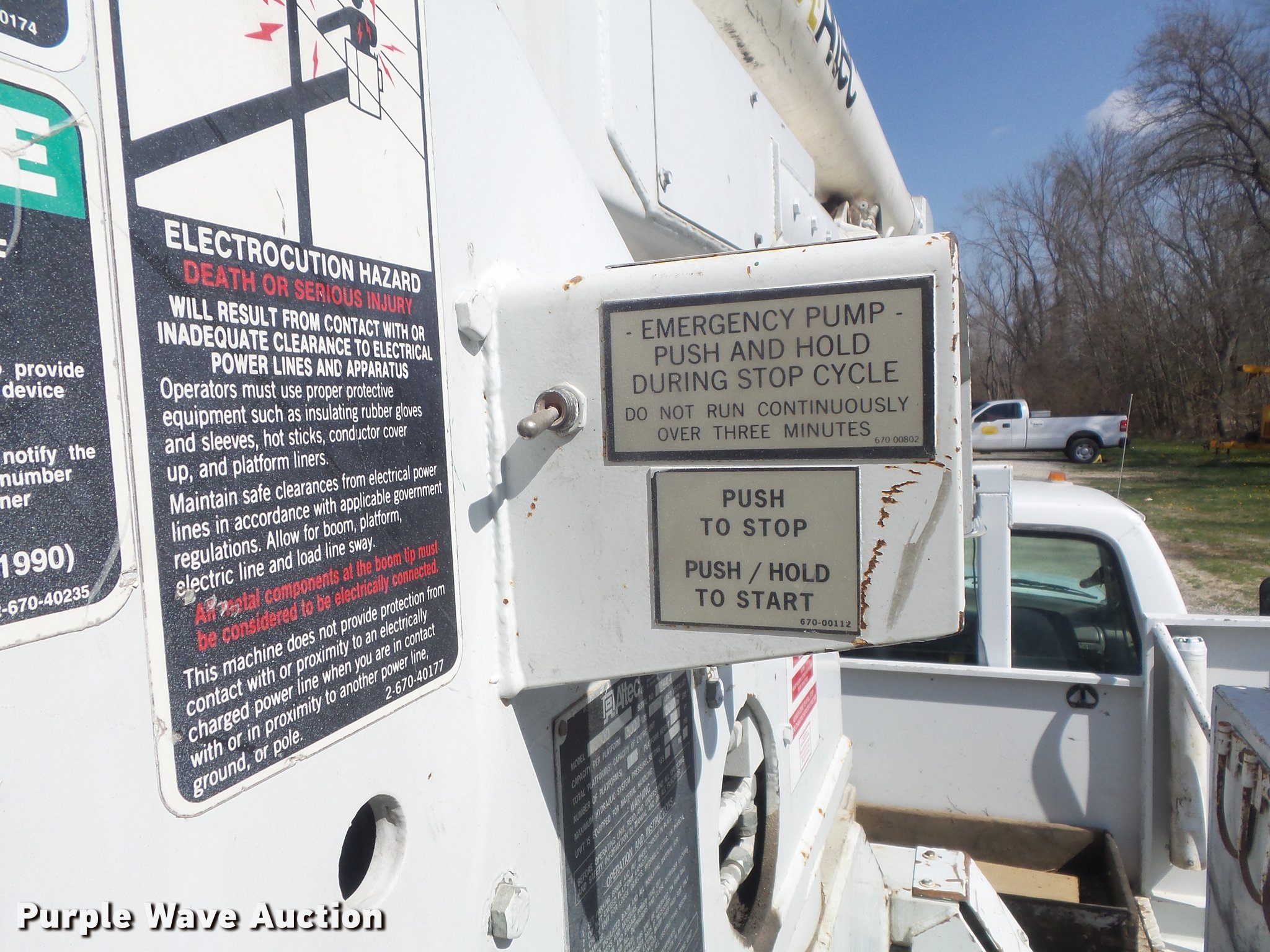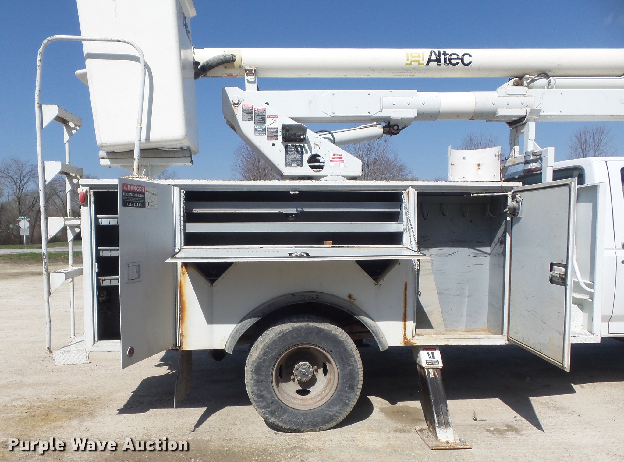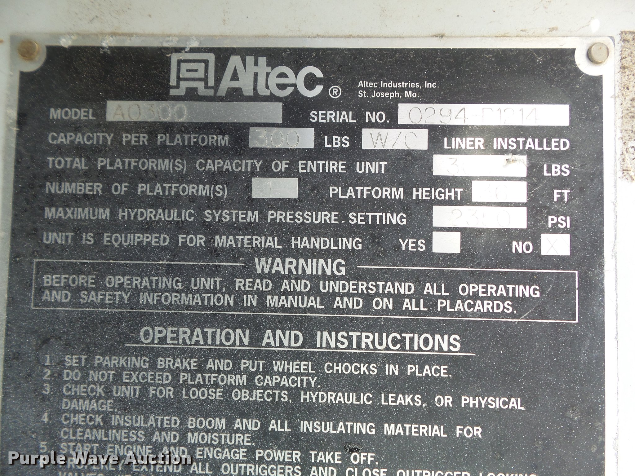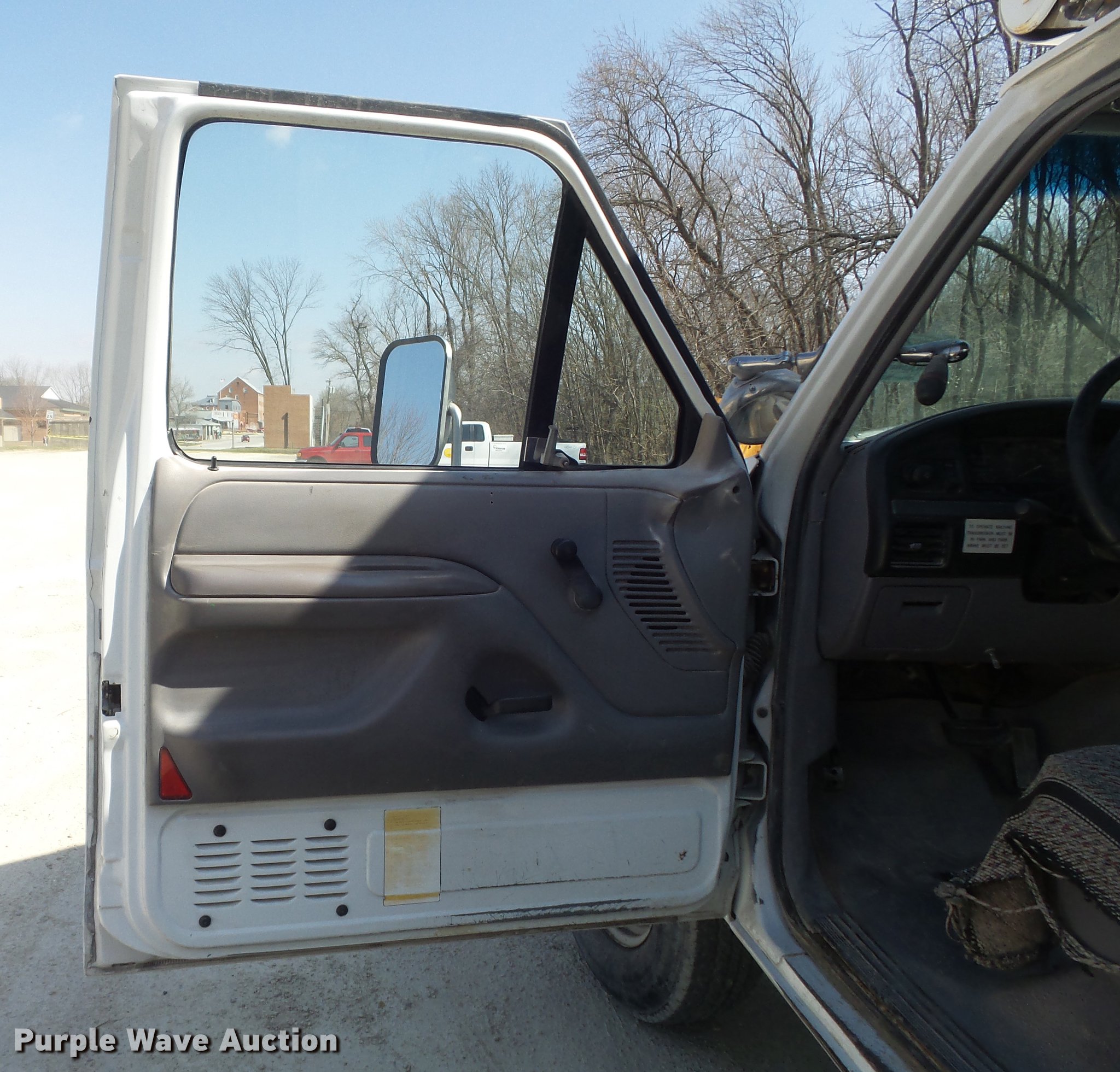 Purple Wave is selling a used Bucket Truck in Missouri. This item is a 1994 Ford F450 Super Duty XL bucket truck with the following: 44,358 miles on odometer, 2,966 hours on meter, 7.3L V8 diesel engine, Automatic transmission, Single axle, AC and heat, AM/FM, Backup alarm, Block heater, Front and rear strobe warning lights, Front tow hooks, PTO, Altec service bed, 12'L, Shelving, Compartment lights, Work lights, 1994 Altec A0300 boom, 300 lbs max lift capacity, Man basket, 36' max lift height, Ground and platform boom controls, Boom rotation, Articulating insulated boom, (2) outriggers, Serial 0294-P1214, Dual fuel tanks, Pintle hitch, Trailer wiring, Spring suspension, Hydraulic brakes, 161" wheelbase, LT235/85R16 tires, GVWR 15,000 lbs