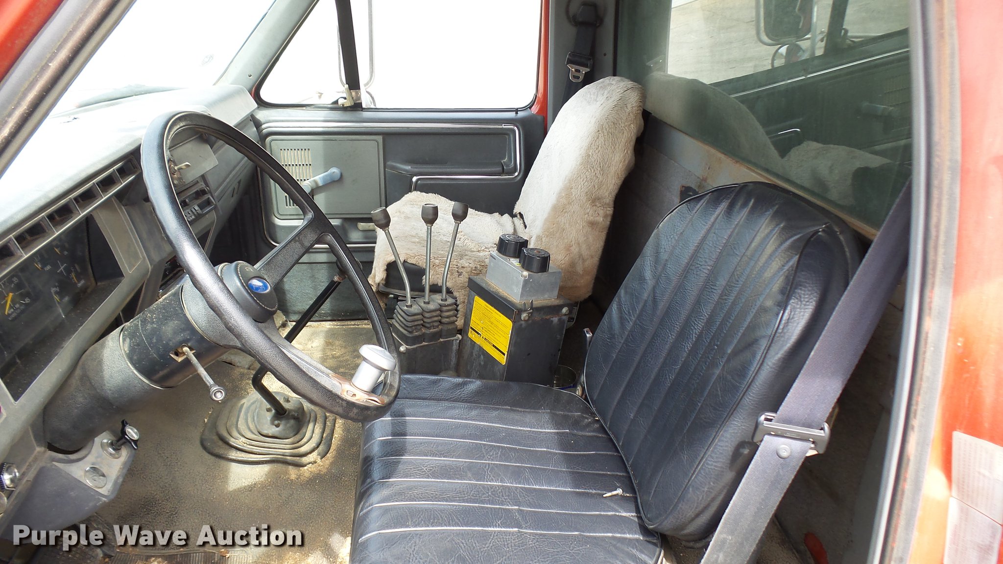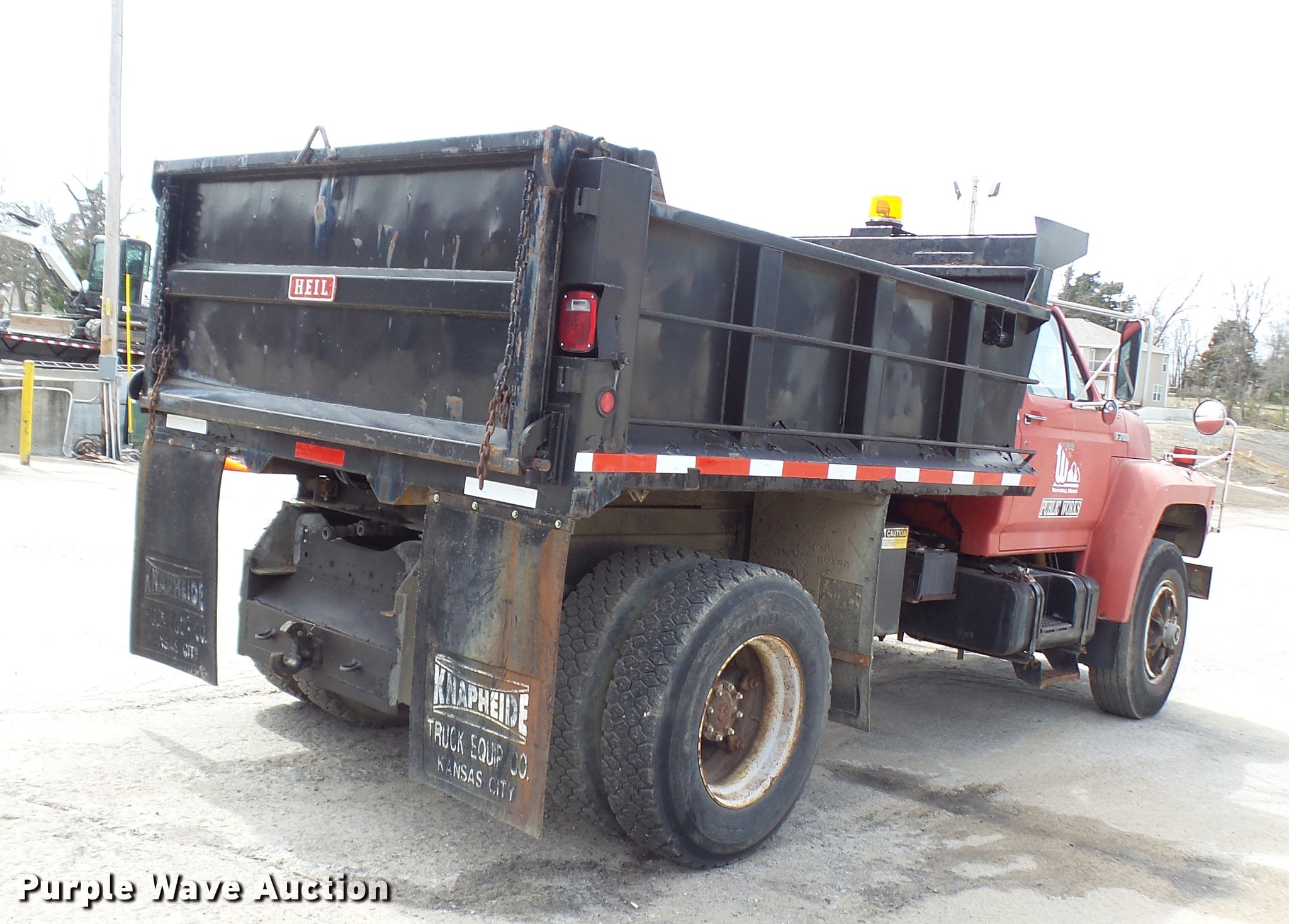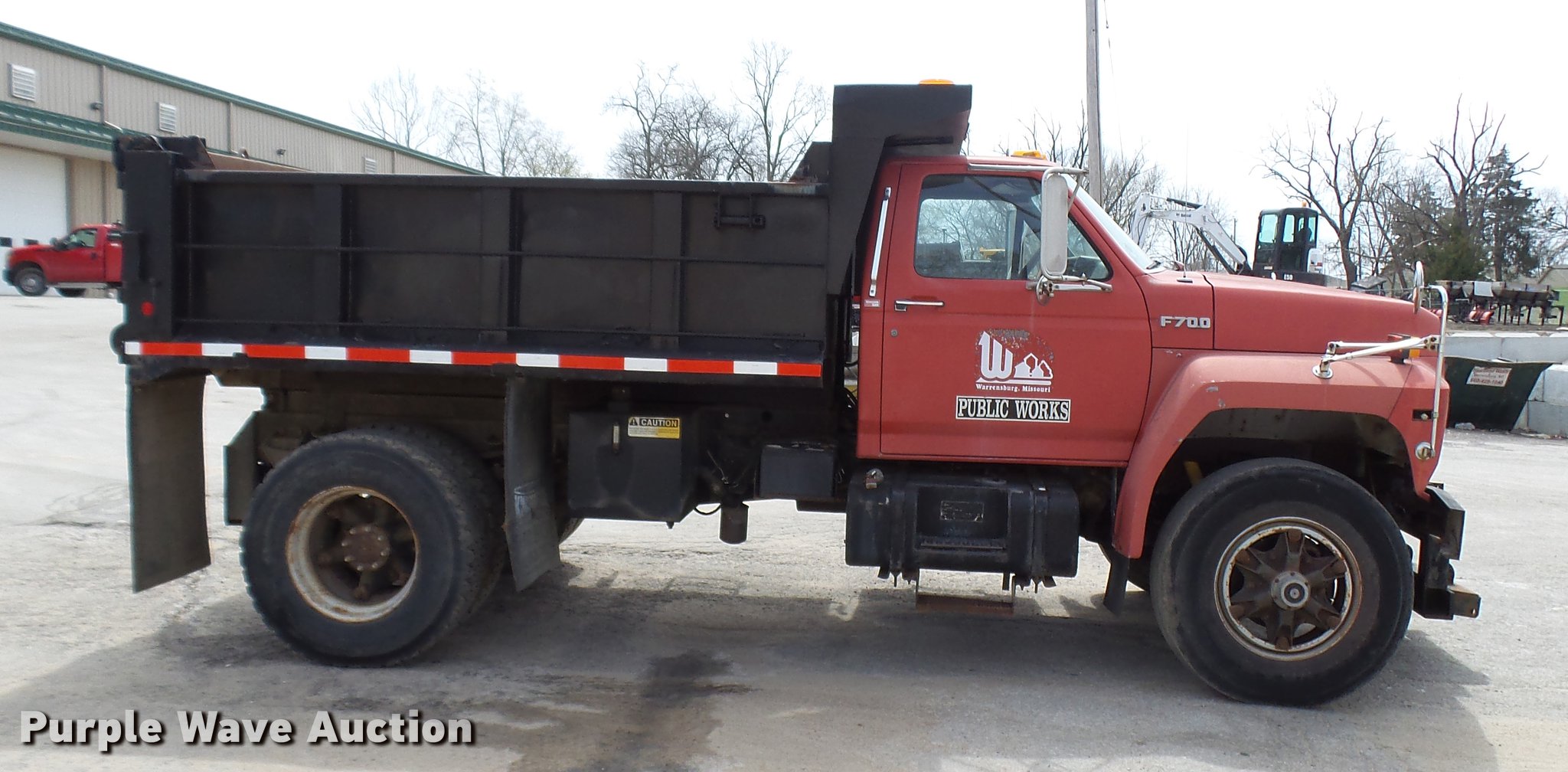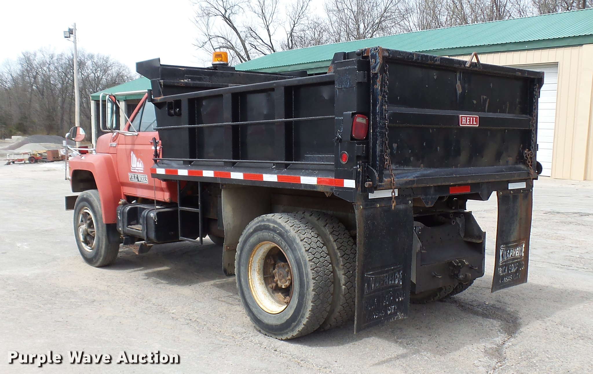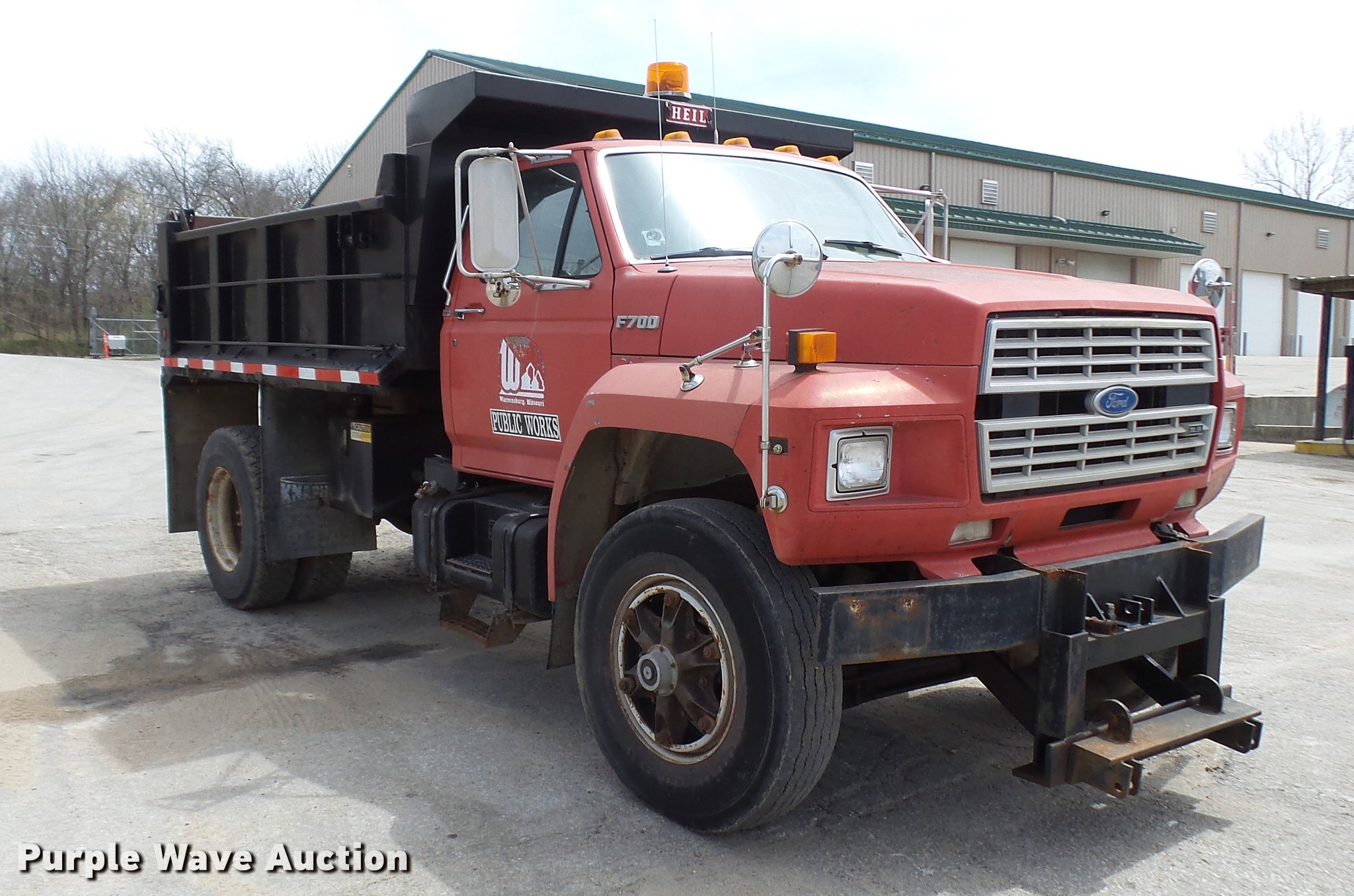 Purple Wave is selling a used Construction Dump Truck in Missouri. This item is a 1992 Ford F700 dump truck with the following: 60,413 miles on odometer, 1,146 hours on meter, 7.0L V8 gas engine, Six speed manual transmission, Single axle, Heat, AM/FM/cassette, Spring suspension seat, Toolboxes, PTO, Heil dump bed, 10'L, Manual end gate, Dual fuel tanks, Pintle hitch, Trailer wiring, Air brakes, 154" wheelbase, 11R22.5 tires, GVWR 33,000 lbs, FAWR 12,000 lbs, RAWR 21,000 lbs, Clutch needs to be replaced