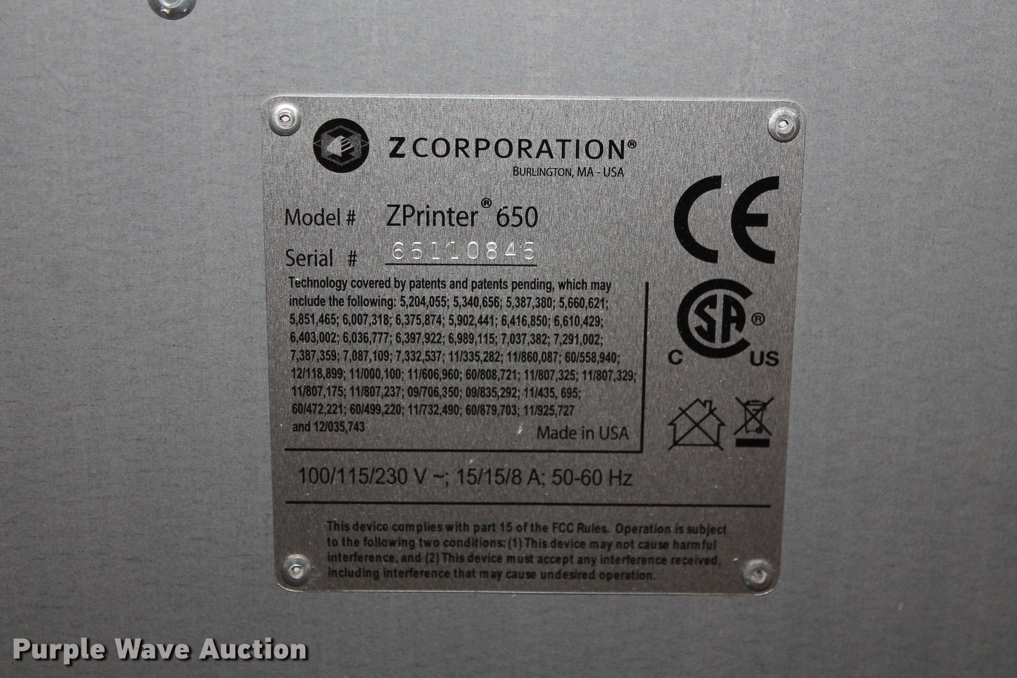 Purple Wave is selling a used Electronics in Oklahoma. This item is a Z-Corporation Zprinter 650 3D printer with the following: 79"W x 30"D x 57"H, Full color capability, 0.025" color shell thickness, Integrated powder removal and vacuum units, TCP/IP 100/10 Base T network connectivity, 10" x 15" x 8" build volume, 1,200 cu. in. build capacity, Two to four layers per min. build speed, 0.0035" to 0.004" layer thickness, 600 x 540 dpi print resolution, 57 dB print, 66 dB emptying overflow, 72 dB vacuuming cover open, 72 dB fine powder removal, Meets CE certification standards and UL standards, 100/115/230V, Approx. 50 to 60 Hz, 8 and 15 amp, Zp131 powder performance composite, Zb61 binder, (5) HP11 print heads, 1,520 jets total, Liquid waste system pull-out tray, 50 to 80 degree Fahrenheit maximum temperature range, 15 to 60 percent non-condensing max ambient relative humidity, 750 lbs weight, Serial 65110845