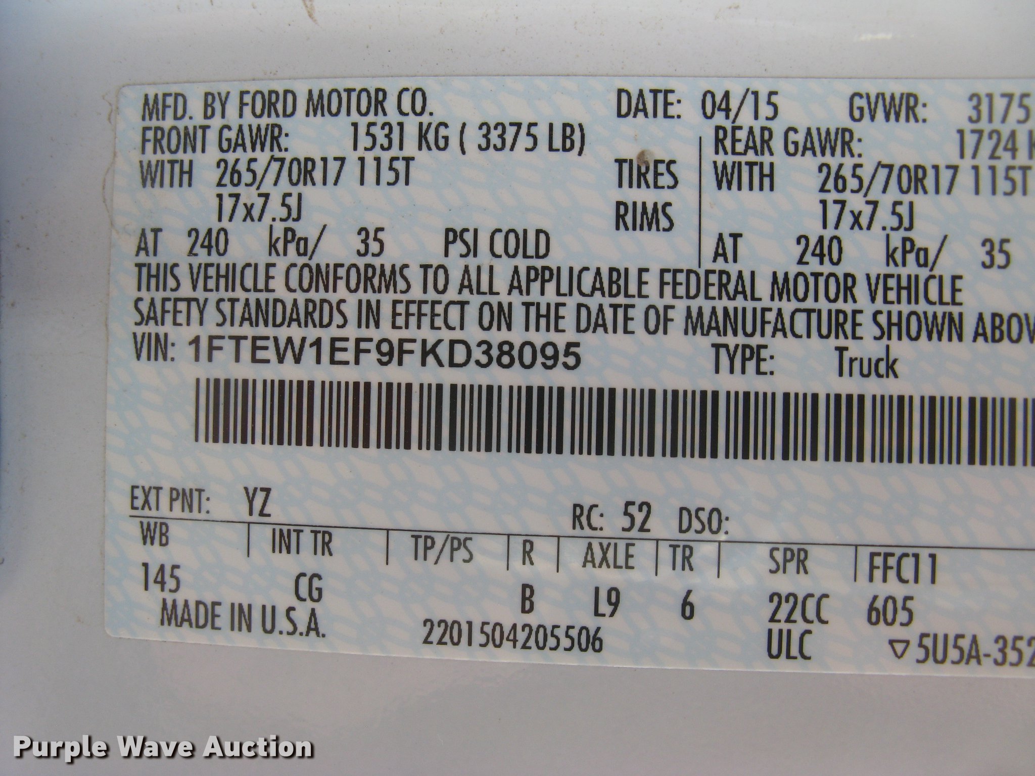 Purple Wave is selling a used 1/2 Ton Pickup or Van in Kansas. This item is a 2015 Ford F150 XL SuperCrew pickup truck with the following: 181,595 miles on odometer, 5.0L V8 gas engine, Automatic transmission, Four wheel drive, AC and heat, Tilt, Cruise, AM/FM/CD, Power windows, locks, and mirrors, Cloth interior, Backup camera, Fog lights, Front tow hooks, Running boards, Toolbox, Receiver hitch, Trailer wiring, LT265/70R17 tires, Unit# 02.525