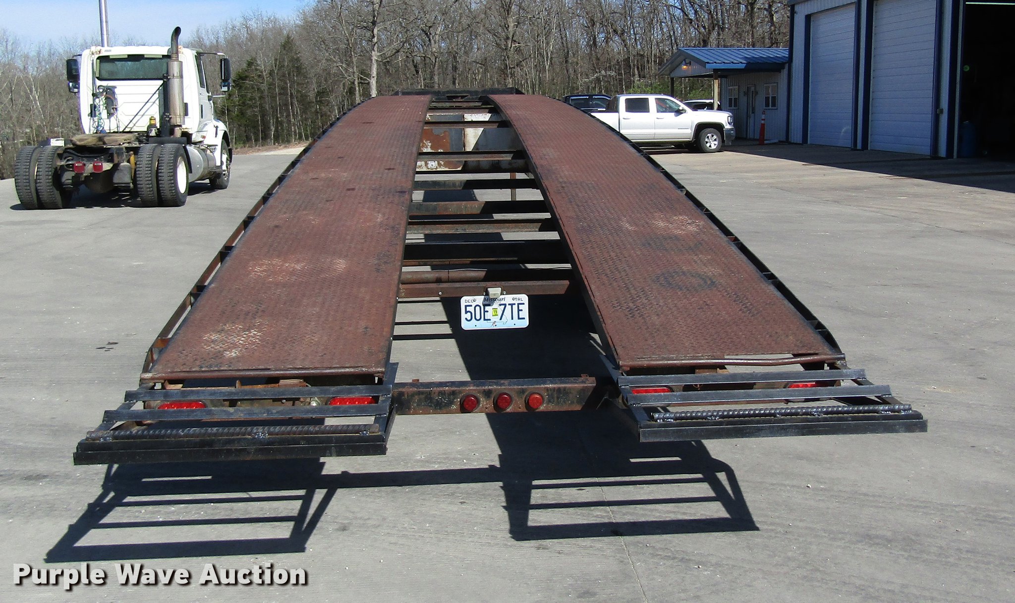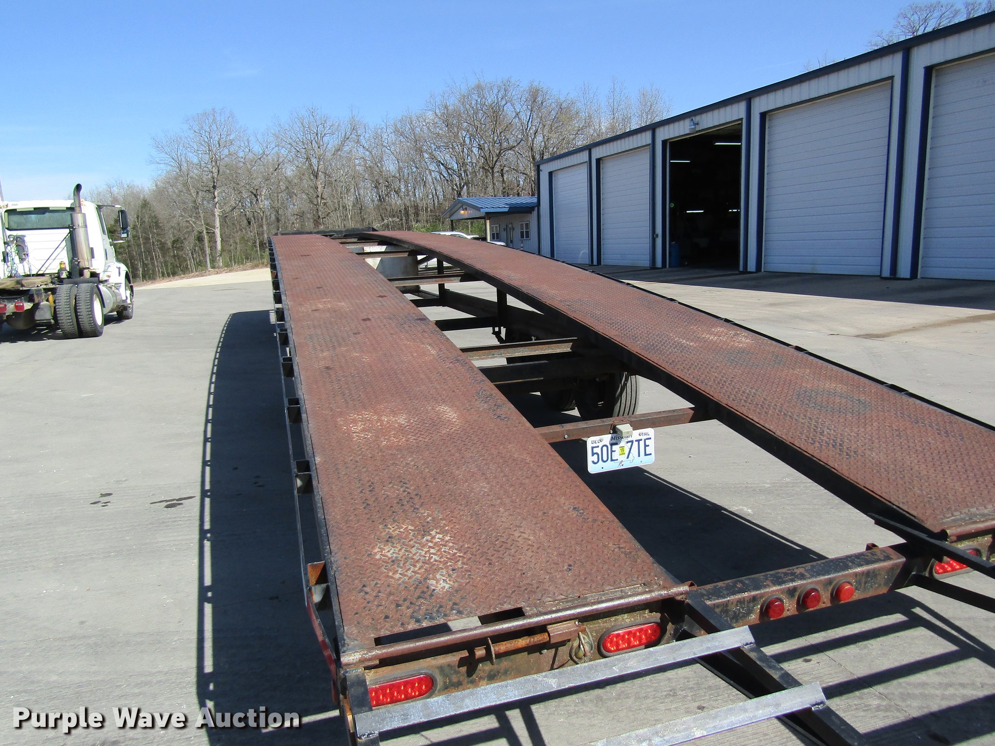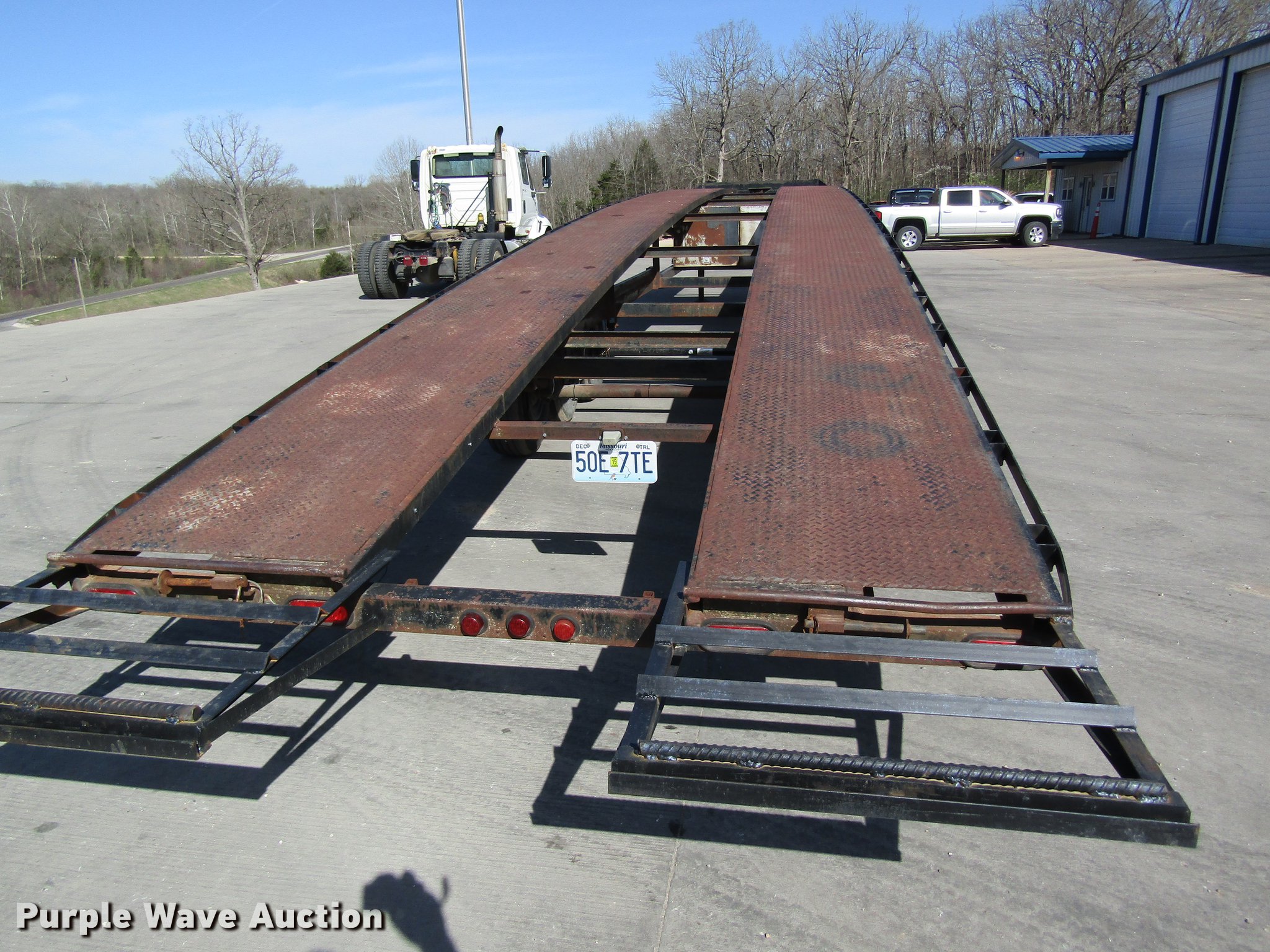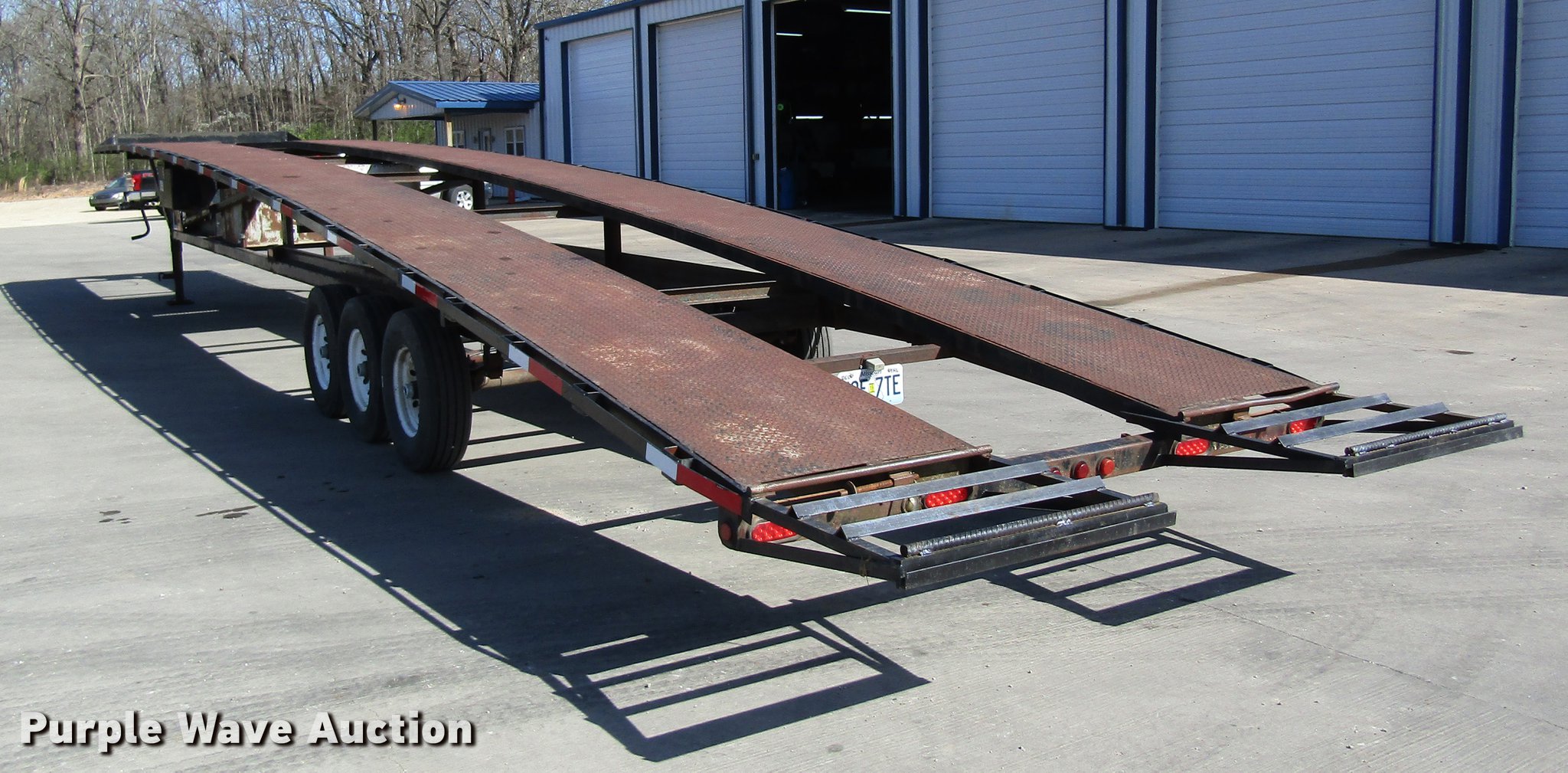 Purple Wave is selling a used Car Carrier in Missouri. This item is a 2002 Kaufman car carrier trailer with the following: 50'L x 8'W, 30"L dovetail, Steel deck, Stake pockets, Gooseneck ball, Dual leg landing gear, Spring suspension, Electric brakes, Triple axle, Steel wheels, 235/85R16 tires, GVWR 148,000 lbs