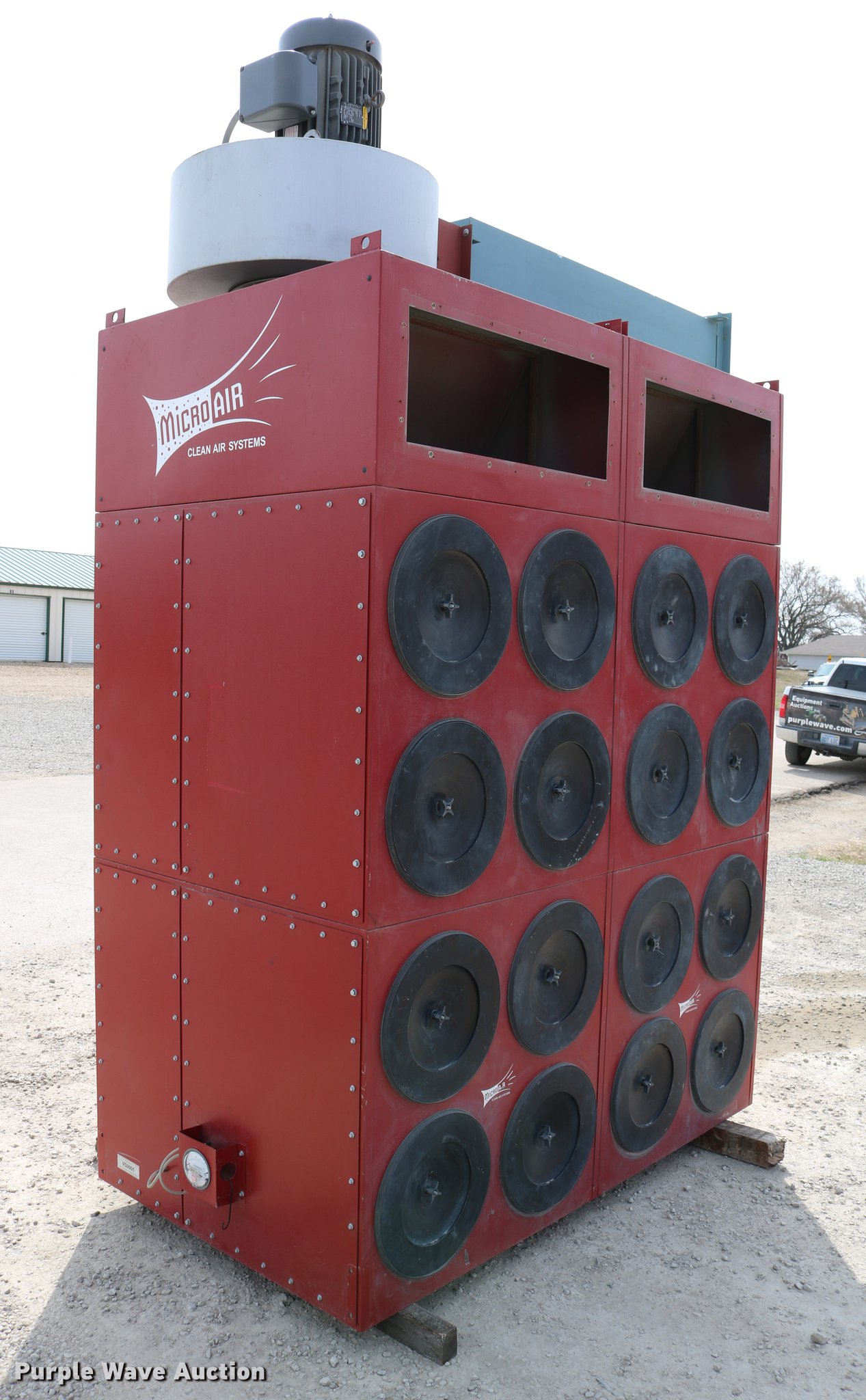 Purple Wave is selling a used Tools in Kansas. This item is a Micro Air dust collection system with the following: Baldor three phase electric motor, 30 HP, 230/460V, (16) filters, Disconnect boxes, Dust collecting barrels, Equipment No. VS0001