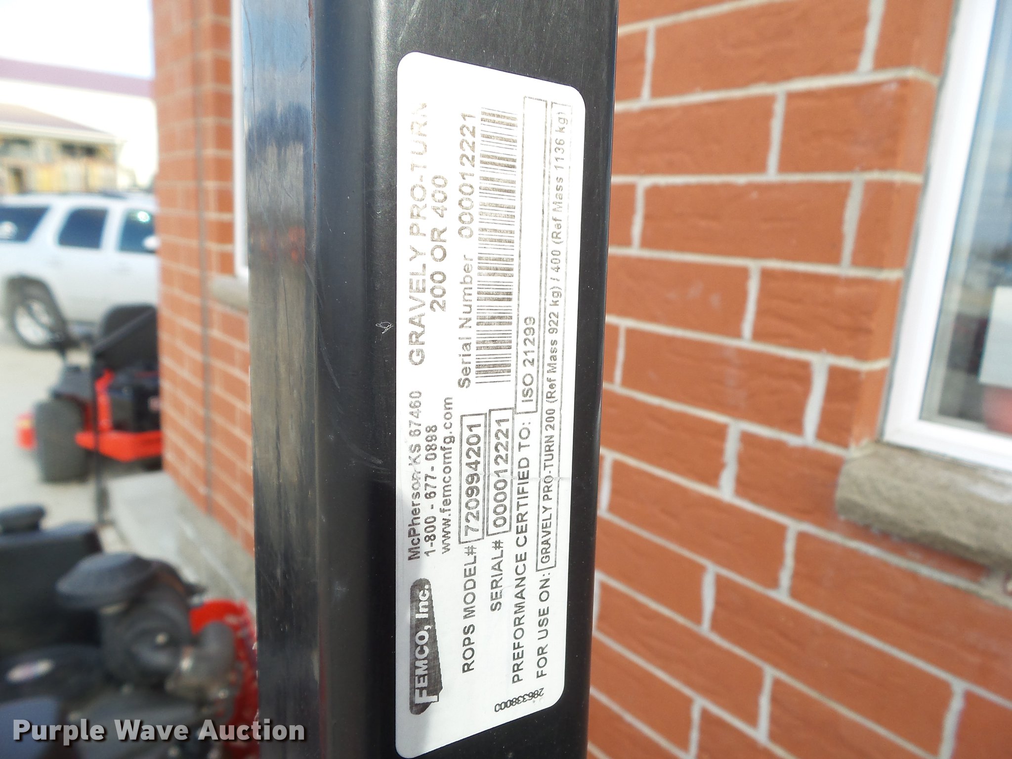 Purple Wave is selling a used Commercial Turf Mower in Iowa. This item is a 2012 Gravely Pro Turn 460 ZTR lawn mower with the following: 1,643 hours on meter, 60" cutting capacity, Kawasaki FX850V two cylinder gas engine, Hydrostatic transmission, ROPS, Serial 000012221, Dual fuel tanks, 13 x 6.5-14.50 front tires, 24 x 21.00-12 rear tires