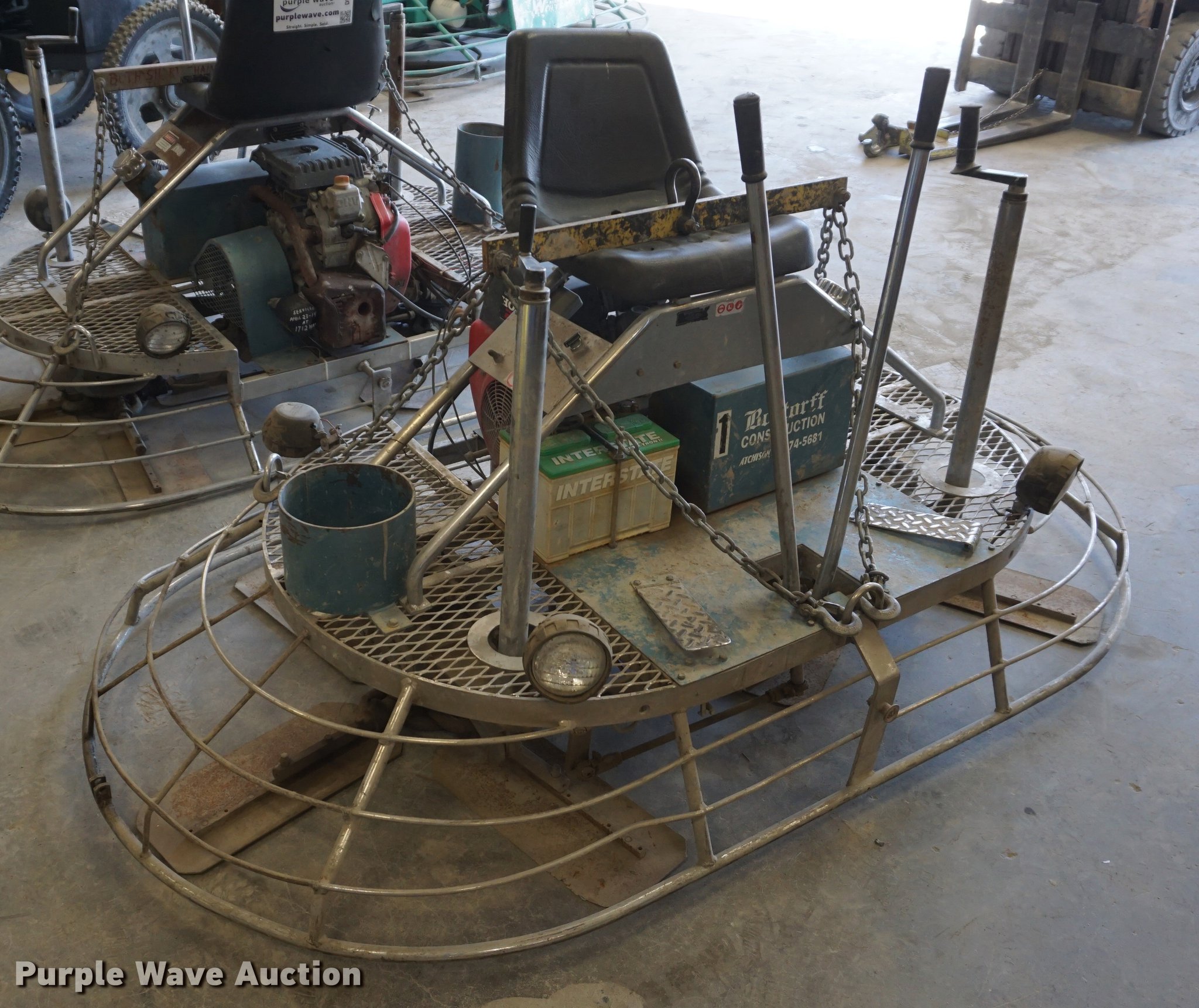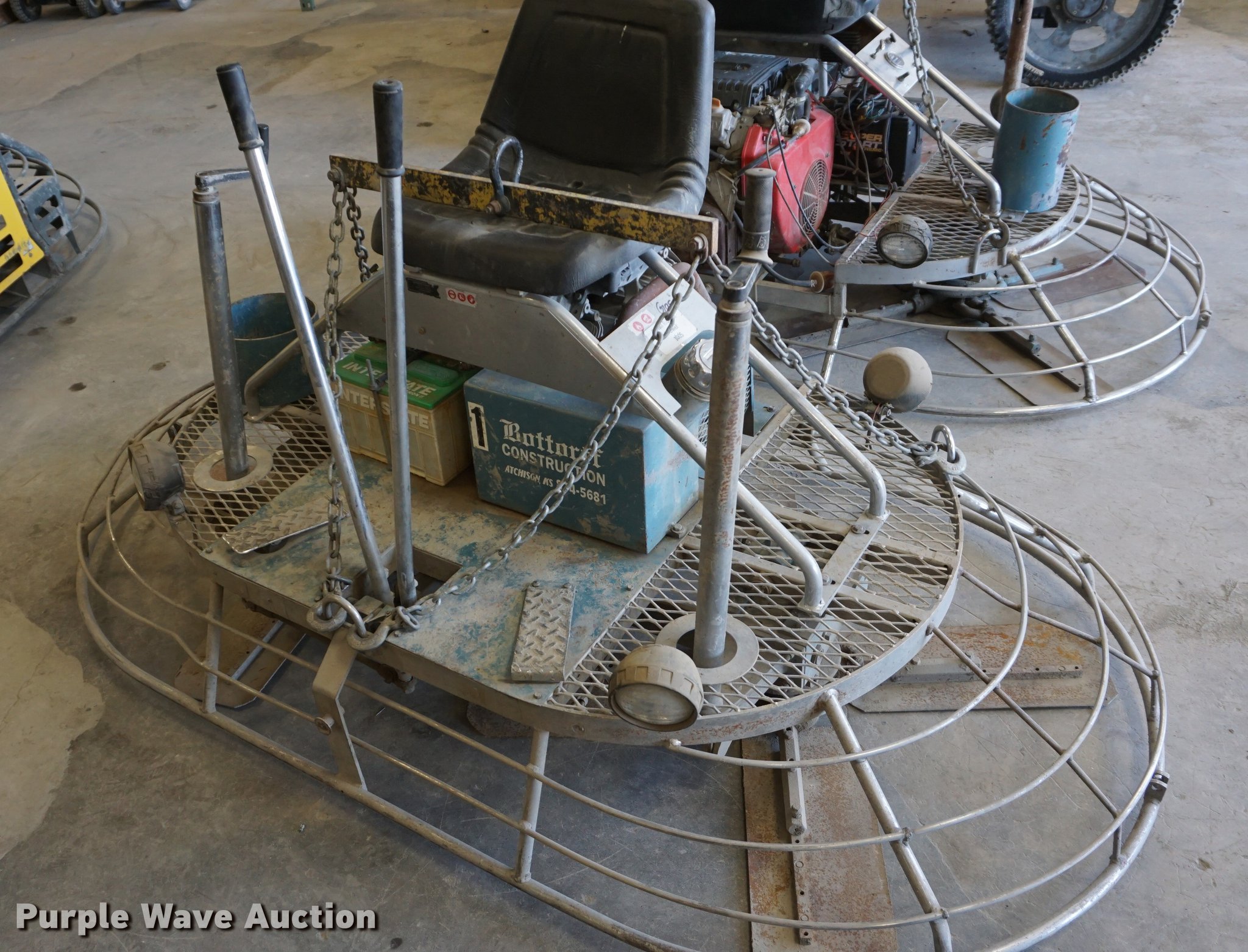 Purple Wave is selling a used Concrete Equip. or Acces. in Kansas. This item is a Bartell power trowel with the following: 411 hours on meter, Honda 20 HP gas engine, 6'W, Carburetor needs to be cleaned