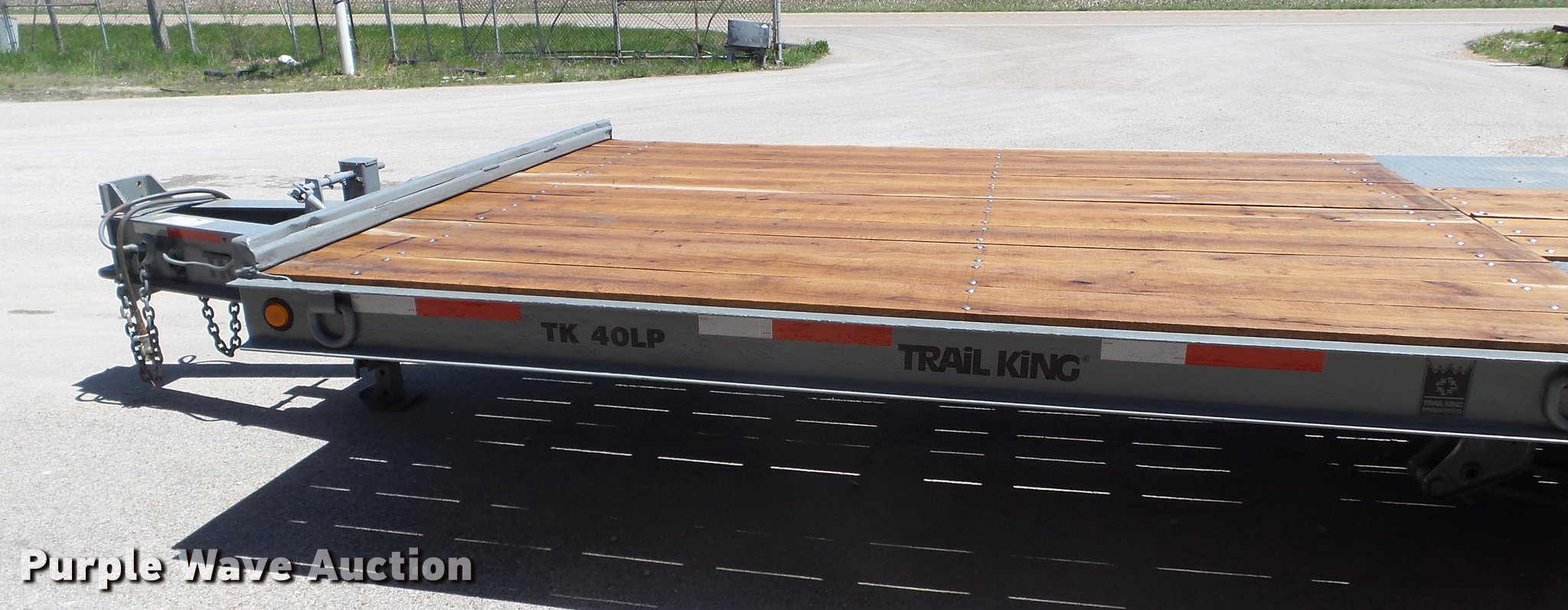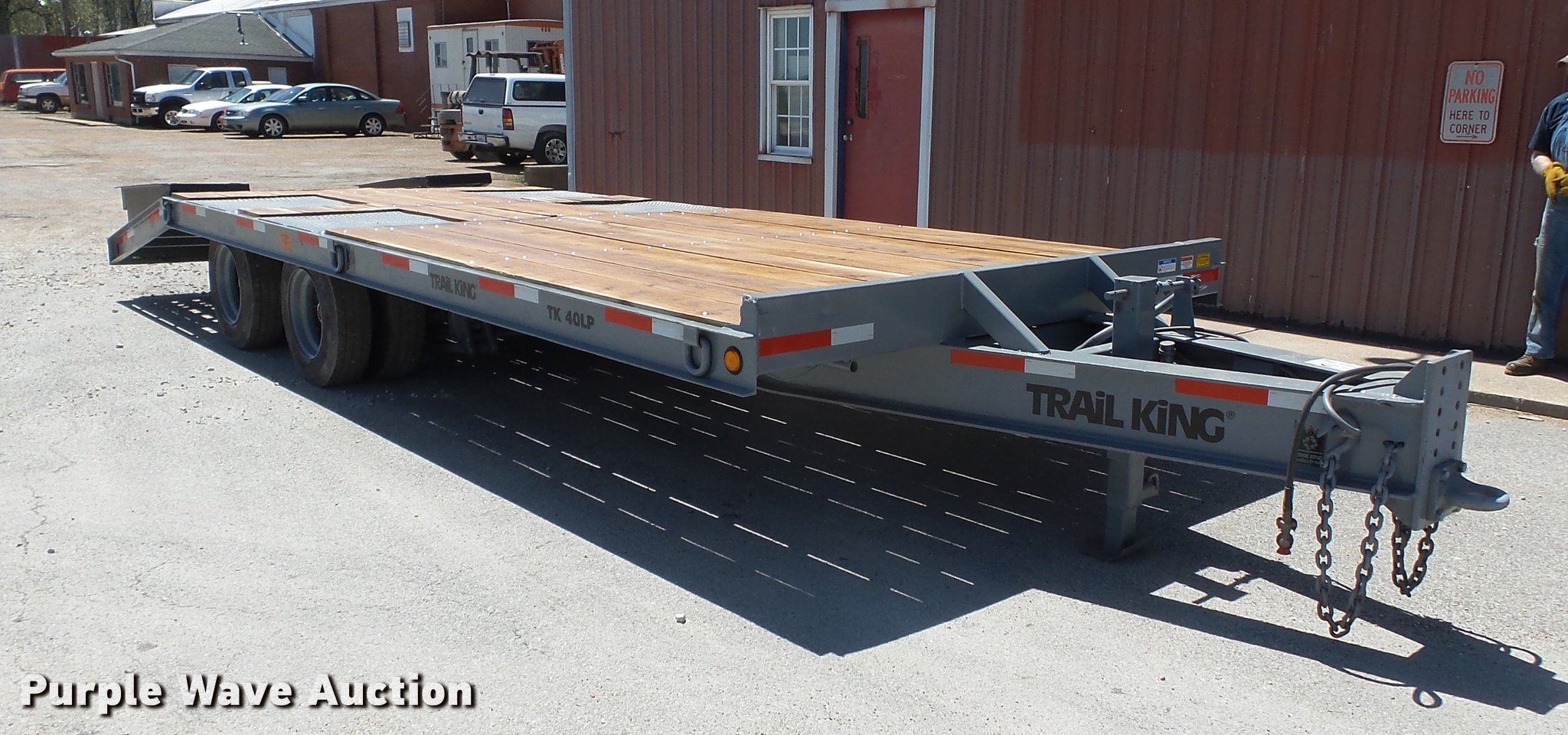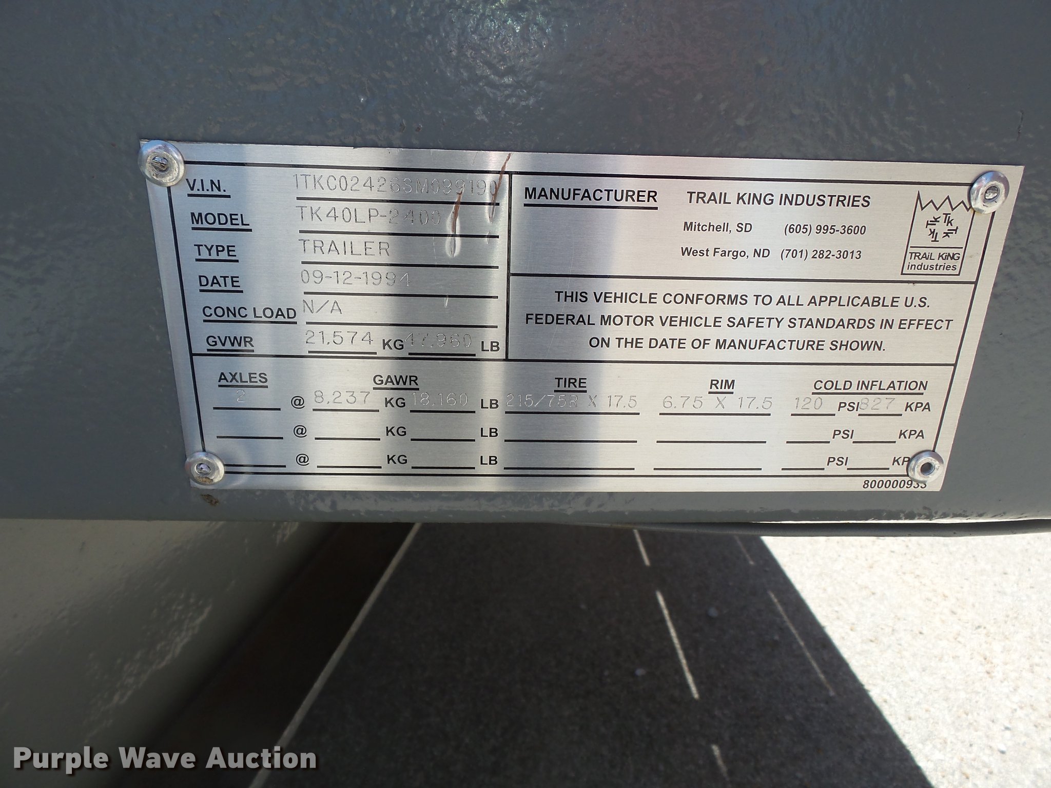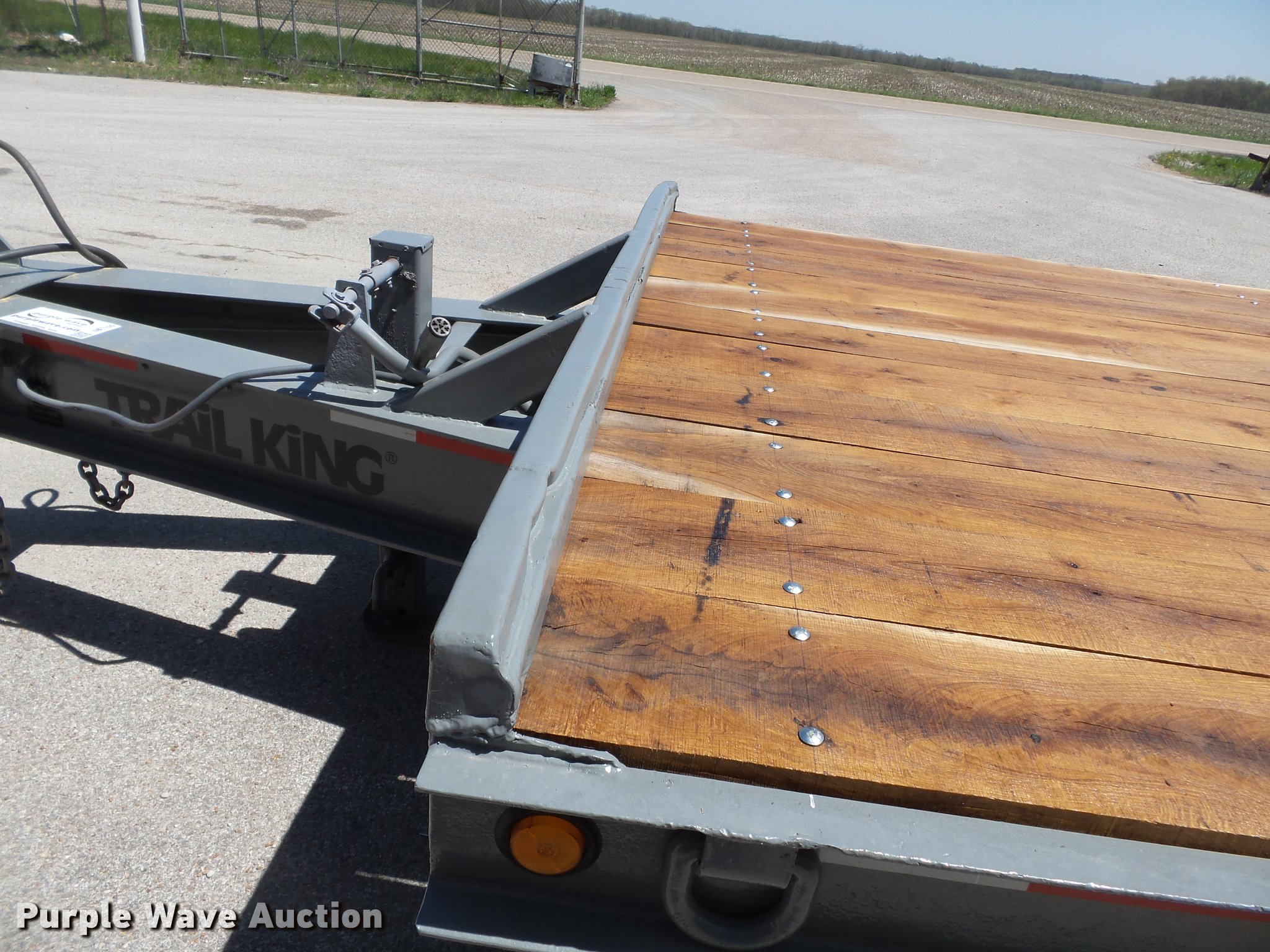 Purple Wave is selling a used Equip. Trailer in Illinois. This item is a 1995 Trail King TK40LP equipment trailer with the following: 29' overall length, 24'L x 102"W wood deck, 33" floor height, 5'L dovetail, 4'L ramps, D-ring tie downs, Recessed toolbox, Pintle hitch, Single leg landing gear, Tandem axle, Spring suspension, Air brakes, Steel wheels, 215/75R17.5 tires, GVWR 47,960 lbs