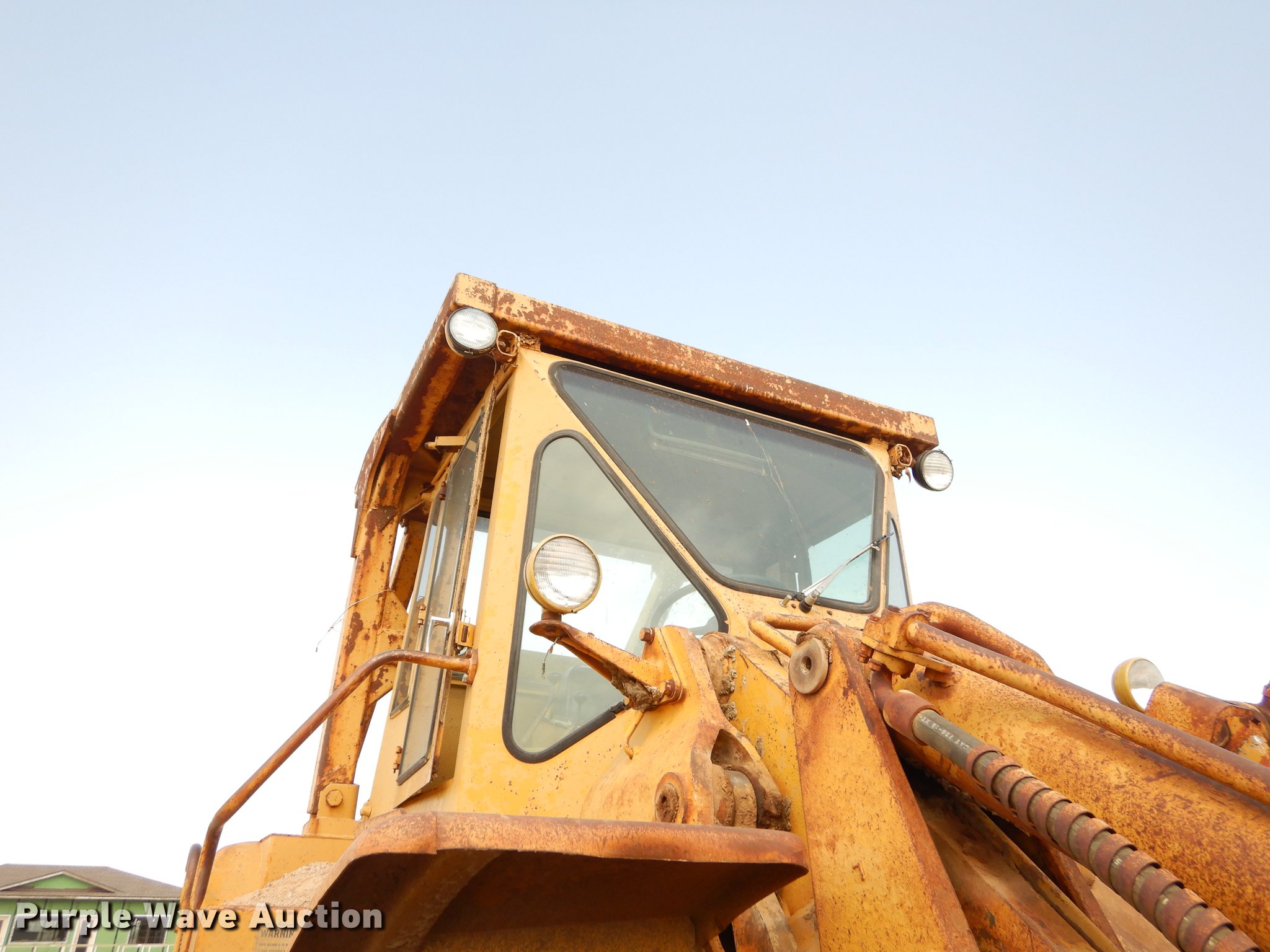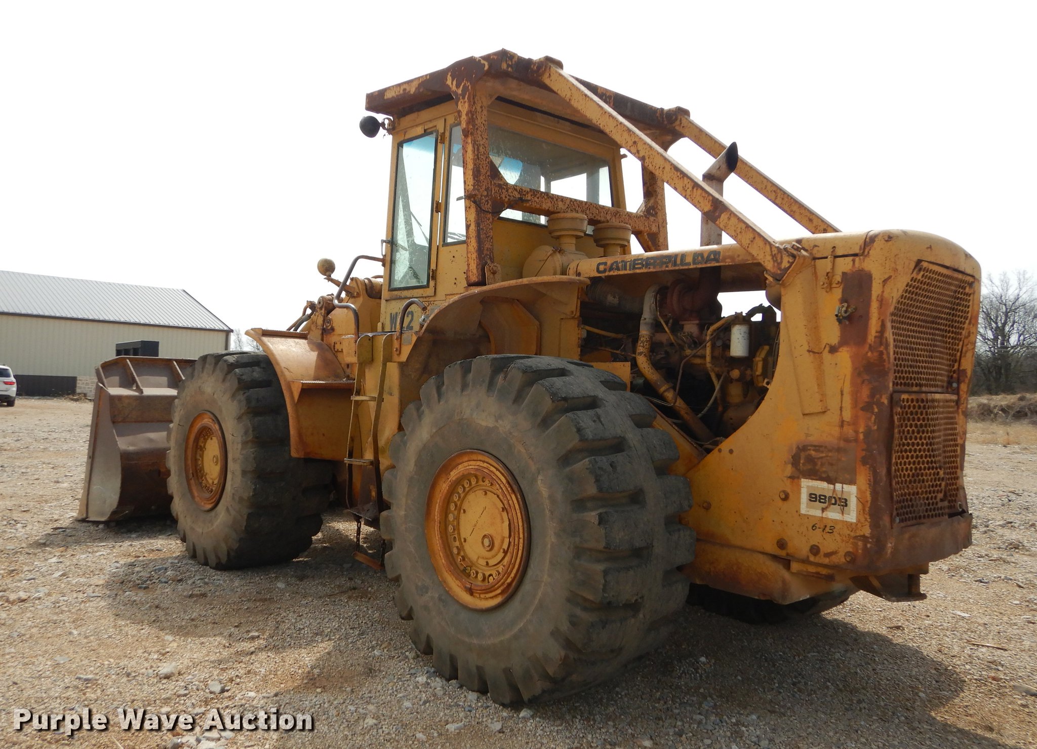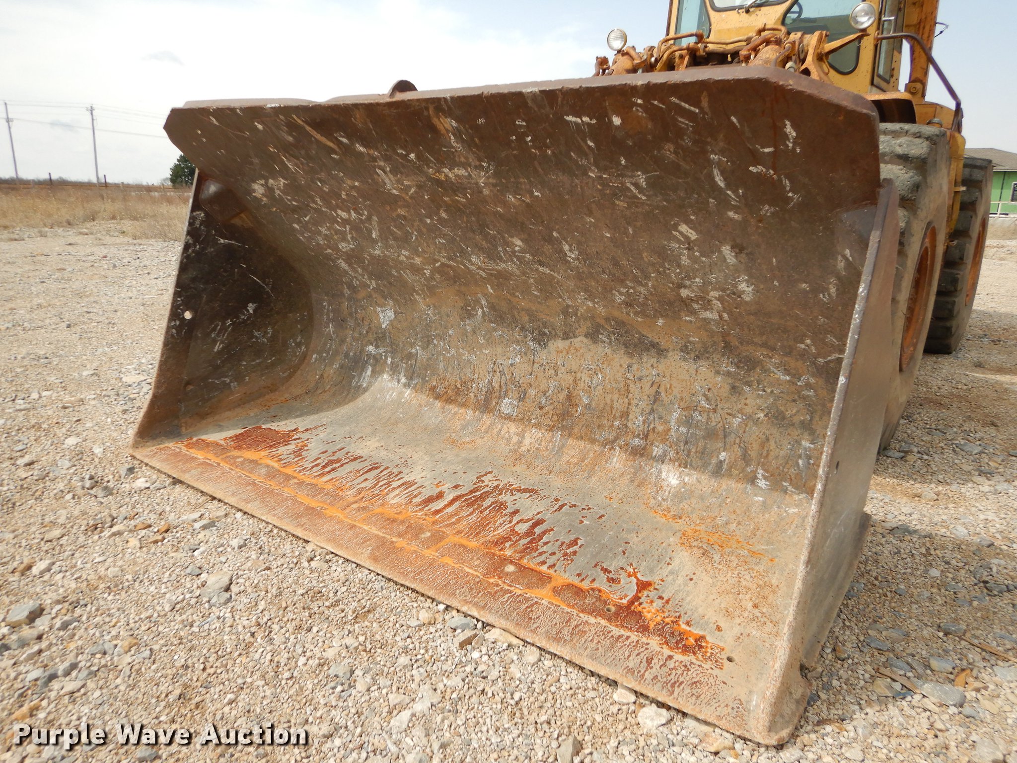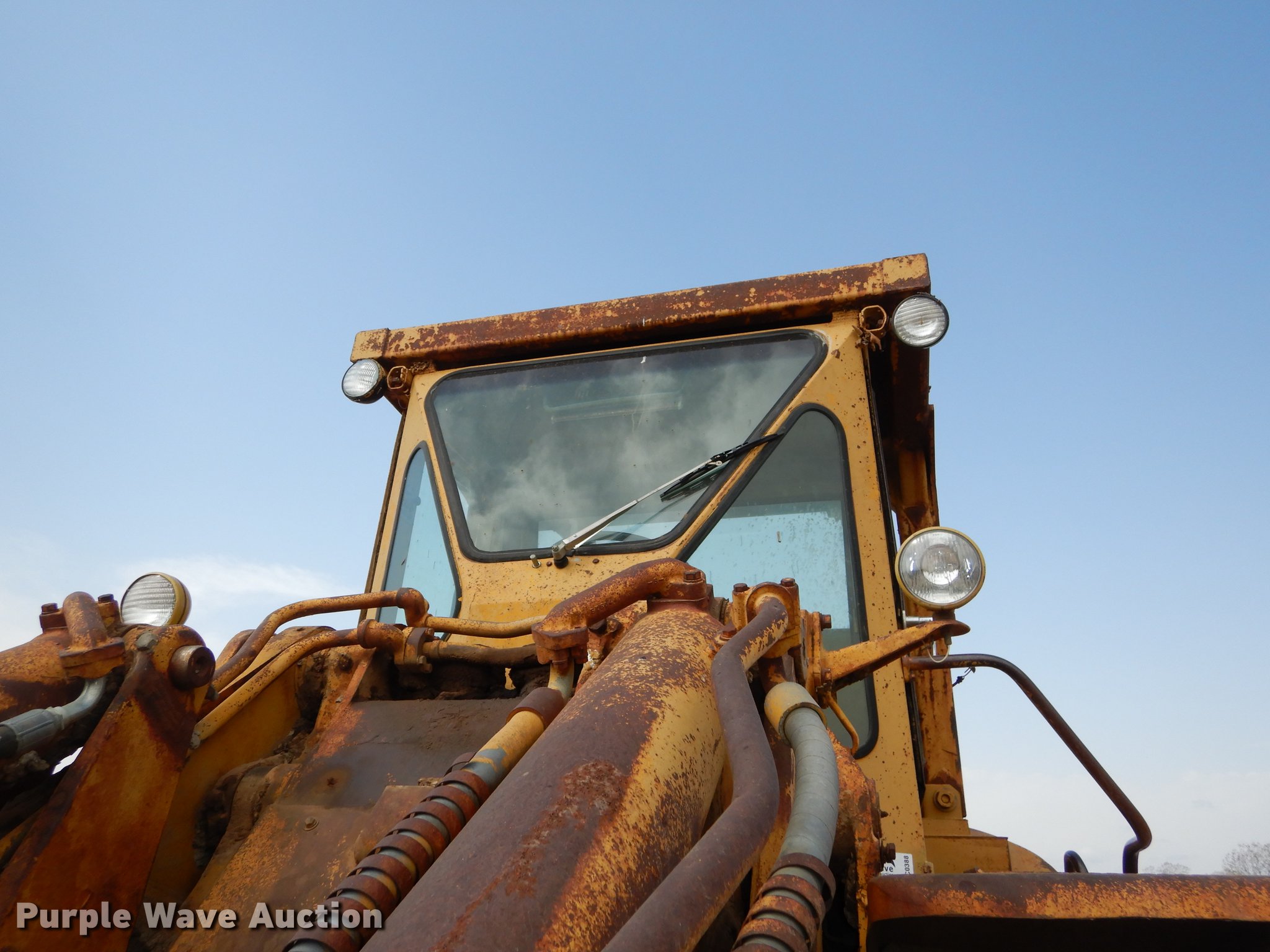 Purple Wave is selling a used Wheel Loader in Kansas. This item is a 1970 Caterpillar 980B wheel loader with the following: Caterpillar D333 six cylinder turbo diesel engine, 260 HP, Powershift transmission, 3F-3R gears, Enclosed cab, Heat, Two-lever bucket controls, Wipers, Front work lights, 125"W general purpose bucket, Weld-on cutting edge, Toyo 26.5-25 tires, Cylinders leak, Serial 89P469