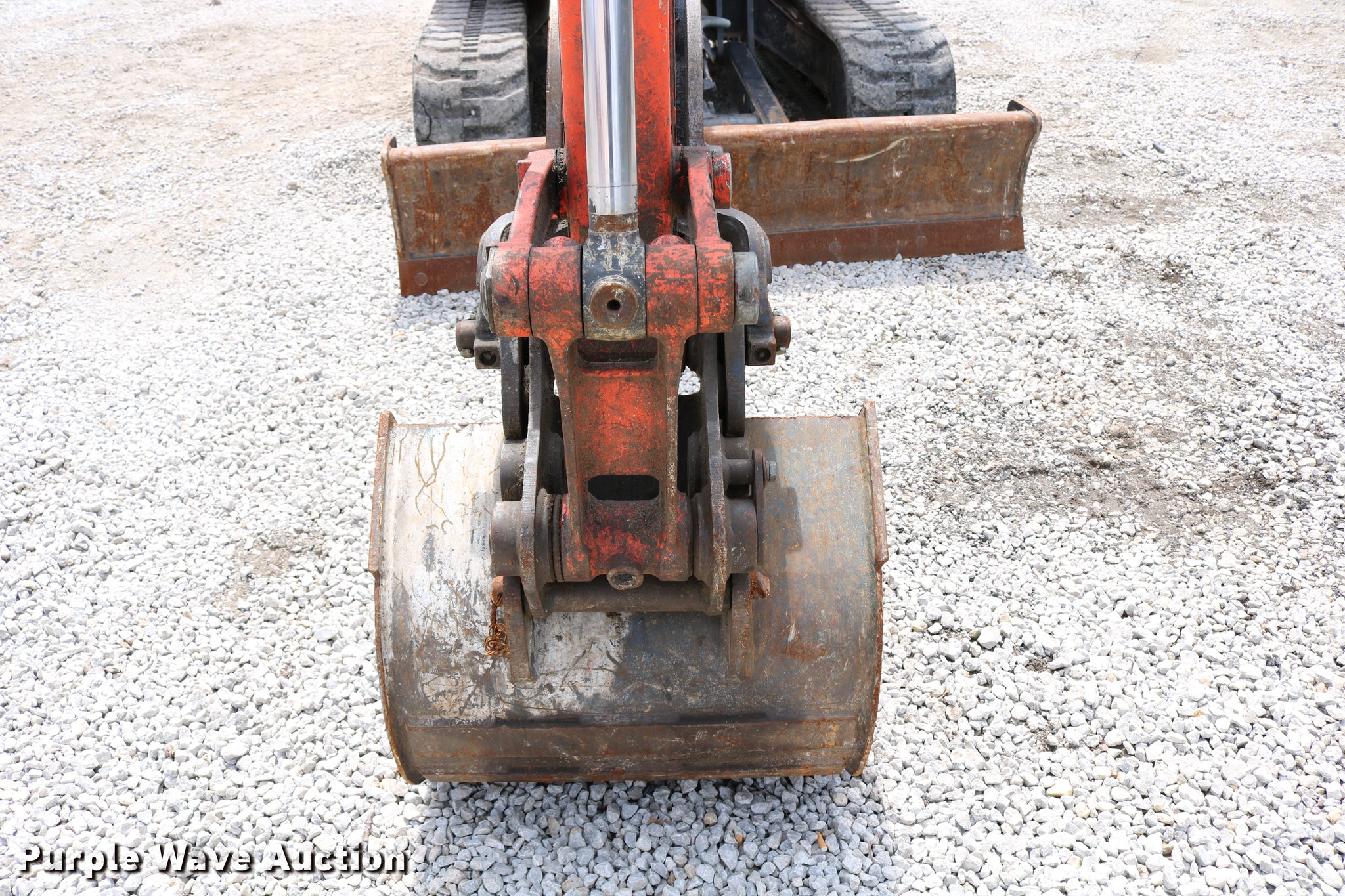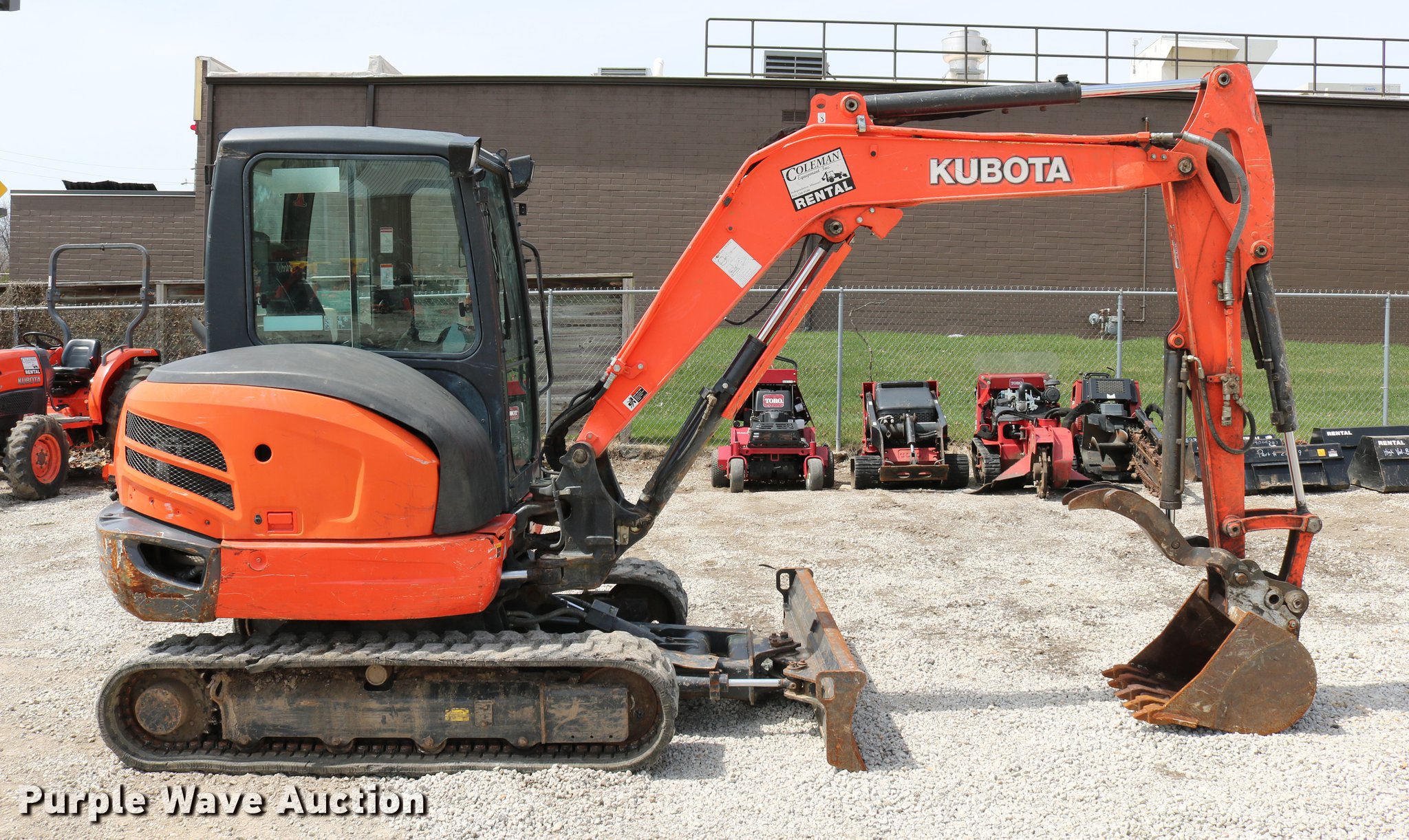 Purple Wave is selling a used Mini Excavator in Missouri. This item is a 2013 Kubota KX040-4 mini excavator with the following: 1,490 hours on meter, Kubota D1803-ER-T-EF03 four cylinder turbo diesel engine, 29.7 kW, Serial 7DG6742, Two speed hydrostatic transmission, Enclosed cab/EROPS, AC and heat, Suspension seat, Pattern changer, Front work lights, Wipers, Glow plugs, 67"W backfill blade, Standard boom, 63.5" stick length, Mechanical quick coupler, Kubota K7870 hydraulic thumb, Serial K7902, Kubota K7875 24"W bucket, (5) weld-on teeth, 14"W rubber tracks, Serial 20523