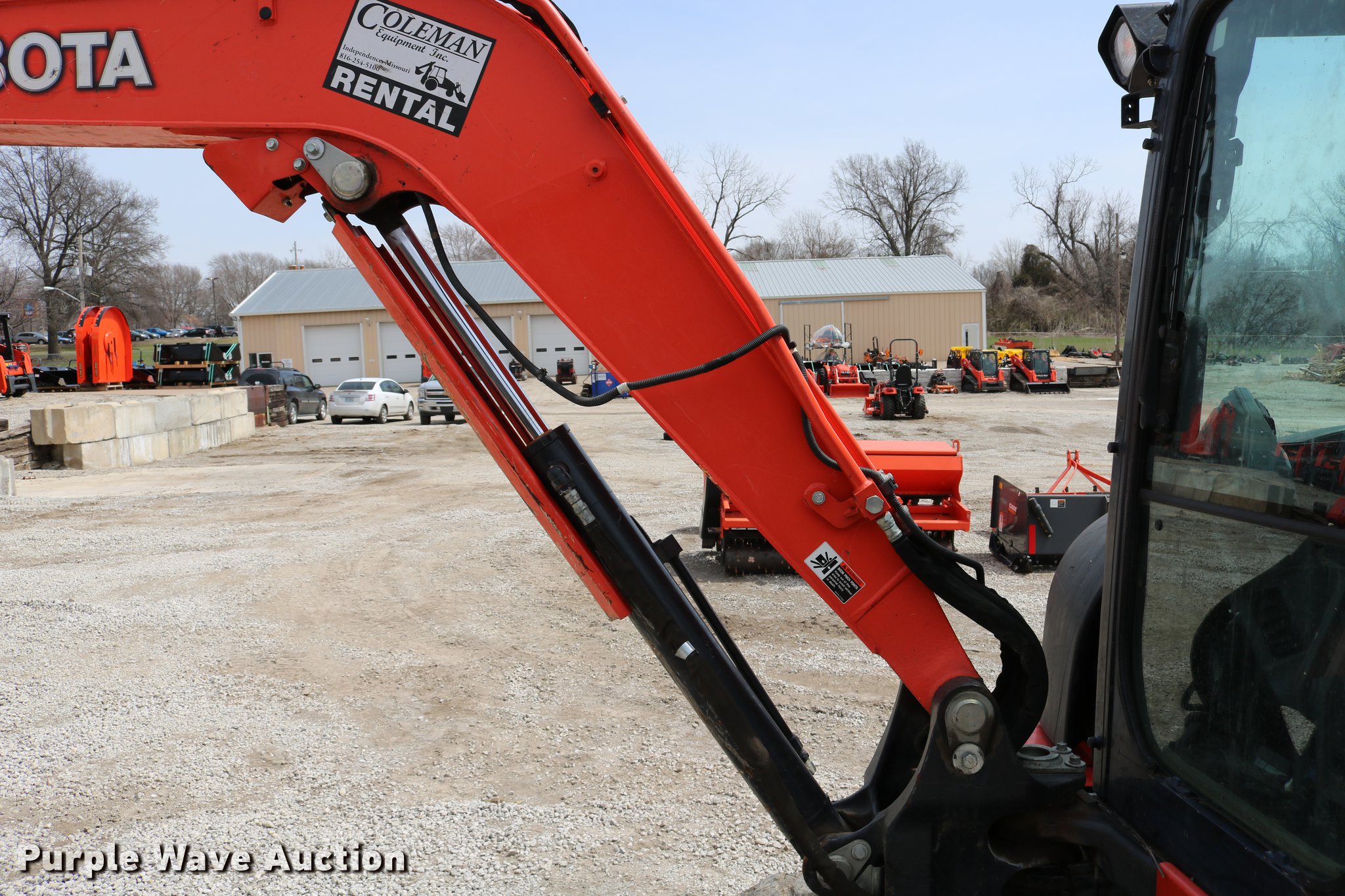 2013 Kubota KX040-4 mini excavator. 1,490 hours on meter, Kubota D1803-ER-T-EF03 four cylinder turbo diesel engine 29.7 kW, Serial 7DG6742, Two speed hydrostatic transmission, Enclosed cab/EROPS, AC and heat, Suspension seat, Pattern changer, Front work lights, Wipers, Glow plugs, 67"W backfill blade, Standard boom, 63.5" stick length, Mechanical quick coupler, Kubota K7870 hydraulic thumb Serial K7902, Kubota K7875 24"W bucket (5) weld-on teeth, 14"W rubber tracks, Serial 20523. Coleman Equipment Inc.. 15905 East 23rd St S. Independence, MO 64055