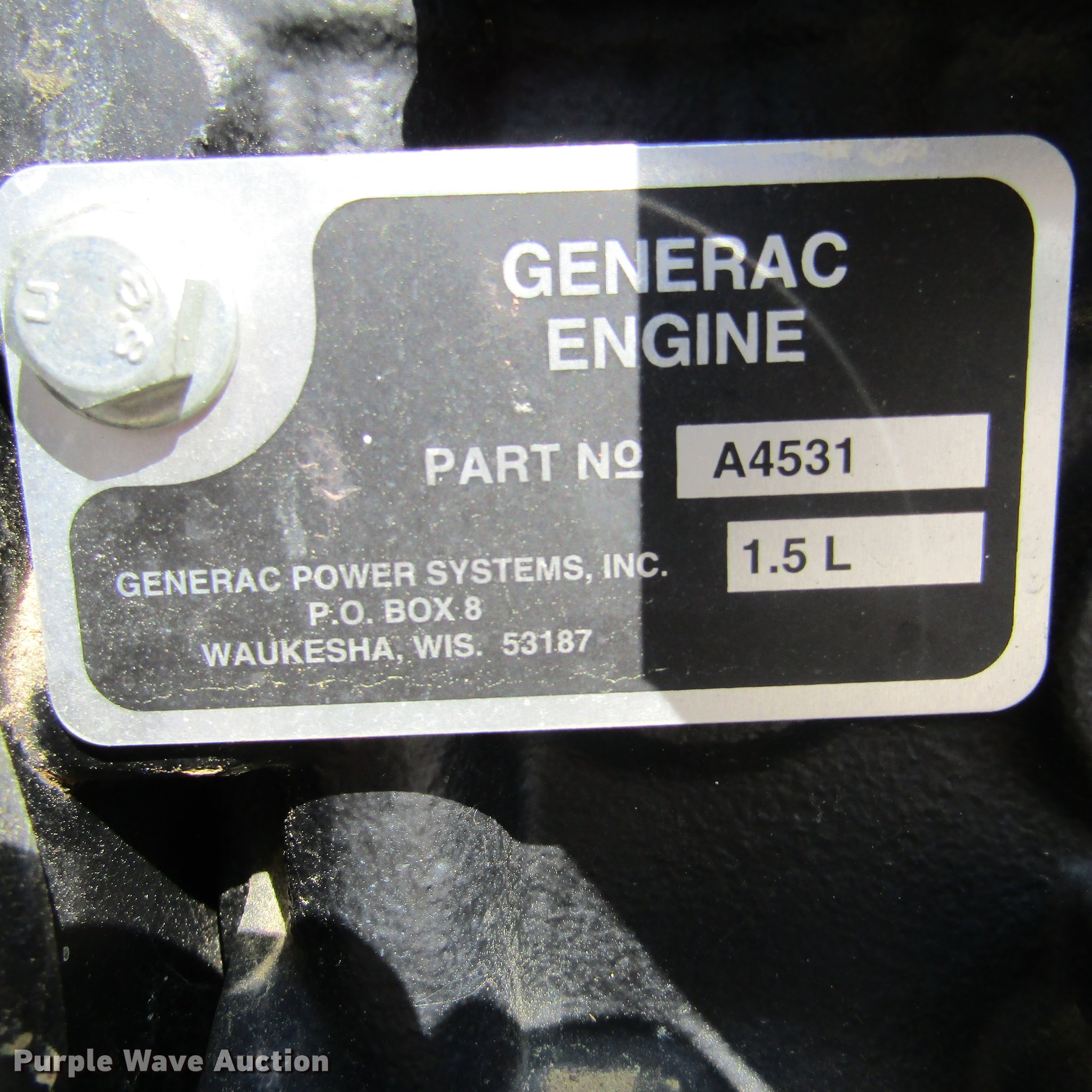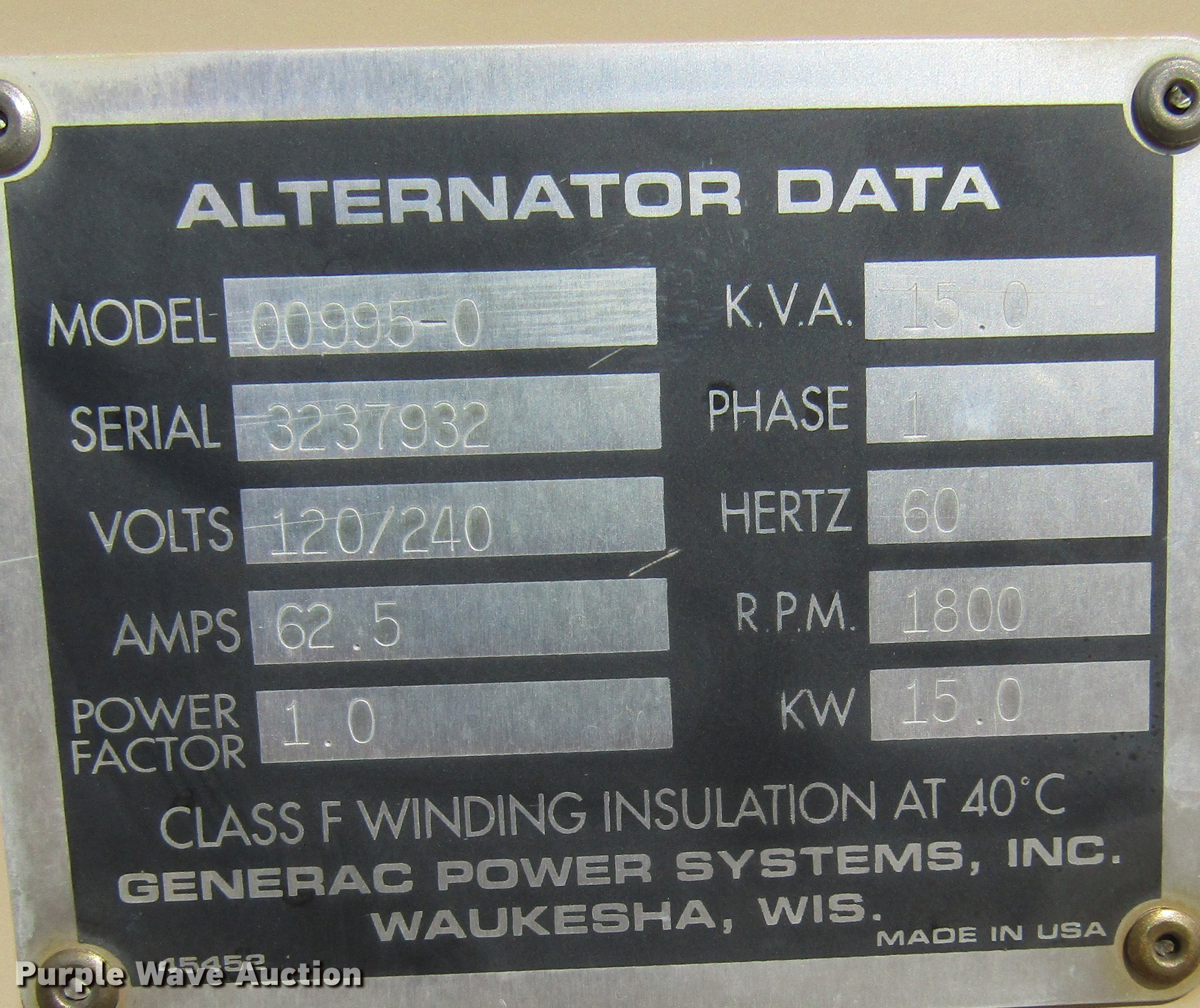 Purple Wave is selling a used Generator Set in Illinois. This item is a 1998 Generac 00995-0 generator with the following: 198 hours on meter, Mitsubishi 1.5L four cylinder propane engine, 15 kW, Serial A4531, 1,800 RPM, Control panel, 120/240V, 62.5 amps, 60 Hz, 15 kVA, 15 kW, Single phase, Built-in automatic transfer switch, Block heater, Skid mounted, No battery, Serial 3237932