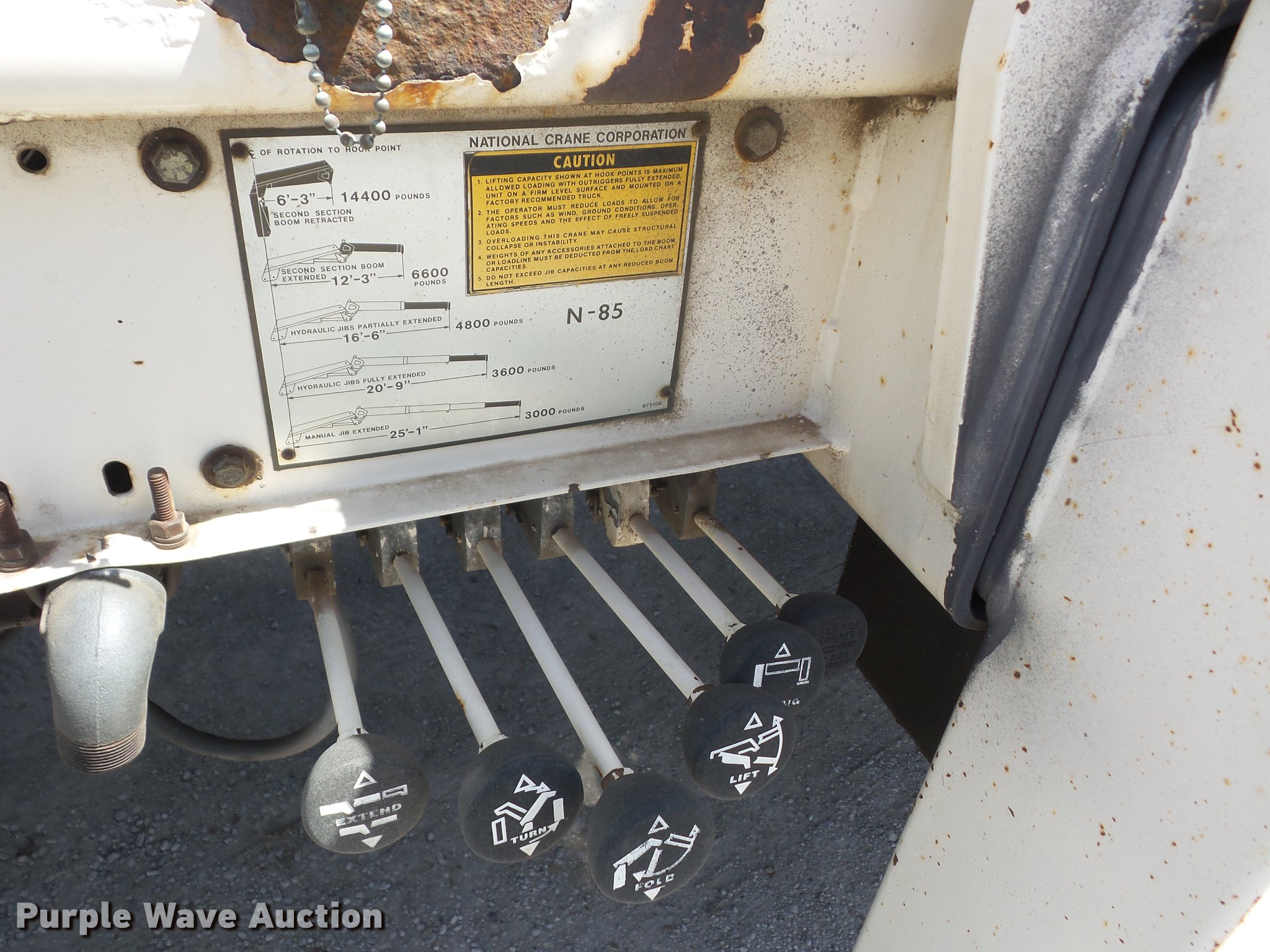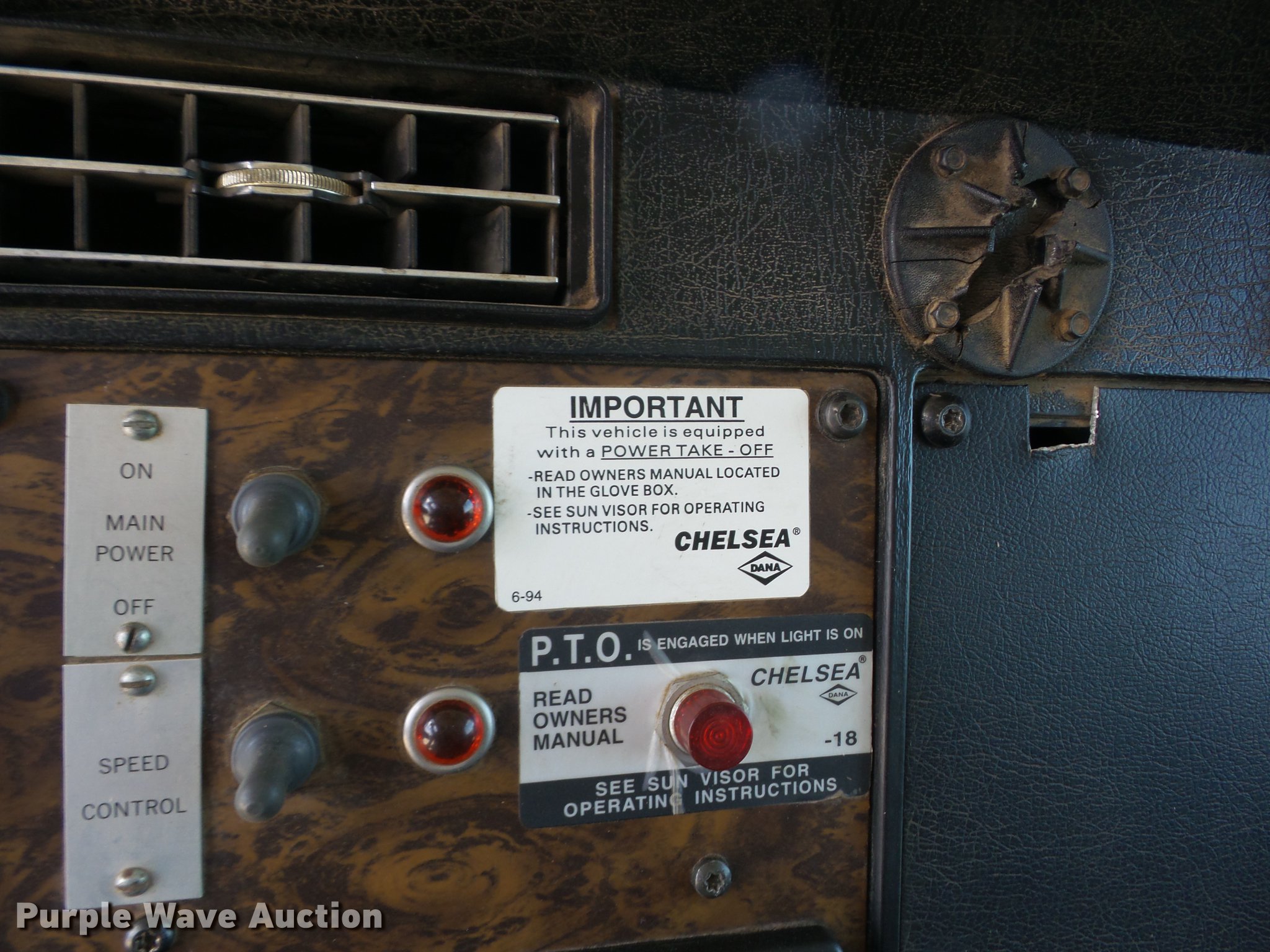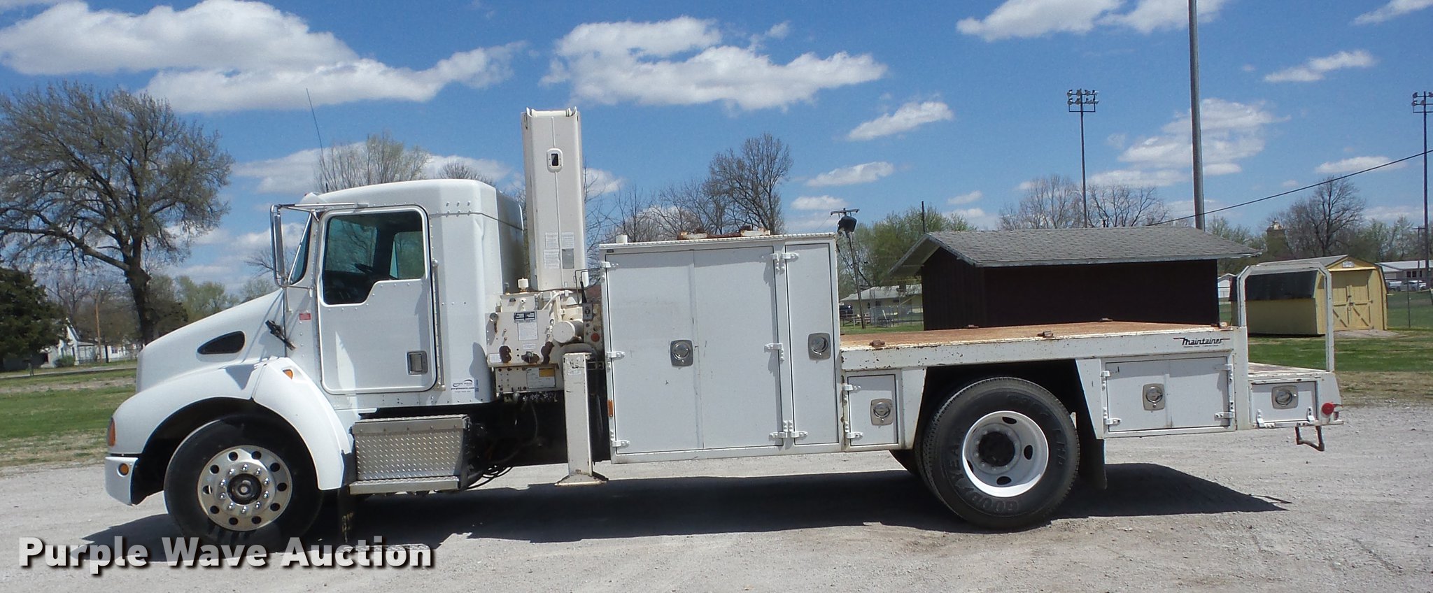 Purple Wave is selling a used Service Truck in Kansas. This item is a 1997 Kenworth T300 service truck with the following: Approx. 335,508 miles, Approx. 15,493 hours, Caterpillar 3126 7.2L L6 turbo diesel engine, 300 HP, Eaton Fuller 10 speed manual transmission, Single axle, AC and heat, Cruise, AM/FM/cassette, Air suspension seat, Backup alarm, PTO, Single exhaust stack, Maintainer service truck, 16.5'L, 4' x 8' flat deck, Shelving, Slide-out drawers, Work lights, Mounted vise, D-ring tie downs, Miller Bobcat 225G AC/DC welder, 137 hours on meter, Gas engine, 240V outlet, (2) 120V outlets, Leads, Air compressor, National N85 crane, 14,400 lbs max lift capacity, (2) outriggers, Single fuel tank, Receiver hitch, Spring suspension, Air brakes, 295/75R22.5 front tires, 11R22.5 rear tires, GVWR 33,000 lbs