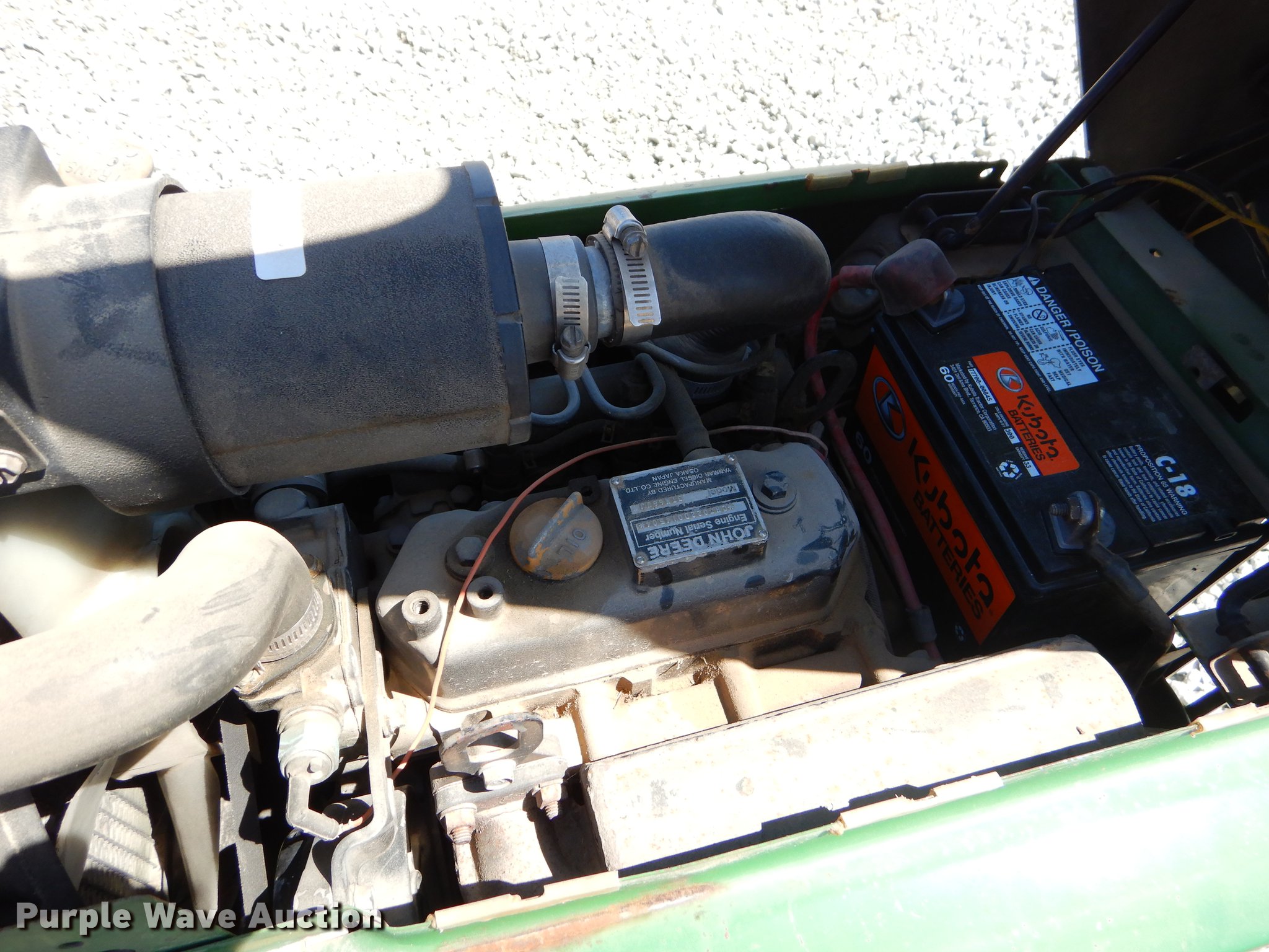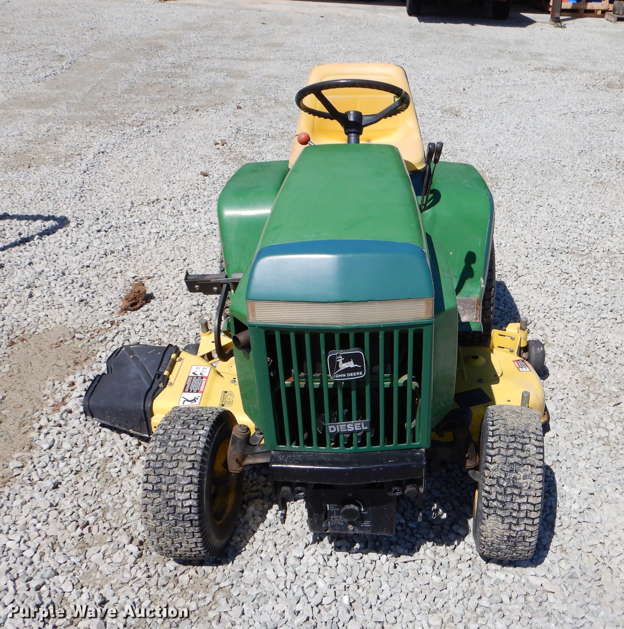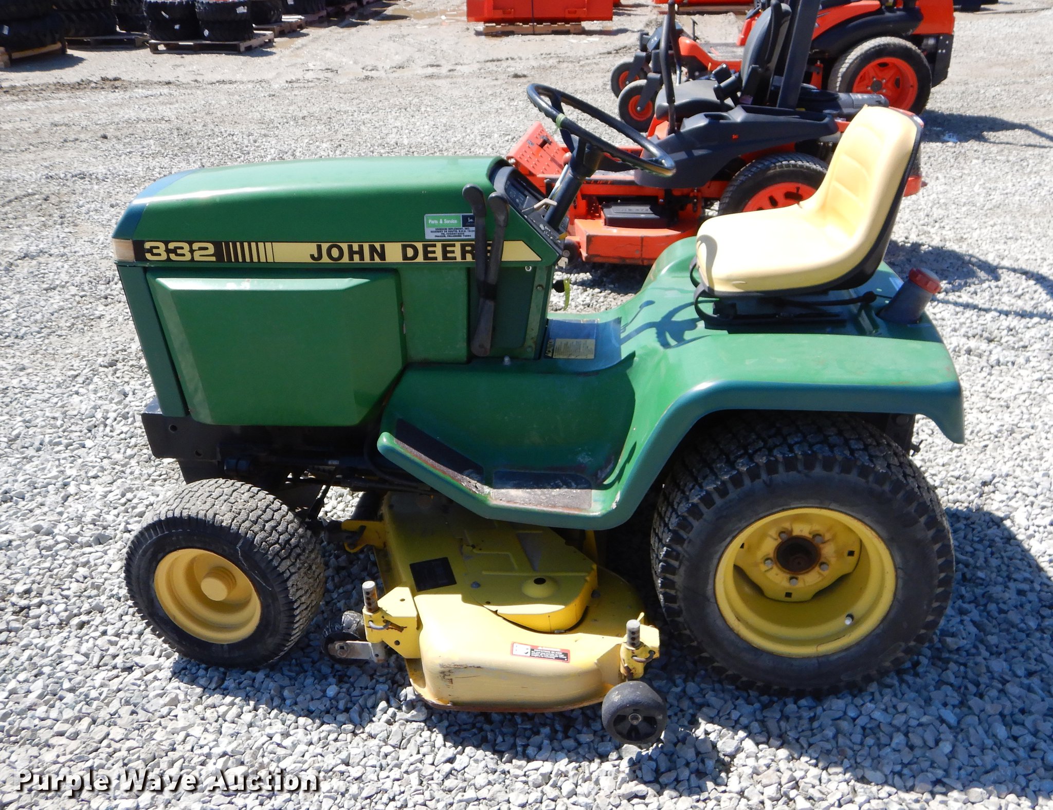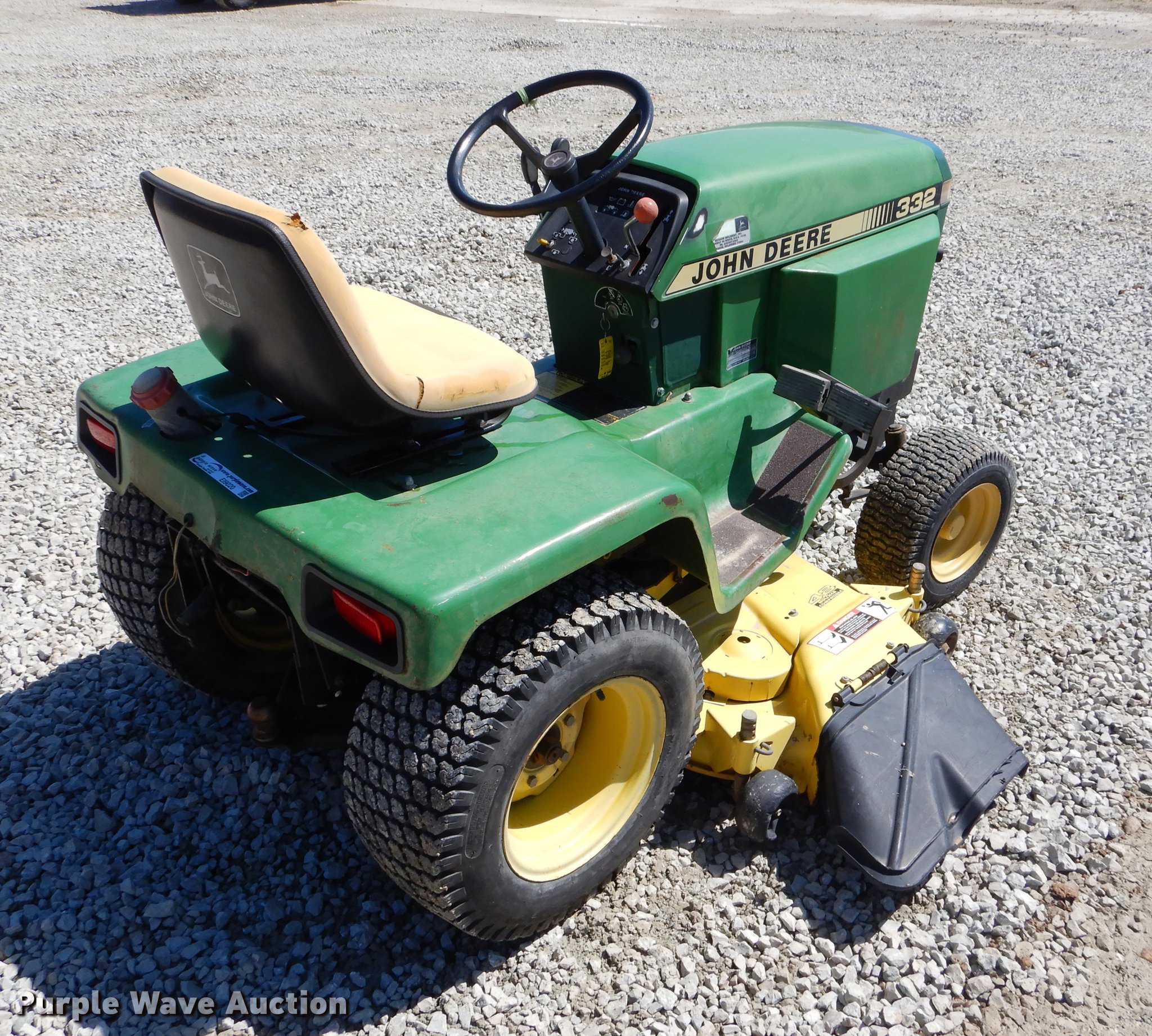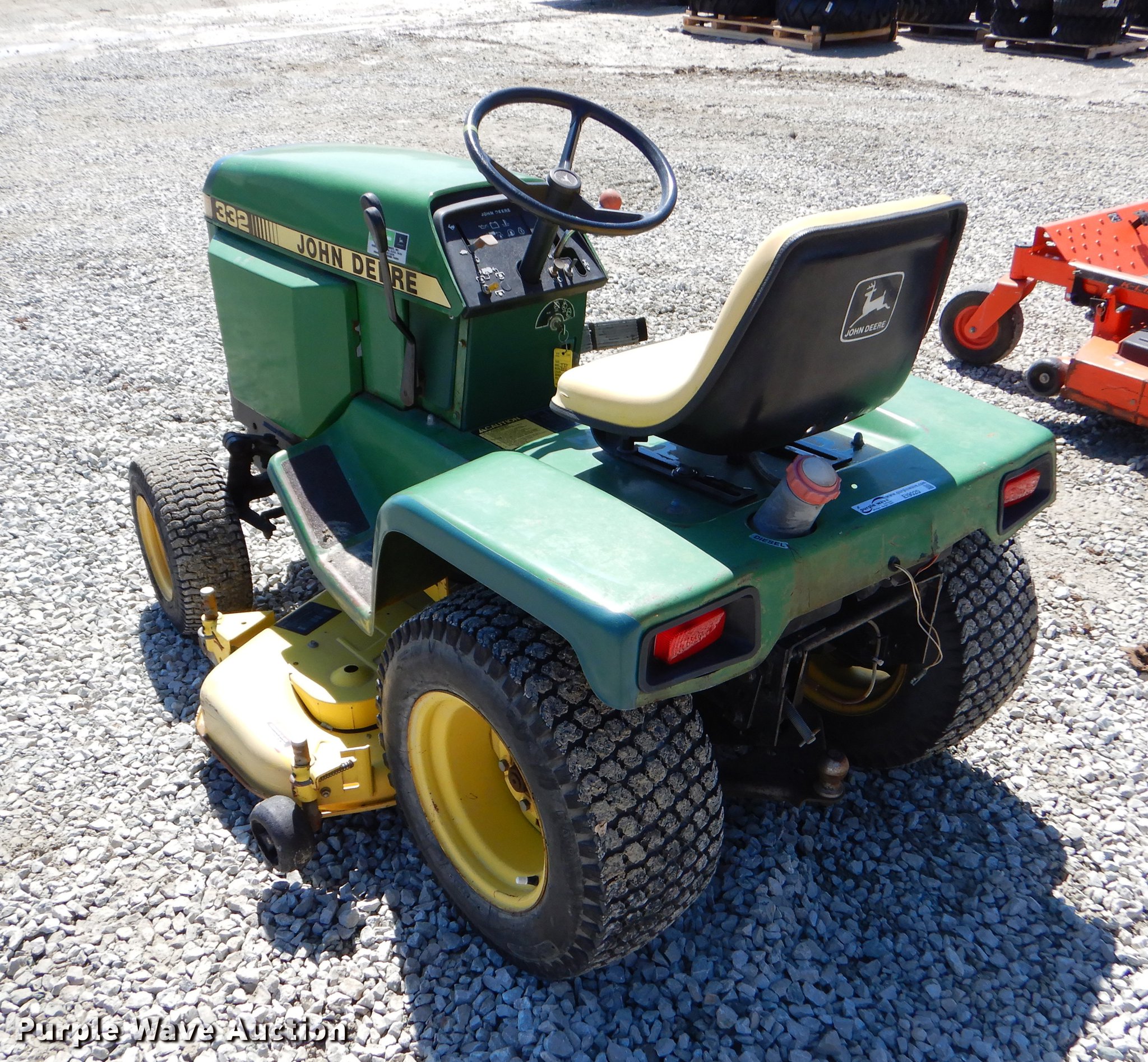 Purple Wave is selling a used Lawn Mower in Oklahoma. This item is a John Deere 332 lawn mower with the following: 48" cut, John Deere 3TN66UJ three cylinder diesel engine, Serial CH3022D014504, Hydrostatic transmission, Suspension seat, 2" ball hitch, 16x6.50-8 front tires, 23x10.50-12 rear tires, Serial M00332X424115