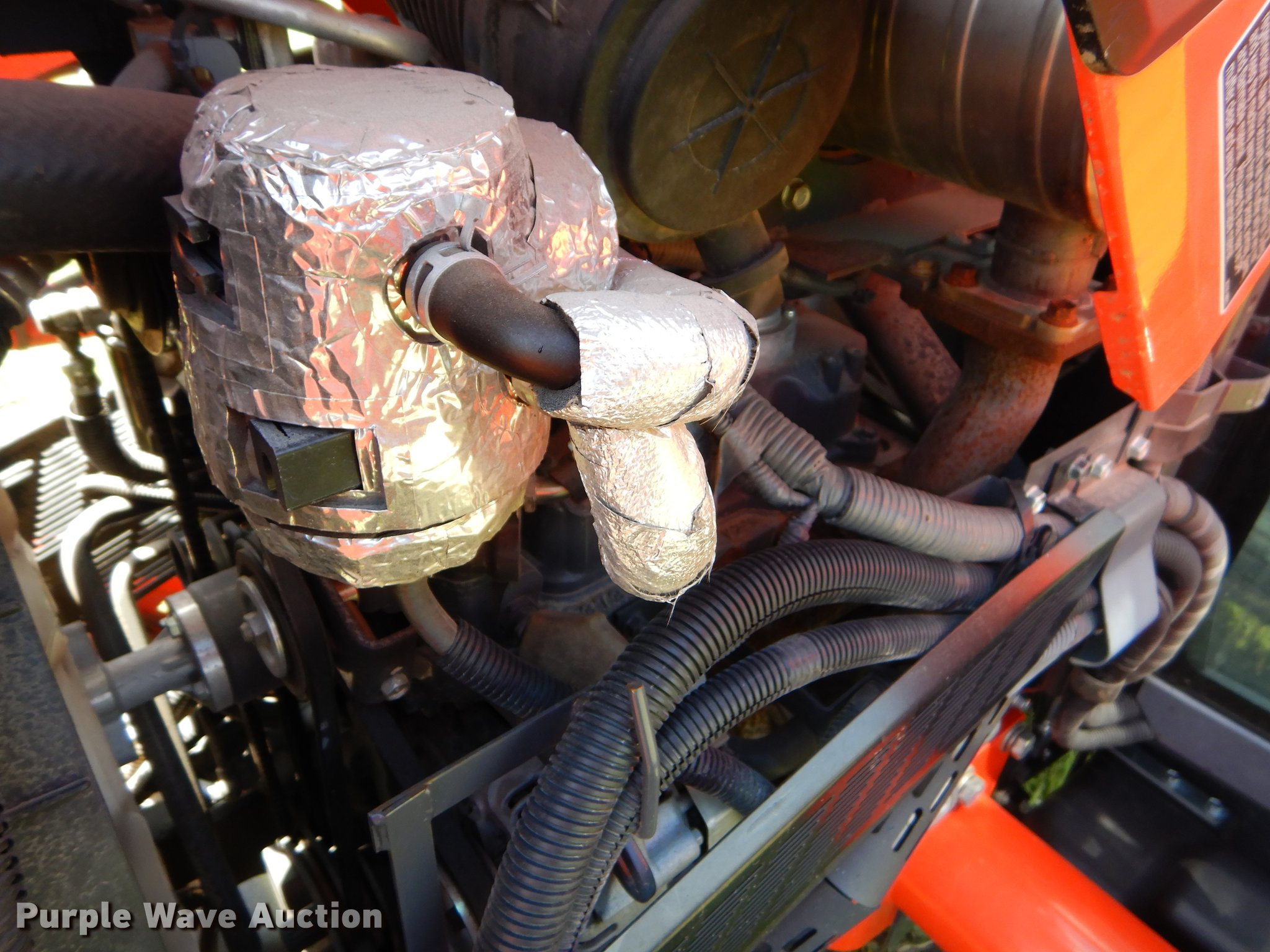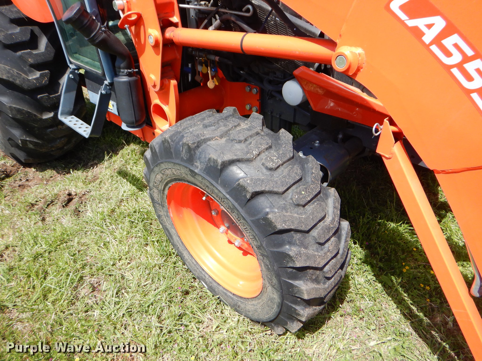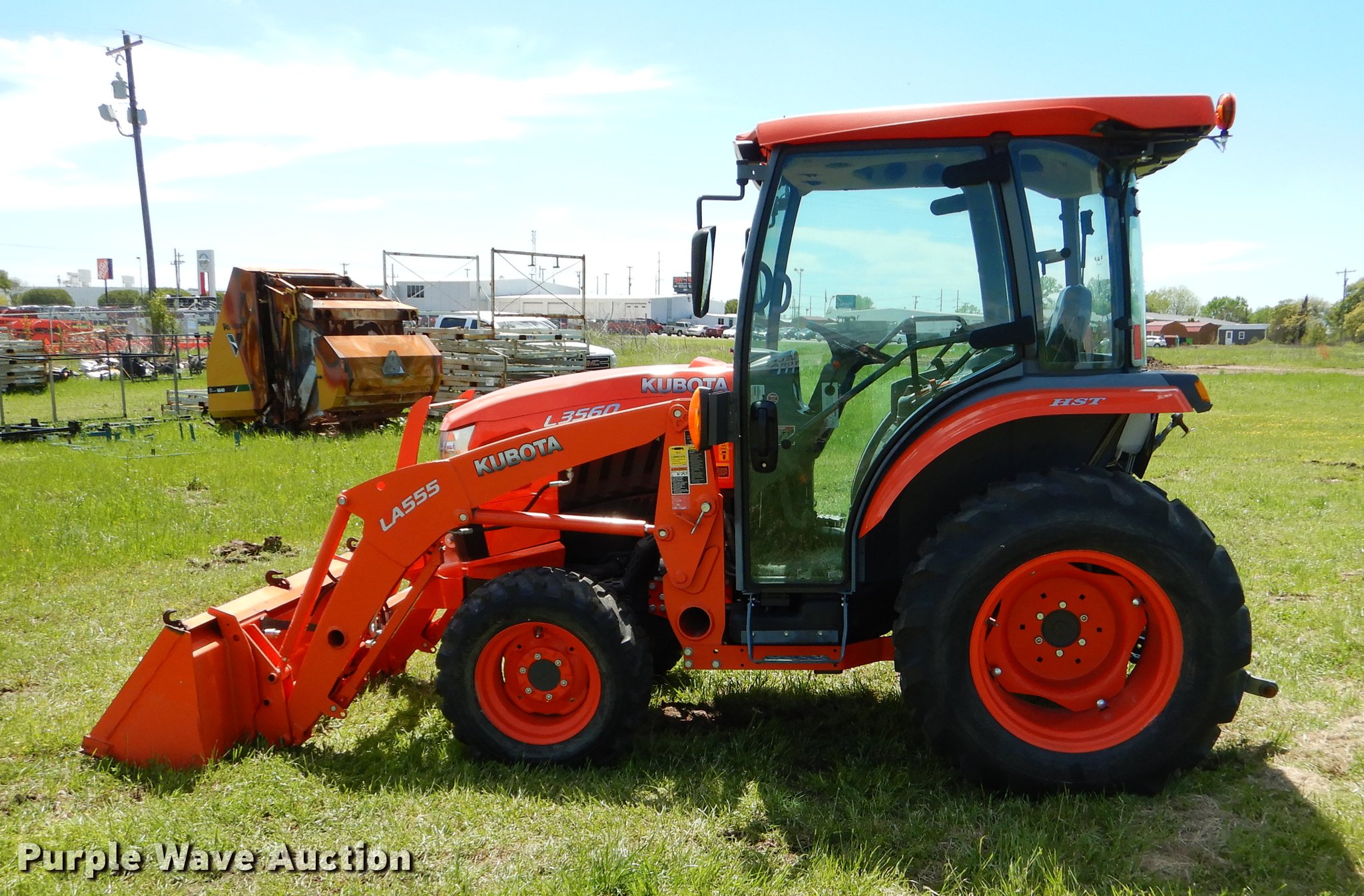 Purple Wave is selling a used Tractor in Oklahoma. This item is a 2015 Kubota L3560 HST tractor with the following: 356 hours on meter, Kubota three cylinder diesel engine, Hydrostatic transmission, 6 speeds, Left-hand reverser, Differential lock, AC and heat, AM/FM, Suspension seat, Wipers, Kubota loader, 65"W bucket, Joystick controls, Three point, 540 PTO, (2) rear hydraulic remotes, 72" wheelbase, 10-16.5 front tires, 420/70-24 rear tires, Serial 31259