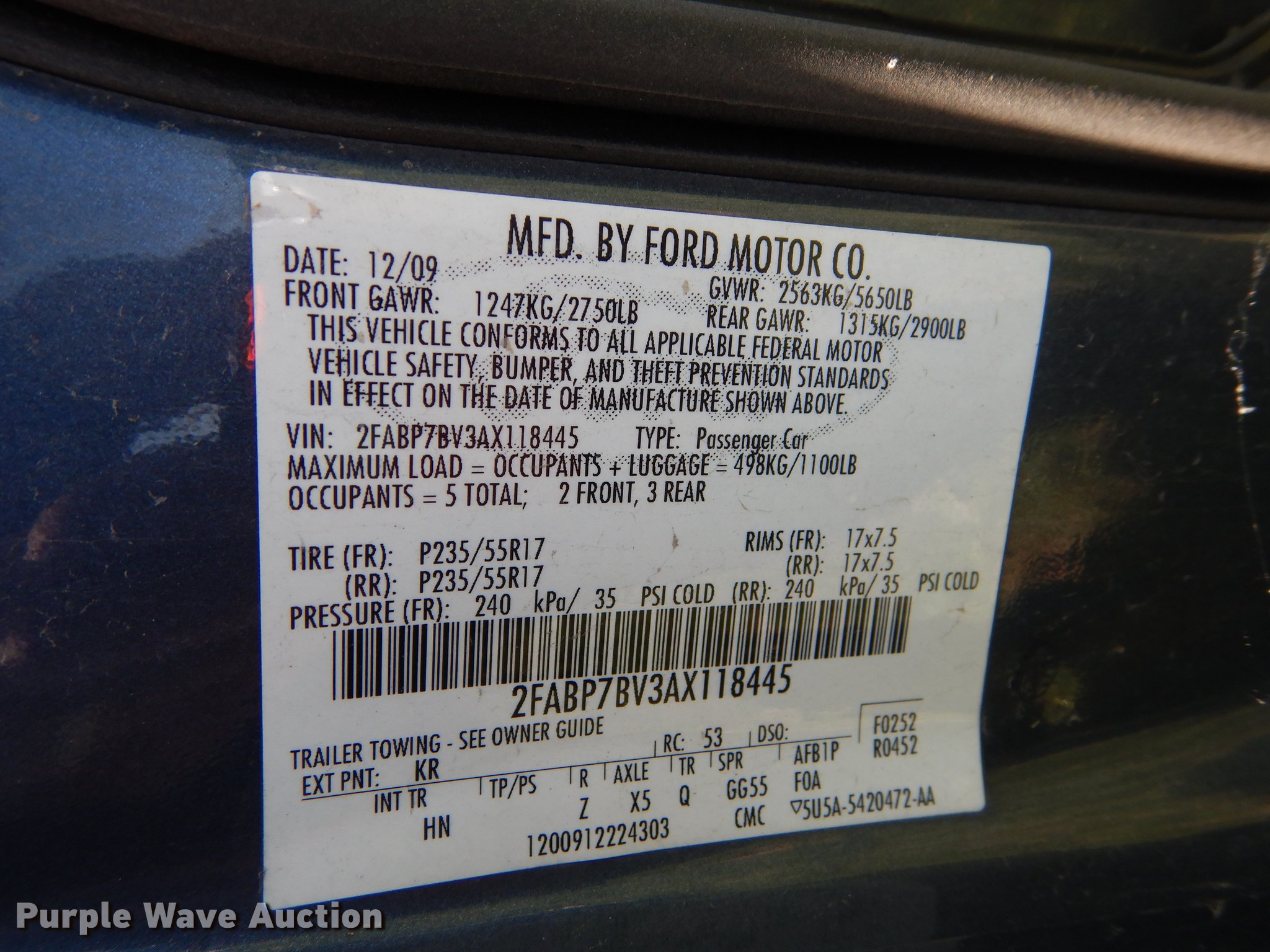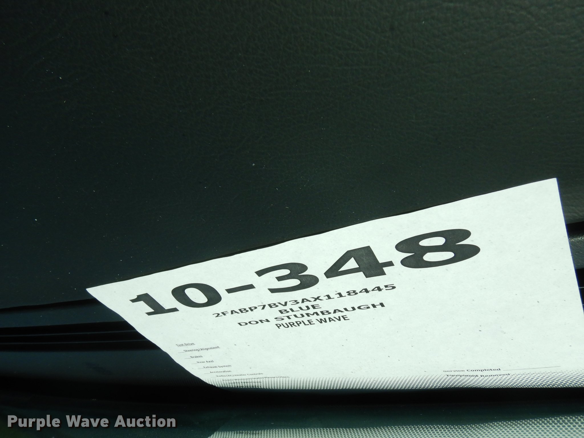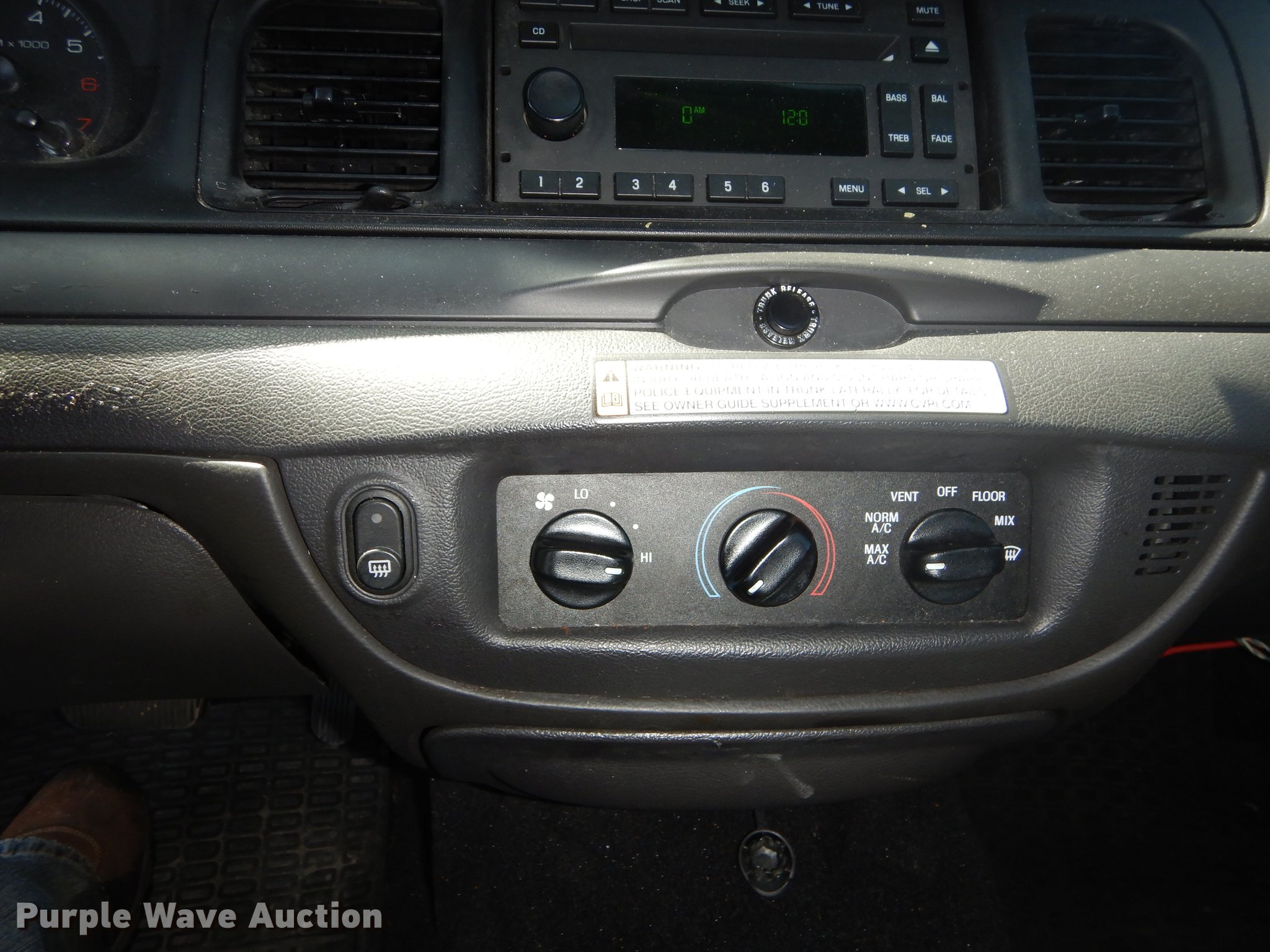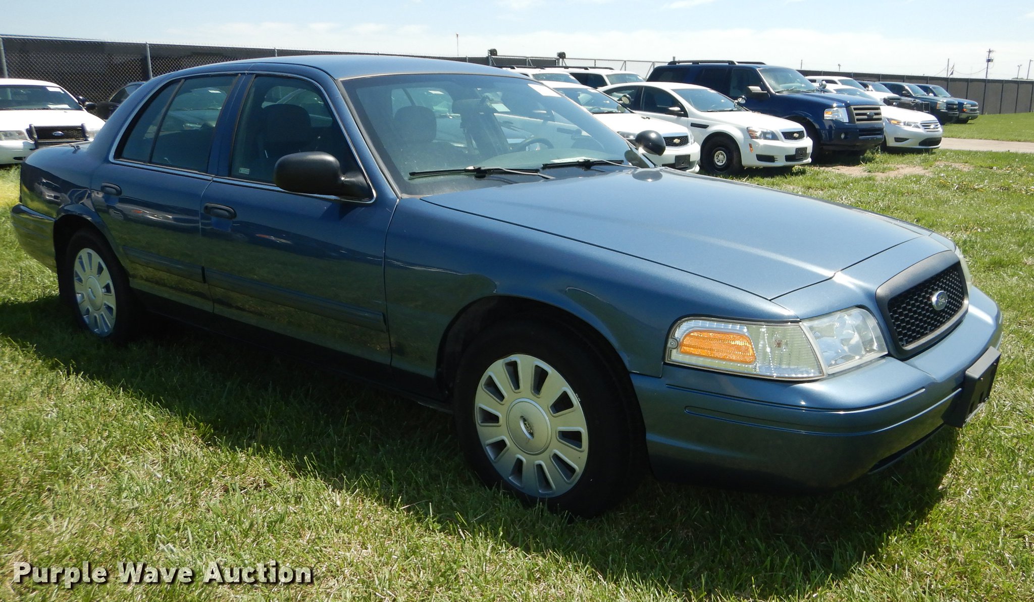 Purple Wave is selling a used Passenger Vehicle in Kansas. This item is a 2010 Ford Crown Victoria Police Interceptor with the following: Unknown miles on odometer, 4.6L V8 SOHC 16V FFV gas engine, Automatic transmission, AC and heat, Tilt, Cruise, AM/FM/CD, Power windows, locks, mirrors, and seat, Heated mirrors, Cloth interior, Spotlight, Trunk pak, Goodyear 235/55R17 tires, Dead battery, No center console, Unit# 10-348