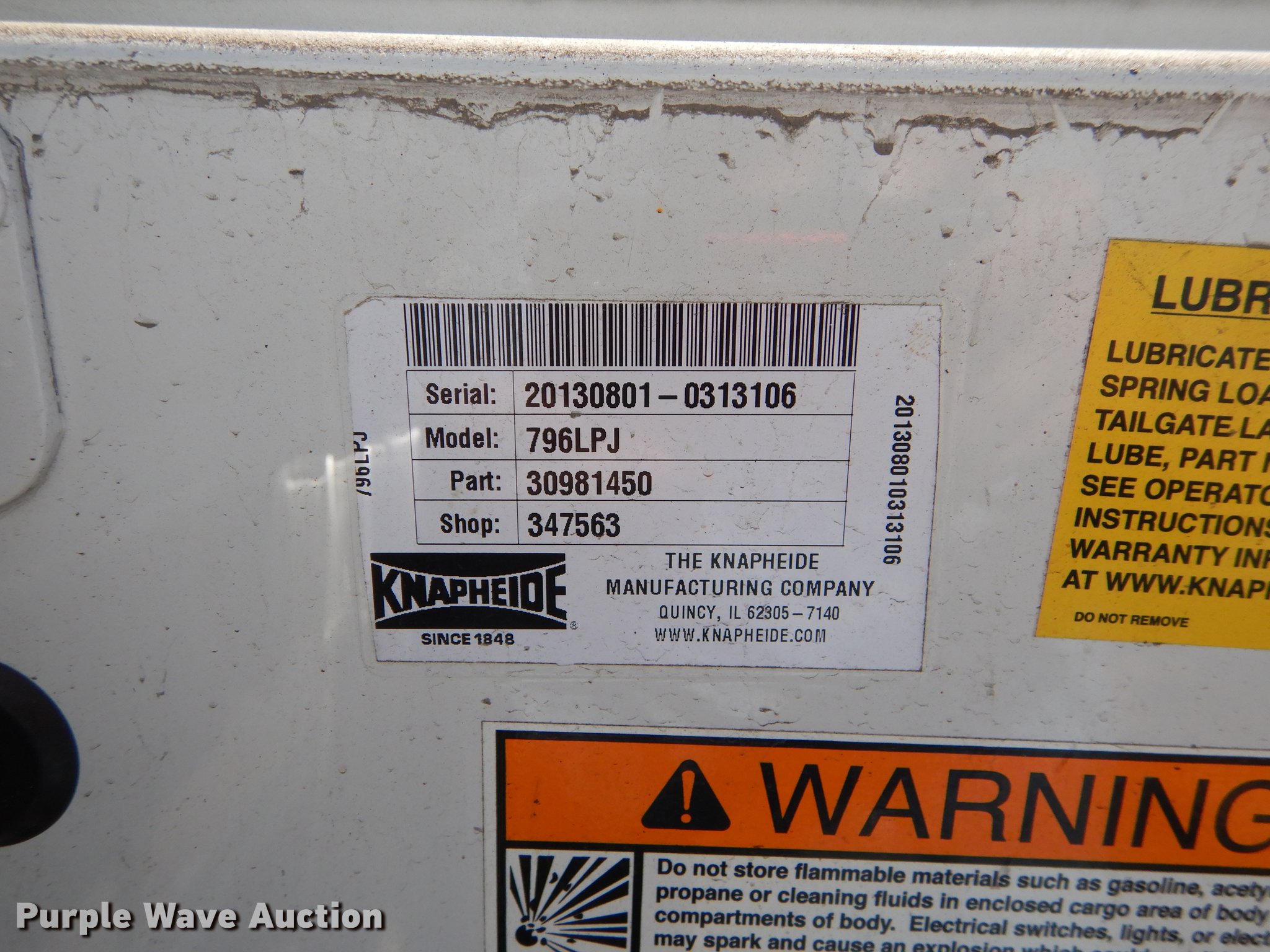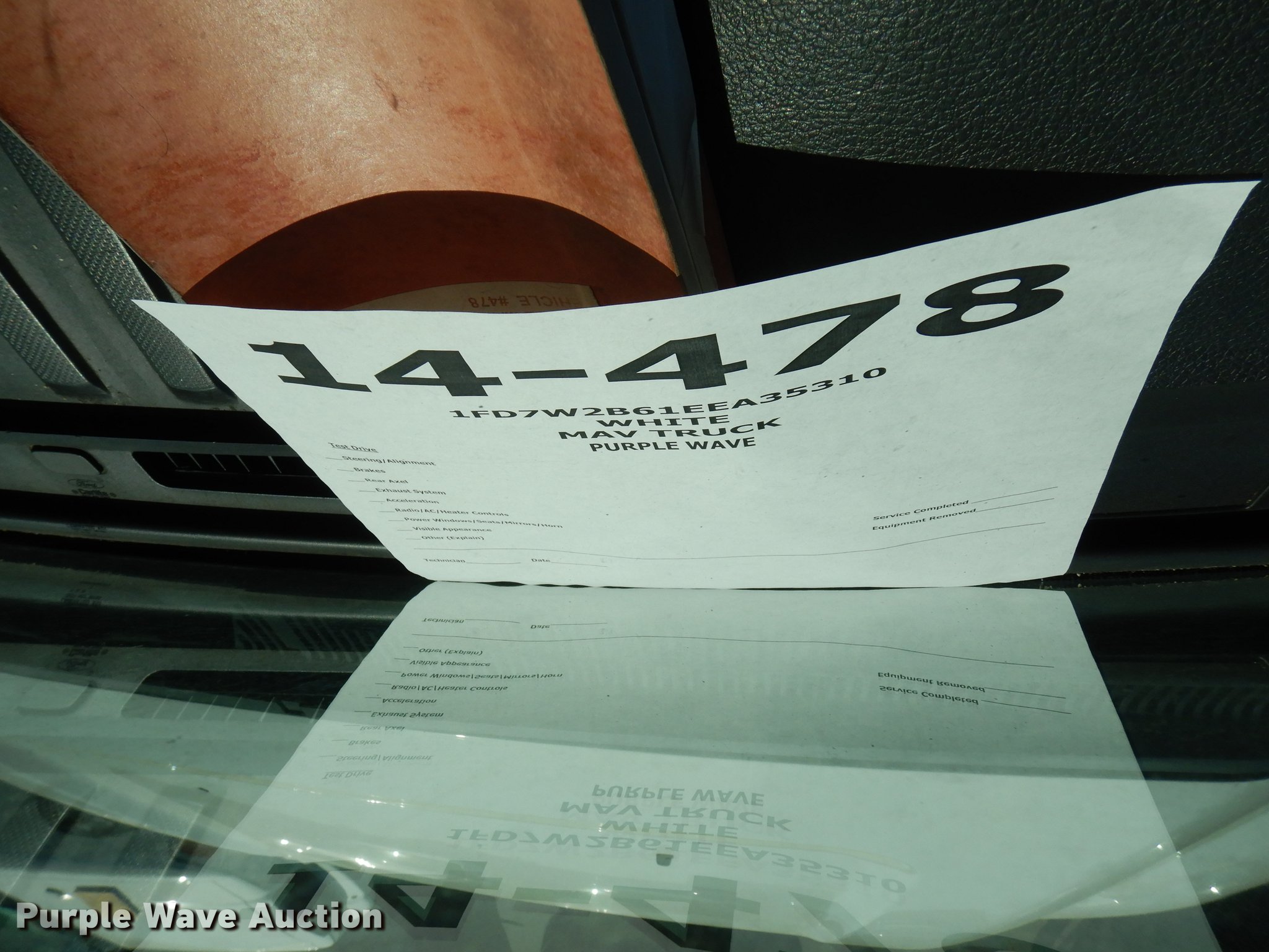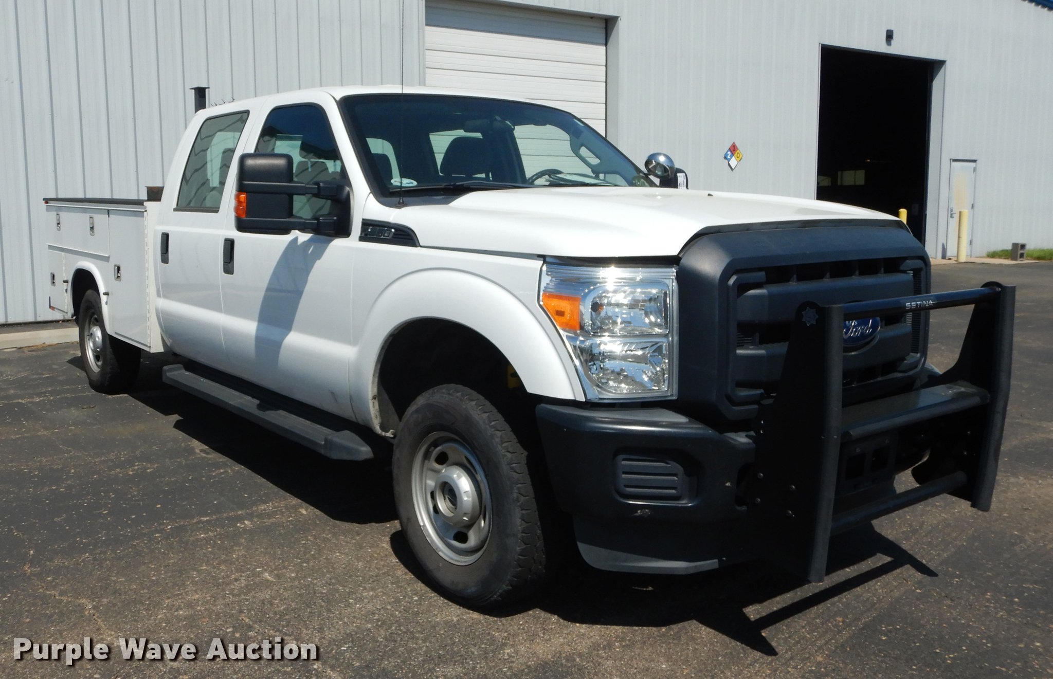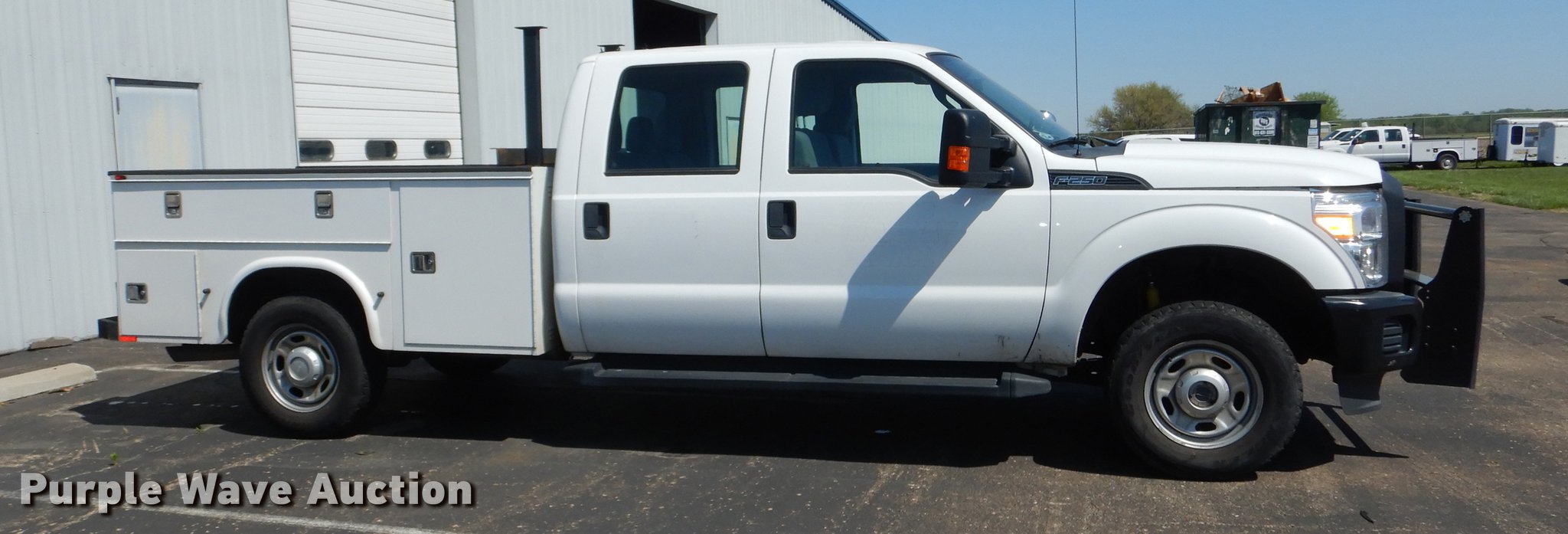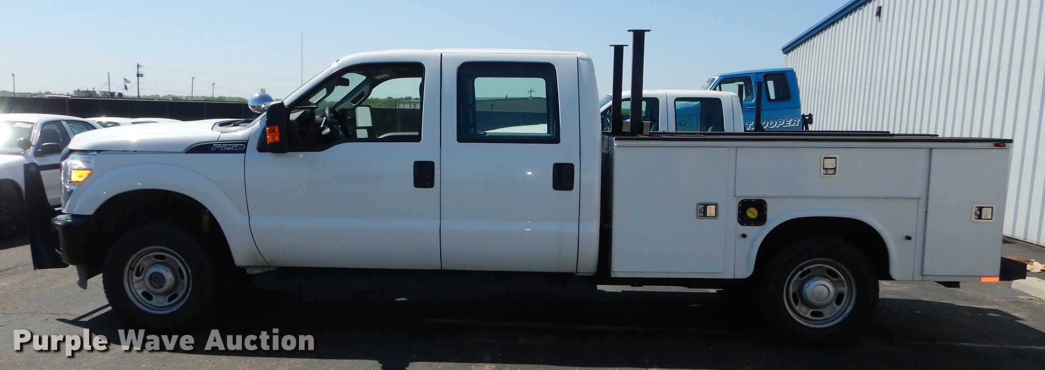 Purple Wave is selling a used 3/4 or 1 Ton Pickup or Van in Kansas. This item is a 2014 Ford F250 Super Duty Crew Cab utility bed pickup truck with the following: 201,236 miles on odometer, 6.2L V8 OHV 16V gas engine, Automatic transmission, Four wheel drive, AC and heat, Tilt, Cruise, AM/FM, Power windows, locks, and mirrors, Heated mirrors, Cloth interior, Spotlight, Front tow hooks, Running boards, Grill guard, Knapheide 796LPJ utility bed, (6) compartments, Receiver hitch, Trailer wiring, 245/75R17 tires, Unit# 14-478