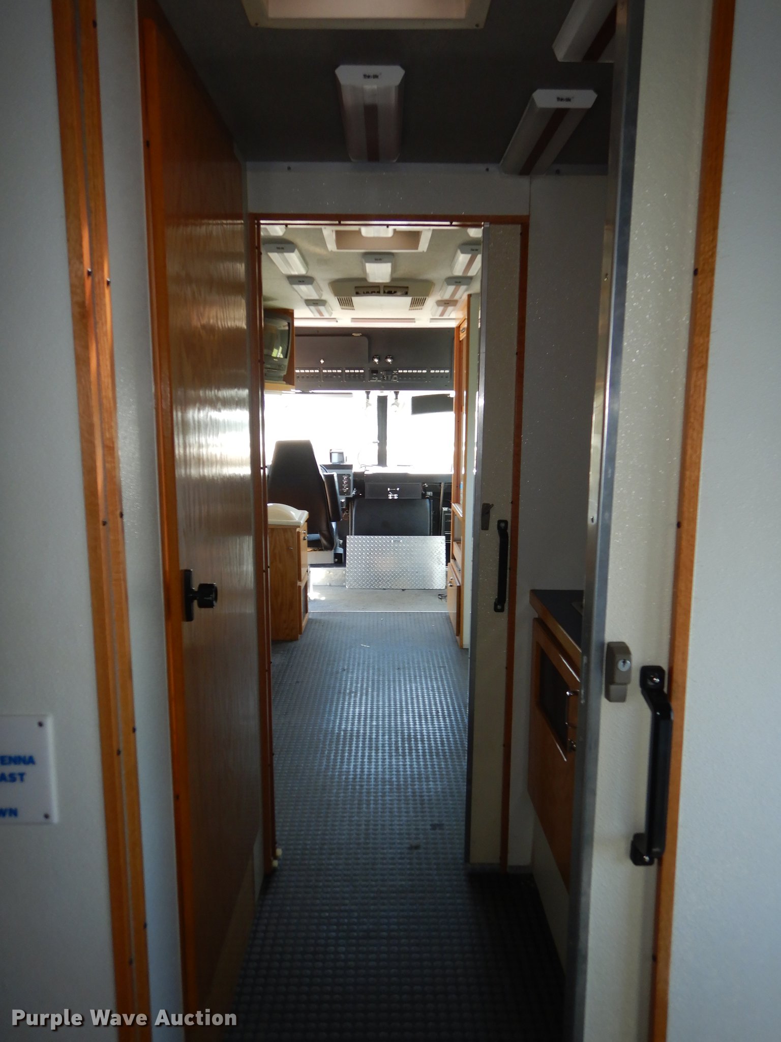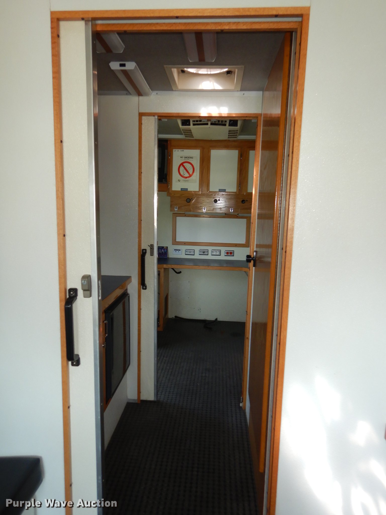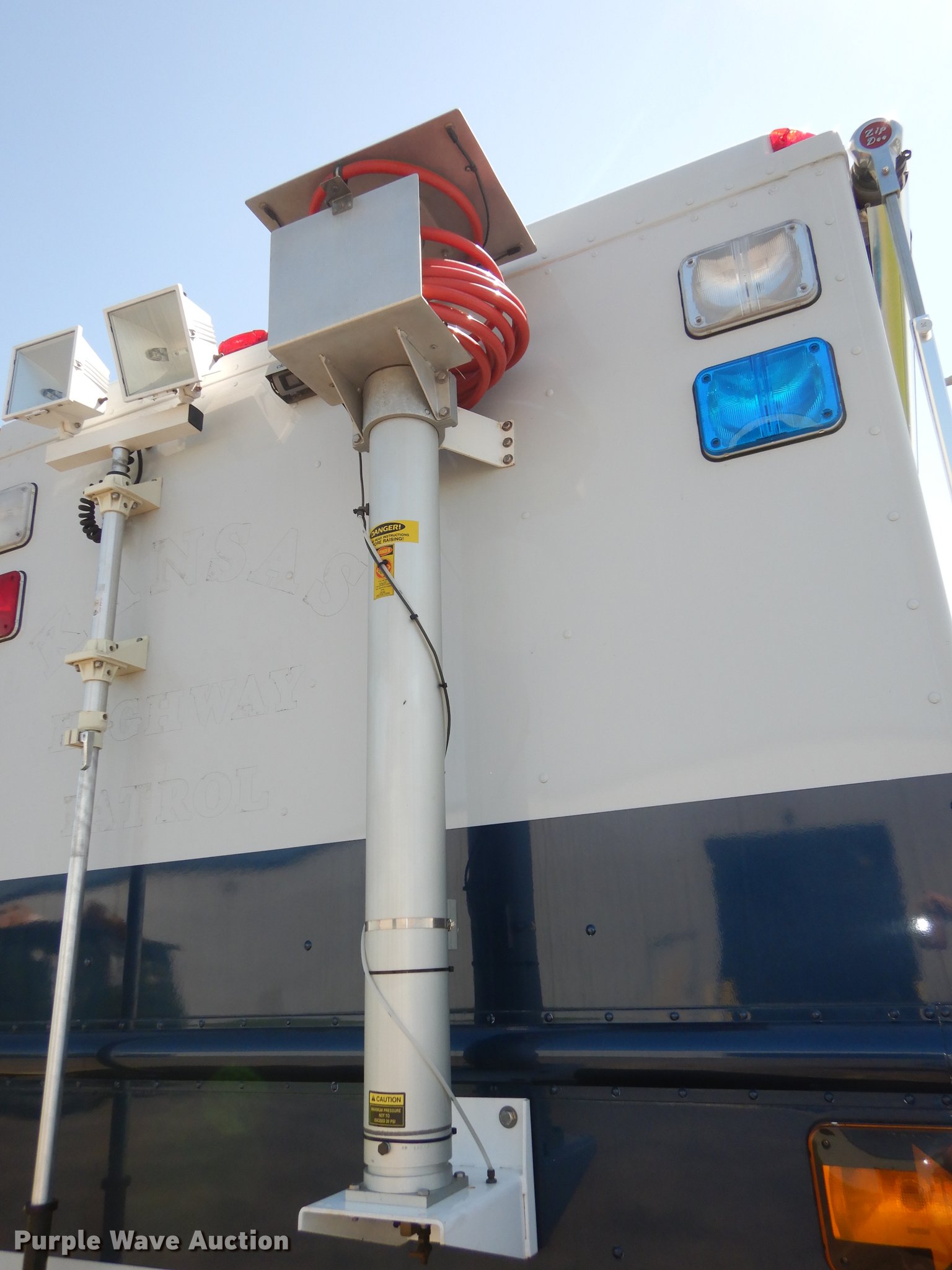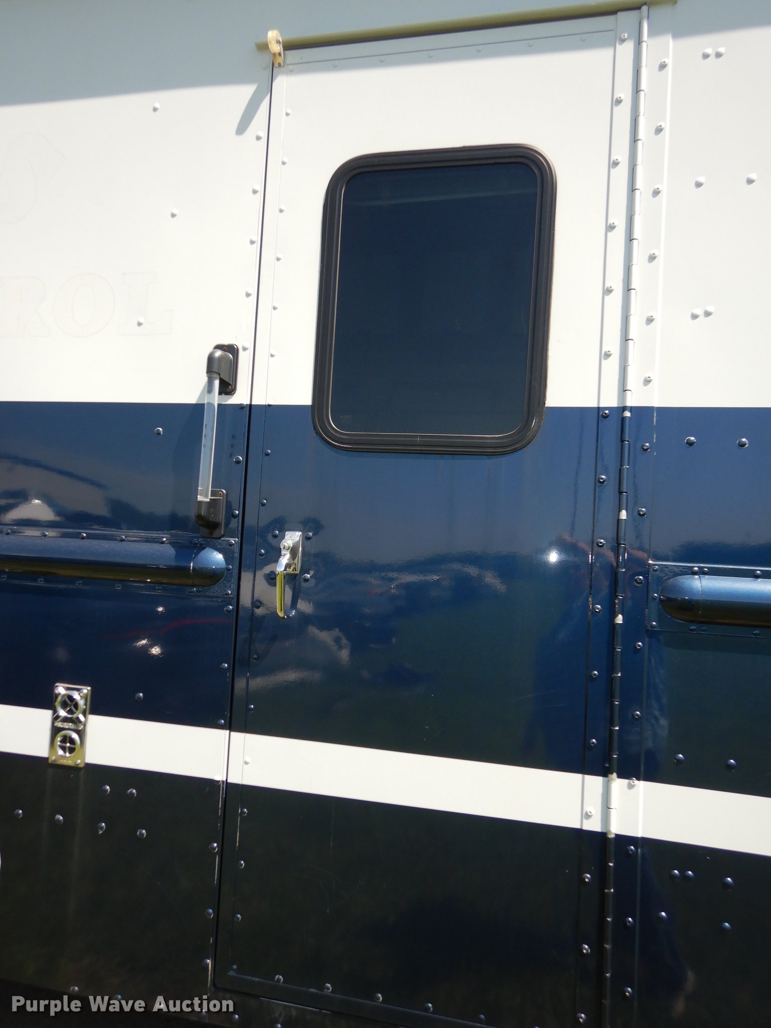 1990 Chevrolet Command Center truck. 20,284 miles on odometer, 7.0L V8 gas engine, Automatic transmission, AC and heat, AM/FM/cassette, Power and heated mirrors, Vinyl interior, Clarion backup camera, Canopy, (2) side entry doors, Work lights, Lynch emergency light display, Holley Lean/Rich indicator, (2) Panasonic 14" television/DVD, Norcold refrigerator, Sink, Toilet, (2) Coleman roof AC units, Rear AC and heat, Honda EV6010 RV liquid cooled generator, Propane hookups, Telescopic antenna, Storage compartments, Spring suspension, Hydraulic brakes, 17' wheelbase, Bridgestone 10R22.5 tires, Dead battery, Unit# 90-77. Kansas title. 1GBJ6T1E9LV111687. Kansas Highway Patrol. Topeka, KS 66616