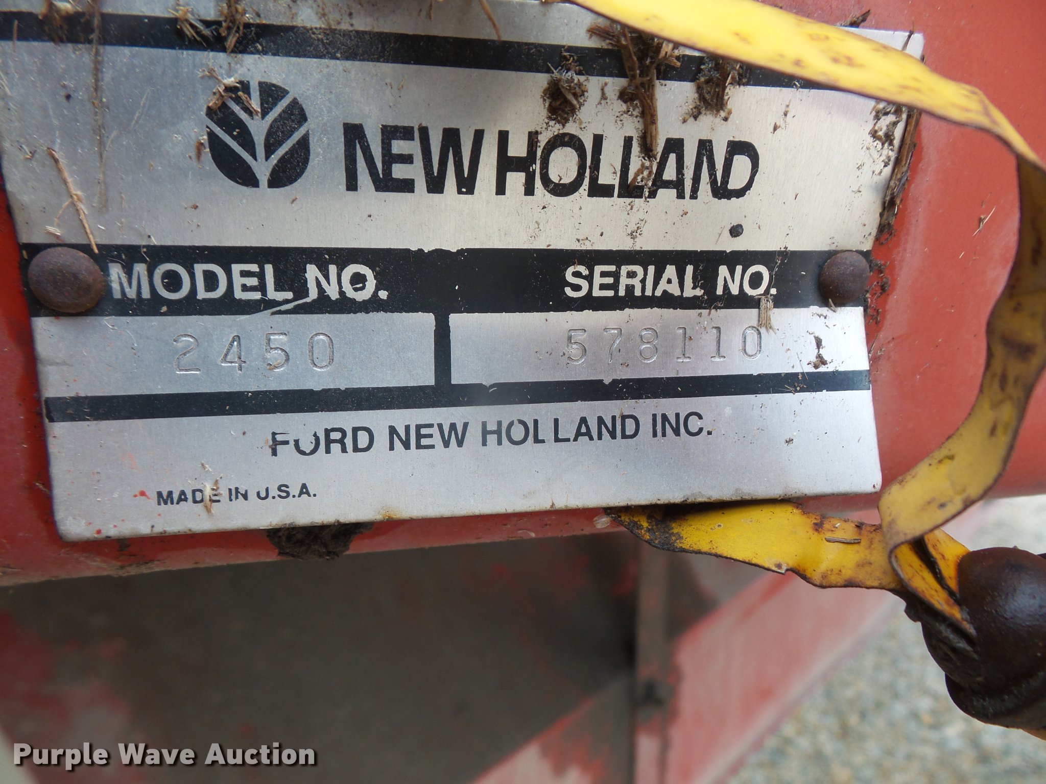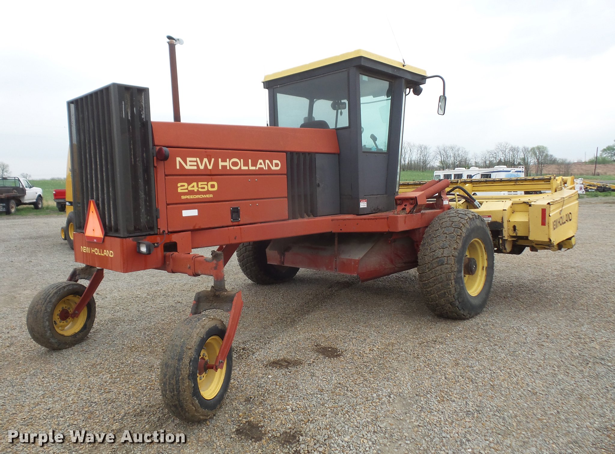 Purple Wave is selling a used Windrower Self Propelled in Kansas. This item is a 1994 New Holland 2450 windrower with the following: 2,816 hours on meter, New Holland four cylinder diesel engine, Hydrostatic transmission, AC and heat, AM/FM, Suspension seat, New Holland Haybine 2214 double sickle head, 14'W, Hydraulic head tilt, Rubber/rubber conditioners, Serial 578998, 16.0-24 front tires, 27x9.50-15 rear tires, Serial 578110