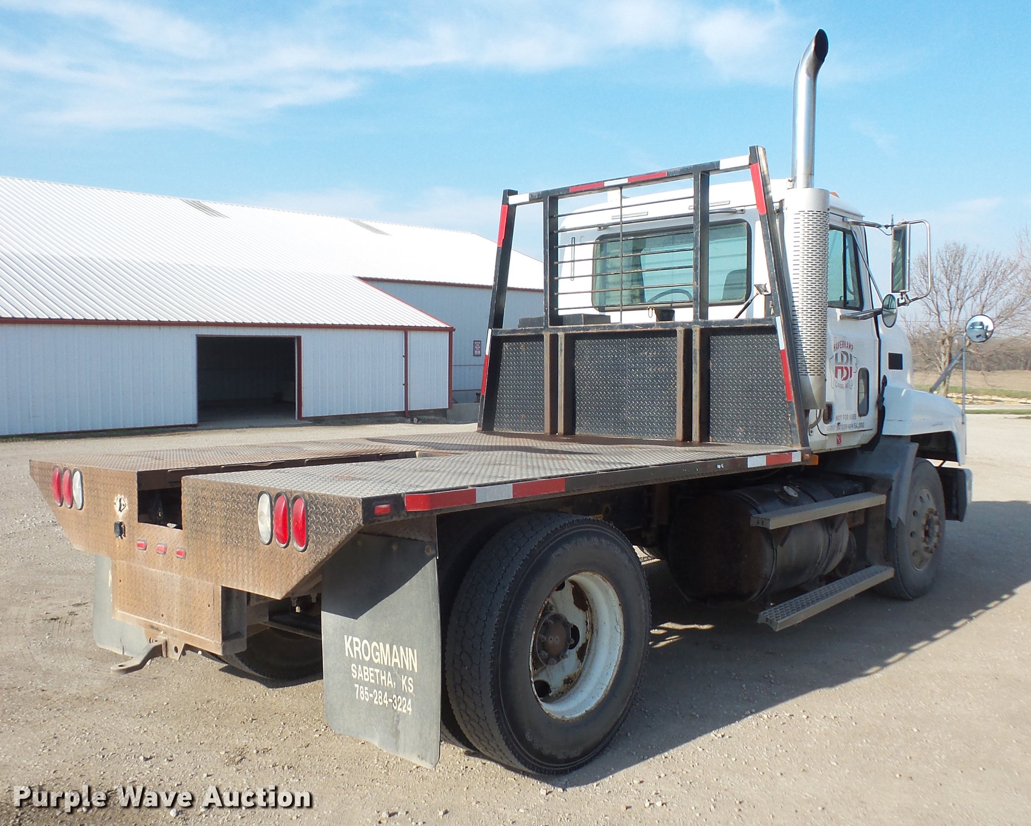 Purple Wave is selling a used Flat Bed Truck in Kansas. This item is a 2000 Mack CH612 flatbed truck with the following: 409,810 miles on odometer, Mack E7 12.0L L6 turbo diesel engine, 300 HP, Serial 0C1887, Eaton Fuller automatic transmission, Single axle, AC and heat, AM/FM, Heated mirrors, Air suspension seat, Single exhaust stack, 10'L x 102"W steel flatbed, Toolbox, Gooseneck ball, Dual fuel tanks, Receiver hitch, Air suspension, Air brakes, 11R22.5 front tires, 295/75R22.5 rear tires, GVWR 32,000 lbs