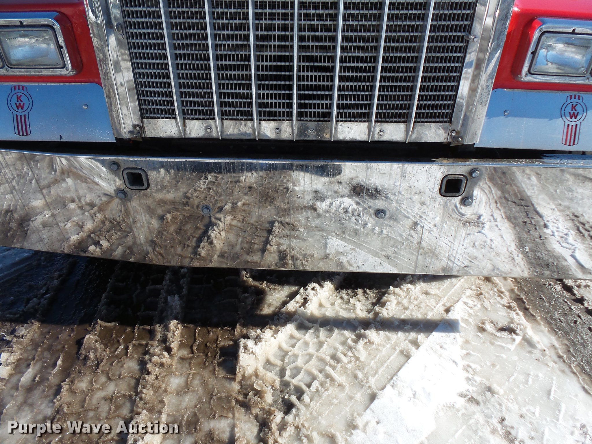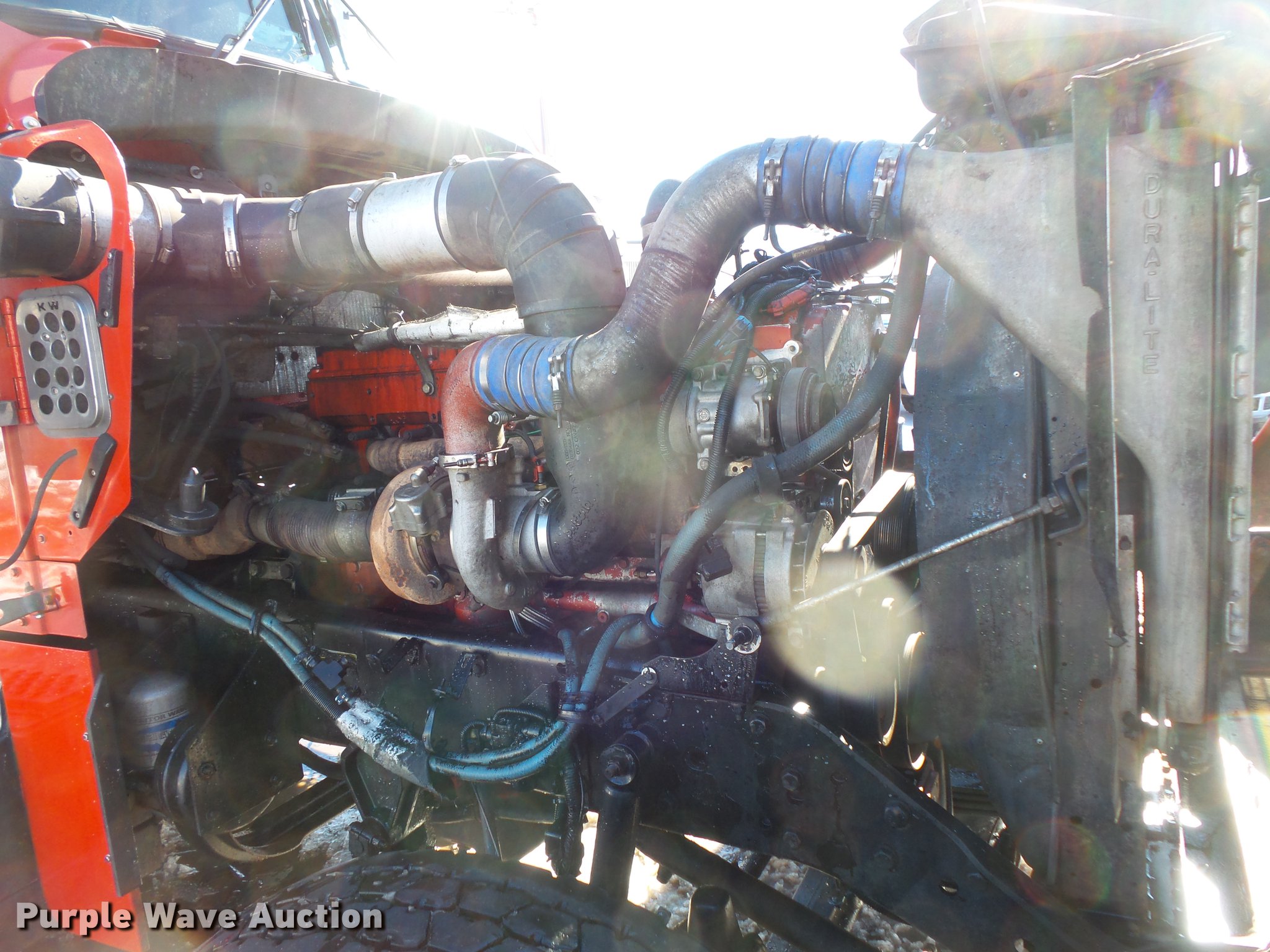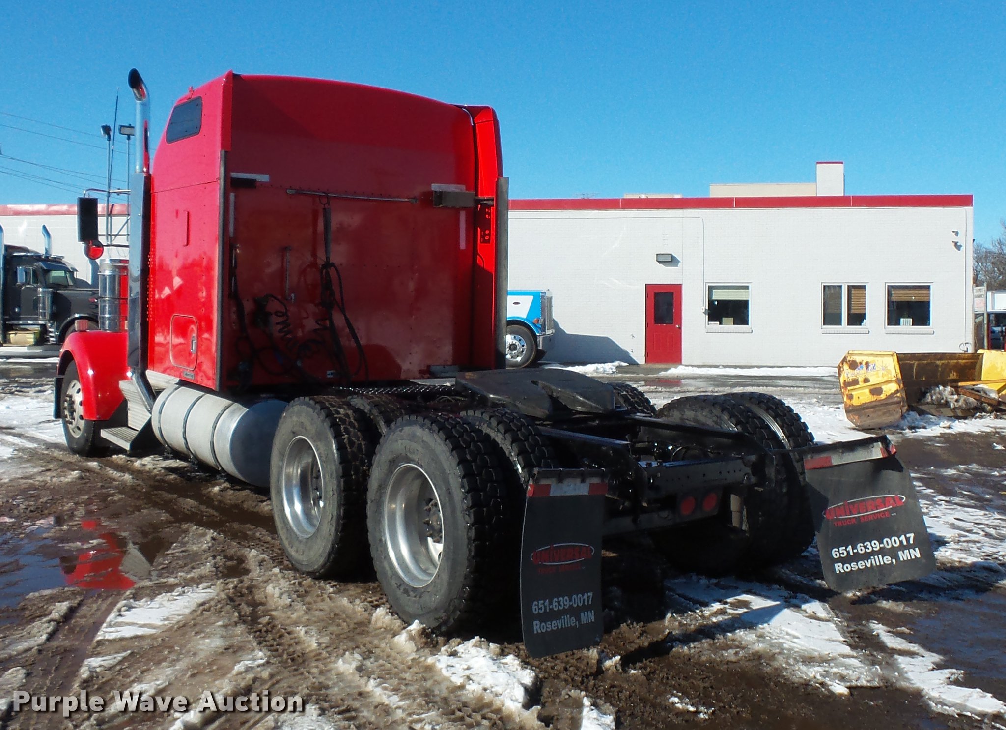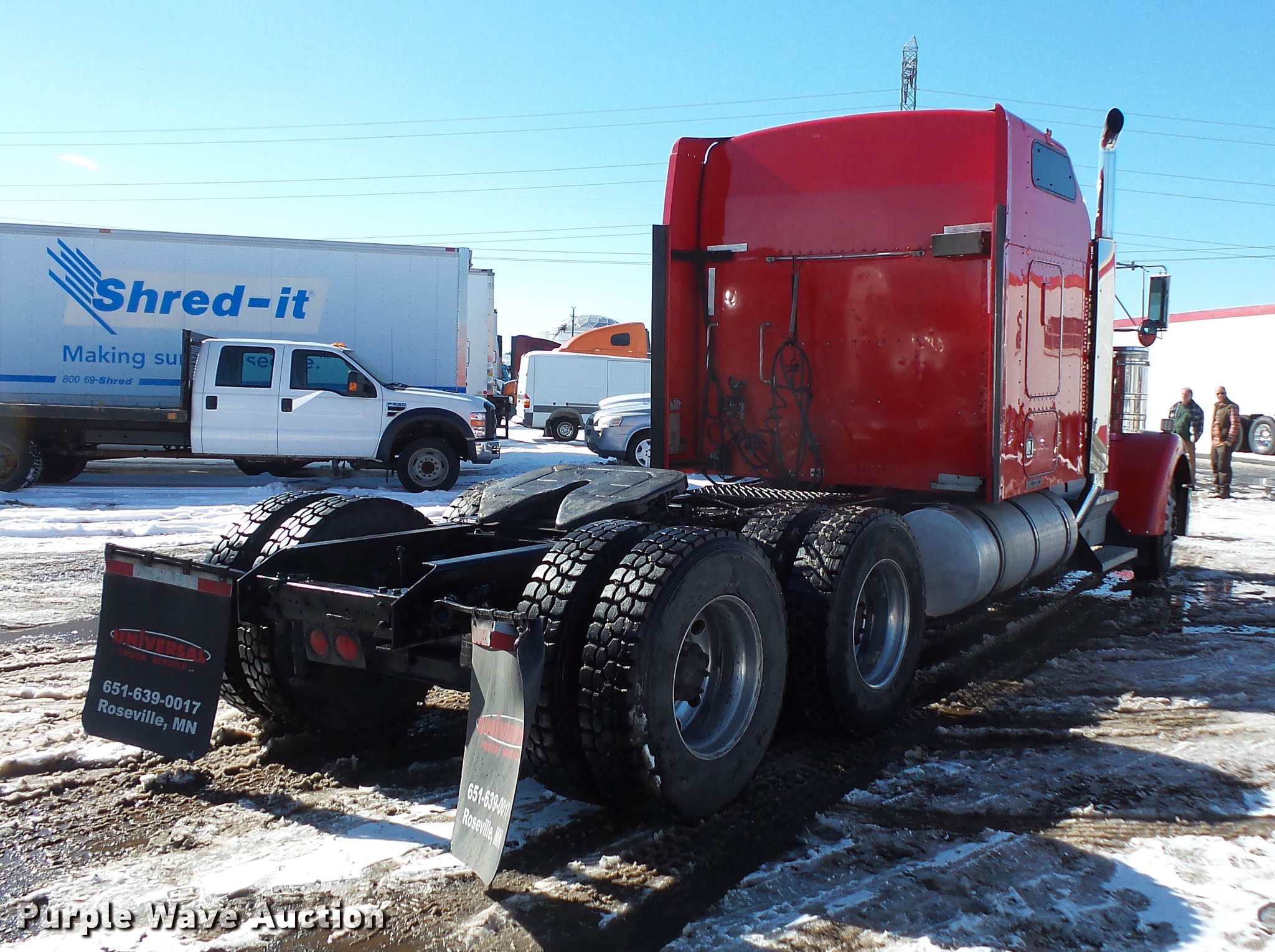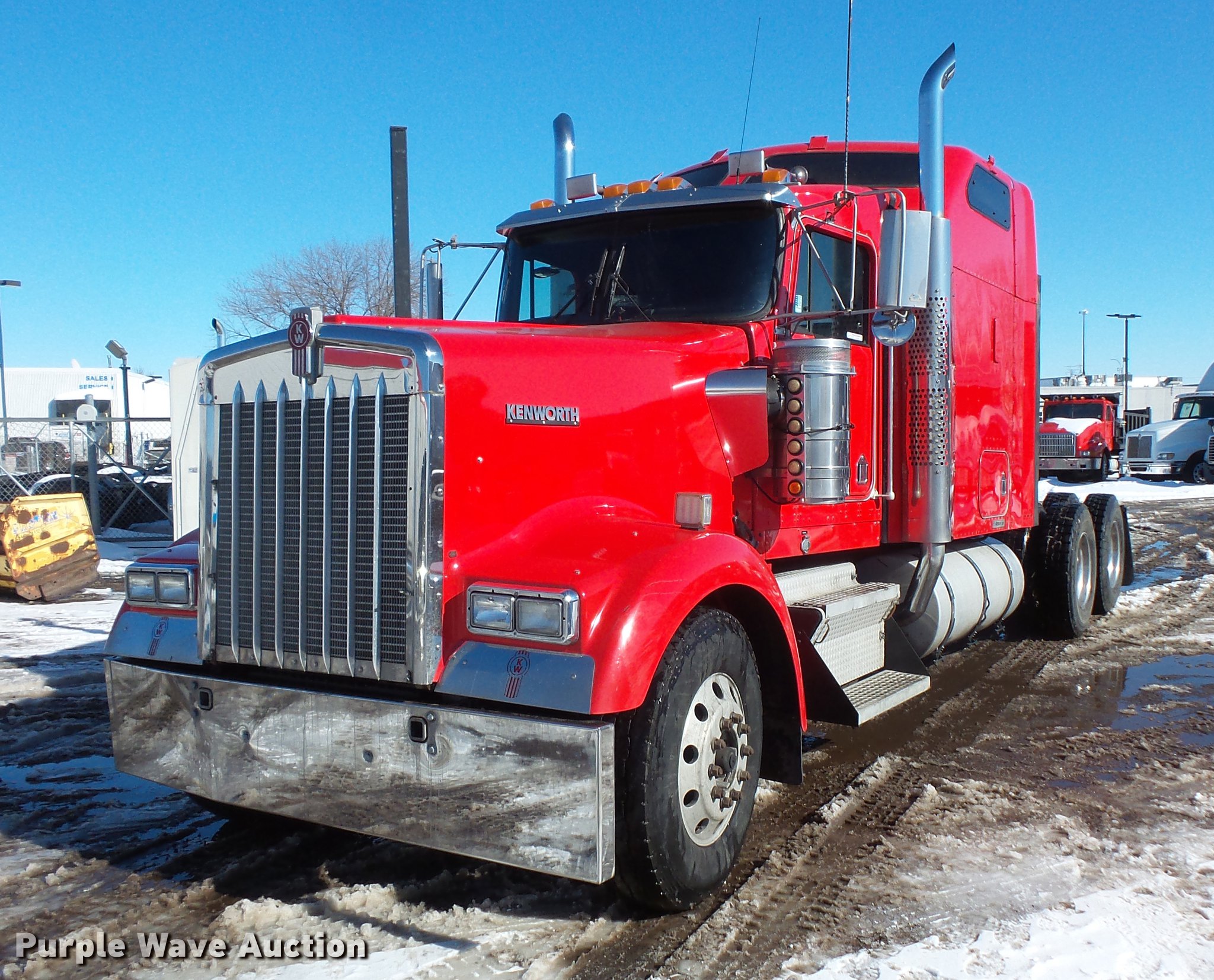 Purple Wave is selling a used Truck Tractor in Minnesota. This item is a 2005 Kenworth W900 semi truck with the following: 938,954 miles on odometer, Cummins ISX-400ST 14.9L L6 turbo diesel engine, 13 speed manual transmission, Tandem axle, Inter-axle differential lock, AC and heat, Tilt, Cruise, AM/FM/CD, Power windows and locks, Power mirrors, Air suspension seat, Air ride cab, AeroCab sleeper, Double bunk beds, Storage cabinets, Block heater, Dump valves, Exterior visor, Dual rear exhaust stacks, Steel deck plate, Air operated sliding fifth wheel plate, Dual fuel tanks, Mud flaps, Air suspension, Air brakes, Engine brake, 11R22.5 tires, GVWR 50,000 lbs