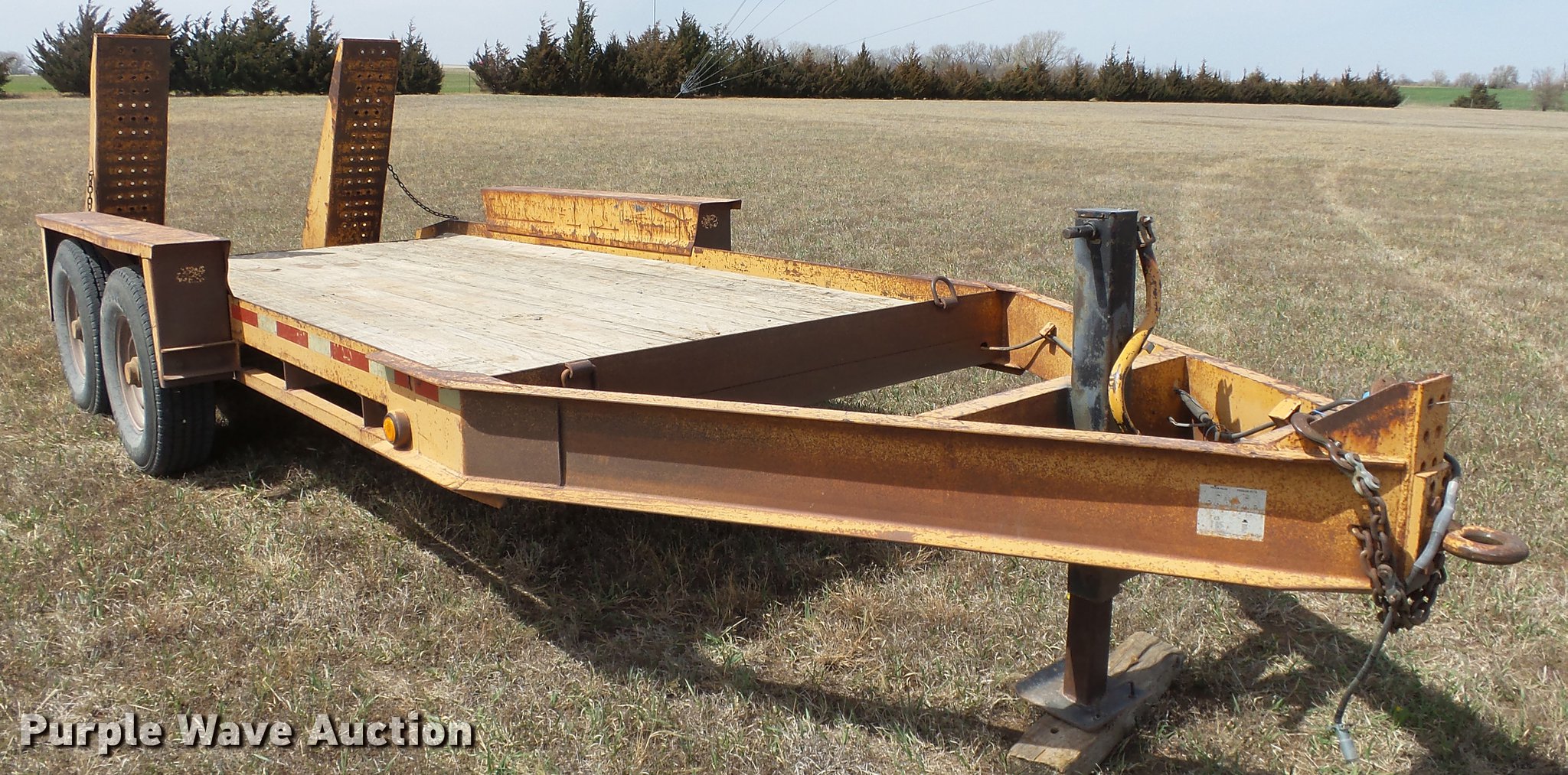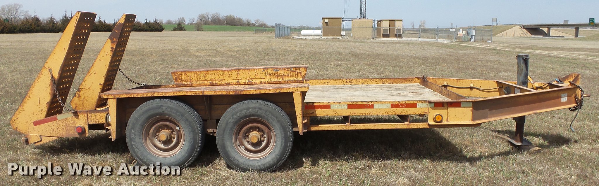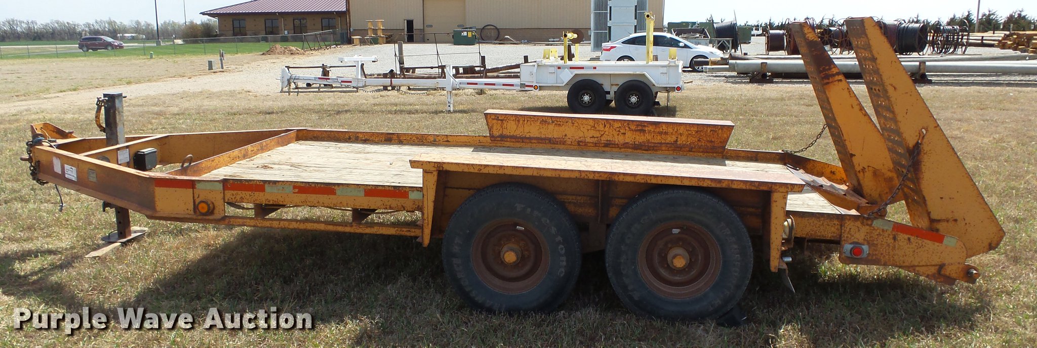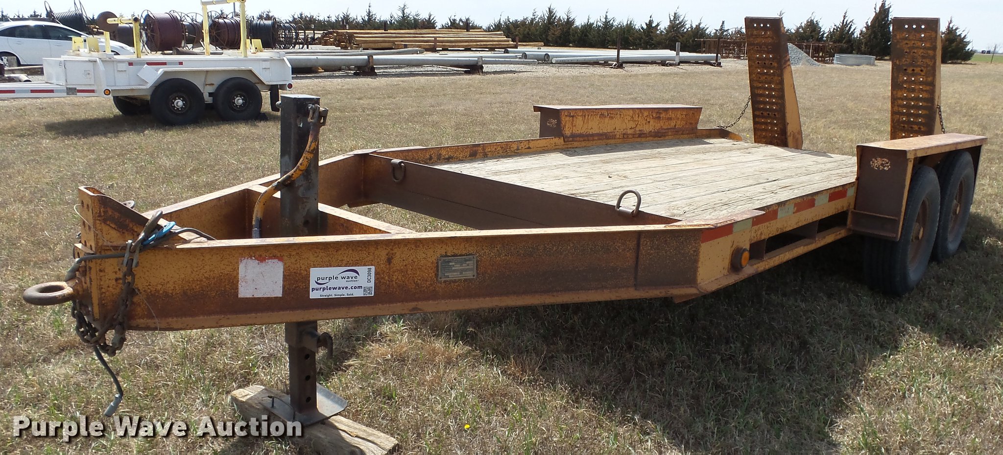 Purple Wave is selling a used Equip. Trailer in Kansas. This item is a 1999 Belshe T-1 equipment trailer with the following: 16'L x 81"W overall, 14'L wood deck, 2'L dovetail, 5'L x 13"W ramps, D-ring tie downs, Pintle hitch, Single leg landing gear, Trailer wiring, Spring suspension, Electric brakes, Tandem axle, LT235/85R16 tires, GVWR 12,000 lbs