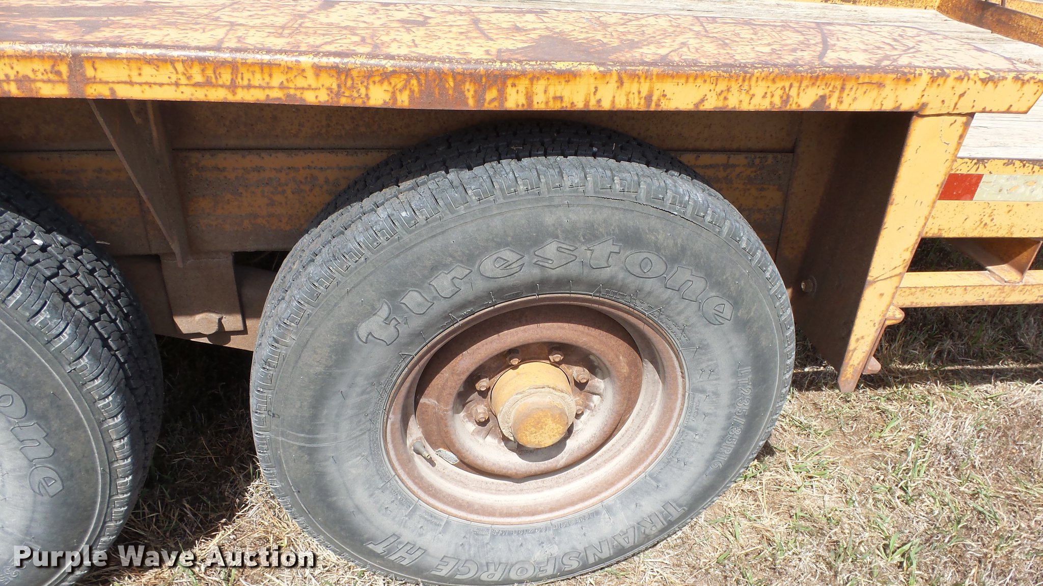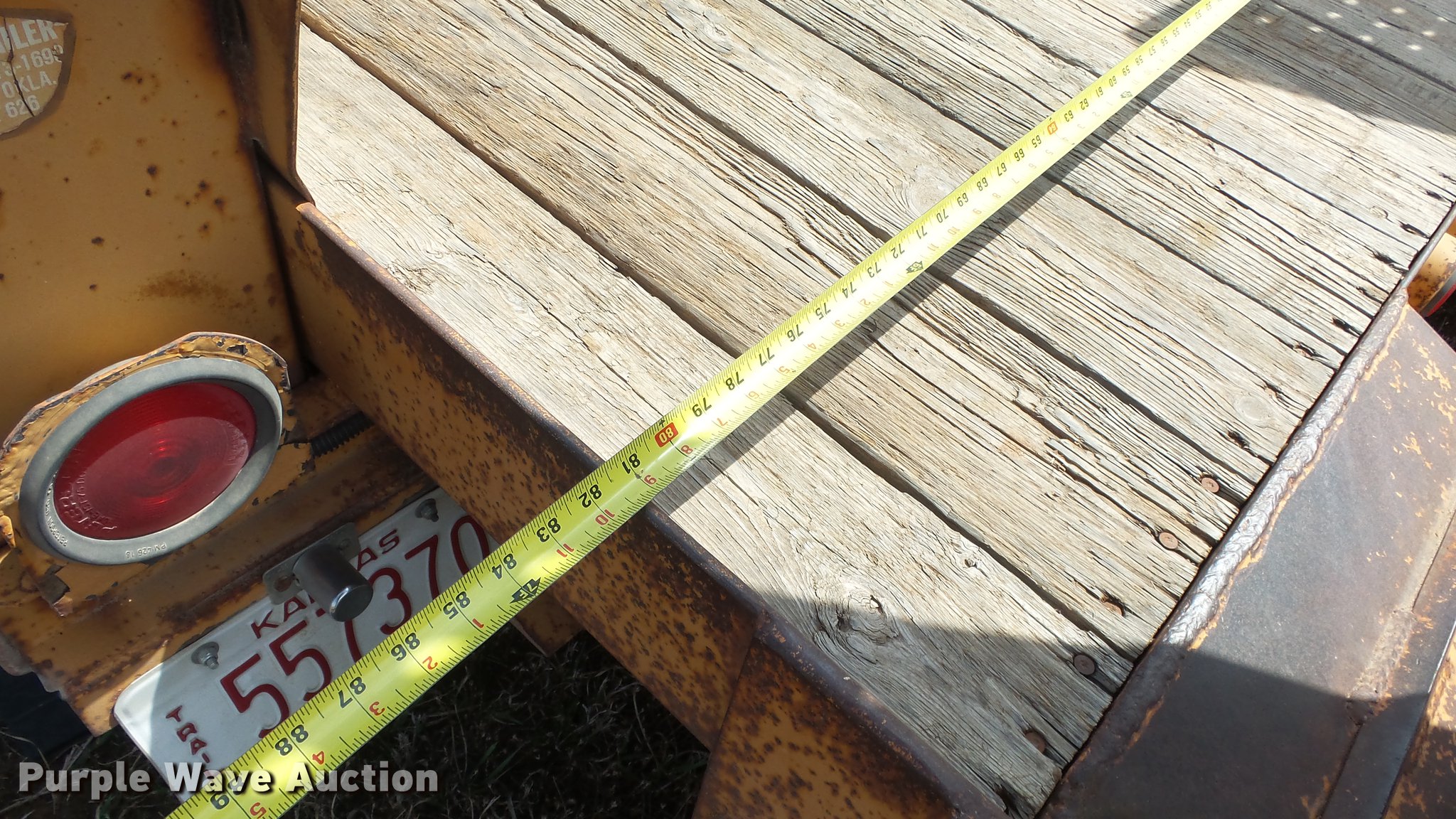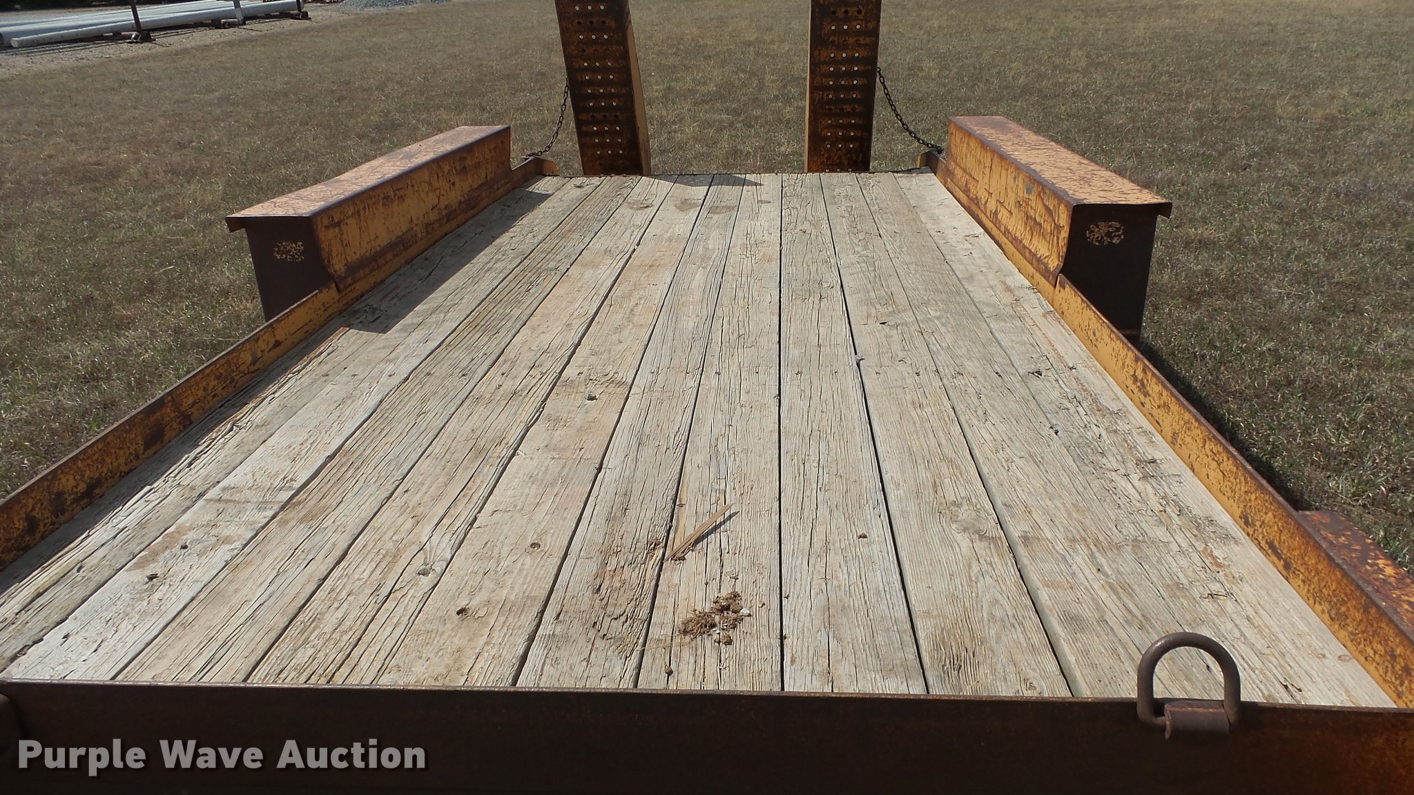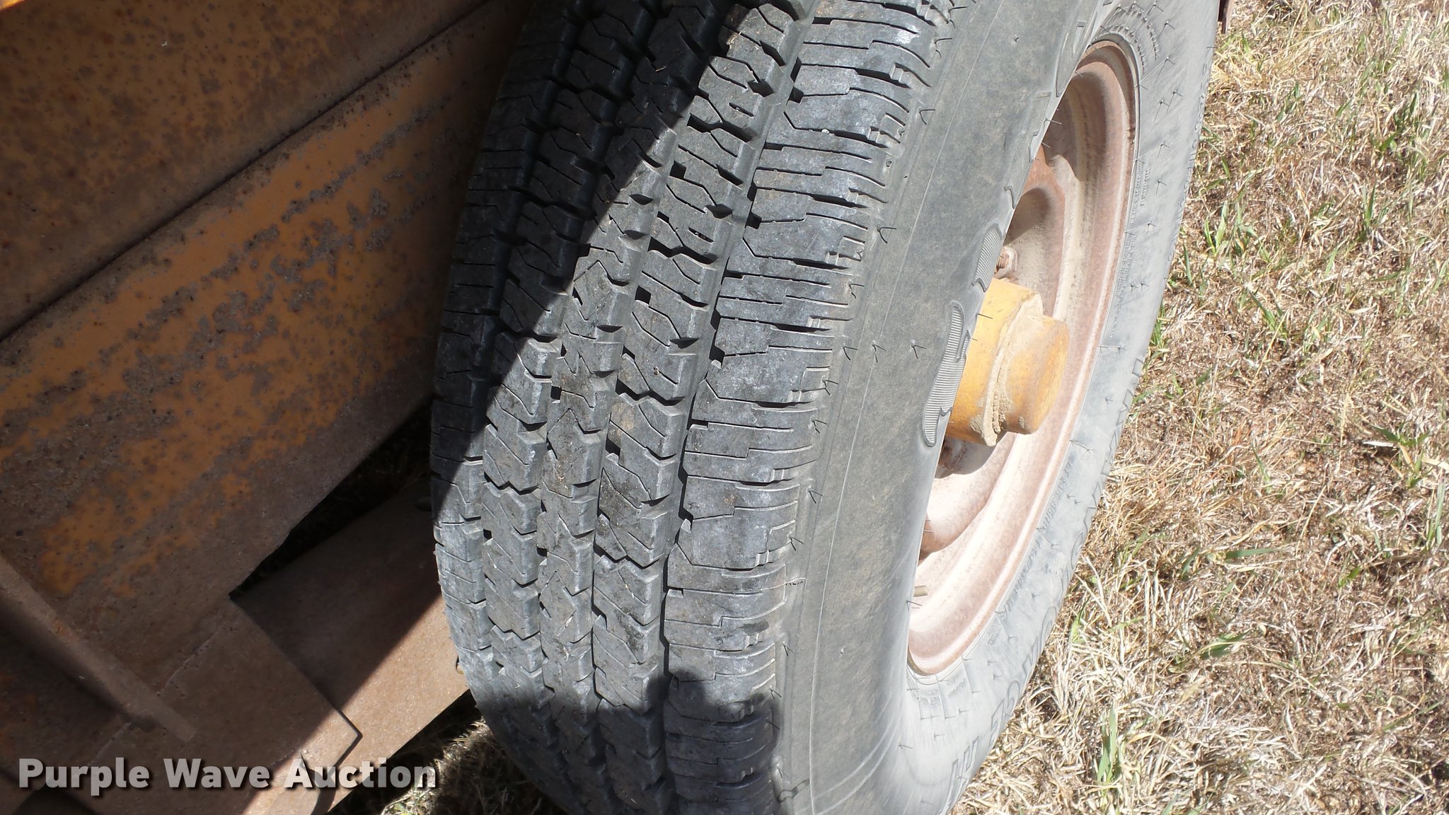 Purple Wave is selling a used Equip. Trailer in Kansas. This item is a 1999 Belshe T-1 equipment trailer with the following: 16'L x 81"W overall, 14'L wood deck, 2'L dovetail, 5'L x 13"W ramps, D-ring tie downs, Pintle hitch, Single leg landing gear, Trailer wiring, Spring suspension, Electric brakes, Tandem axle, LT235/85R16 tires, GVWR 12,000 lbs