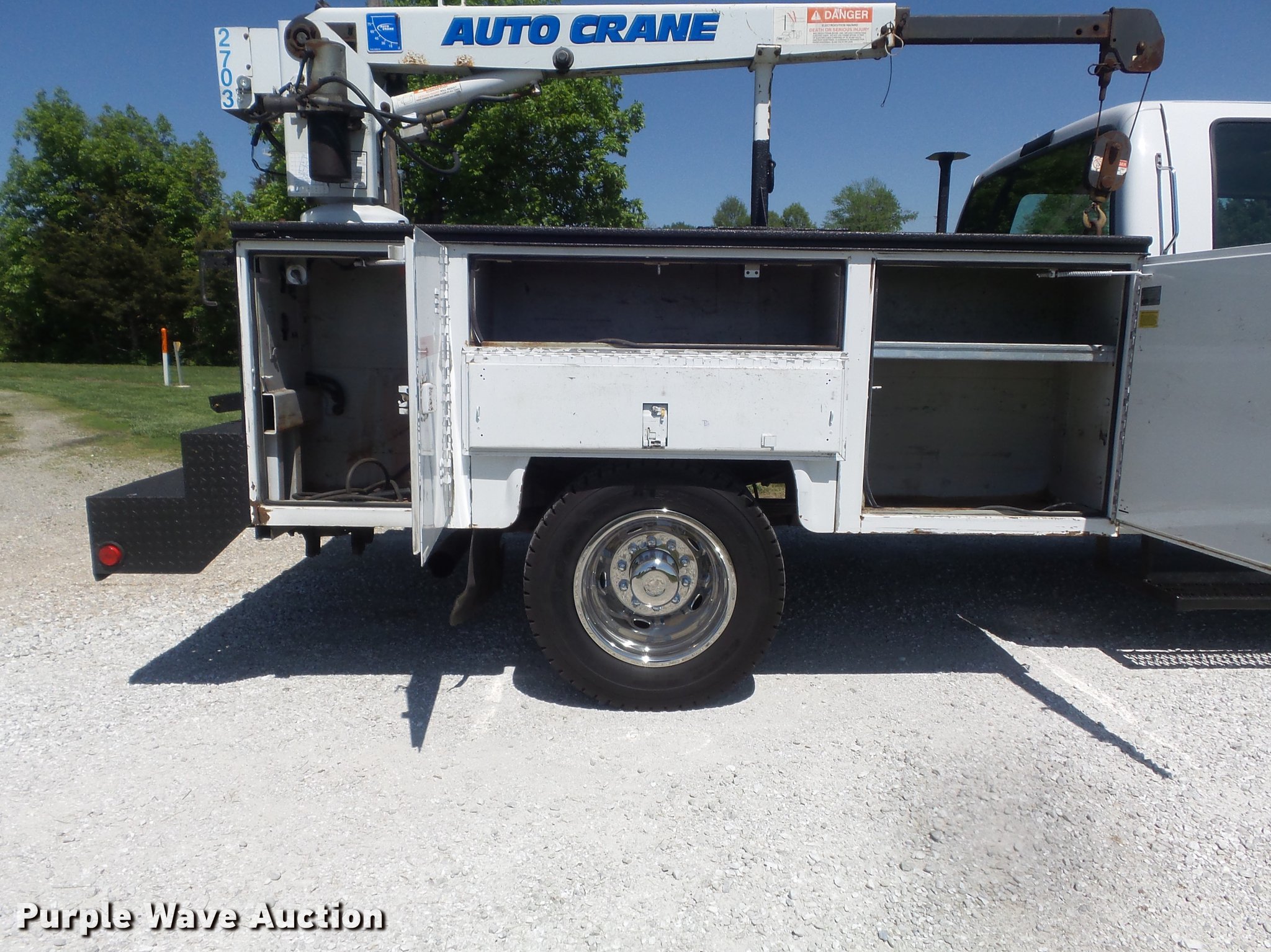 Purple Wave is selling a used Service Truck in Missouri. This item is a 2005 Ford F550 Super Duty XL Crew Cab utility truck with crane with the following: 199,932 miles on odometer, 9,715 hours on meter, 6.0L V8 OHV 32V turbo diesel engine, Automatic transmission, Four wheel drive, Single axle, AC and heat, Cruise, AM/FM/CD, Power windows, locks, and mirrors, Auxiliary controls, Backup alarm, Running boards, Block heater, PTO, Knapheide 6108D54LPJ utility bed, Shelving, Auto Crane 2703PR crane, 14' boom length, 2,700 lbs max lift capacity, Remote control, Unknown operating condition, Front and rear hydraulic cylinders for hydraulic train wheels, Single fuel tank, Receiver hitch, Trailer wiring, Spring suspension, Hydraulic brakes, 176" wheelbase, 245/70R19.5 tires, GVWR 17,950 lbs, Chipped windshield
