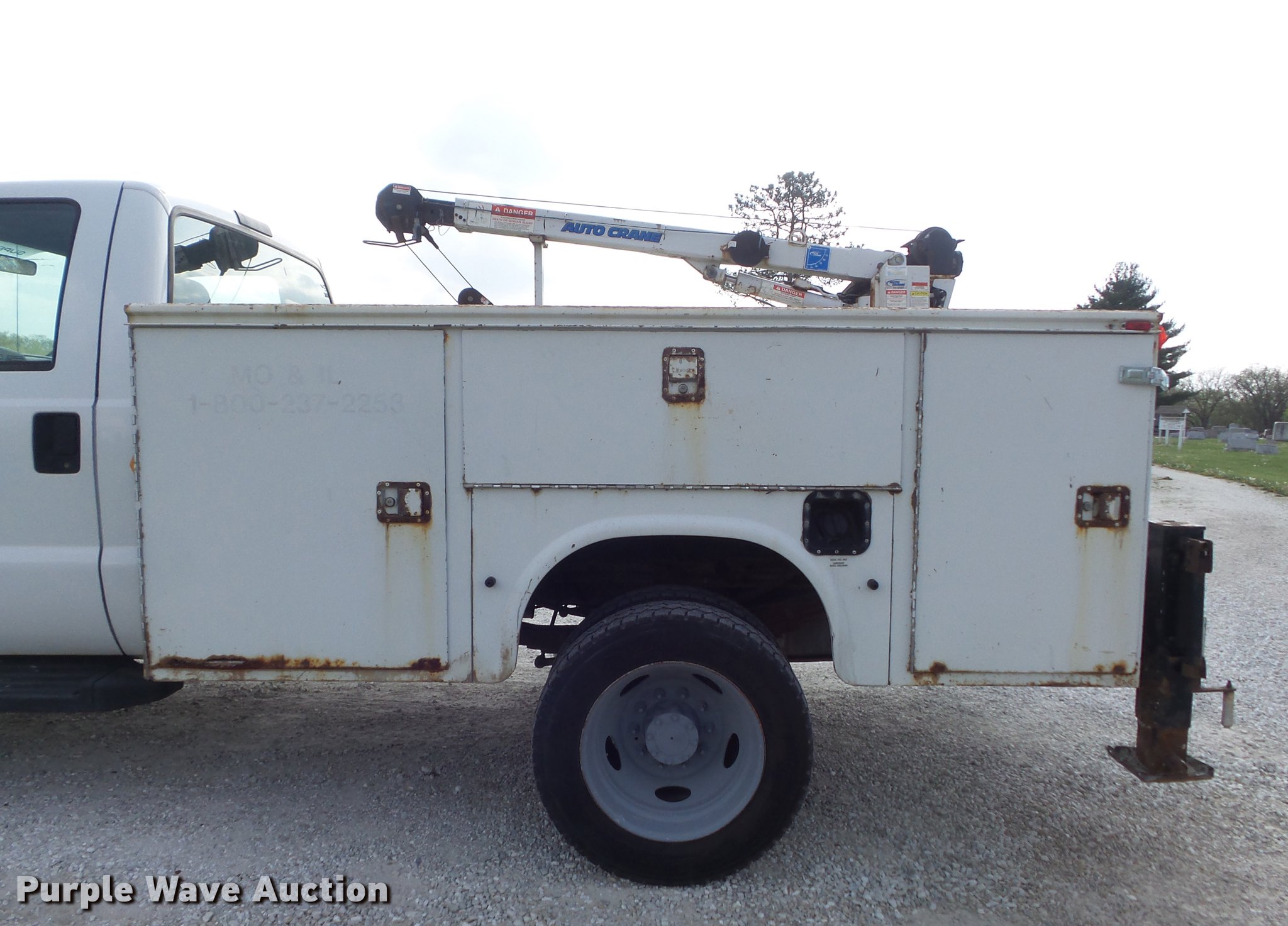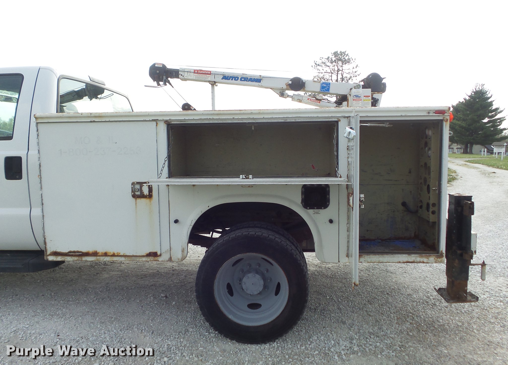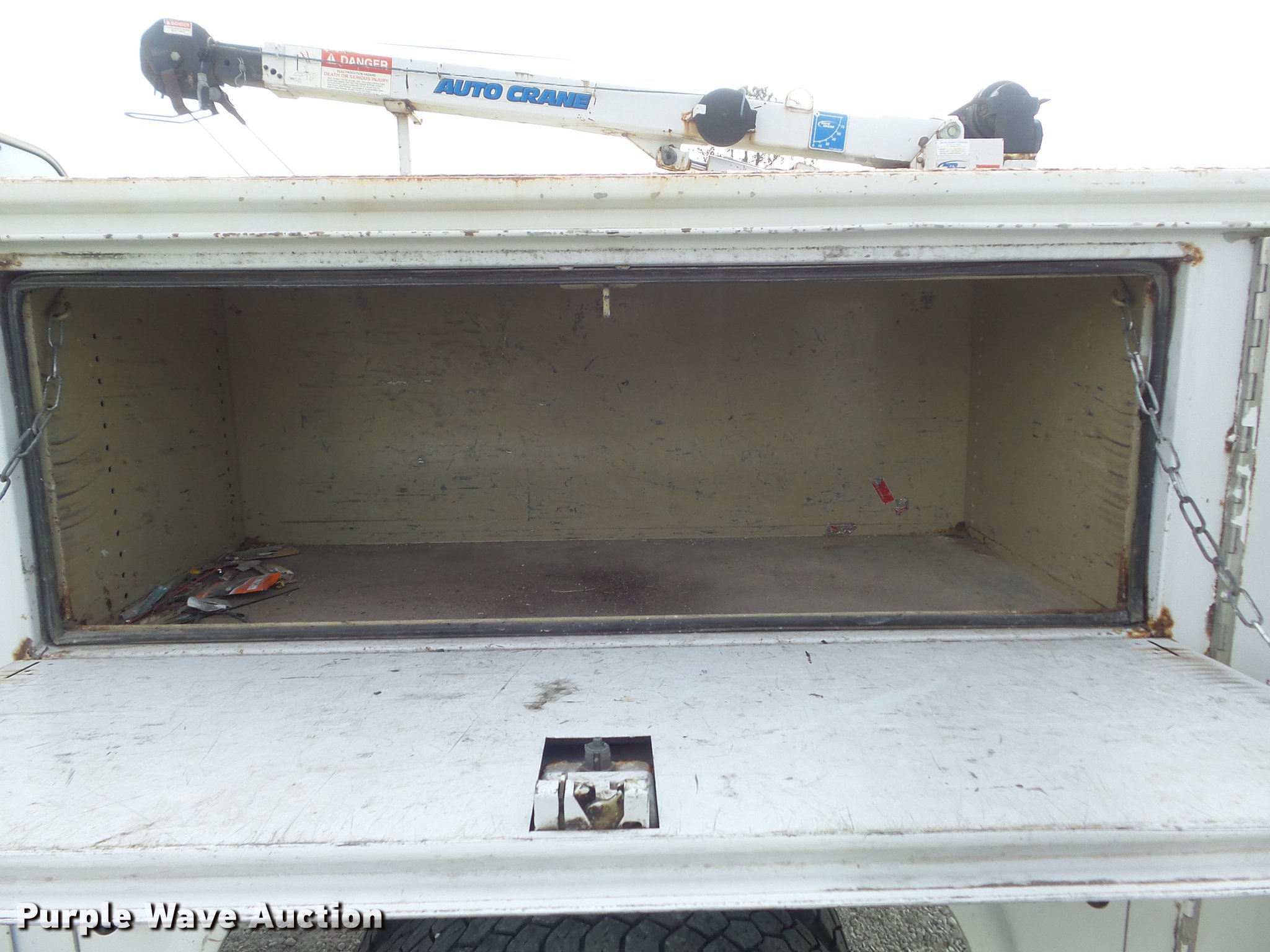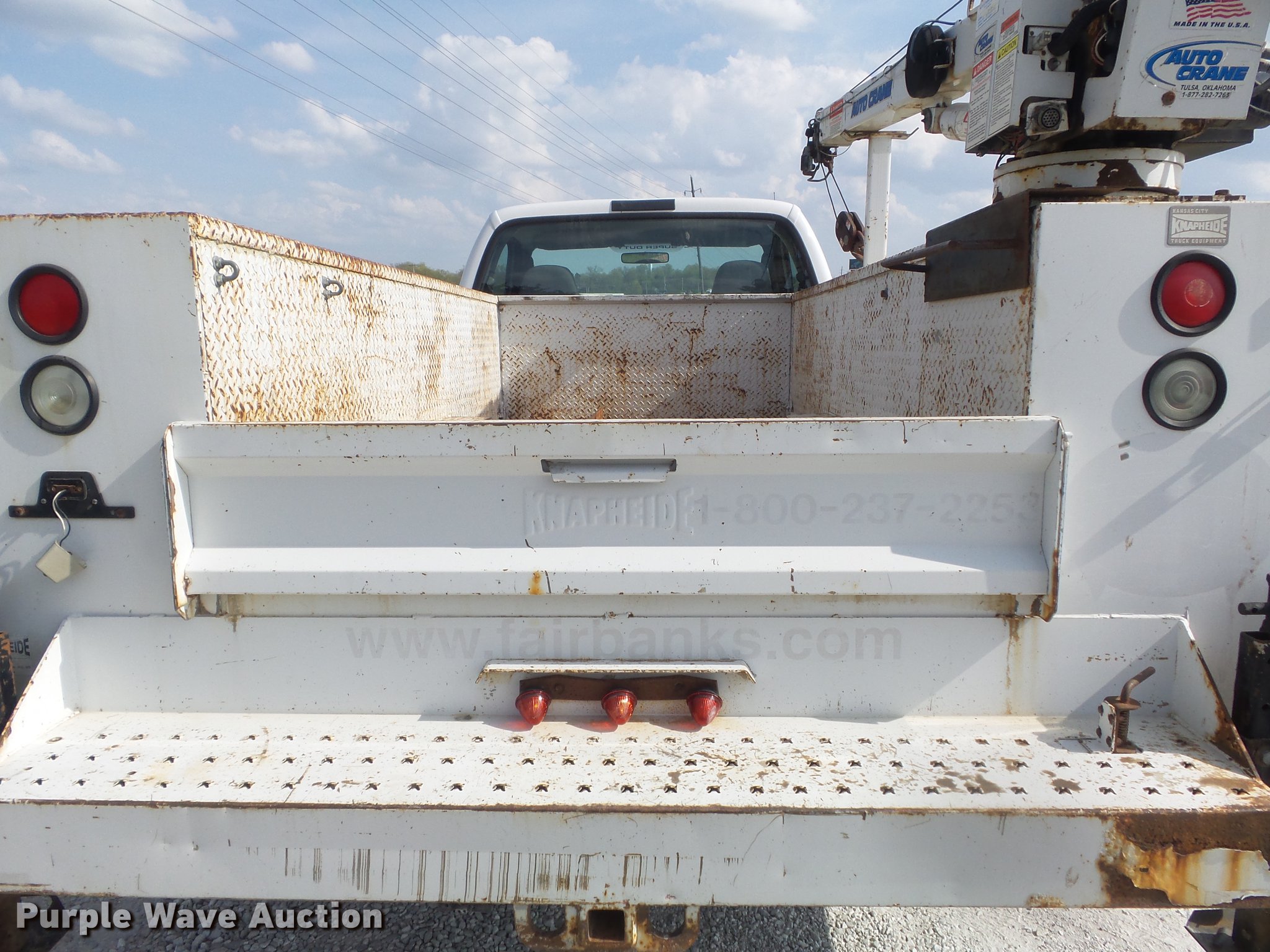Purple Wave is selling a used Service Truck in Missouri. This item is a 2006 Ford F450 Super Duty XL utility truck with crane with the following: 308,254 miles on odometer, 5,495 hours on meter, 6.0L V8 OHV 32V turbo diesel engine, Automatic transmission, Single axle, AC and heat, AM/CD/cassette, Power windows, locks, and mirrors, Auxiliary controls, Front tow hooks, Knapheide 6108D54J utility bed, 9'L, Shelving, Auto Crane 3203PRX crane, 15' boom length, 3,200 lbs max lift capacity, (2) outriggers, Remote control cable missing, Unknown operating condition, Single fuel tank, Receiver hitch, Trailer wiring, 141" wheelbase, 225/70R19.5 tires, GVWR 16,000 lbs