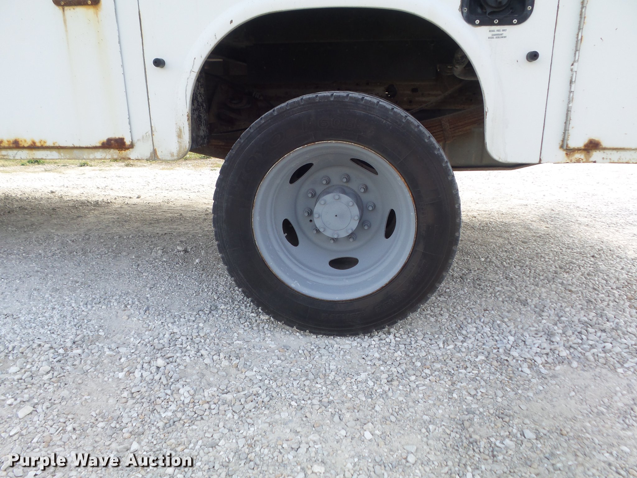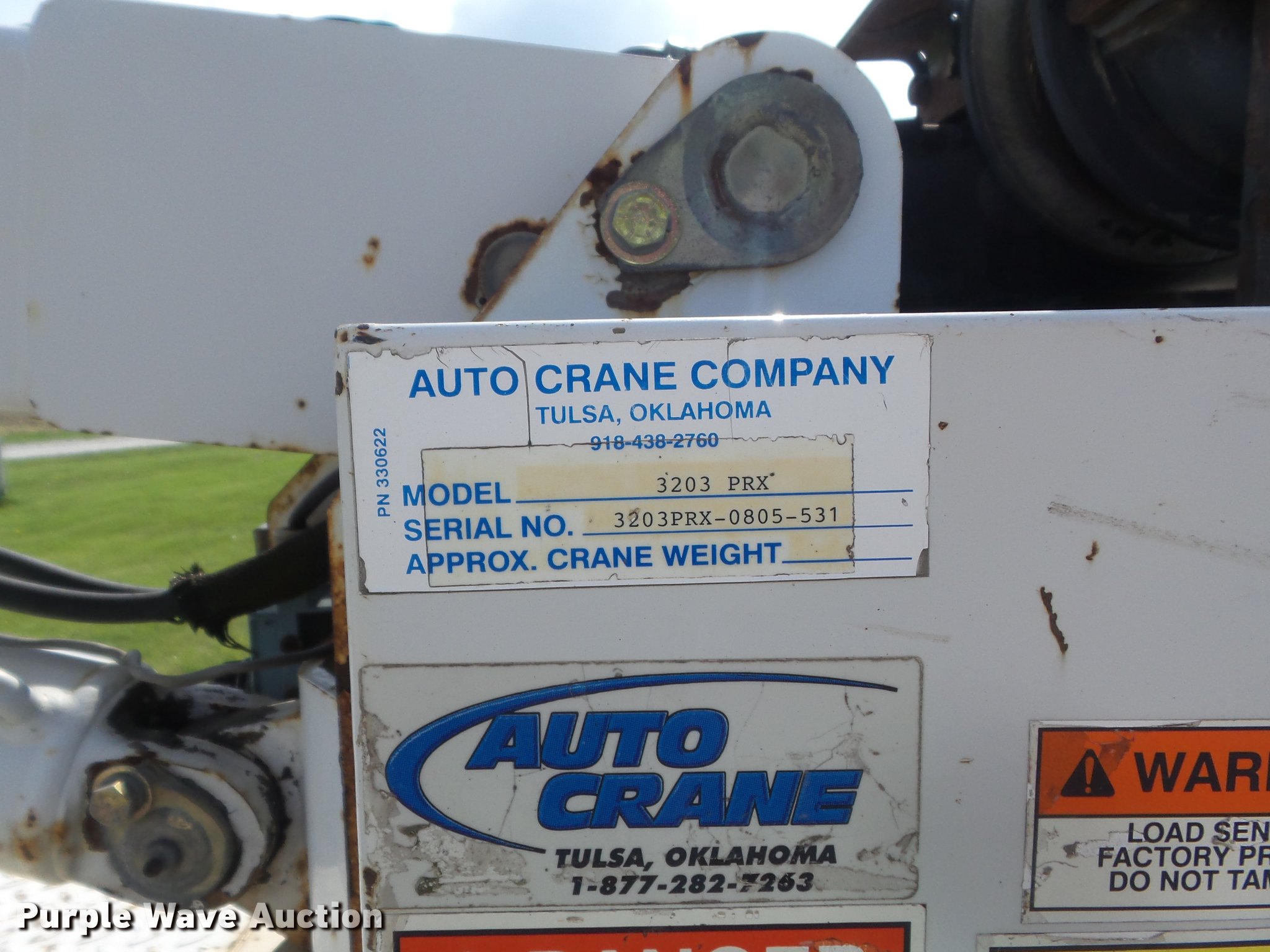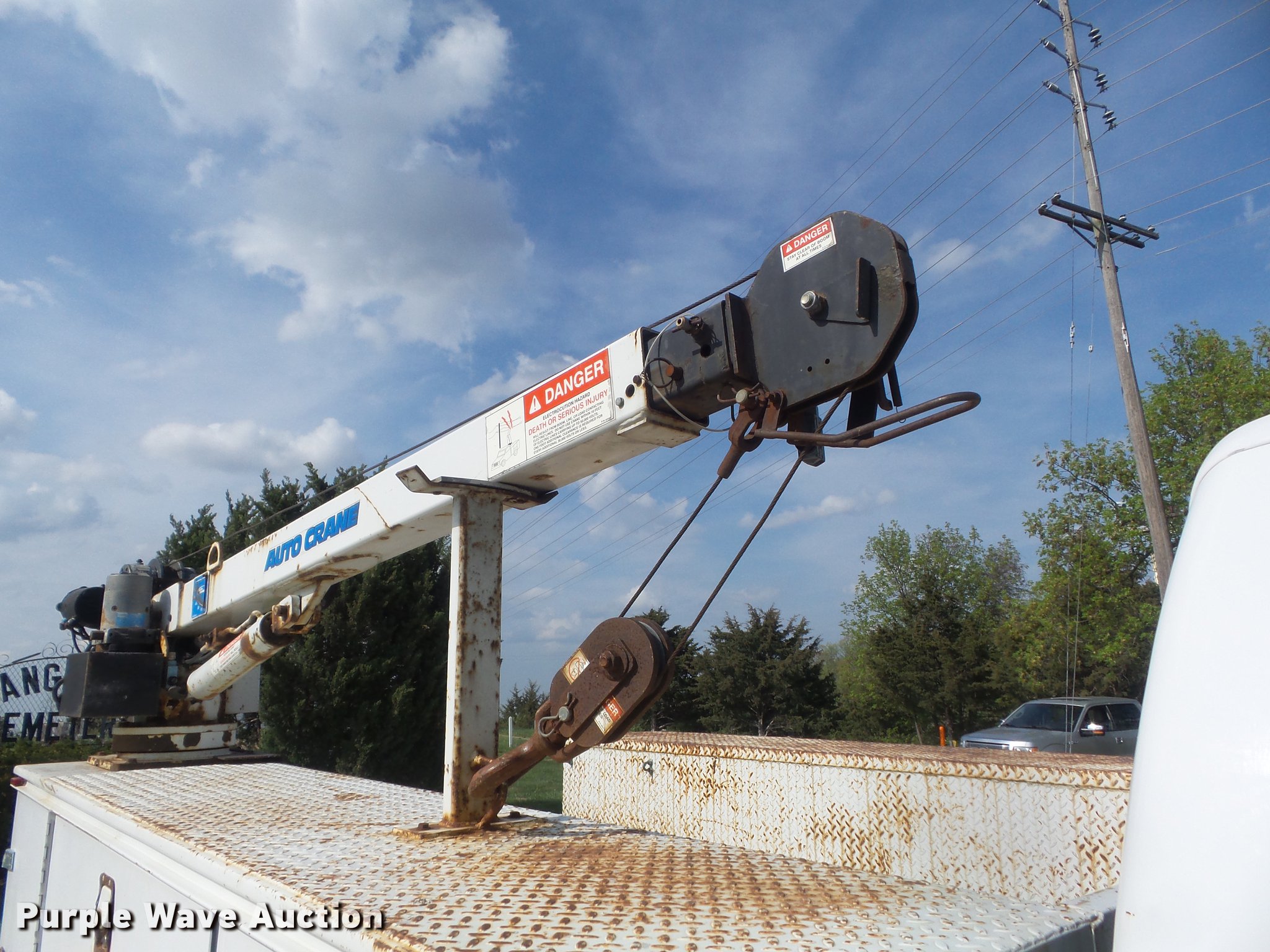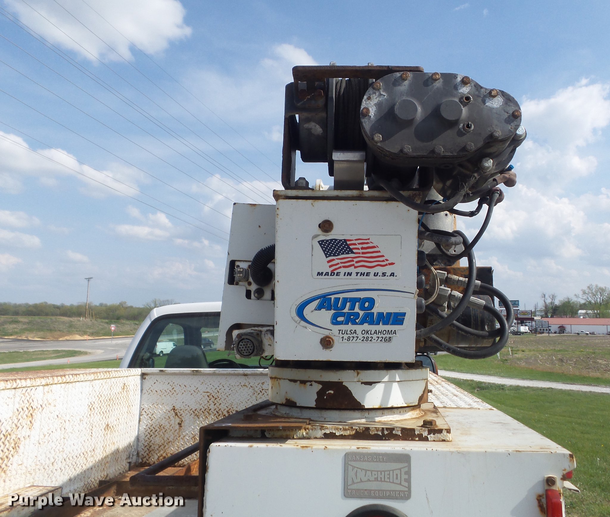 Purple Wave is selling a used Service Truck in Missouri. This item is a 2006 Ford F450 Super Duty XL utility truck with crane with the following: 308,254 miles on odometer, 5,495 hours on meter, 6.0L V8 OHV 32V turbo diesel engine, Automatic transmission, Single axle, AC and heat, AM/CD/cassette, Power windows, locks, and mirrors, Auxiliary controls, Front tow hooks, Knapheide 6108D54J utility bed, 9'L, Shelving, Auto Crane 3203PRX crane, 15' boom length, 3,200 lbs max lift capacity, (2) outriggers, Remote control cable missing, Unknown operating condition, Single fuel tank, Receiver hitch, Trailer wiring, 141" wheelbase, 225/70R19.5 tires, GVWR 16,000 lbs