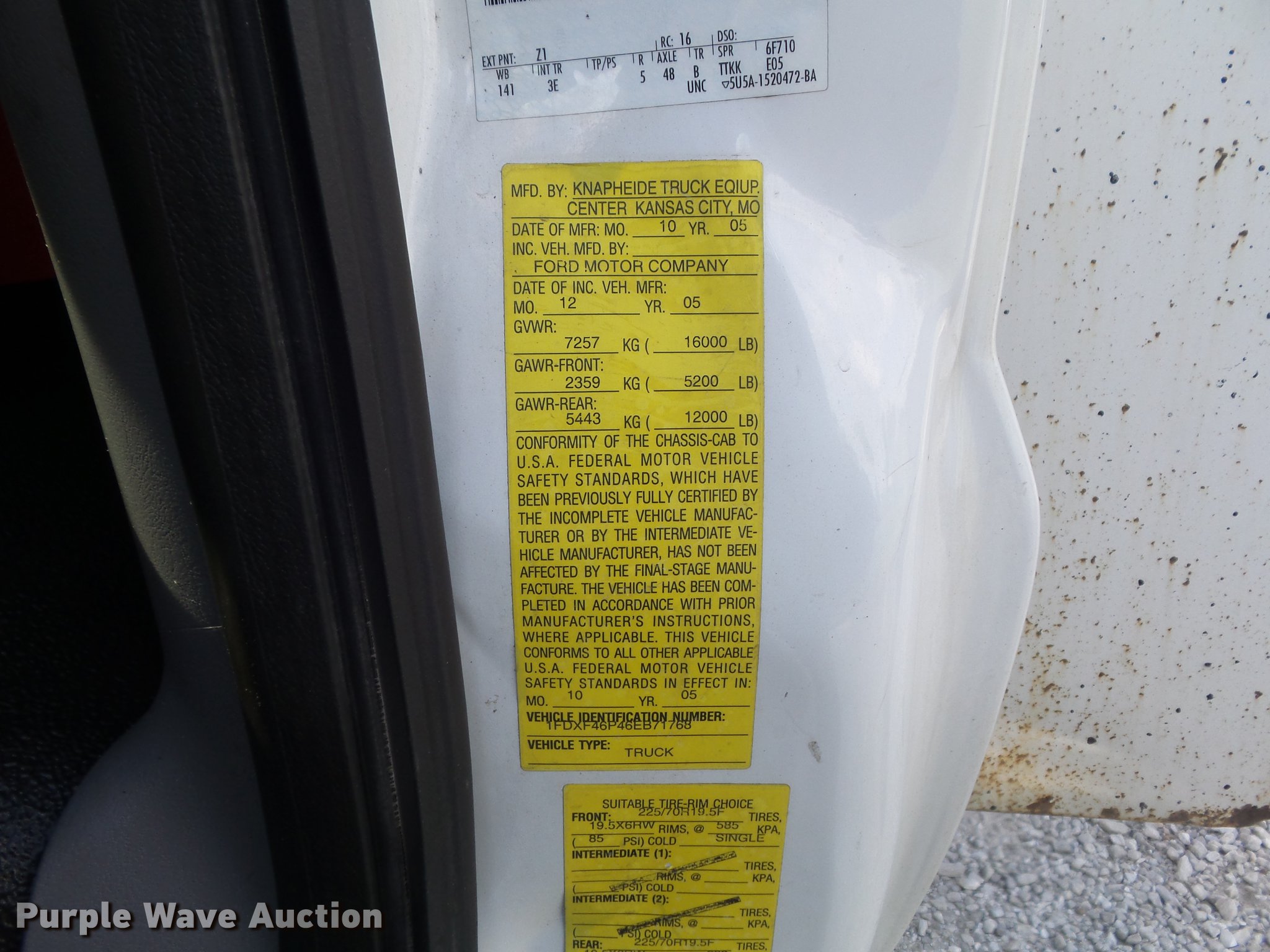 2006 Ford F450 Super Duty XL utility truck with crane. 308,254 miles on odometer, 5,495 hours on meter, 6.0L V8 OHV 32V turbo diesel engine, Automatic transmission, Single axle, AC and heat, AM/CD/cassette, Power windows, locks, and mirrors, Auxiliary controls, Front tow hooks, Knapheide 6108D54J utility bed 9'L, Shelving, Auto Crane 3203PRX crane 15' boom length, 3,200 lbs max lift capacity, (2) outriggers, Remote control cable missing, Unknown operating condition, Single fuel tank, Receiver hitch, Trailer wiring, 141" wheelbase, 225/70R19.5 tires, GVWR 16,000 lbs. Missouri title. Seller is a Missouri licensed motor vehicle dealer. Title will be assigned and distributed by the dealer. Please contact the seller for distribution questions. 1FDXF46P46EB71768. Fruendly Auto Source, Inc.. 2177 W Outer Hwy 61. Moscow Mills, MO 63362