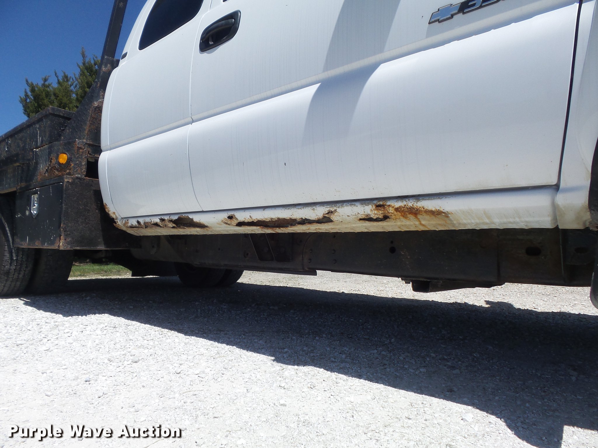 Purple Wave is selling a used 3/4 or 1 Ton Pickup or Van in Missouri. This item is a 2005 Chevrolet Silverado 3500 Ext. Cab flatbed pickup truck with the following: 305,824 miles on odometer, 6.6L V8 OHV 32V turbo diesel engine, Automatic transmission, Four wheel drive, AC and heat, Tilt, Cruise, AM/FM/CD, Power windows, locks, mirrors, and seat, Cloth interior, Brake controller, Maxwell flatbed, 9'L x 92"W, Toolbox, Gooseneck ball, Diamond plate steel construction, Dual fuel tanks, Receiver hitch, Trailer wiring, LT215/85R16 tires, Check engine light on, Possible brake pedal issues when stopping, Chipped windshield